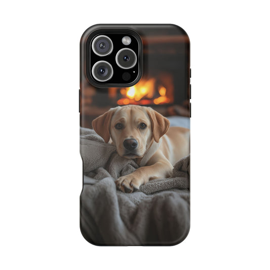 Cozy Labrador by Fireplace MagSafe iPhone Case – Rustic Cabin Protective Cover