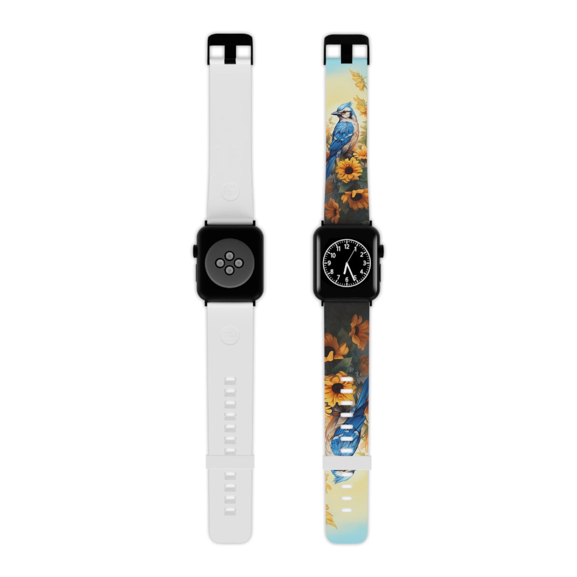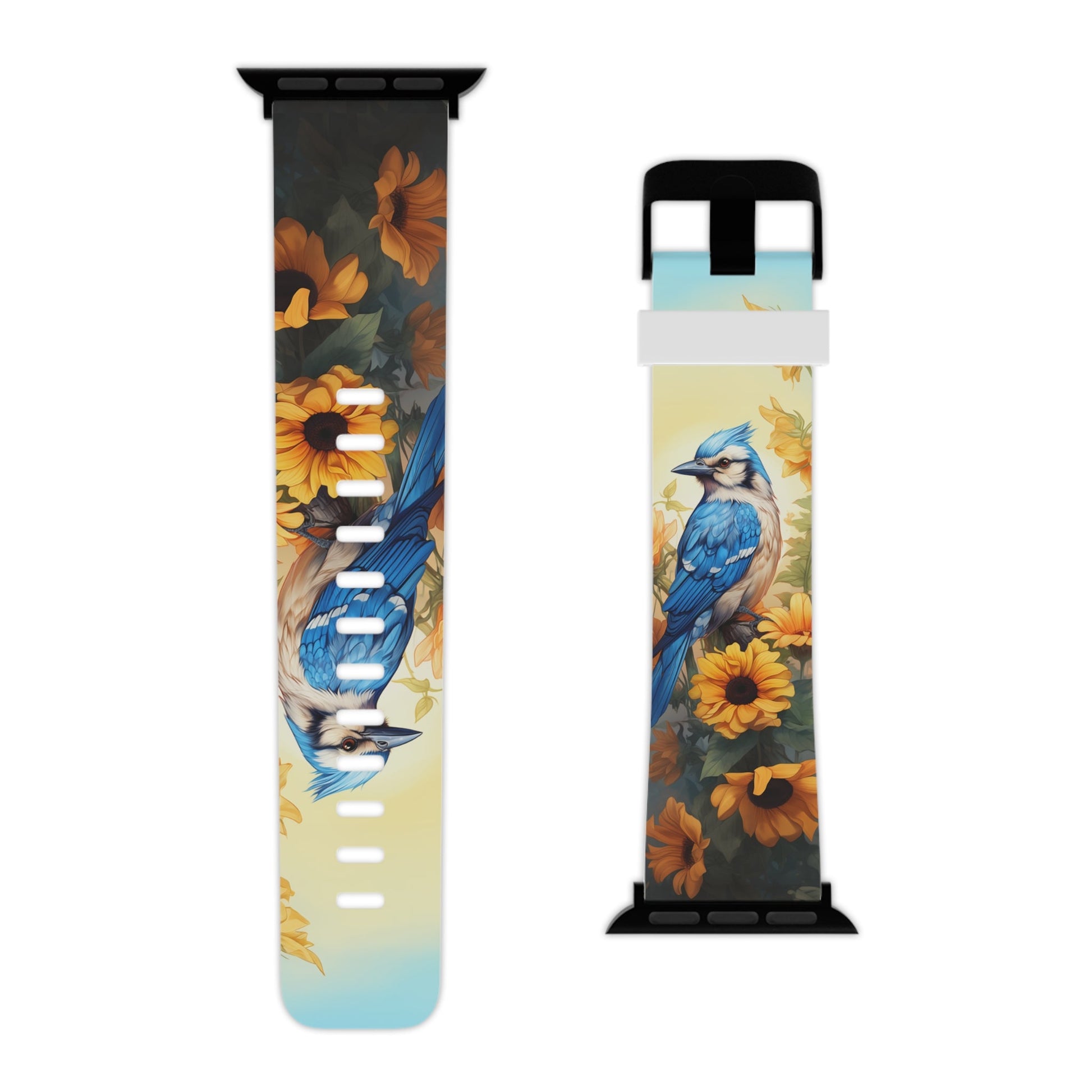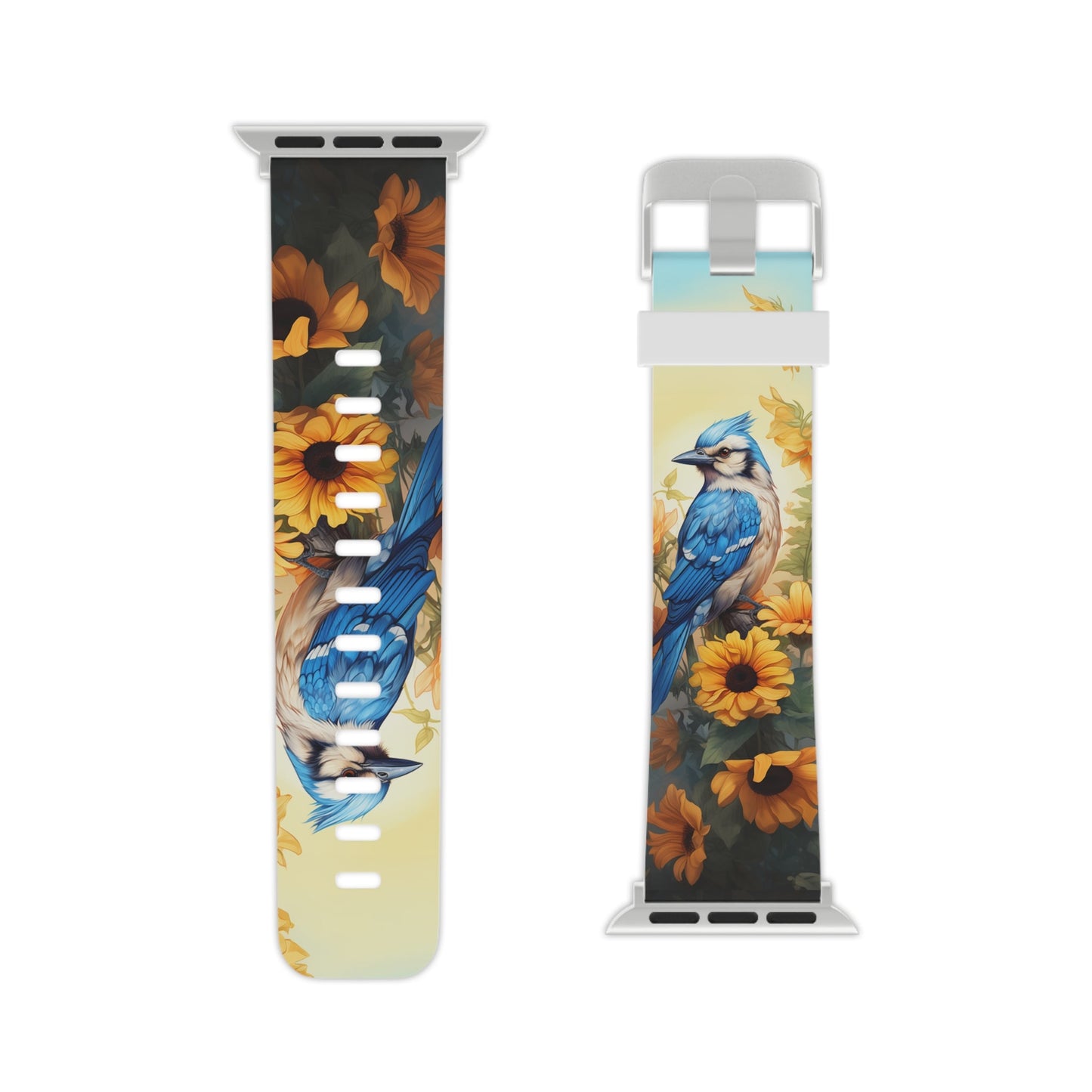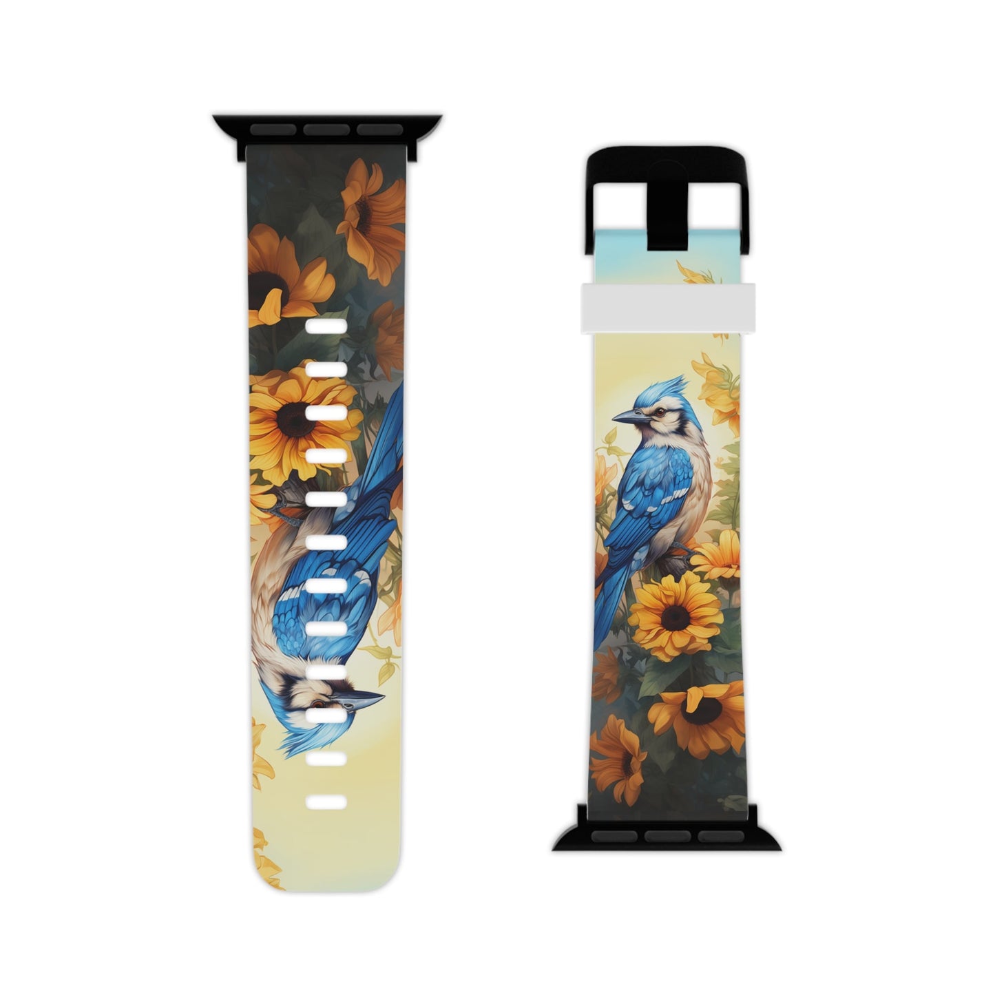 Celebrate the charm of nature with the Blue Jay & Sunflowers Apple Watch Band! This stunning design features a vibrant blue jay perched among golden sunflowers, blending elegance with a touch of the outdoors. Perfect for bird lovers, nature enthusiasts, and anyone who adores bright and cheerful designs, this watch band adds a refreshing and stylish touch to your wrist.
