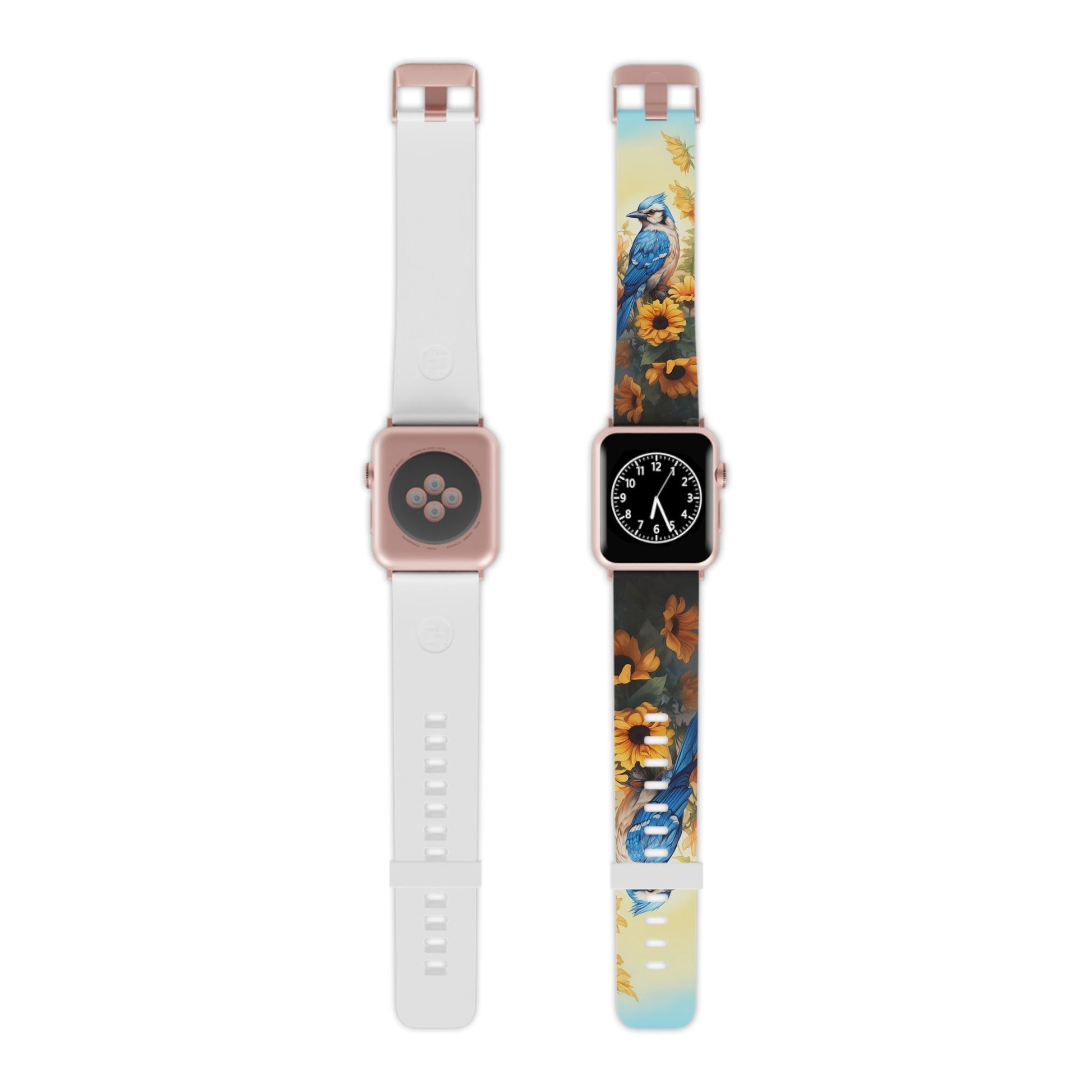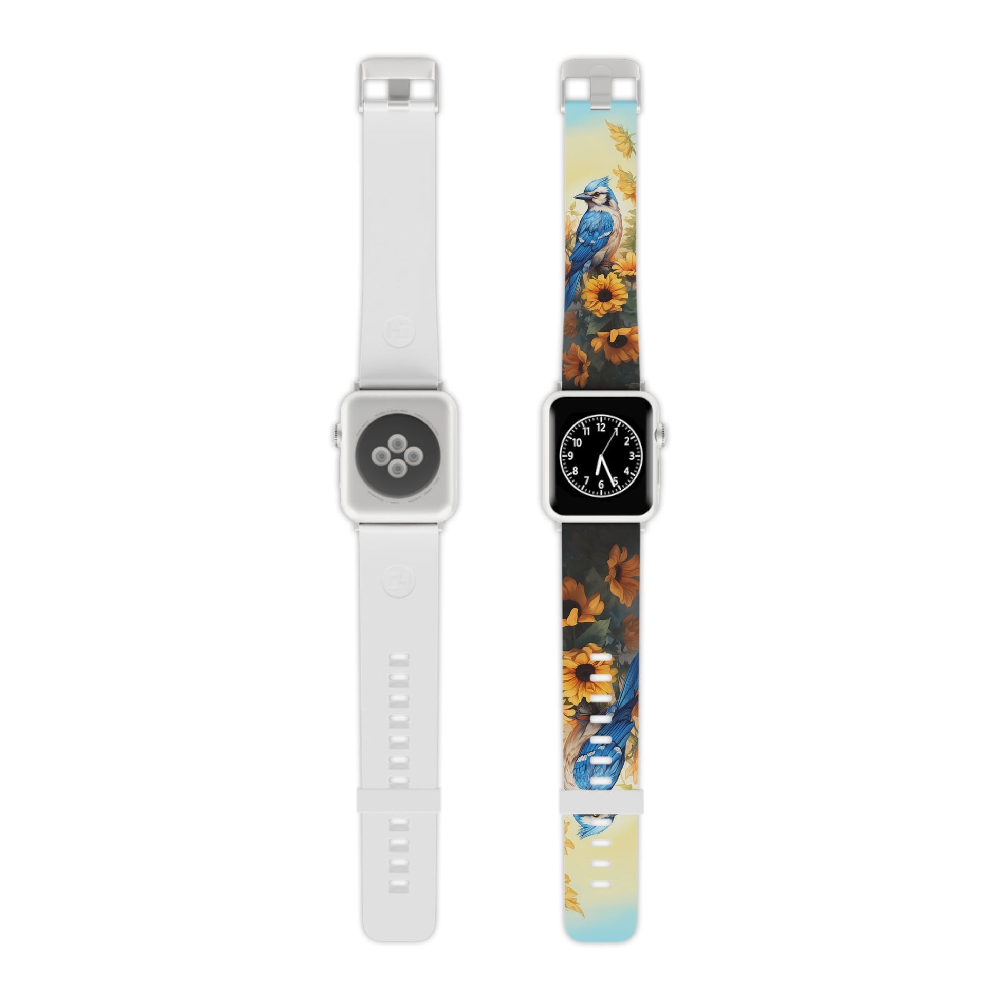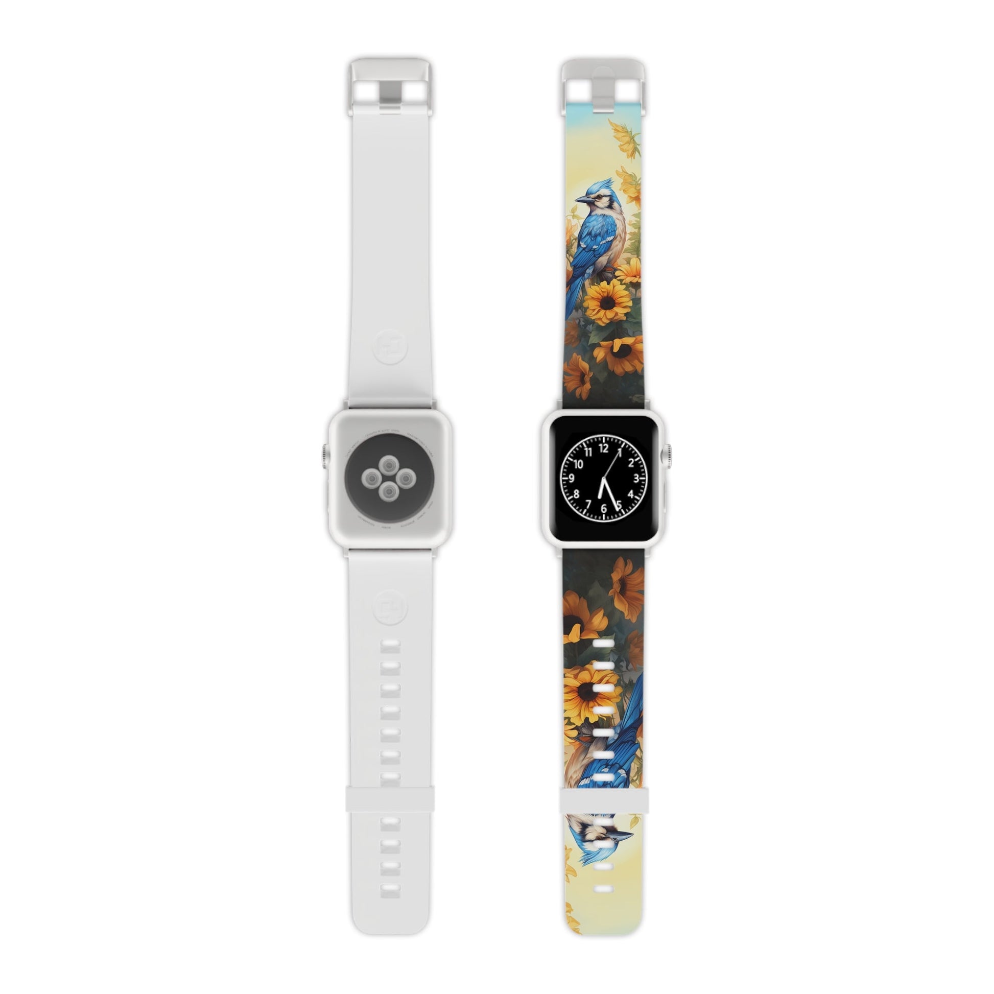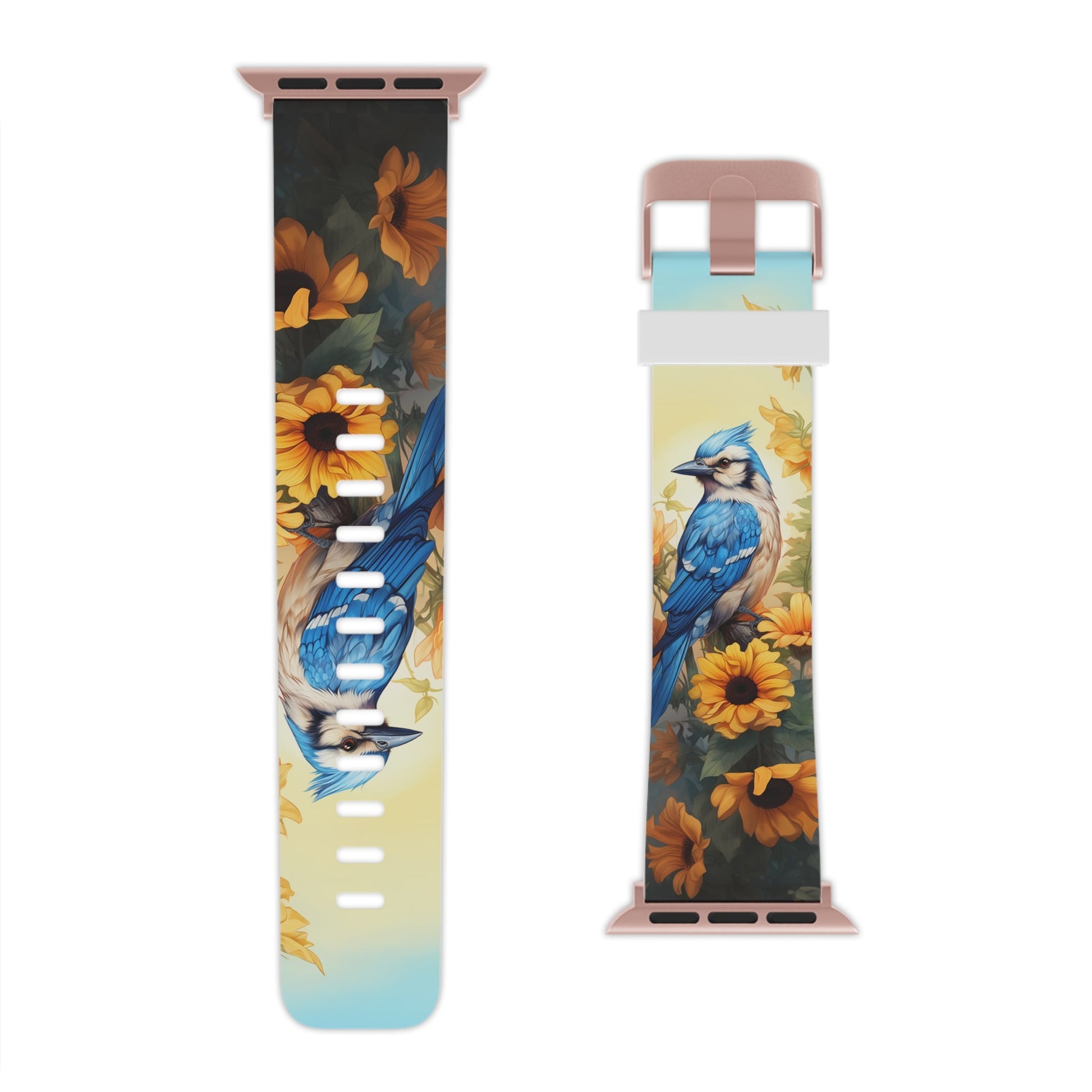 Celebrate the charm of nature with the Blue Jay & Sunflowers Apple Watch Band! This stunning design features a vibrant blue jay perched among golden sunflowers, blending elegance with a touch of the outdoors. Perfect for bird lovers, nature enthusiasts, and anyone who adores bright and cheerful designs, this watch band adds a refreshing and stylish touch to your wrist.
