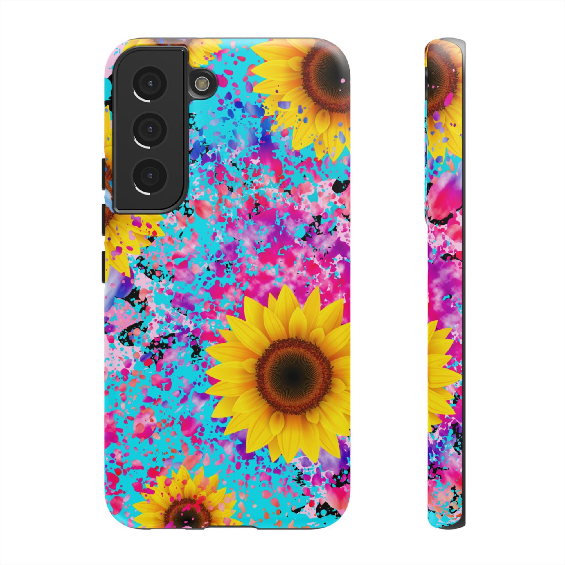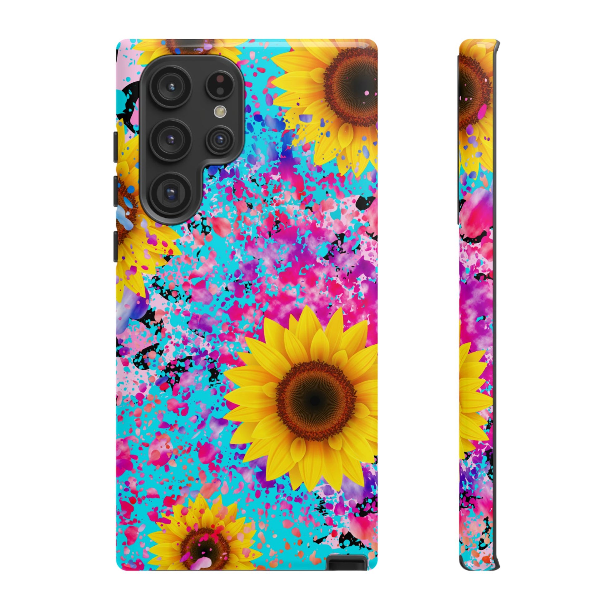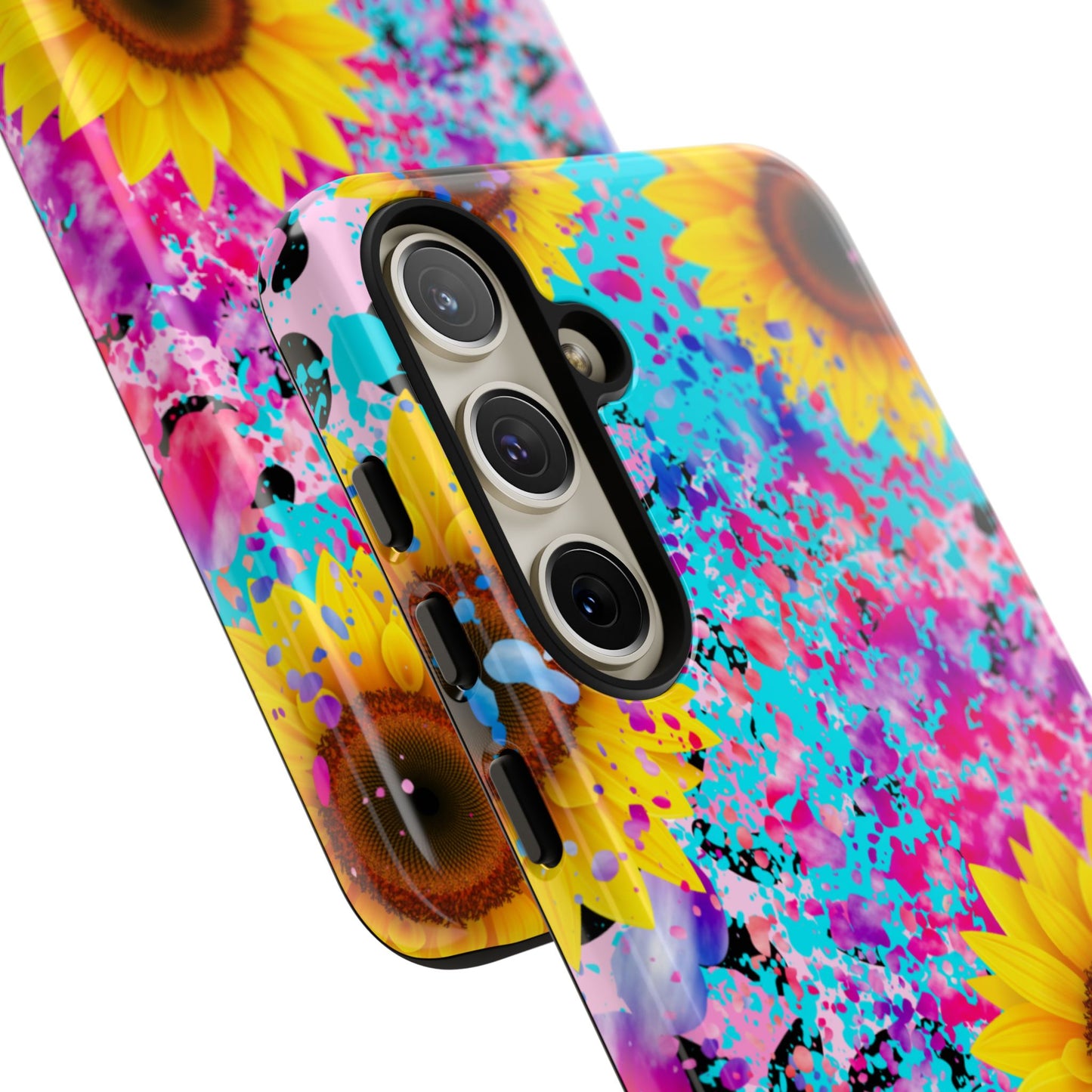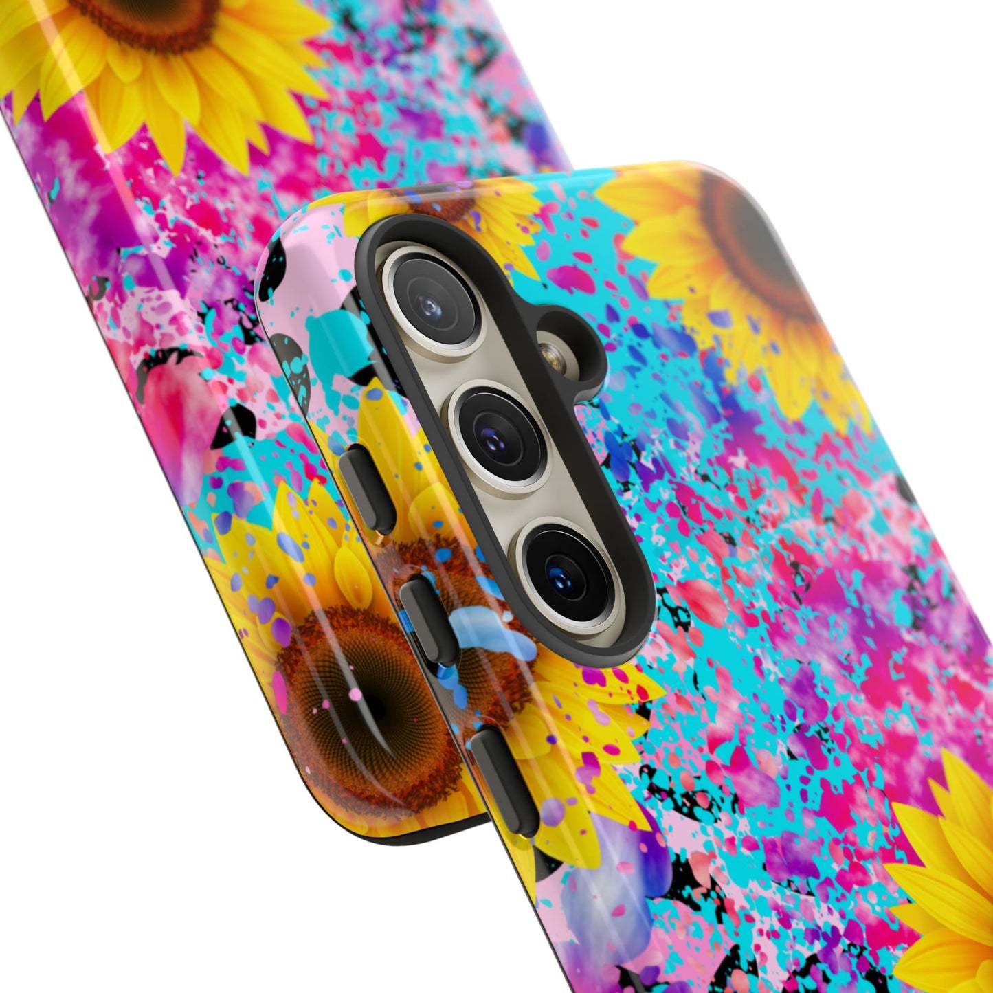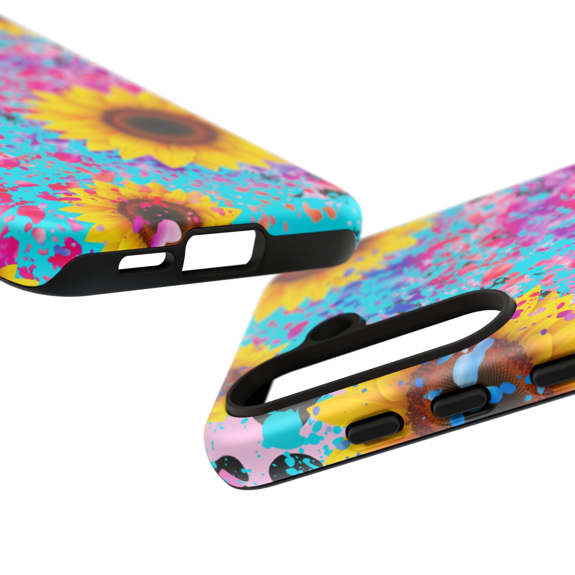 Stand out with this Bright Sunflower Pop Art Samsung Galaxy Case! This bold design features vibrant yellow sunflowers scattered across a lively background of pink, blue, and purple paint splashes with hints of black leopard spots. The playful mix of colors and patterns gives a funky, retro vibe that’s perfect for anyone looking to make a statement. Crafted with a durable polycarbonate shell and shock-absorbing TPU liner, this case not only turns heads but also provides reliable protection. Elevate your style and brighten your day with this one-of-a-kind sunflower case!