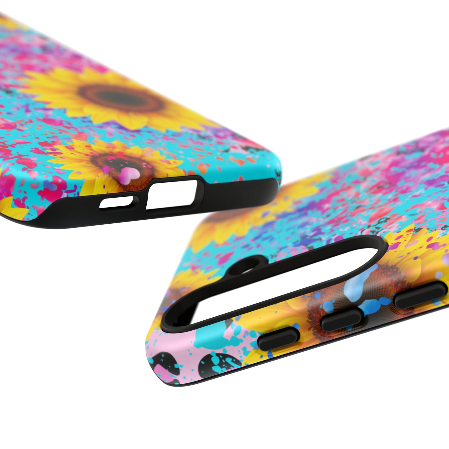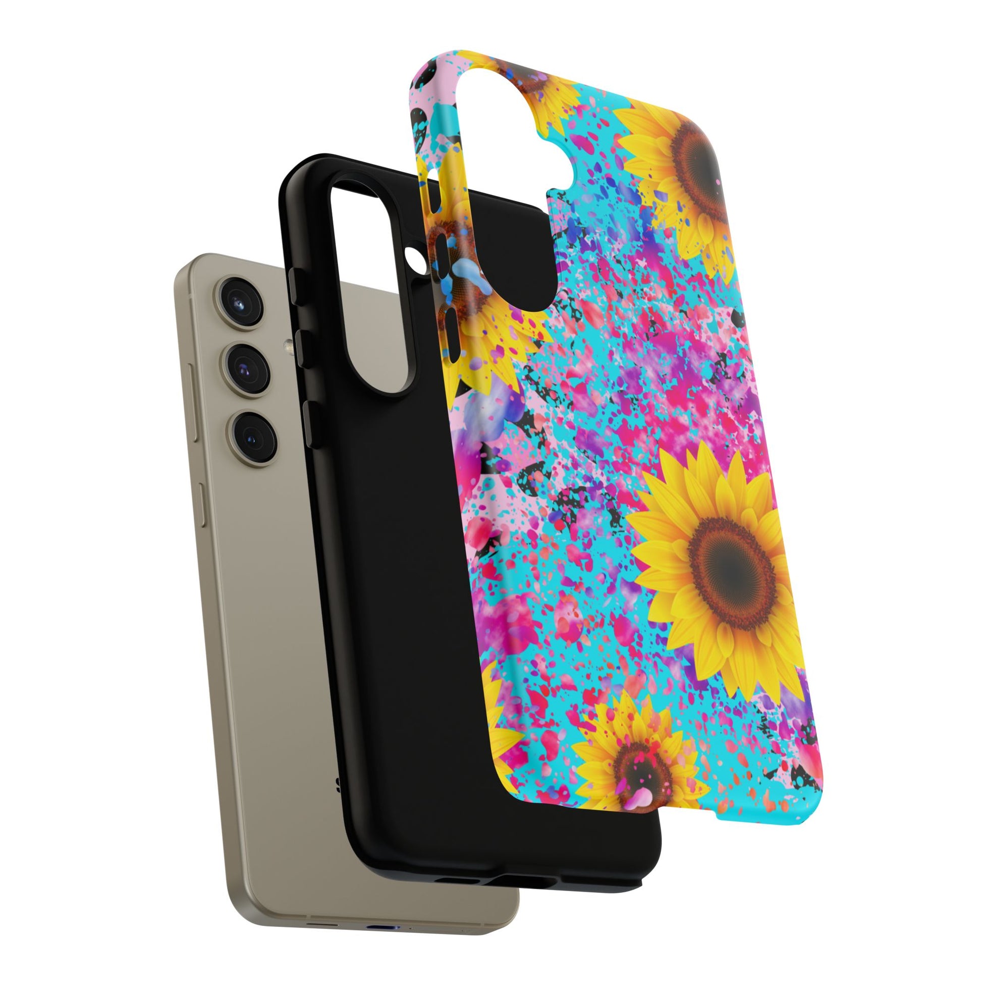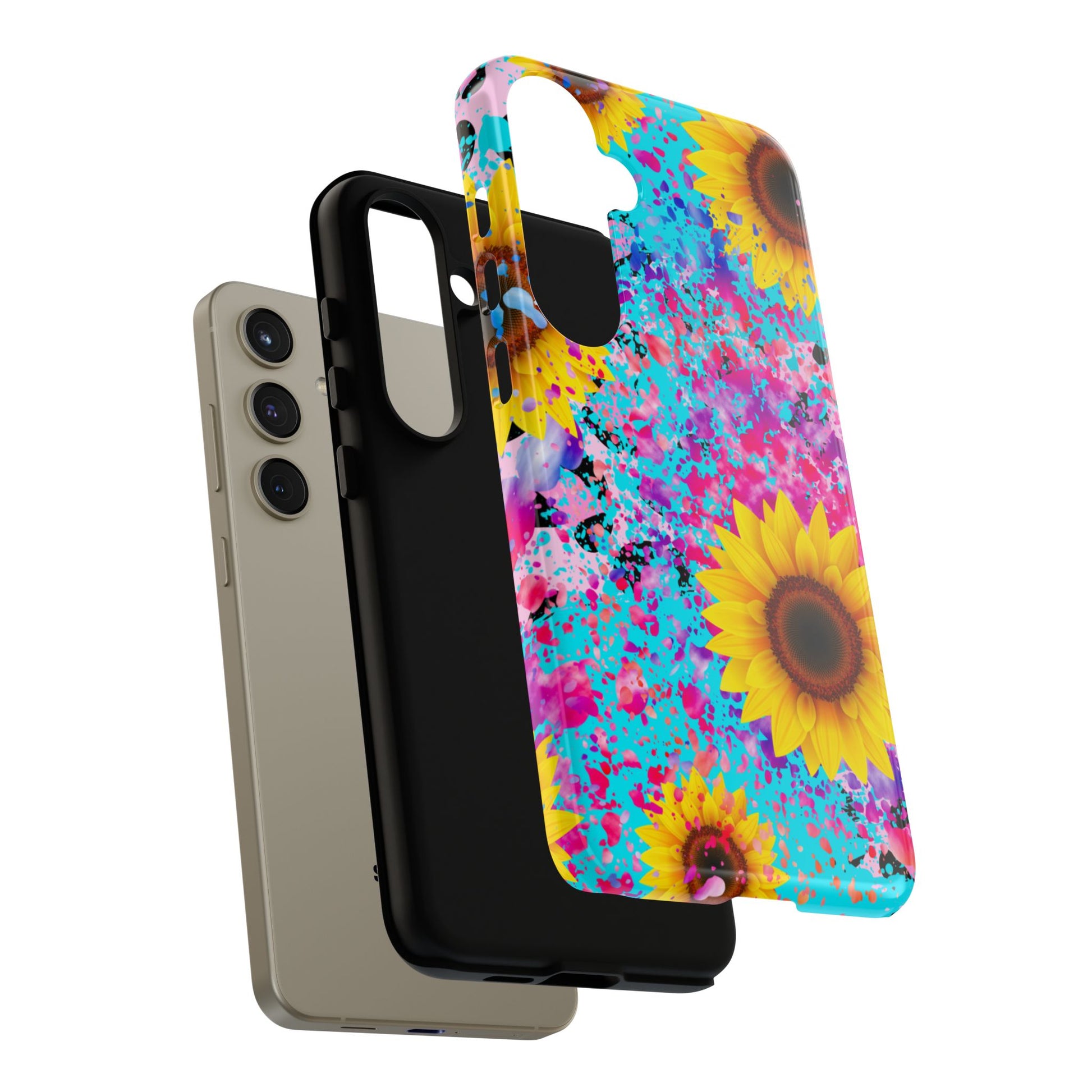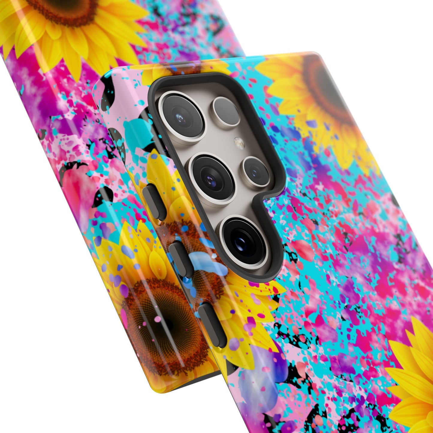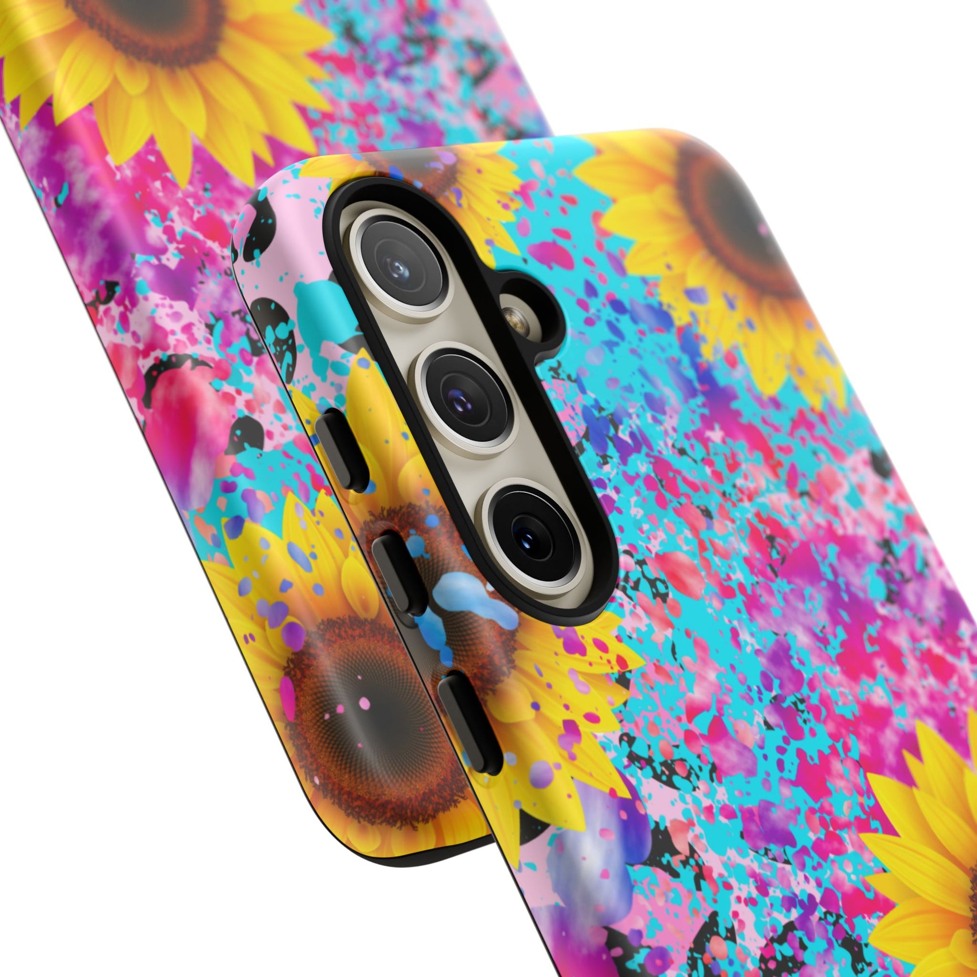 Stand out with this Bright Sunflower Pop Art Samsung Galaxy Case! This bold design features vibrant yellow sunflowers scattered across a lively background of pink, blue, and purple paint splashes with hints of black leopard spots. The playful mix of colors and patterns gives a funky, retro vibe that’s perfect for anyone looking to make a statement. Crafted with a durable polycarbonate shell and shock-absorbing TPU liner, this case not only turns heads but also provides reliable protection. Elevate your style and brighten your day with this one-of-a-kind sunflower case!