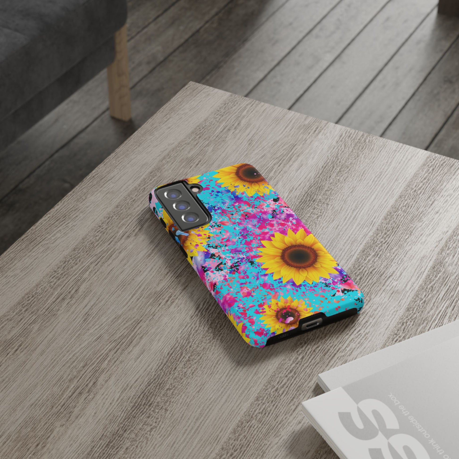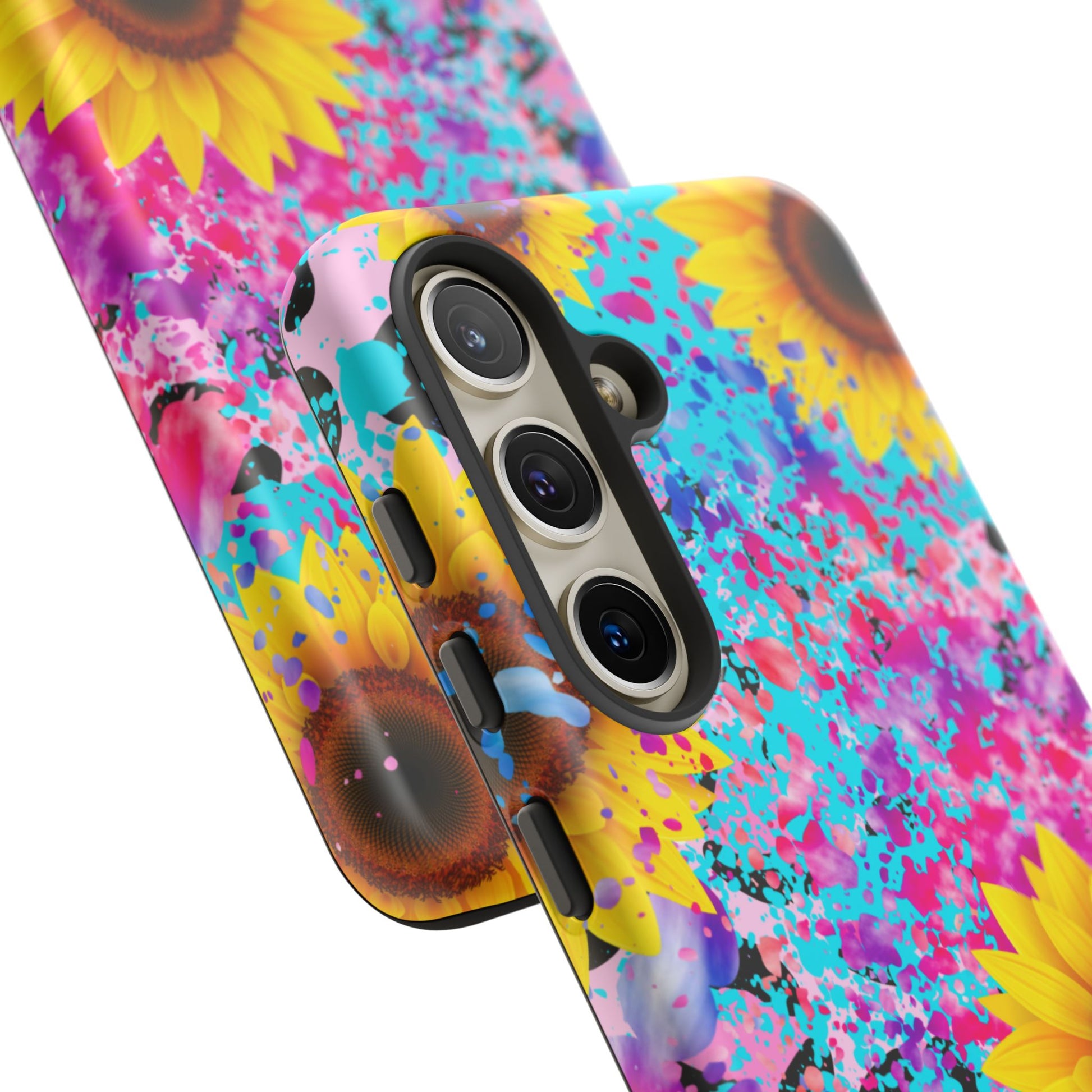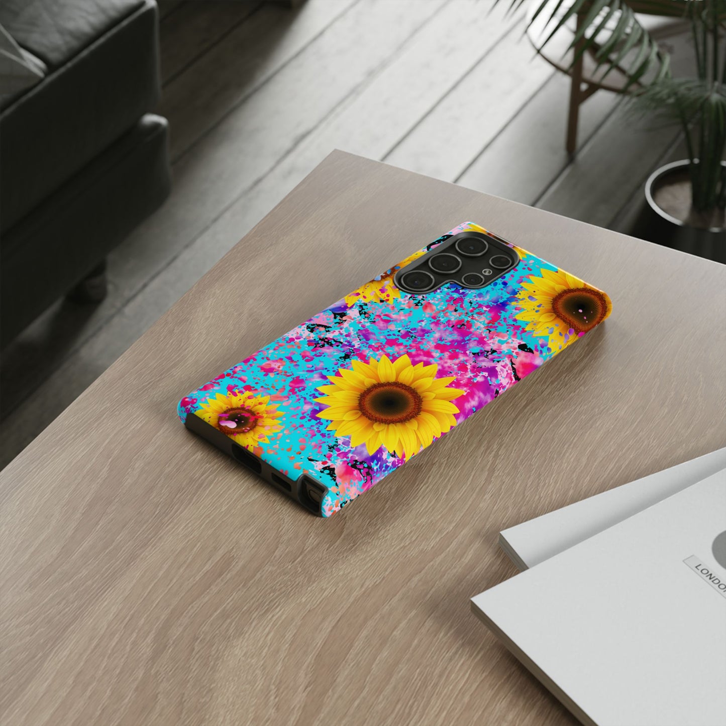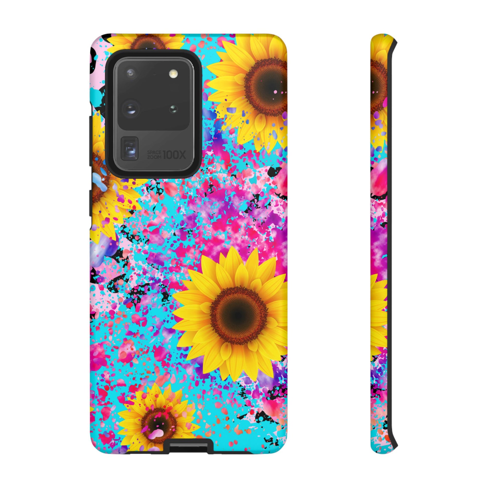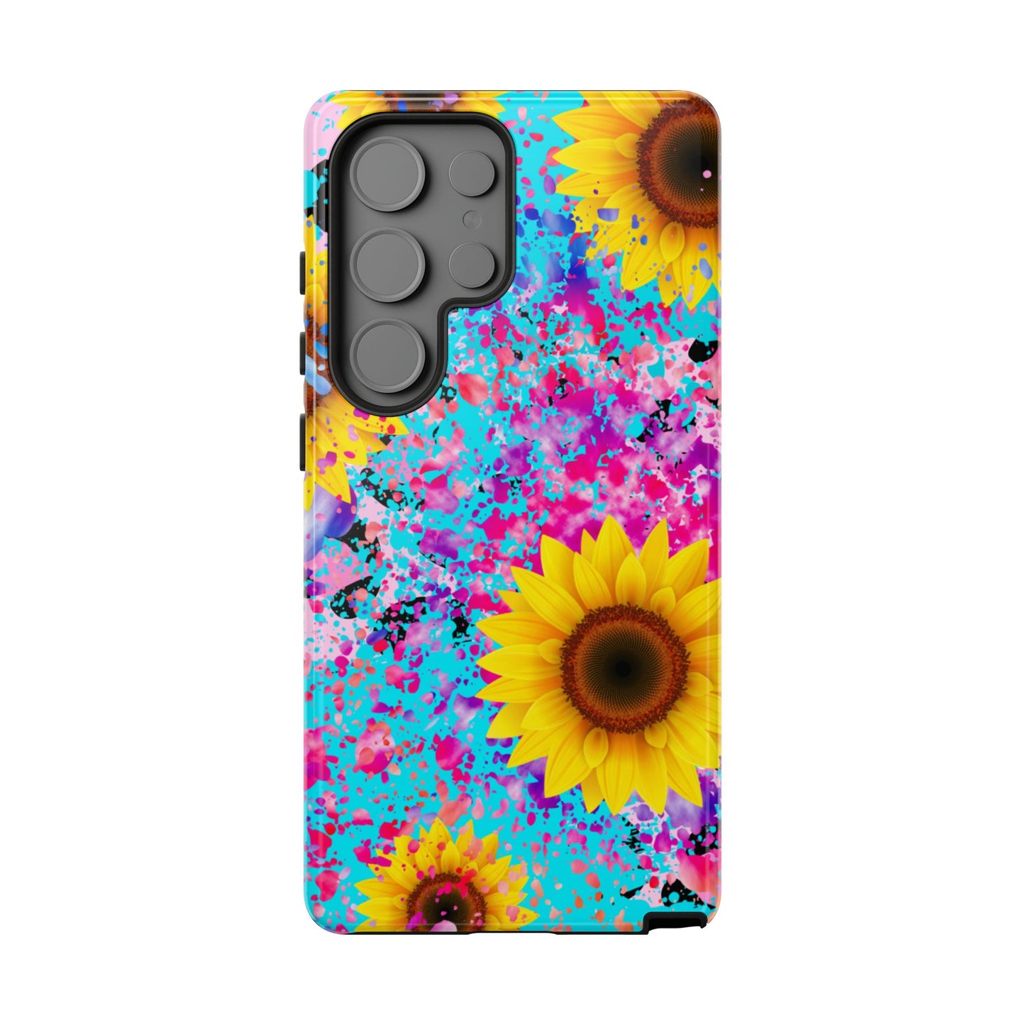 Stand out with this Bright Sunflower Pop Art Samsung Galaxy Case! This bold design features vibrant yellow sunflowers scattered across a lively background of pink, blue, and purple paint splashes with hints of black leopard spots. The playful mix of colors and patterns gives a funky, retro vibe that’s perfect for anyone looking to make a statement. Crafted with a durable polycarbonate shell and shock-absorbing TPU liner, this case not only turns heads but also provides reliable protection. Elevate your style and brighten your day with this one-of-a-kind sunflower case!