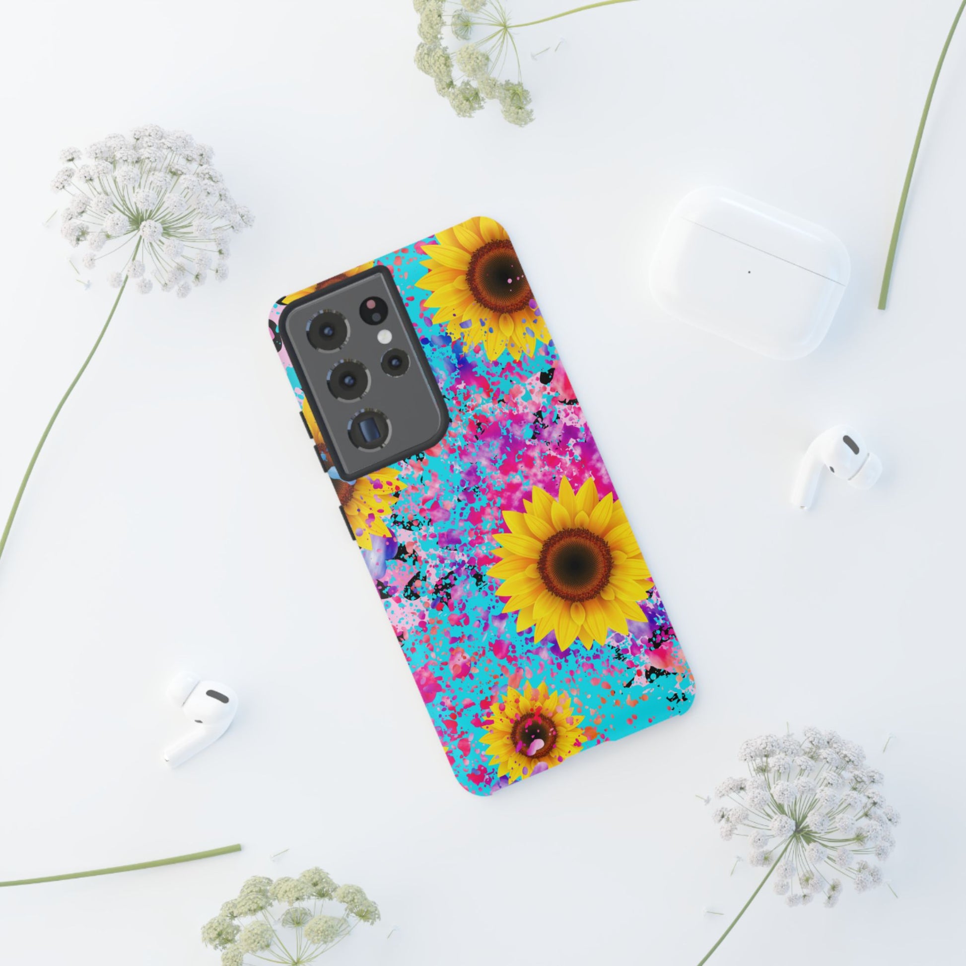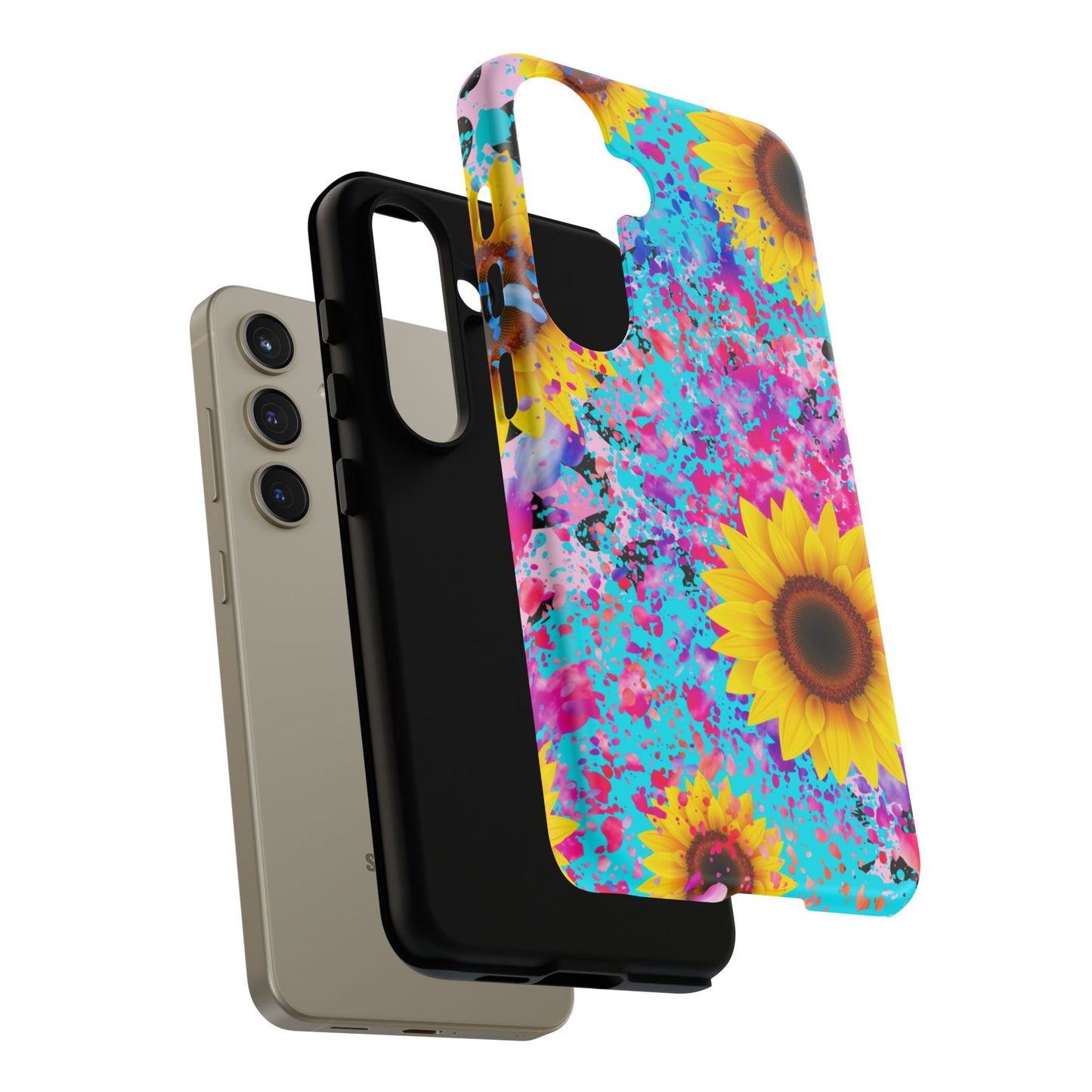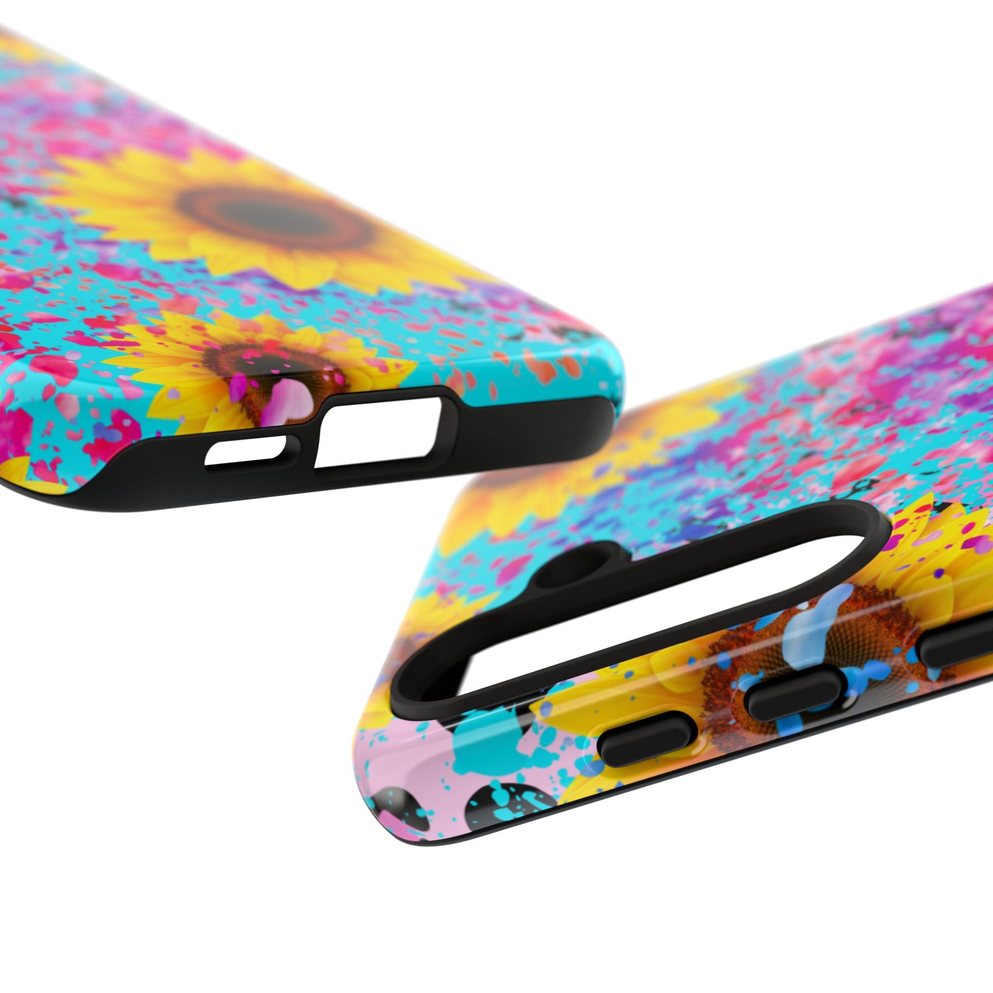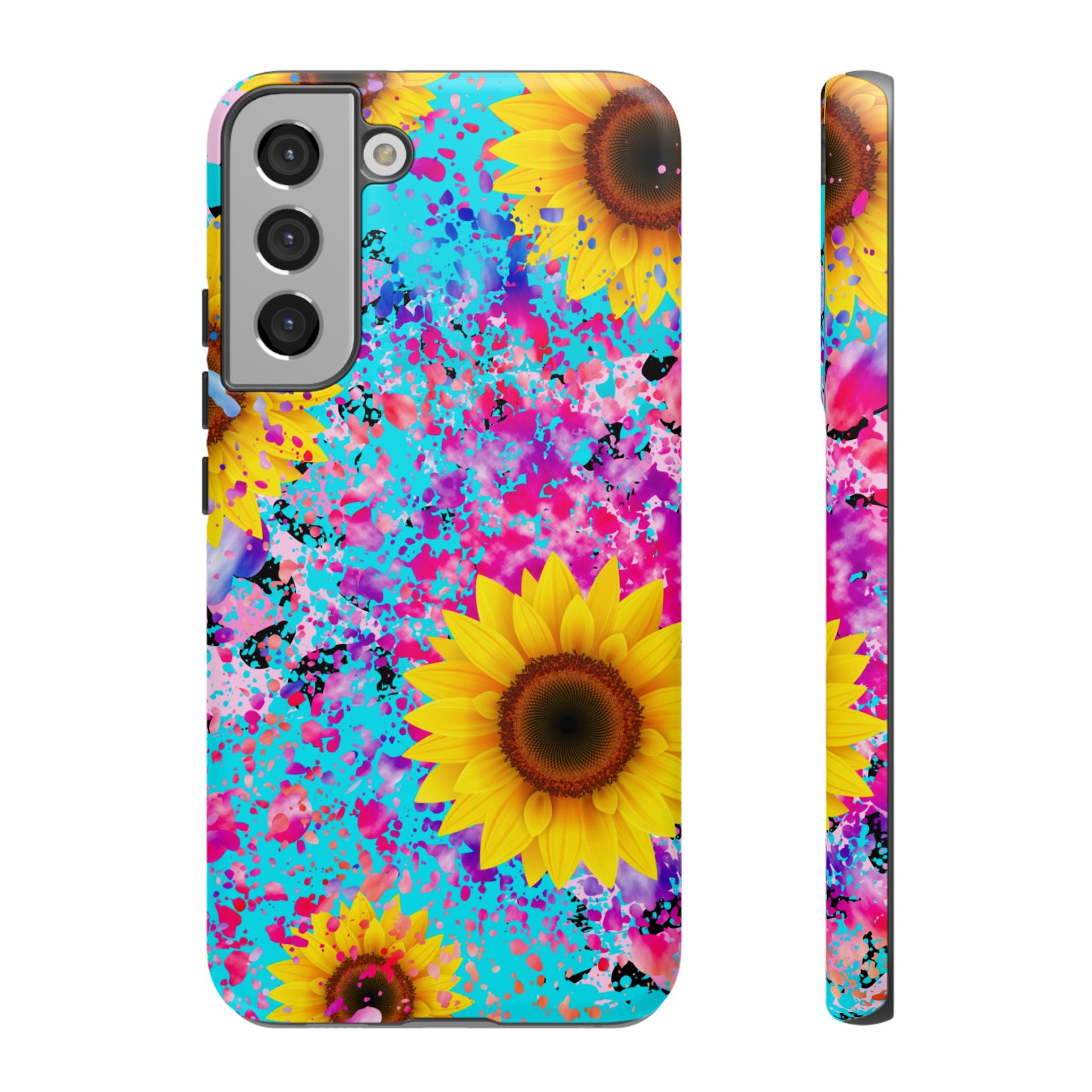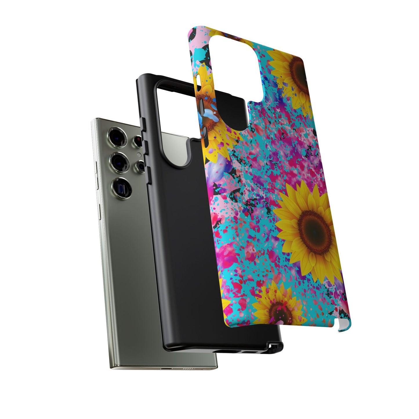 Stand out with this Bright Sunflower Pop Art Samsung Galaxy Case! This bold design features vibrant yellow sunflowers scattered across a lively background of pink, blue, and purple paint splashes with hints of black leopard spots. The playful mix of colors and patterns gives a funky, retro vibe that’s perfect for anyone looking to make a statement. Crafted with a durable polycarbonate shell and shock-absorbing TPU liner, this case not only turns heads but also provides reliable protection. Elevate your style and brighten your day with this one-of-a-kind sunflower case!