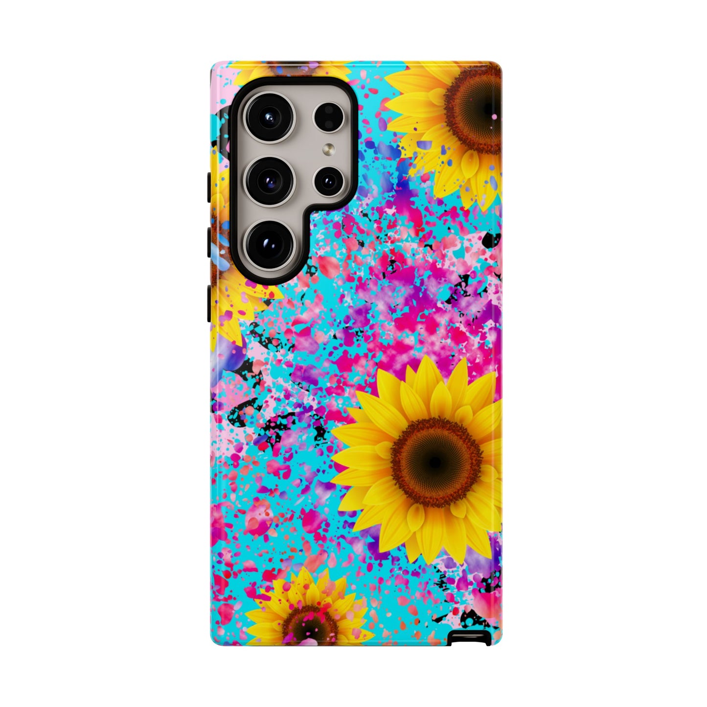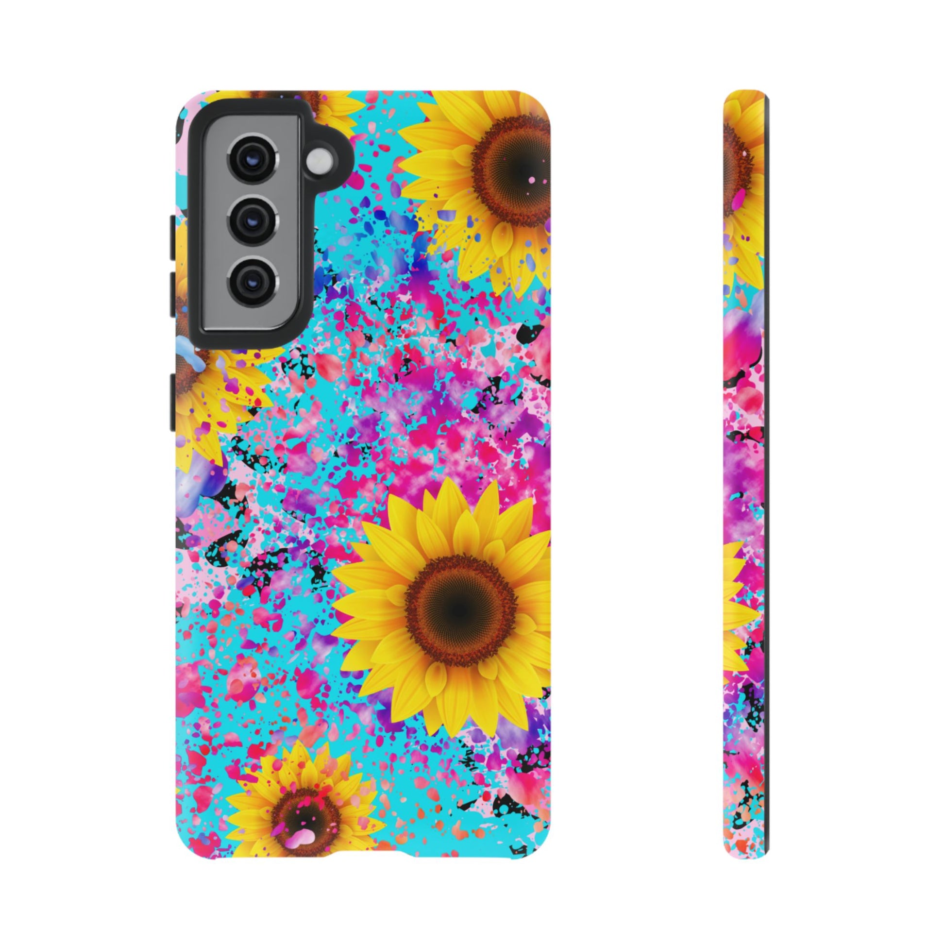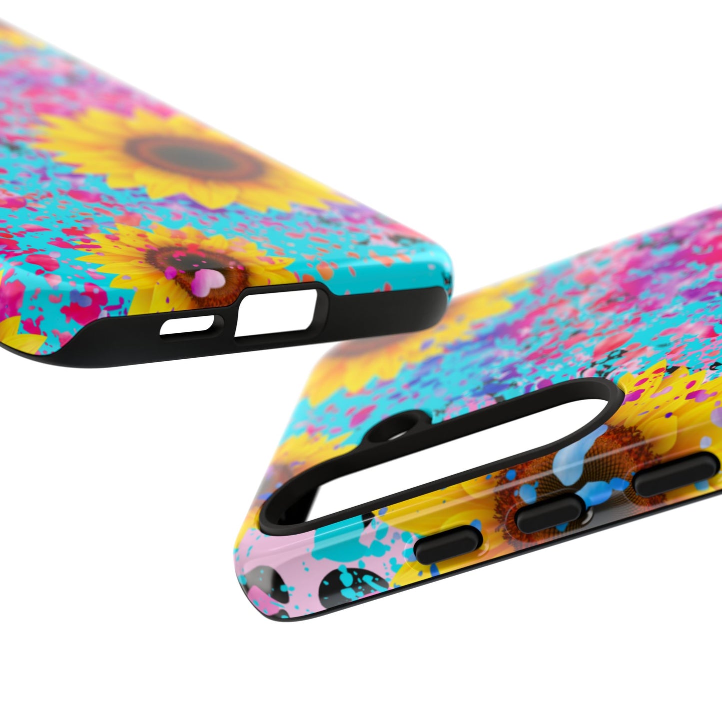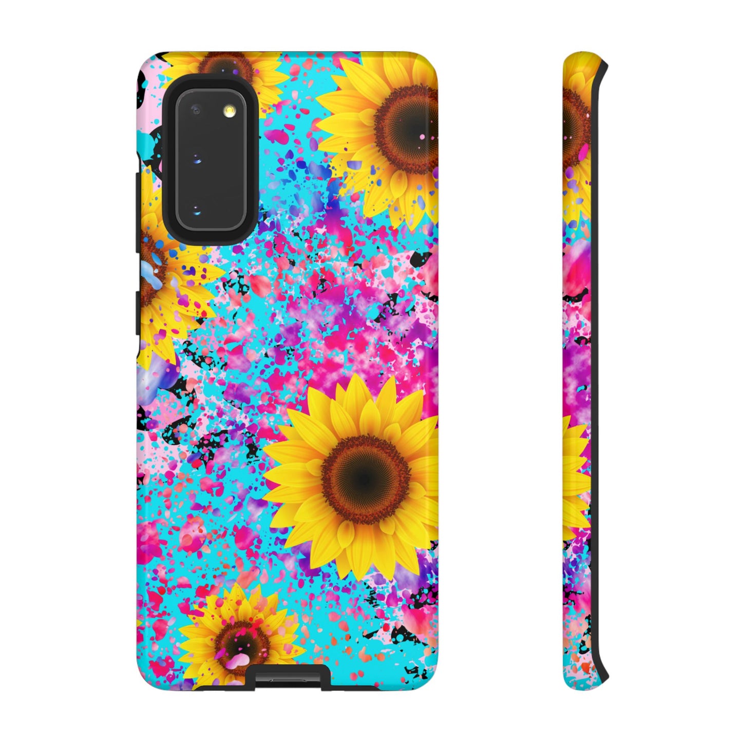Stand out with this Bright Sunflower Pop Art Samsung Galaxy Case! This bold design features vibrant yellow sunflowers scattered across a lively background of pink, blue, and purple paint splashes with hints of black leopard spots. The playful mix of colors and patterns gives a funky, retro vibe that’s perfect for anyone looking to make a statement. Crafted with a durable polycarbonate shell and shock-absorbing TPU liner, this case not only turns heads but also provides reliable protection. Elevate your style and brighten your day with this one-of-a-kind sunflower case!