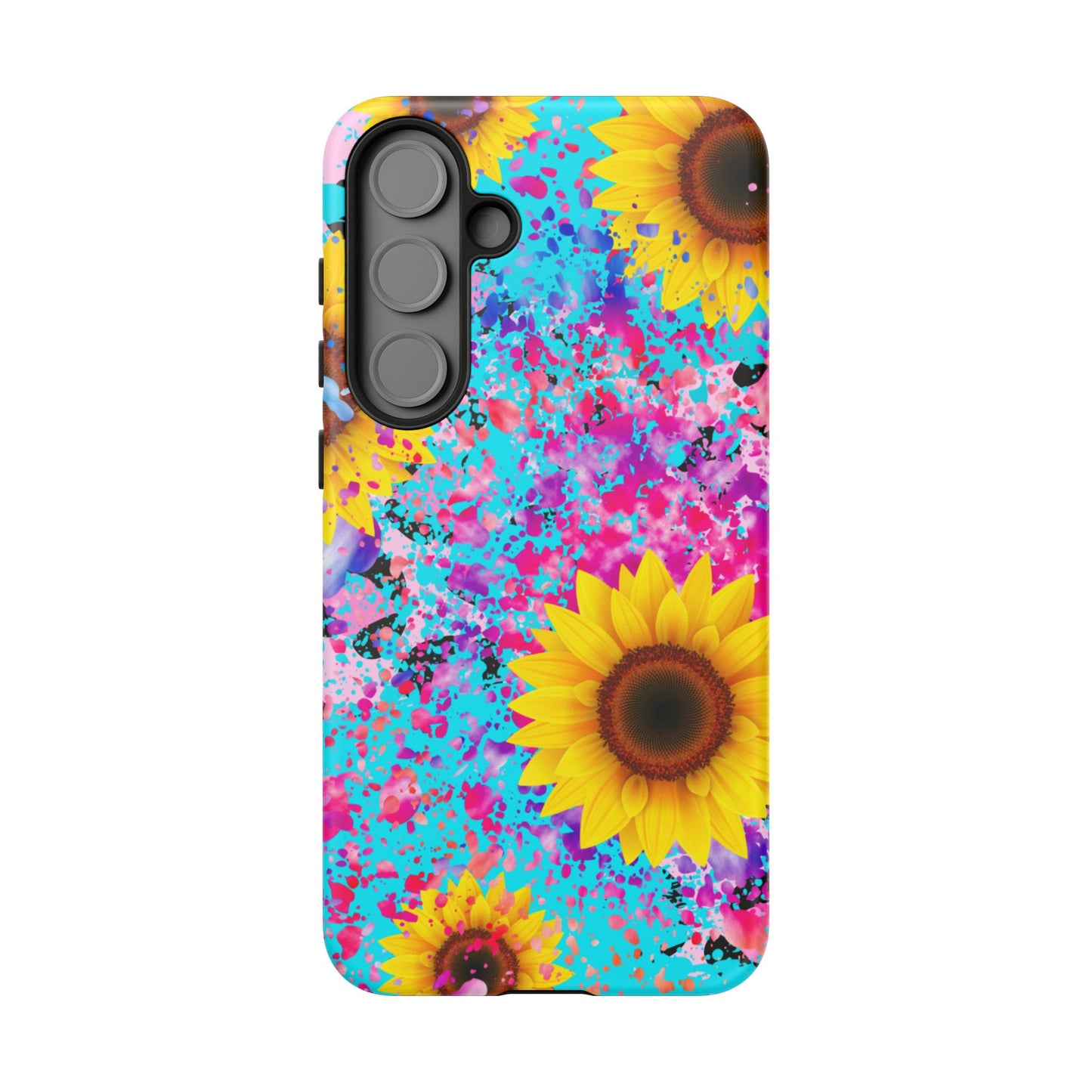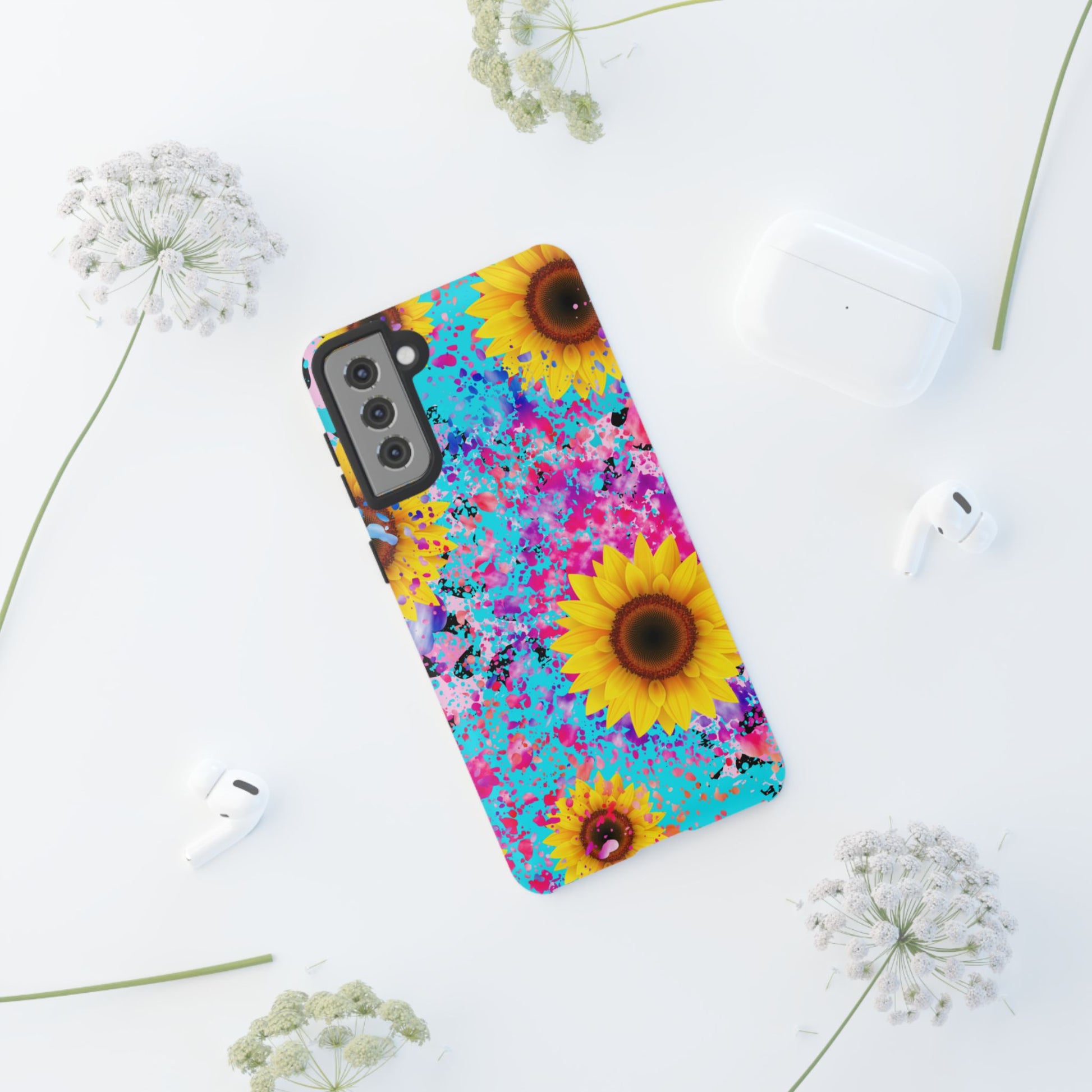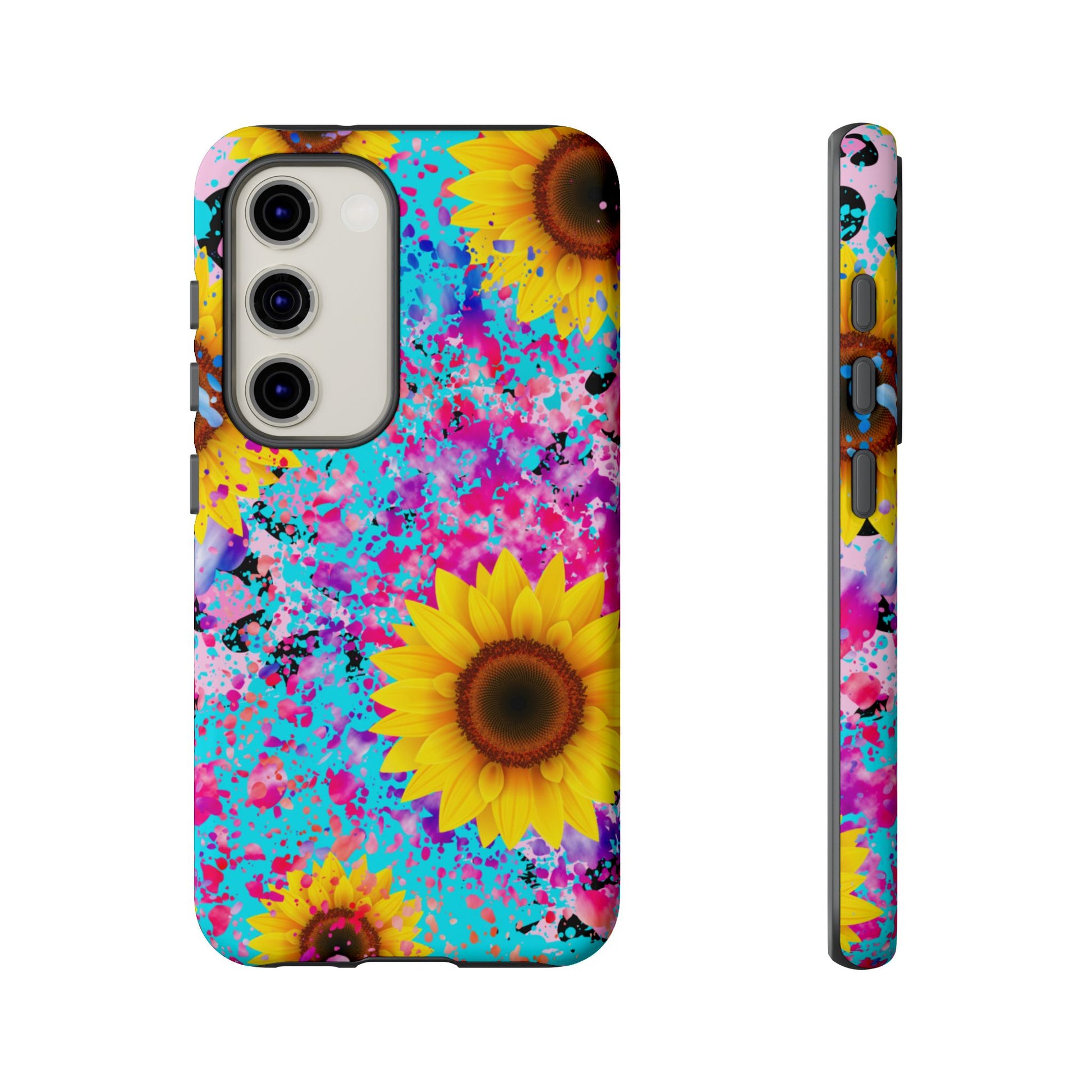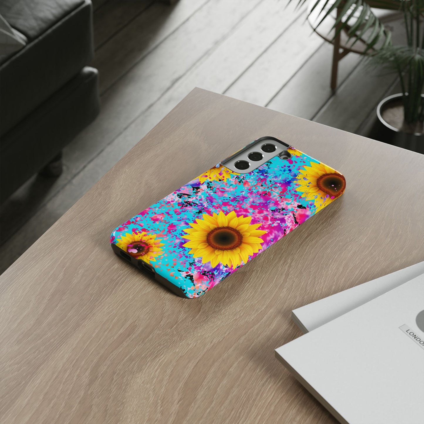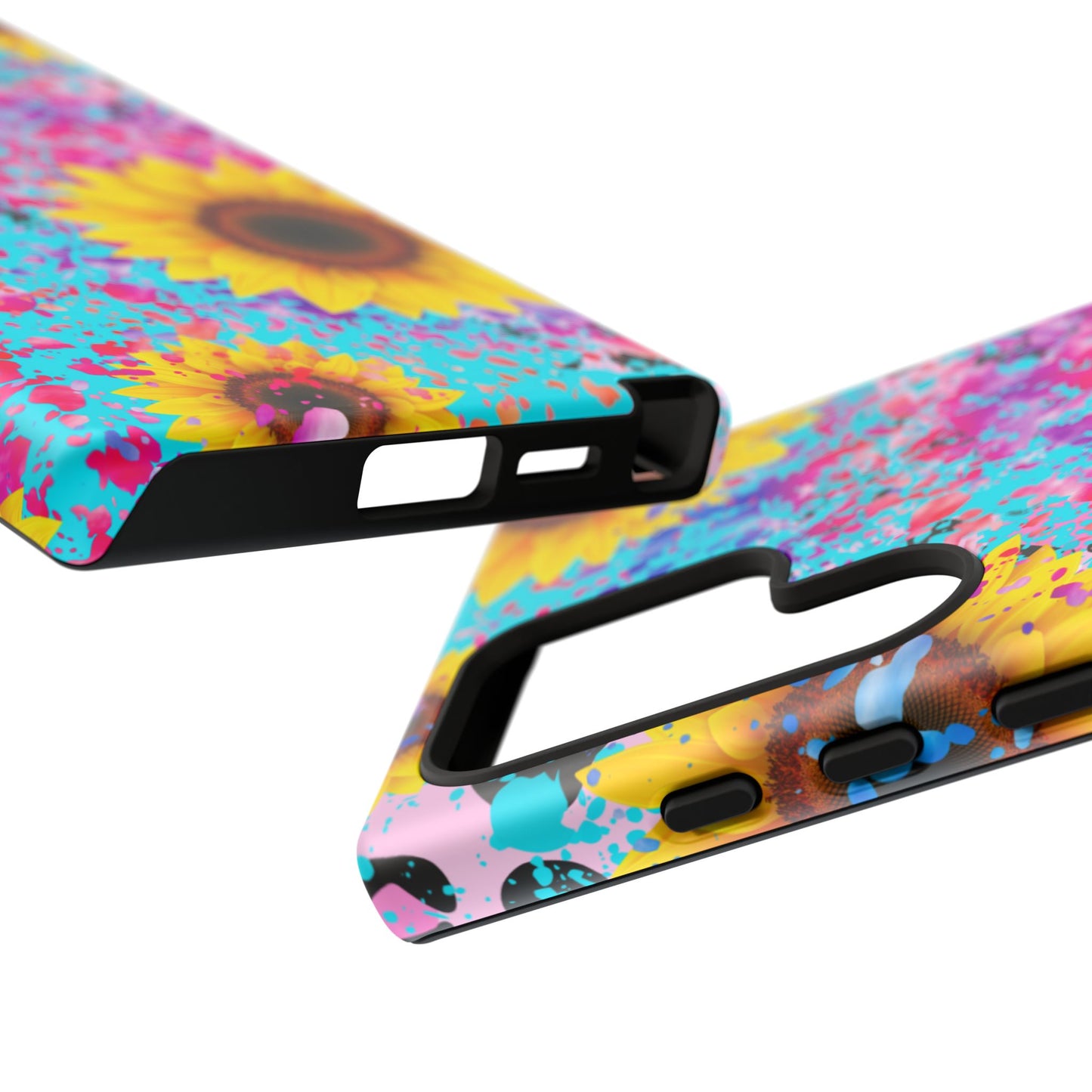 Stand out with this Bright Sunflower Pop Art Samsung Galaxy Case! This bold design features vibrant yellow sunflowers scattered across a lively background of pink, blue, and purple paint splashes with hints of black leopard spots. The playful mix of colors and patterns gives a funky, retro vibe that’s perfect for anyone looking to make a statement. Crafted with a durable polycarbonate shell and shock-absorbing TPU liner, this case not only turns heads but also provides reliable protection. Elevate your style and brighten your day with this one-of-a-kind sunflower case!