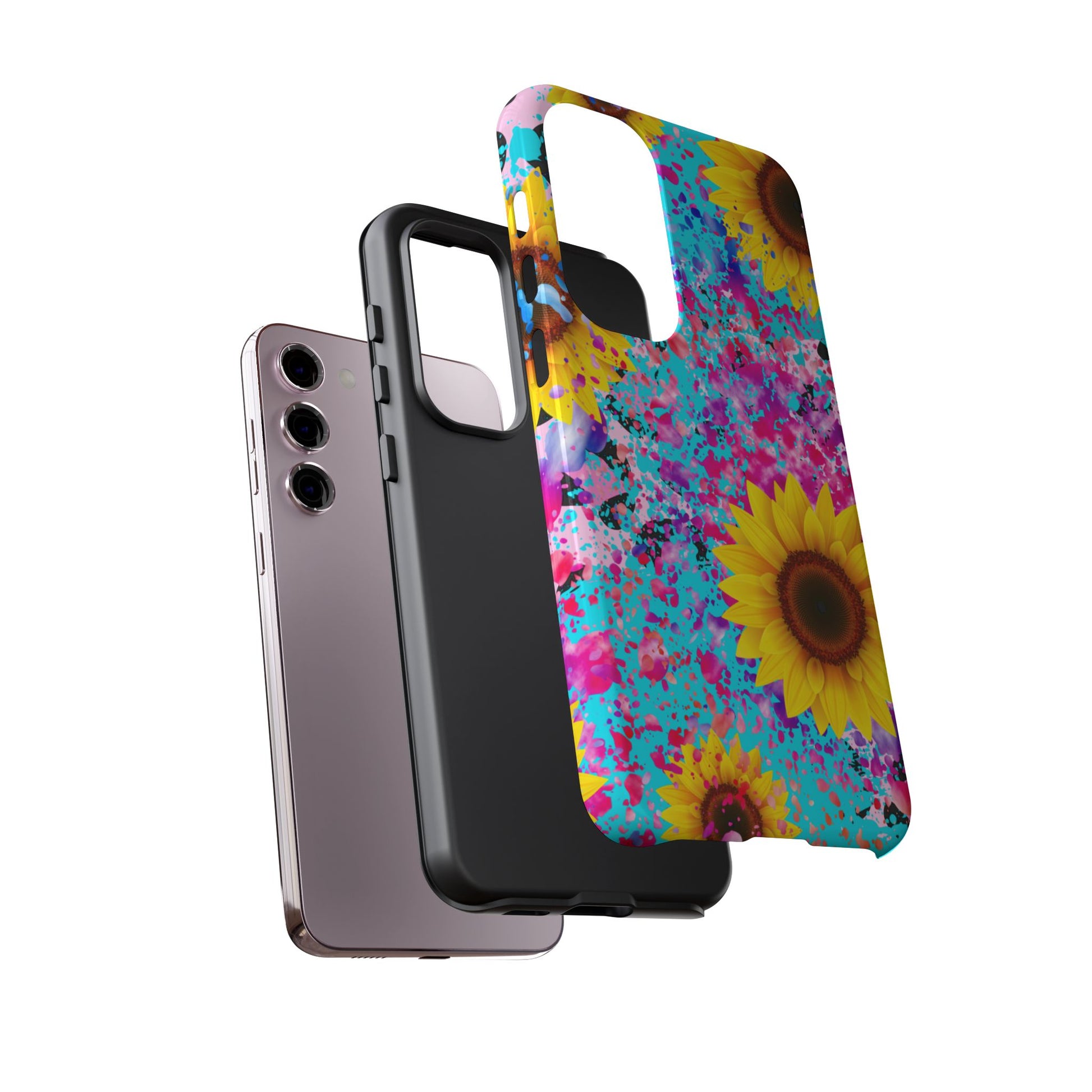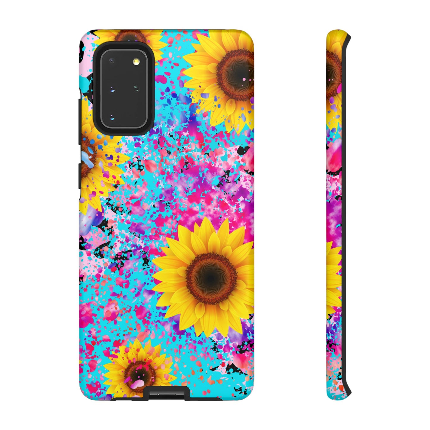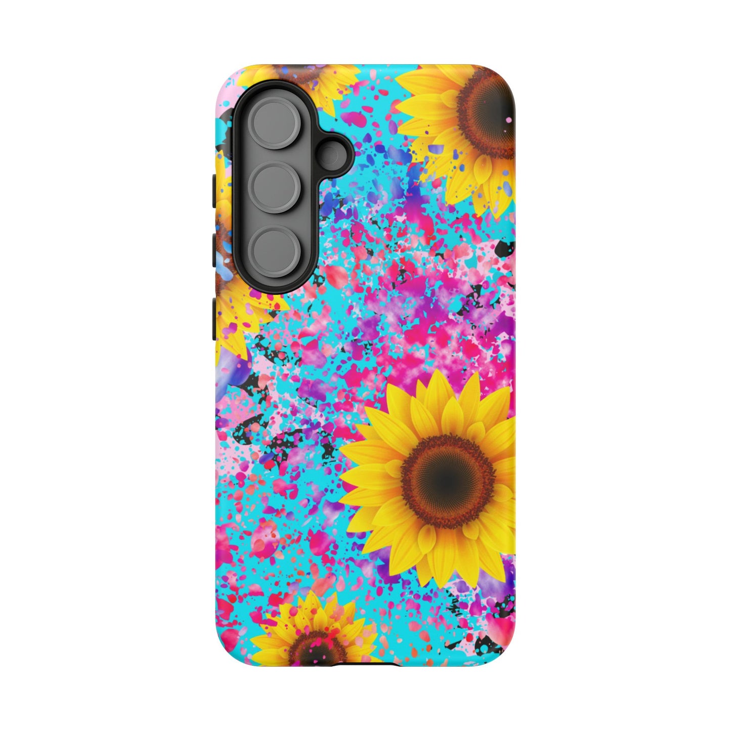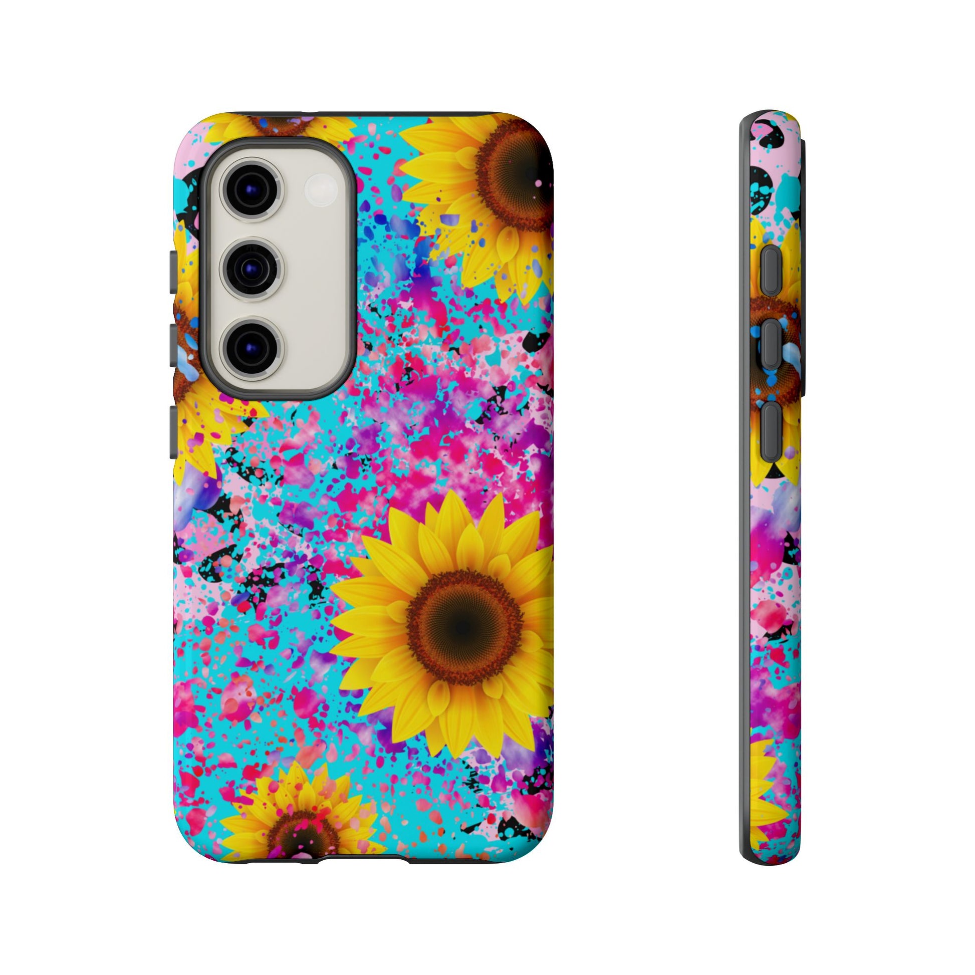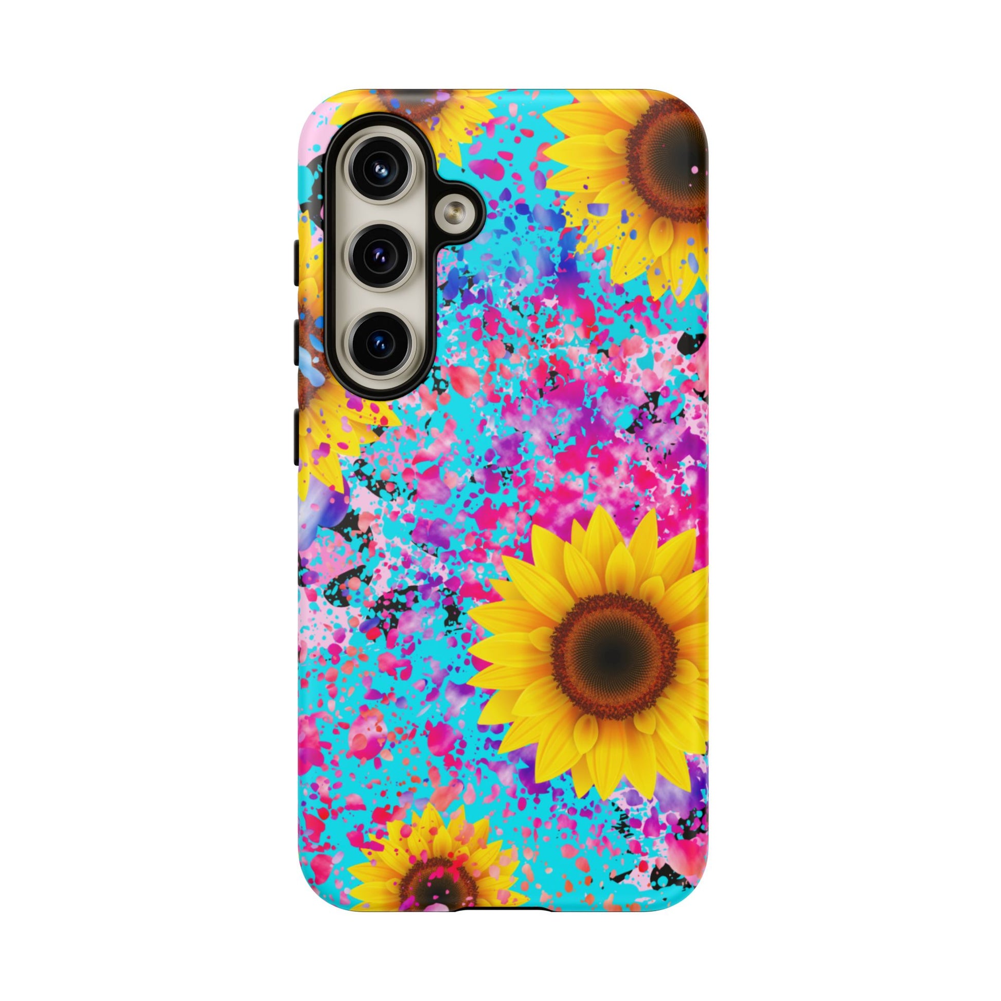 Stand out with this Bright Sunflower Pop Art Samsung Galaxy Case! This bold design features vibrant yellow sunflowers scattered across a lively background of pink, blue, and purple paint splashes with hints of black leopard spots. The playful mix of colors and patterns gives a funky, retro vibe that’s perfect for anyone looking to make a statement. Crafted with a durable polycarbonate shell and shock-absorbing TPU liner, this case not only turns heads but also provides reliable protection. Elevate your style and brighten your day with this one-of-a-kind sunflower case!