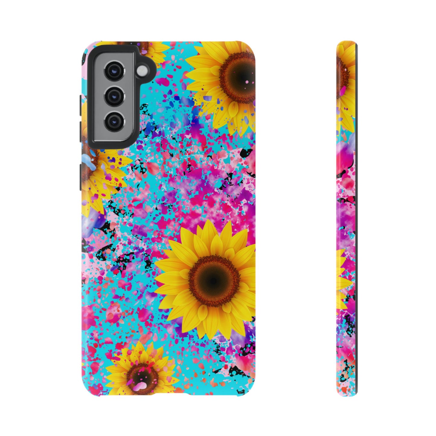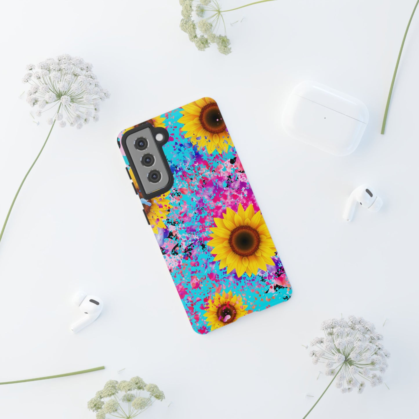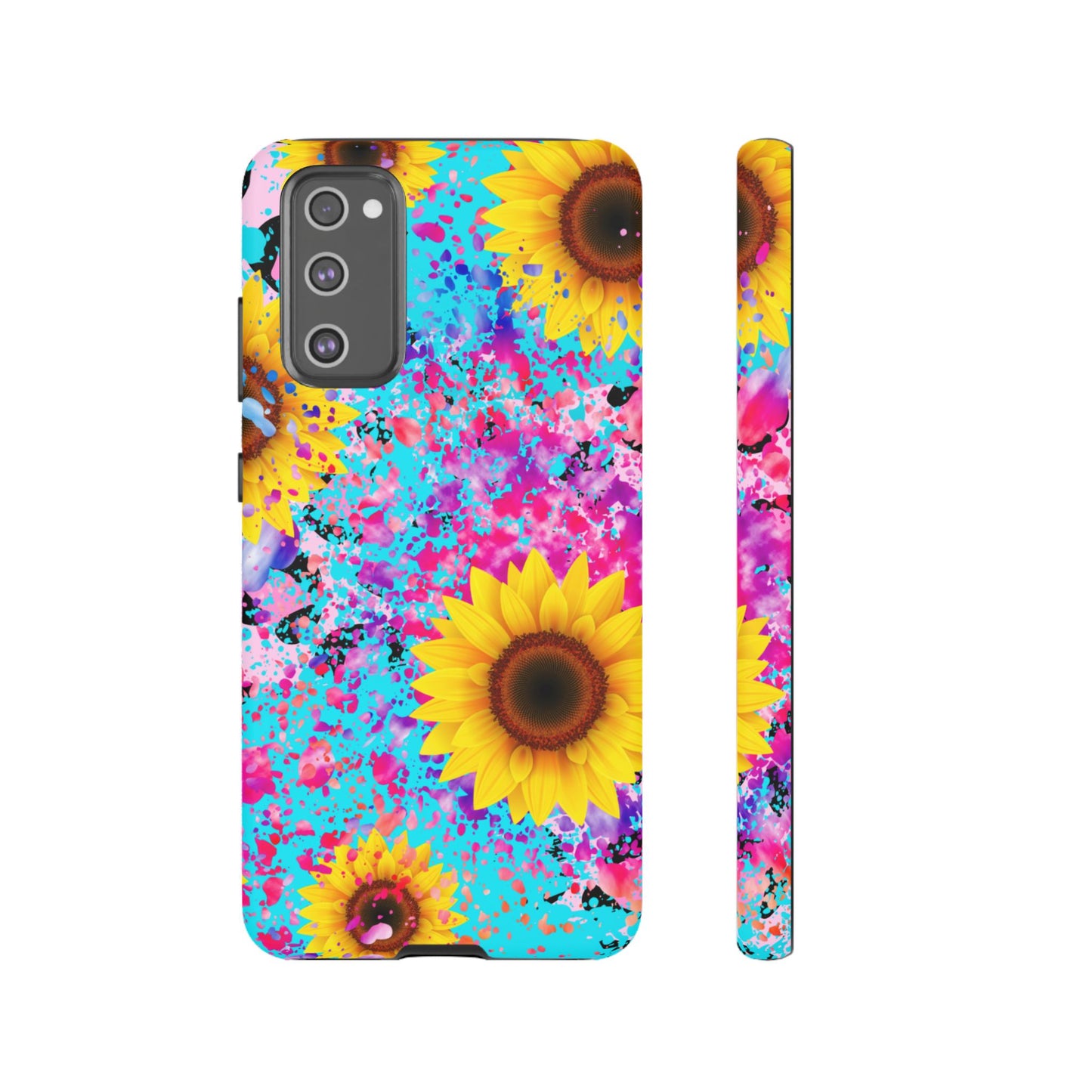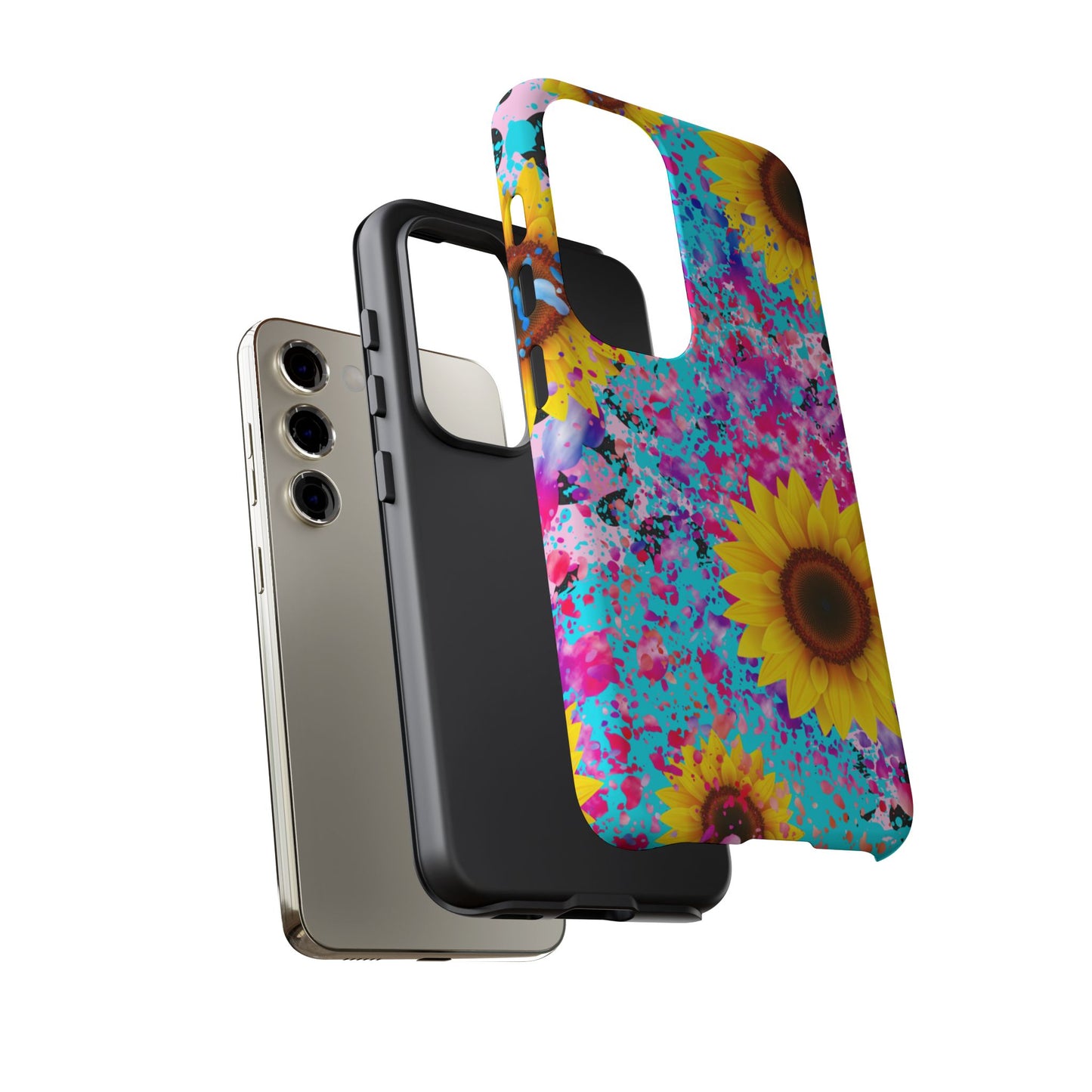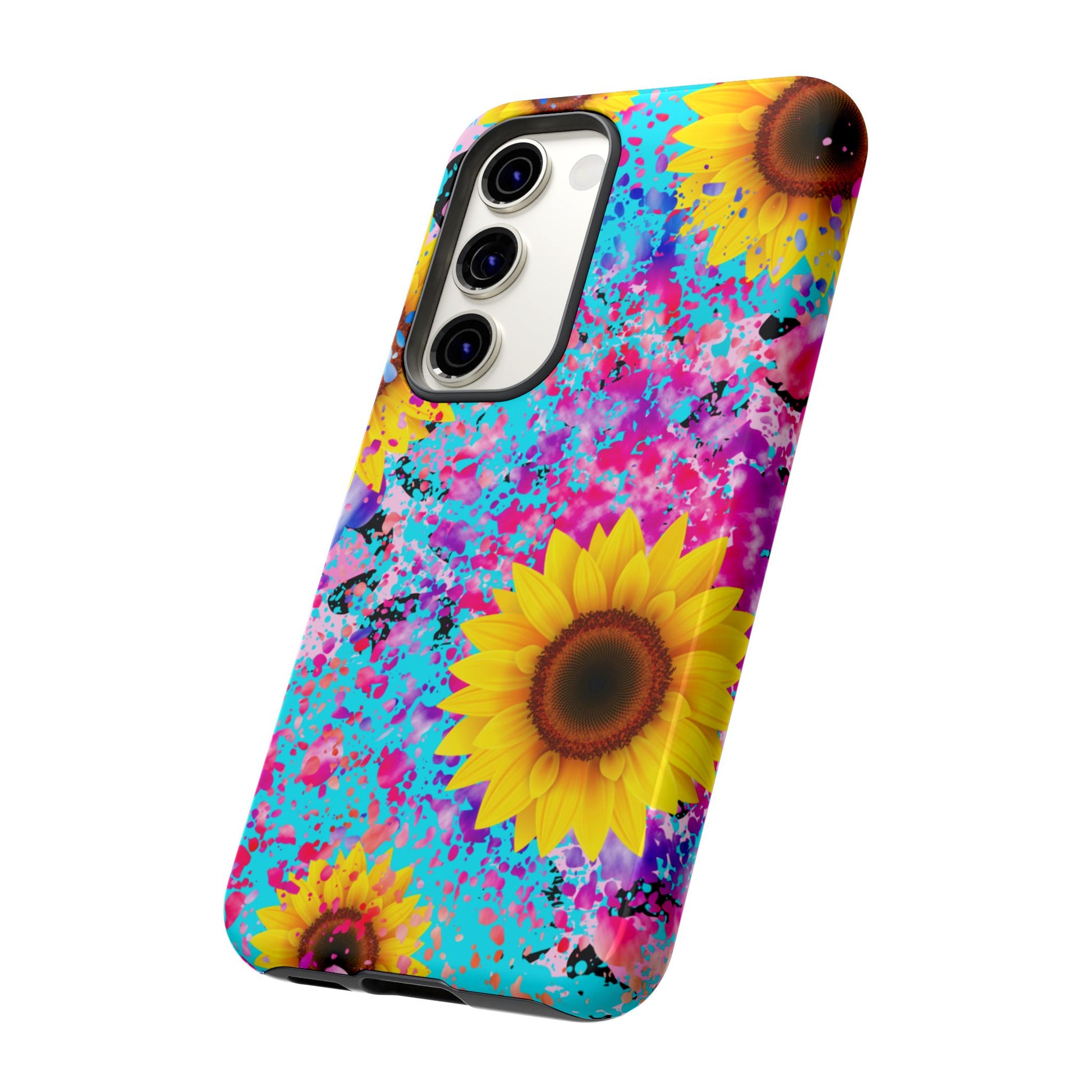 Stand out with this Bright Sunflower Pop Art Samsung Galaxy Case! This bold design features vibrant yellow sunflowers scattered across a lively background of pink, blue, and purple paint splashes with hints of black leopard spots. The playful mix of colors and patterns gives a funky, retro vibe that’s perfect for anyone looking to make a statement. Crafted with a durable polycarbonate shell and shock-absorbing TPU liner, this case not only turns heads but also provides reliable protection. Elevate your style and brighten your day with this one-of-a-kind sunflower case!