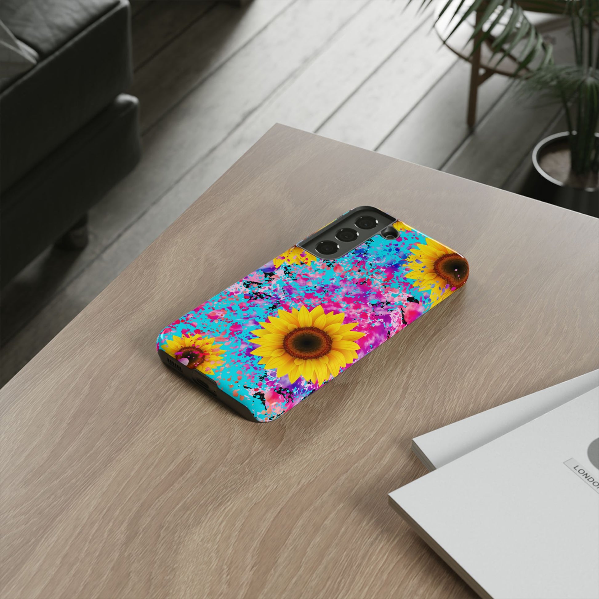 Stand out with this Bright Sunflower Pop Art Samsung Galaxy Case! This bold design features vibrant yellow sunflowers scattered across a lively background of pink, blue, and purple paint splashes with hints of black leopard spots. The playful mix of colors and patterns gives a funky, retro vib...