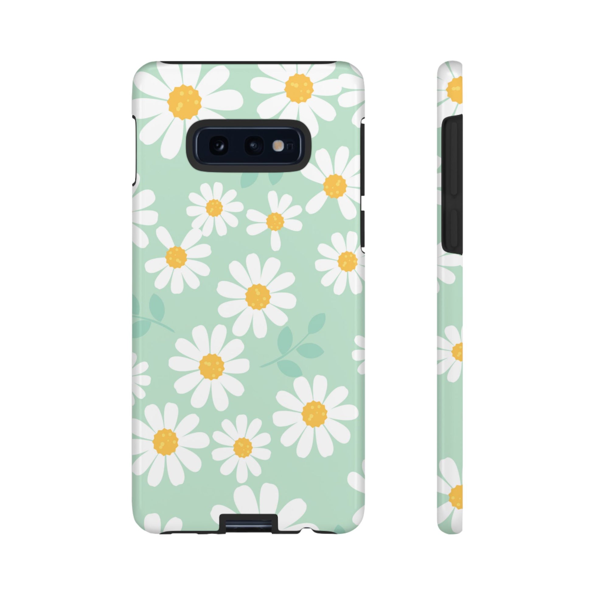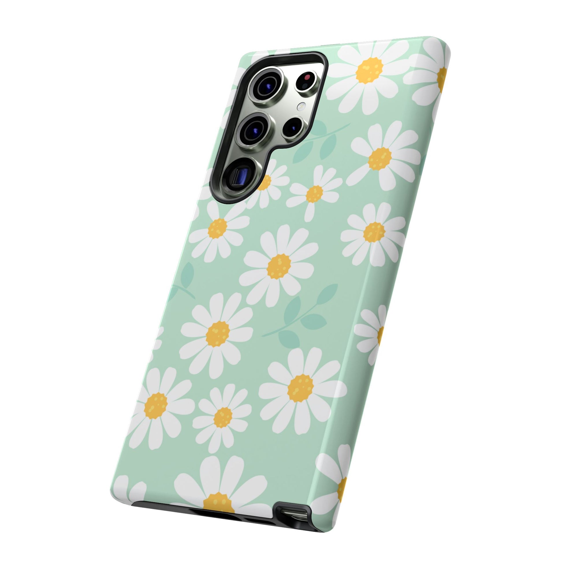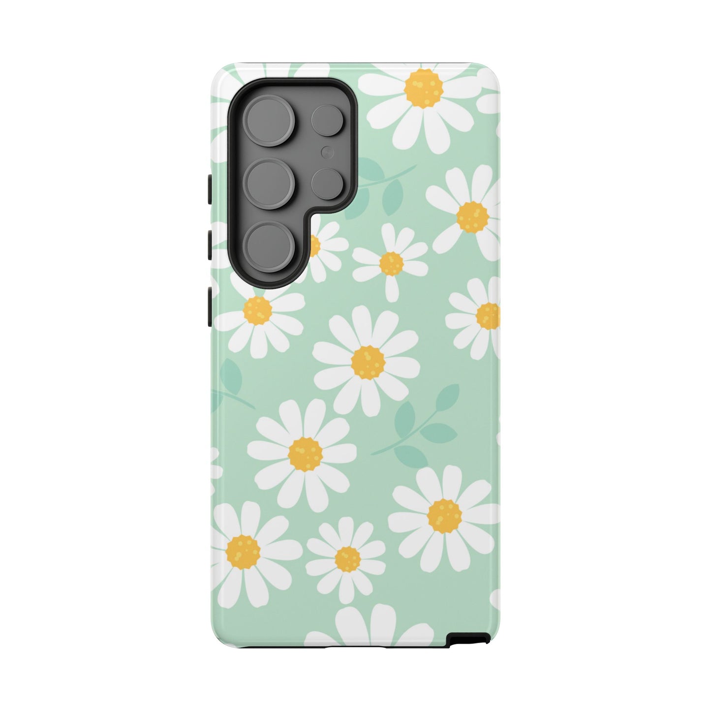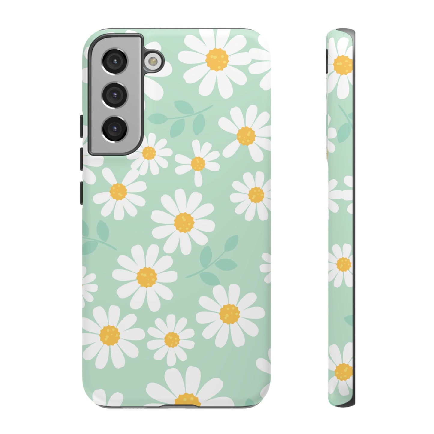 Add a fresh pop of spring to your phone with our Charming Daisy Floral Tough Samsung Galaxy Case. Featuring a delightful pattern of white daisies with sunny yellow centers on a soft mint green background, this case brings cheerful vibes to your everyday look. Made with a dual-layer construction for ultimate protection, the outer shell guards against scratches while the impact-resistant inner lining absorbs shocks from drops and bumps. The slim profile ensures it fits easily in your pocket without sacrificing style or durability.