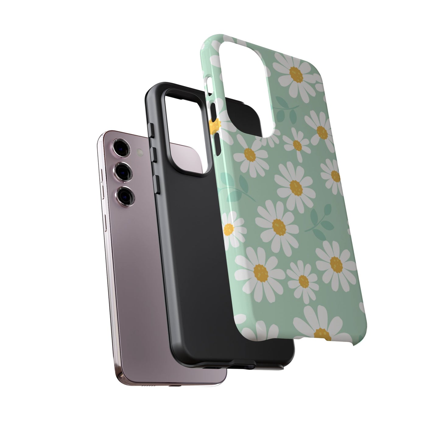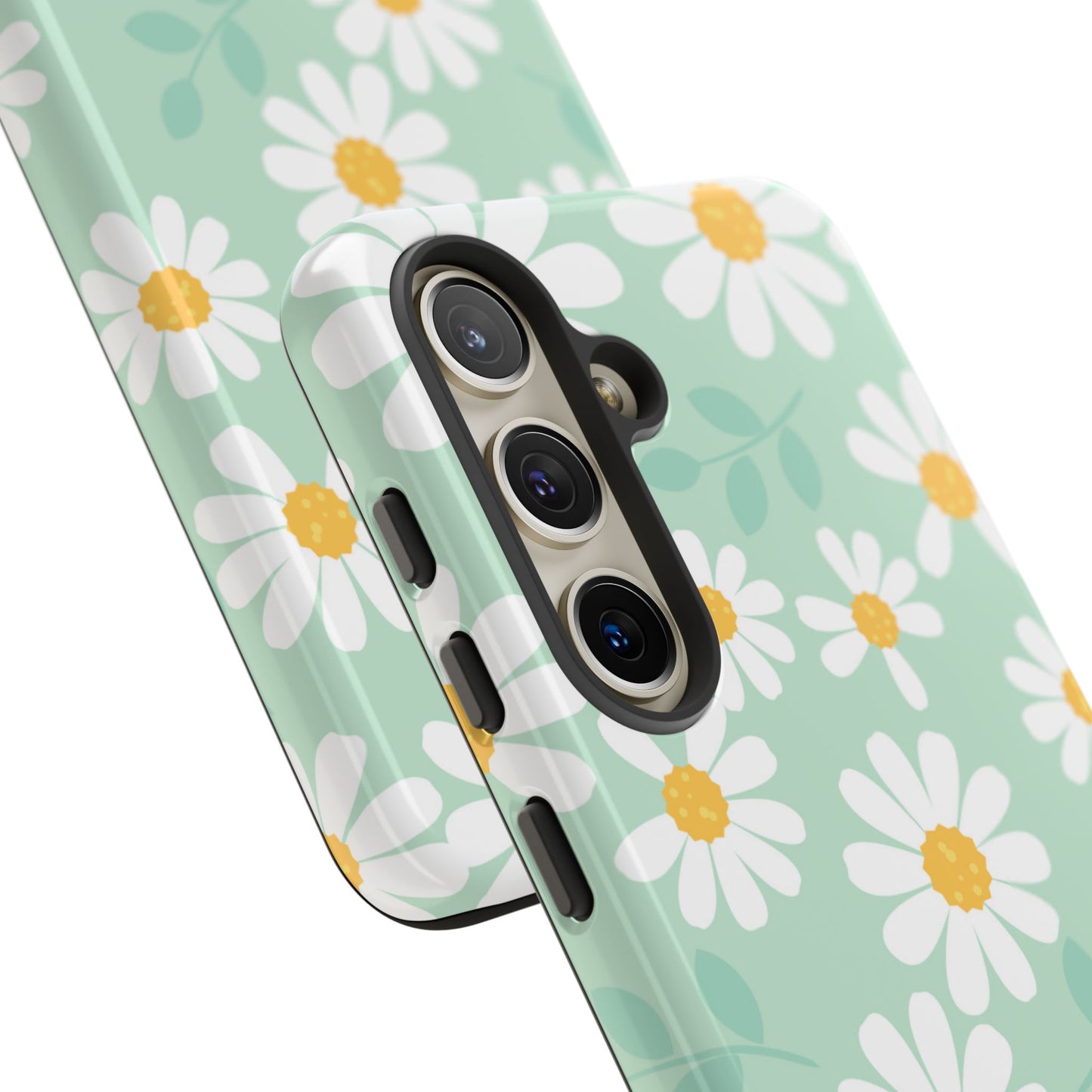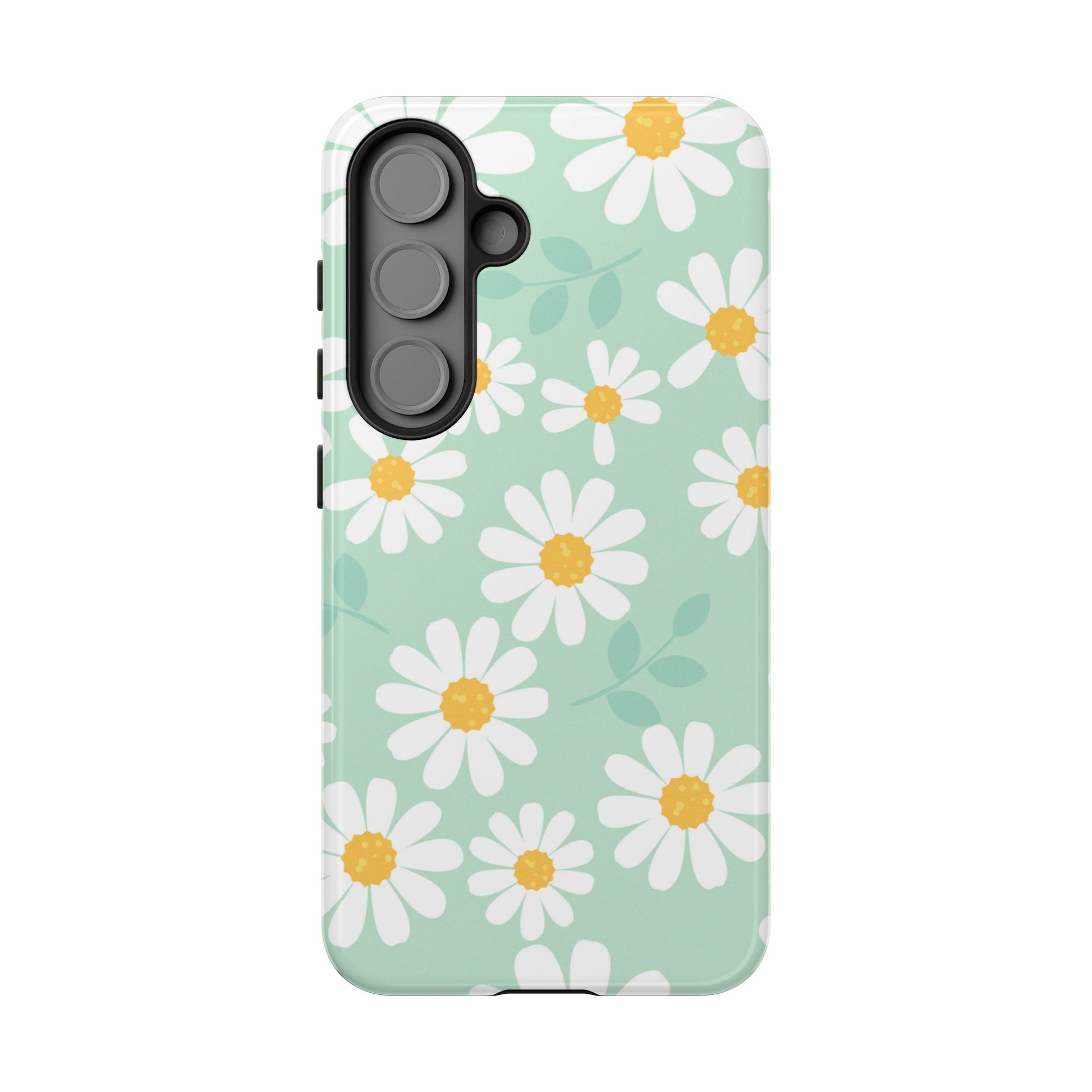Add a fresh pop of spring to your phone with our Charming Daisy Floral Tough Samsung Galaxy Case. Featuring a delightful pattern of white daisies with sunny yellow centers on a soft mint green background, this case brings cheerful vibes to your everyday look. Made with a dual-layer construction for ultimate protection, the outer shell guards against scratches while the impact-resistant inner lining absorbs shocks from drops and bumps. The slim profile ensures it fits easily in your pocket without sacrificing style or durability.