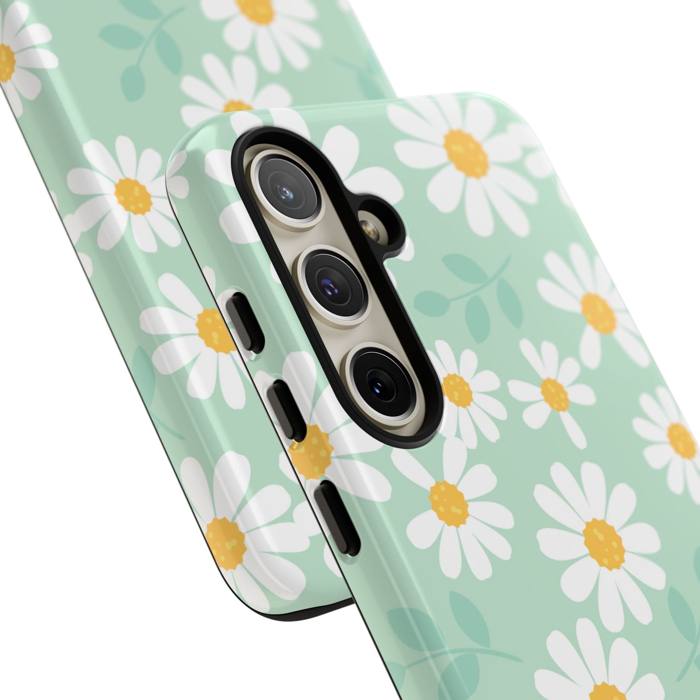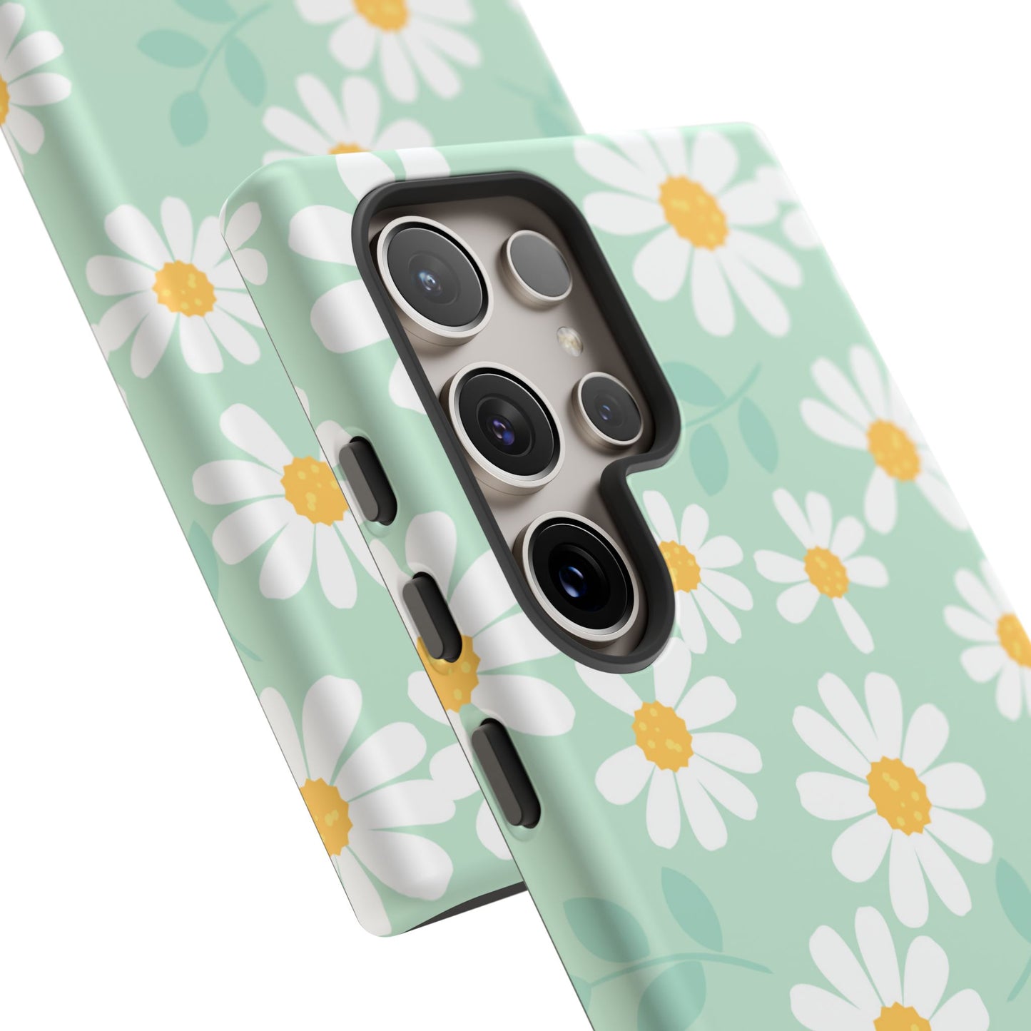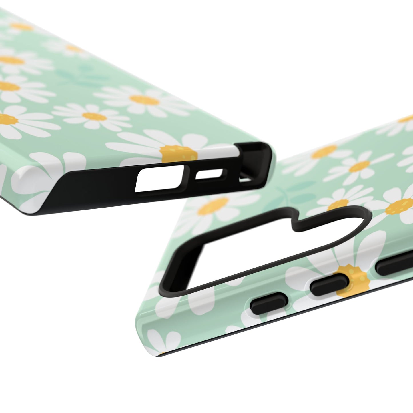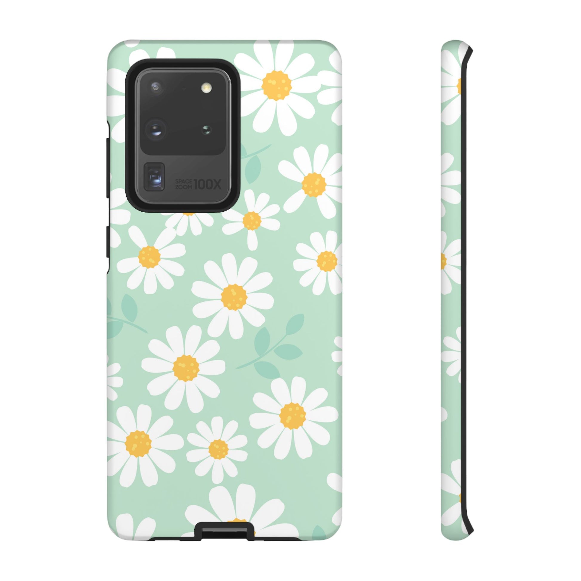 Add a fresh pop of spring to your phone with our Charming Daisy Floral Tough Samsung Galaxy Case. Featuring a delightful pattern of white daisies with sunny yellow centers on a soft mint green background, this case brings cheerful vibes to your everyday look. Made with a dual-layer construction for ultimate protection, the outer shell guards against scratches while the impact-resistant inner lining absorbs shocks from drops and bumps. The slim profile ensures it fits easily in your pocket without sacrificing style or durability.