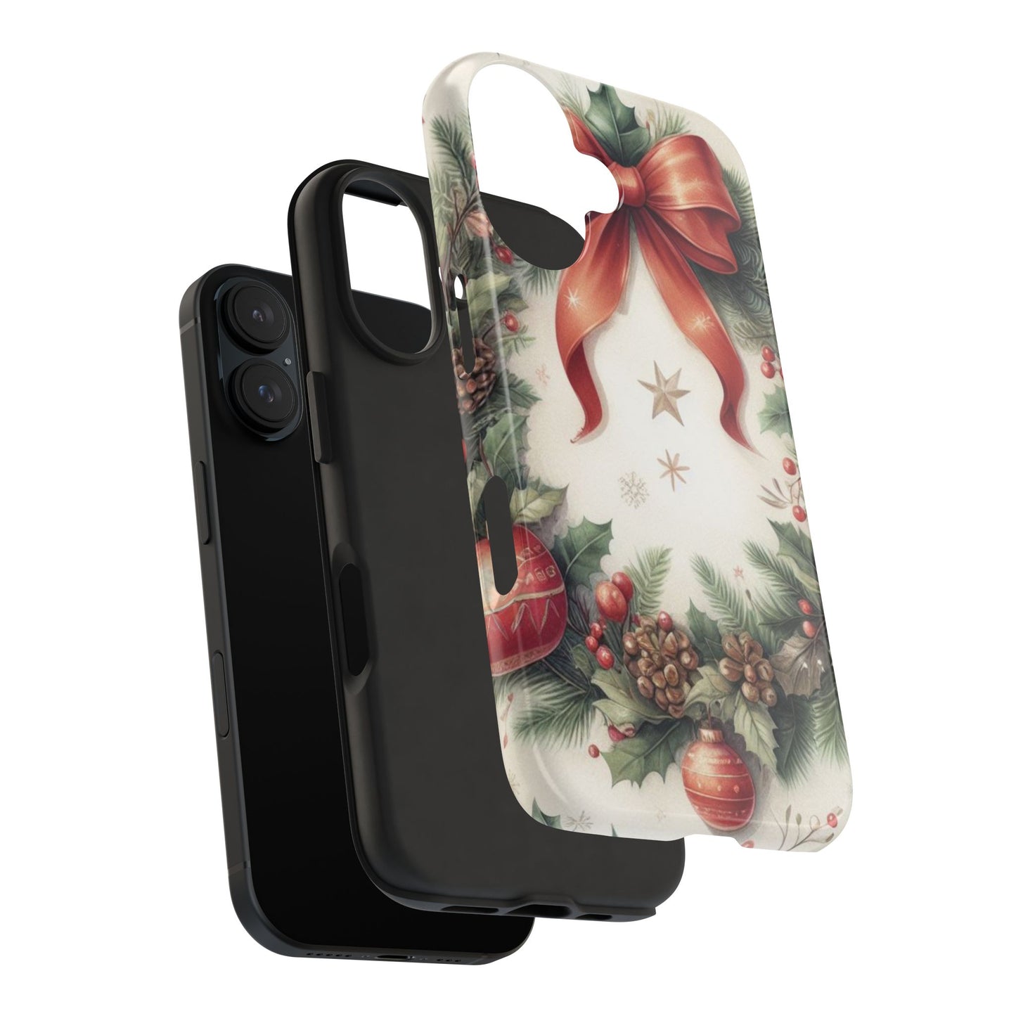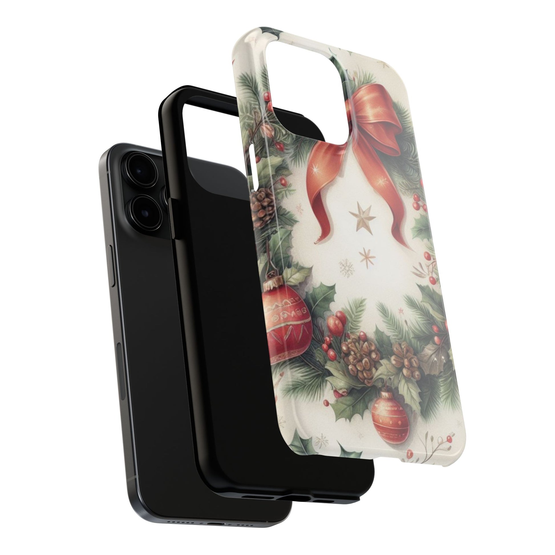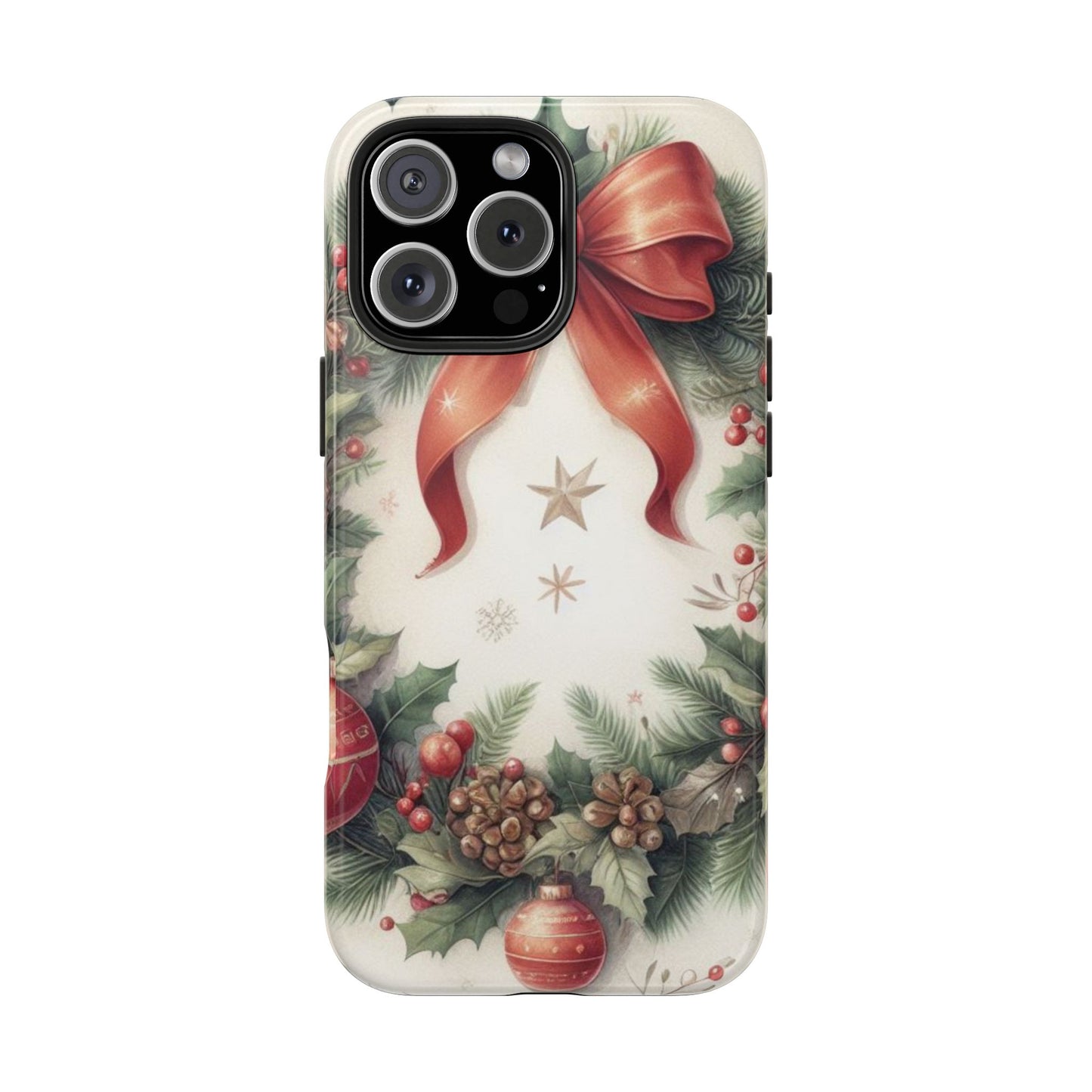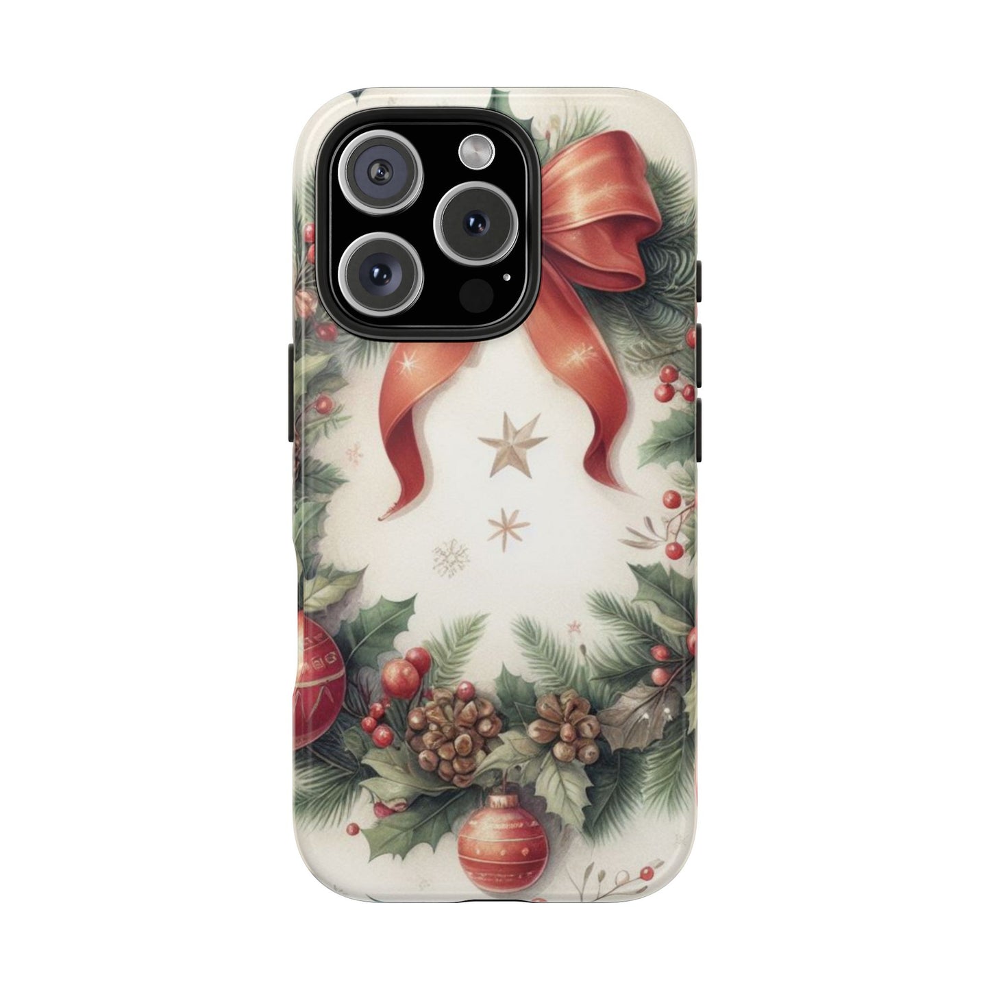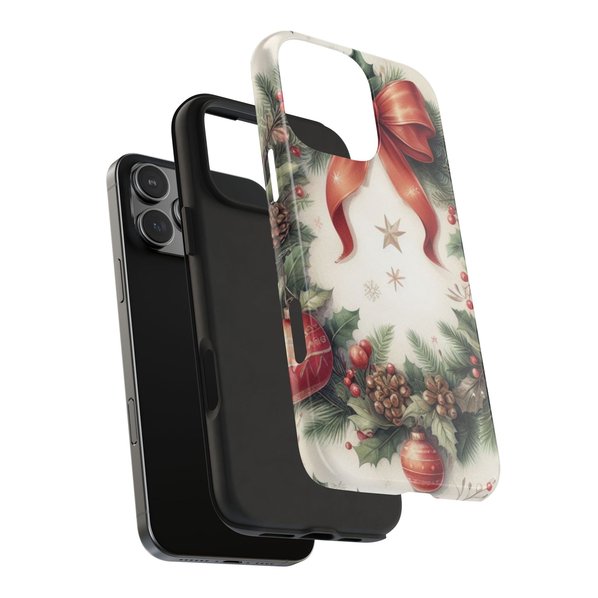 Wrap your phone in timeless holiday elegance with our Classic Christmas Wreath iPhone Case! Featuring a beautifully illustrated wreath adorned with red ribbons, pine cones, ornaments, holly berries, and evergreen branches, this case brings festive charm and a touch of vintage style. Perfect fo...
