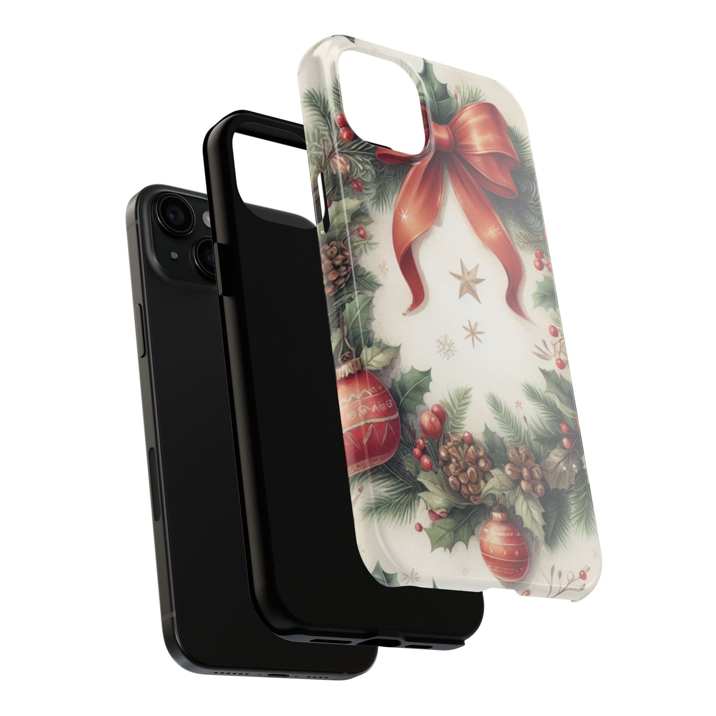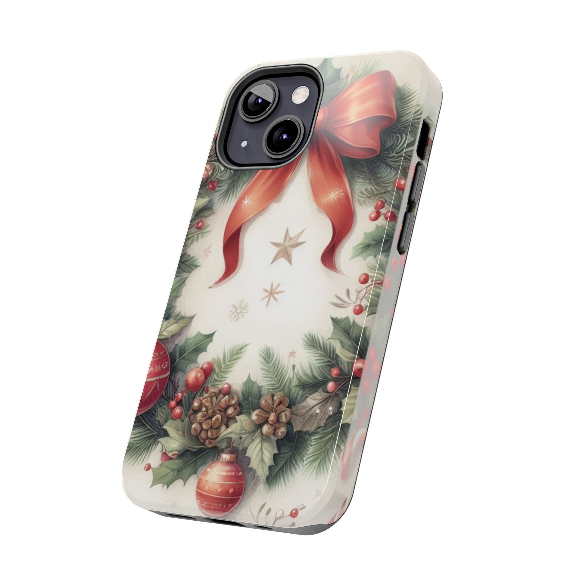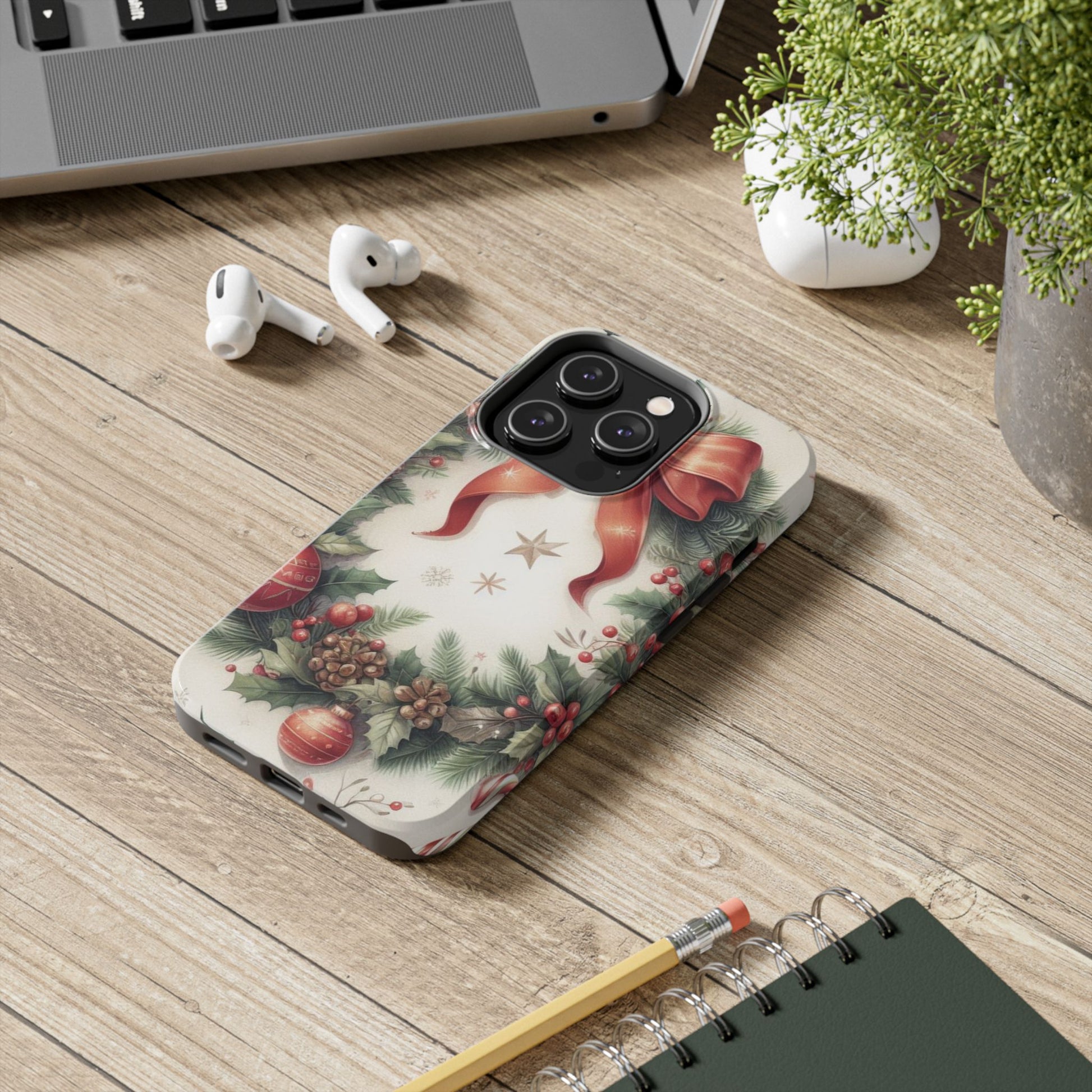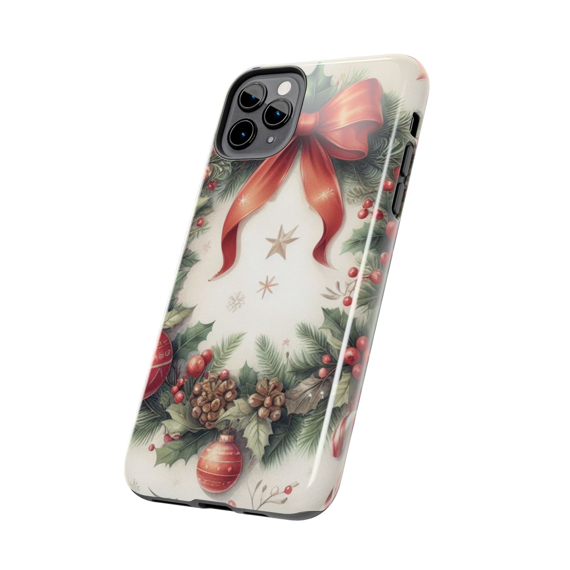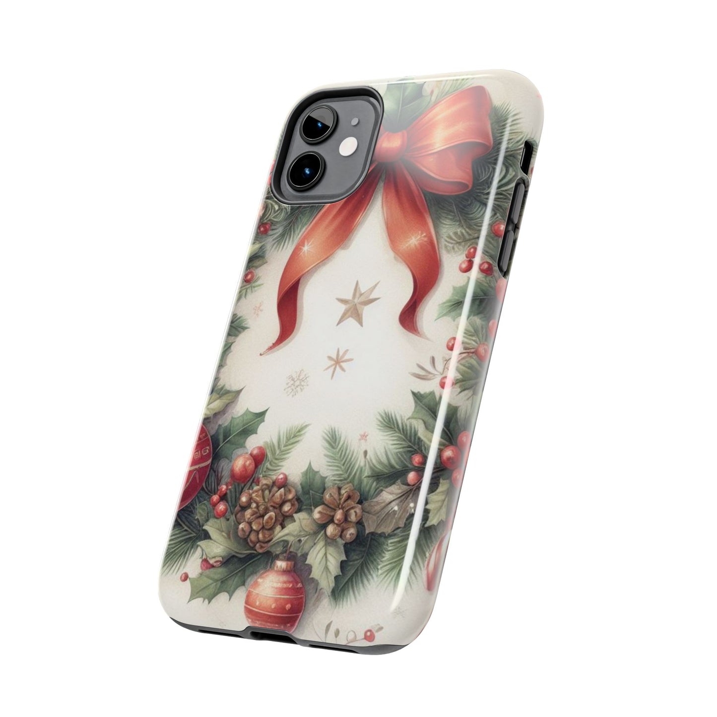 Wrap your phone in timeless holiday elegance with our Classic Christmas Wreath iPhone Case! Featuring a beautifully illustrated wreath adorned with red ribbons, pine cones, ornaments, holly berries, and evergreen branches, this case brings festive charm and a touch of vintage style. Perfect fo...
