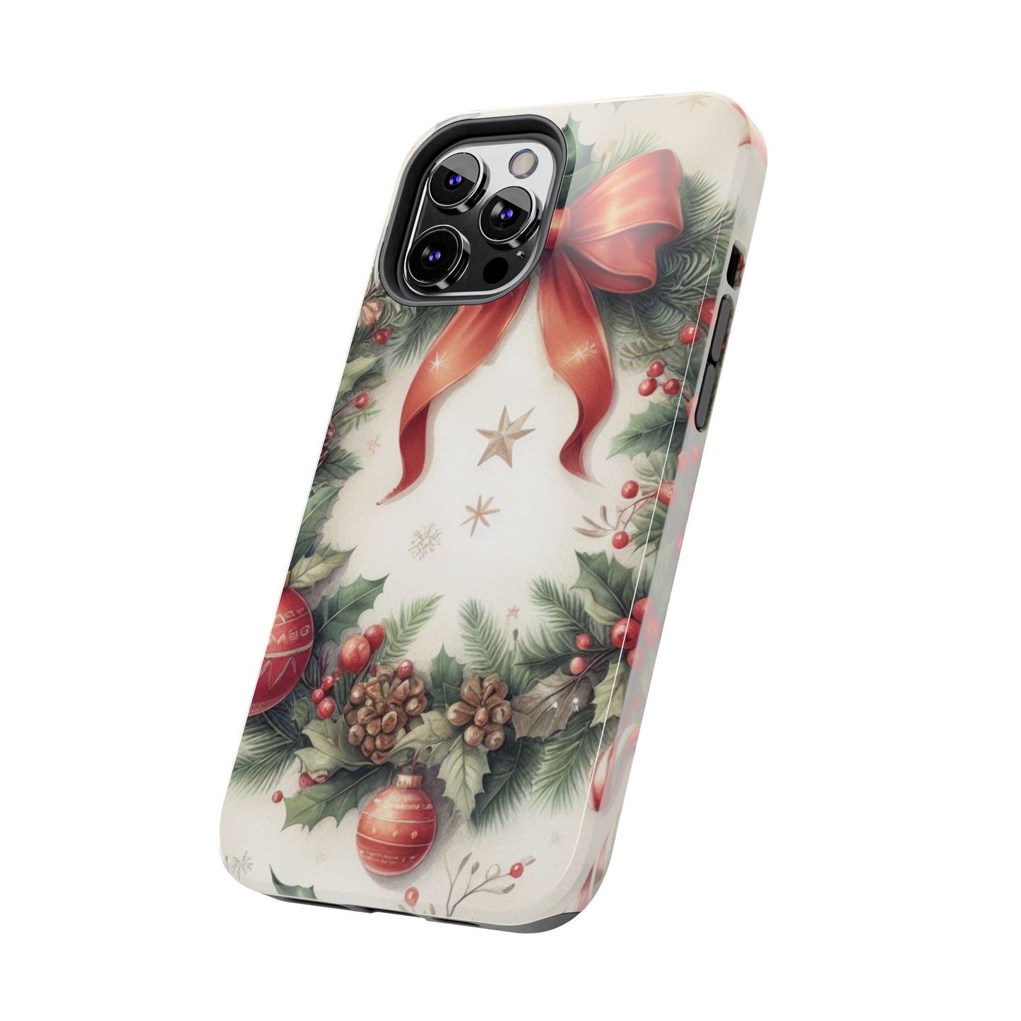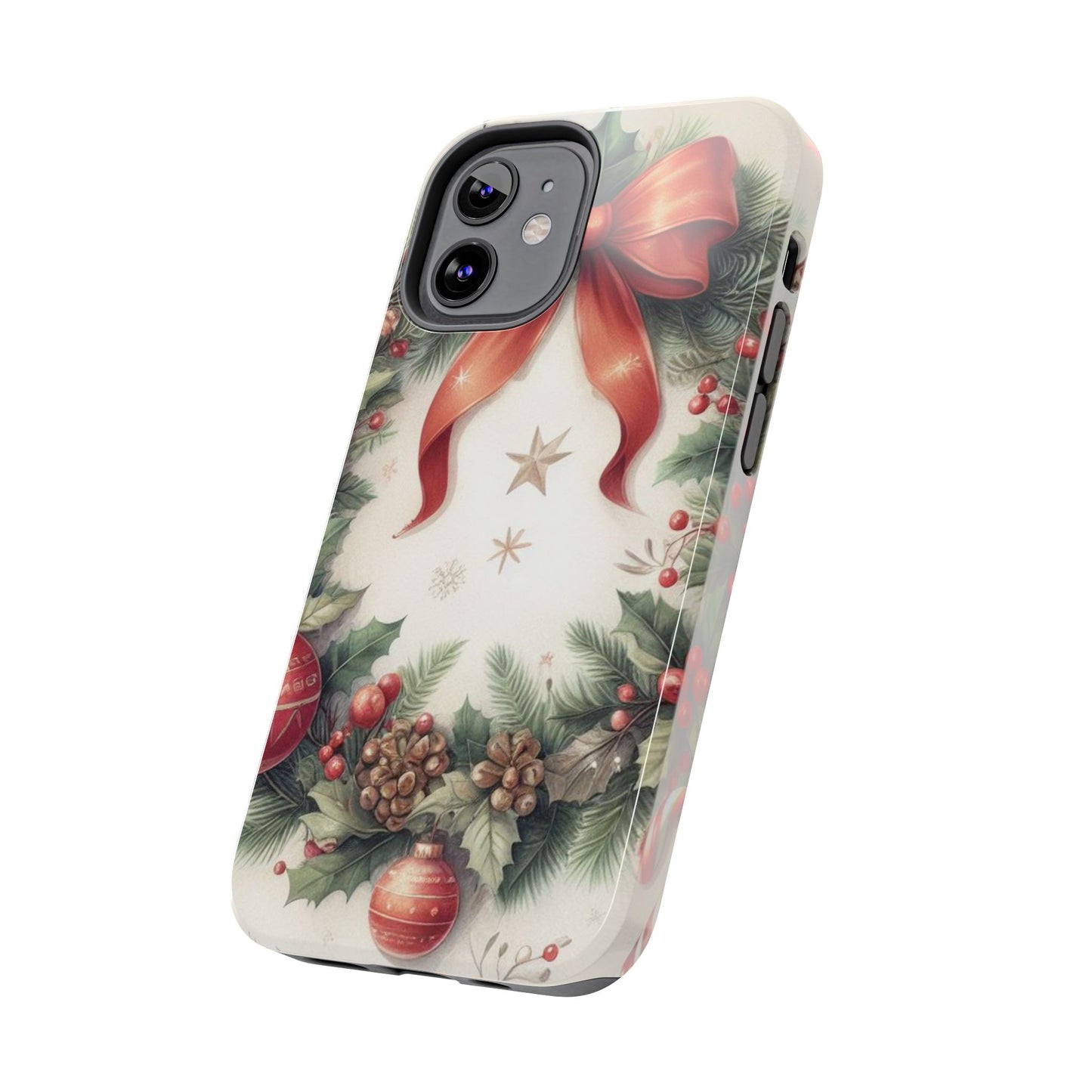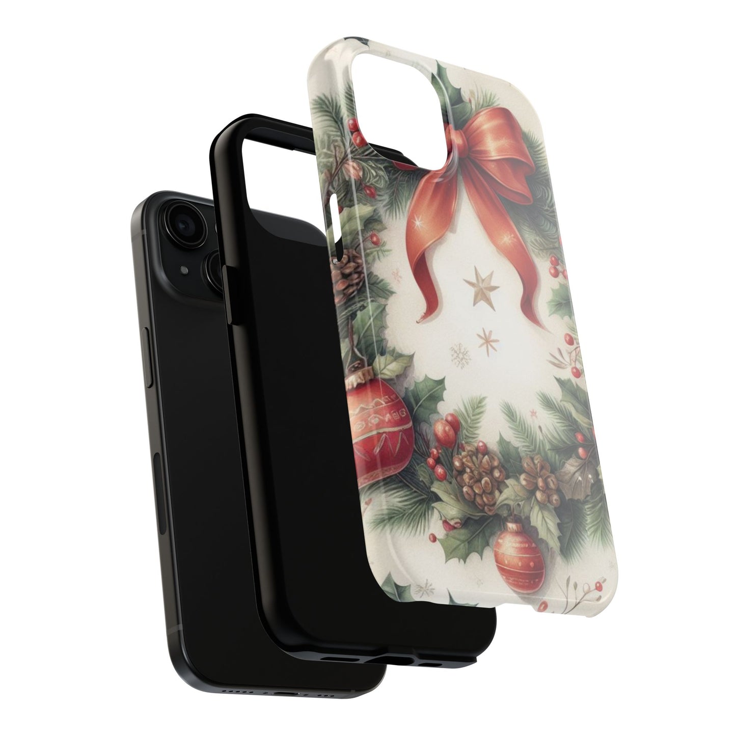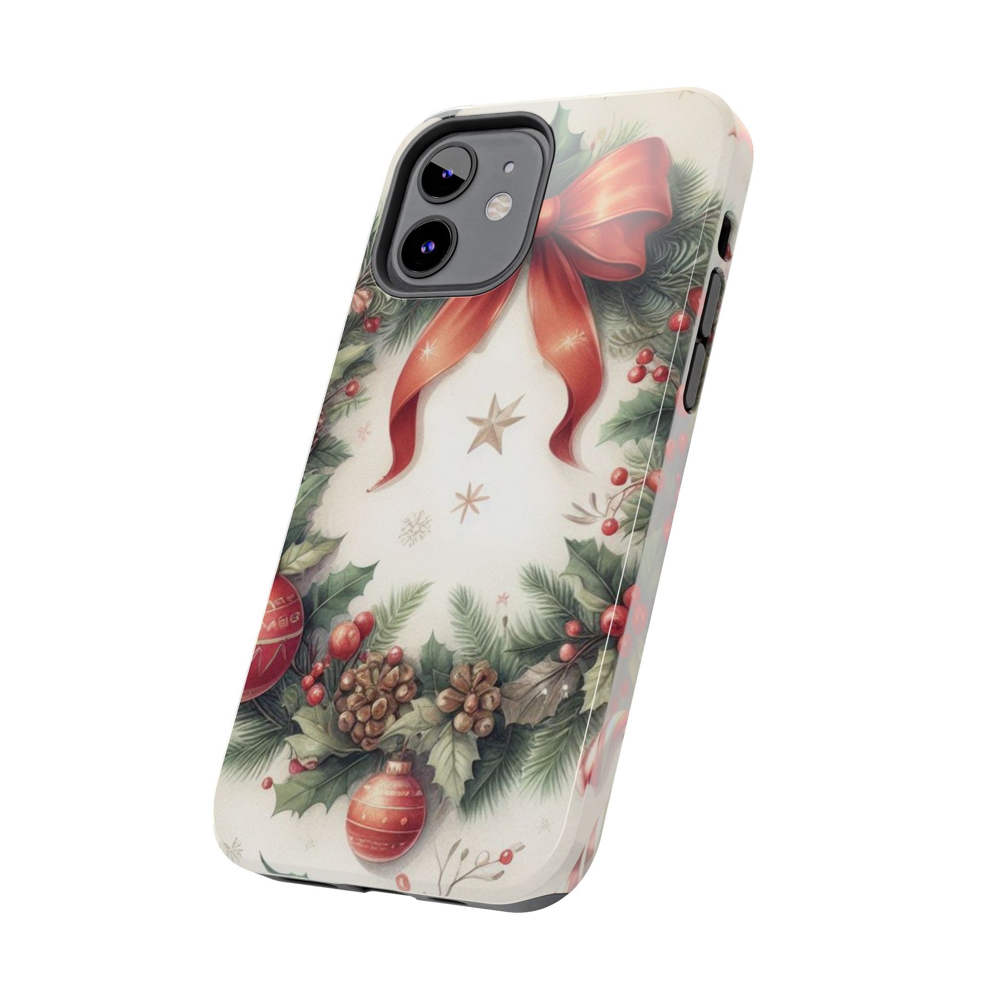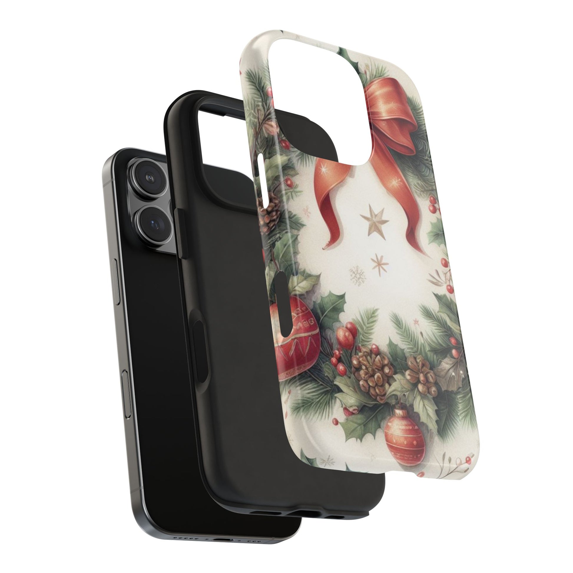 Wrap your phone in timeless holiday elegance with our Classic Christmas Wreath iPhone Case! Featuring a beautifully illustrated wreath adorned with red ribbons, pine cones, ornaments, holly berries, and evergreen branches, this case brings festive charm and a touch of vintage style. Perfect fo...