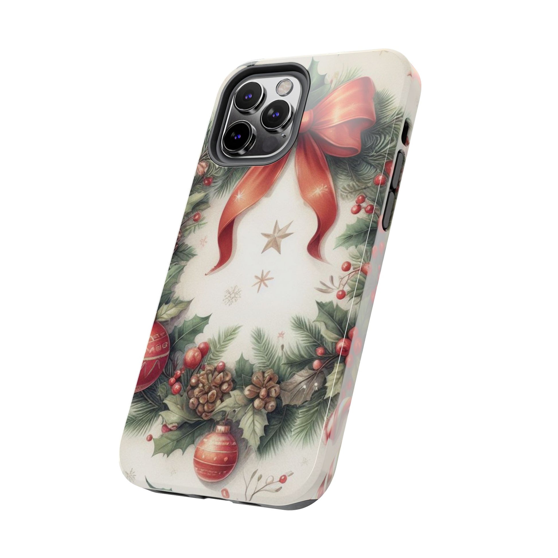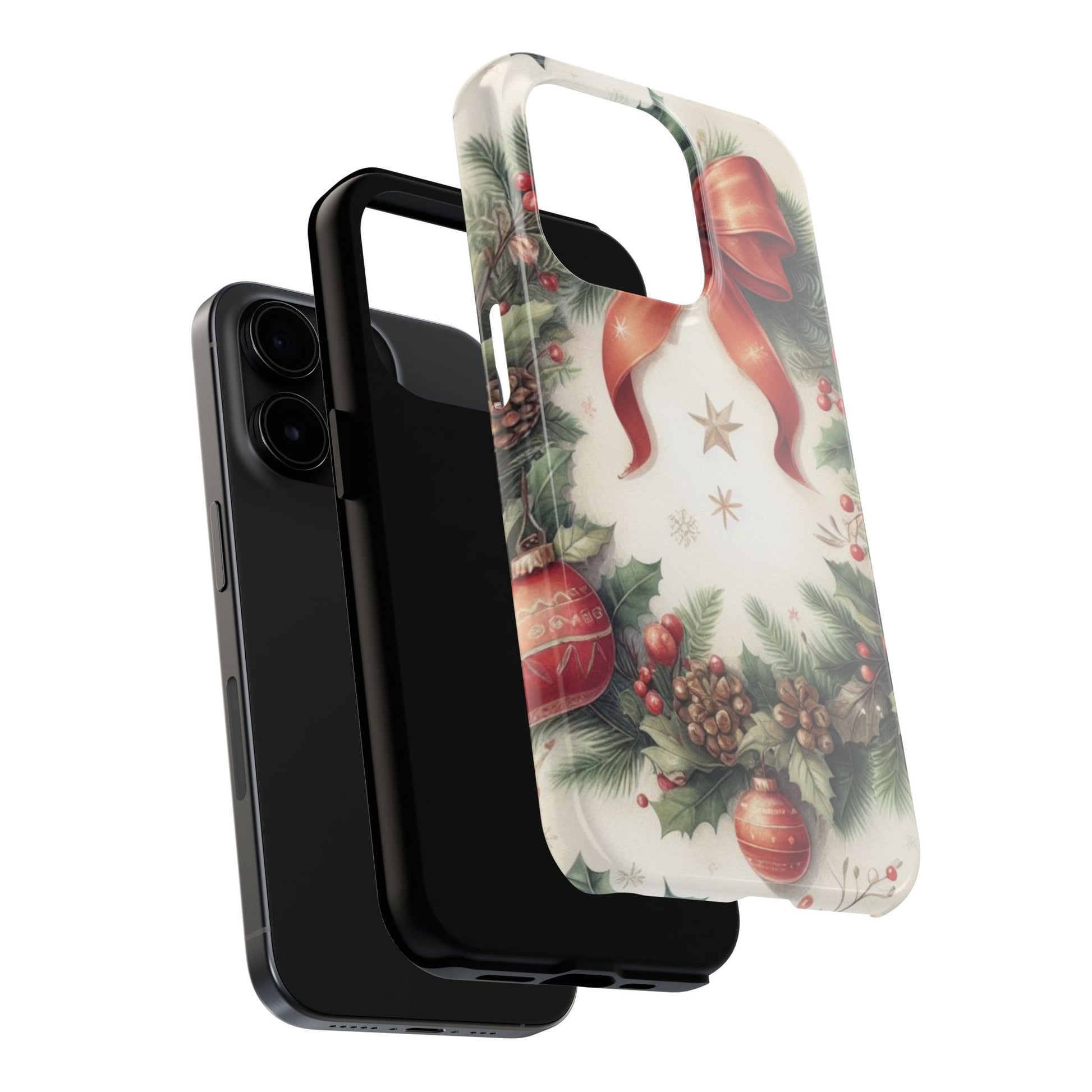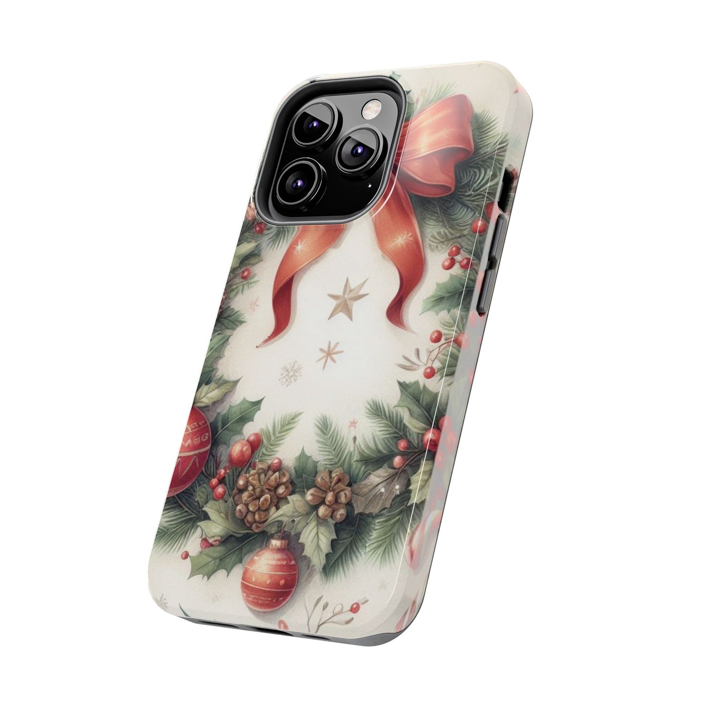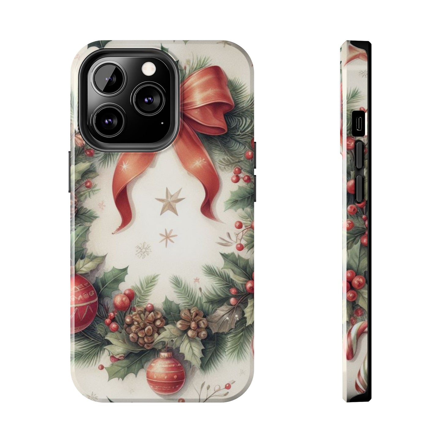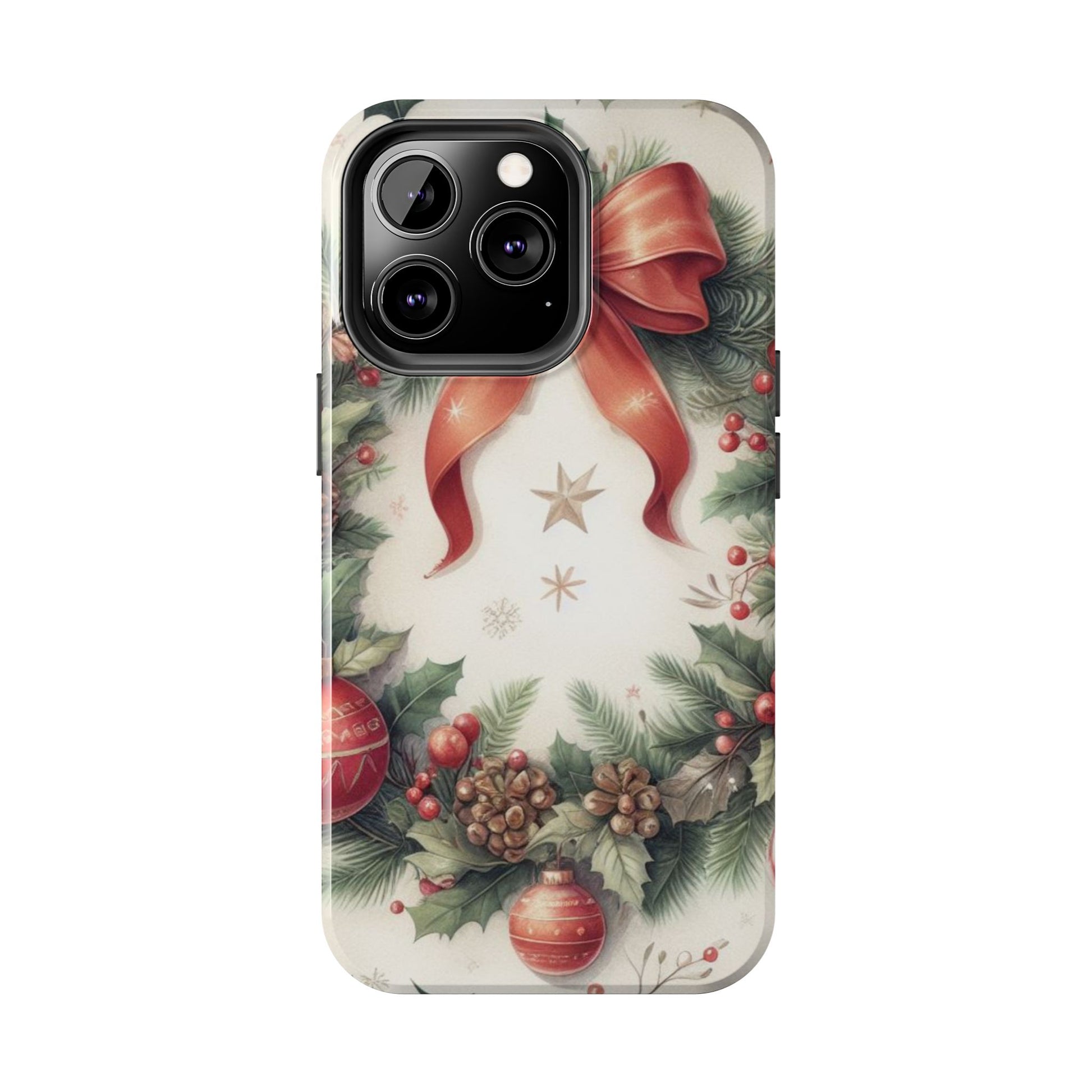 Wrap your phone in timeless holiday elegance with our Classic Christmas Wreath iPhone Case! Featuring a beautifully illustrated wreath adorned with red ribbons, pine cones, ornaments, holly berries, and evergreen branches, this case brings festive charm and a touch of vintage style. Perfect fo...
