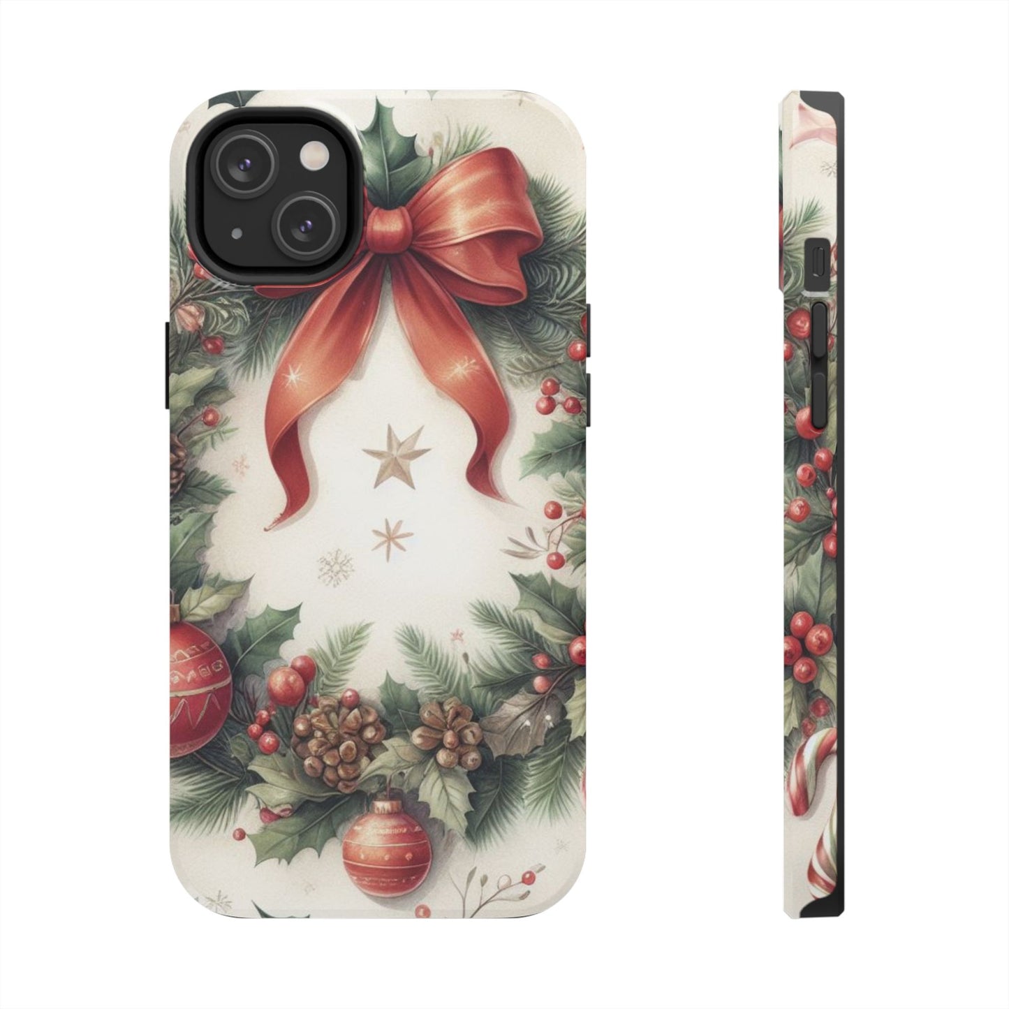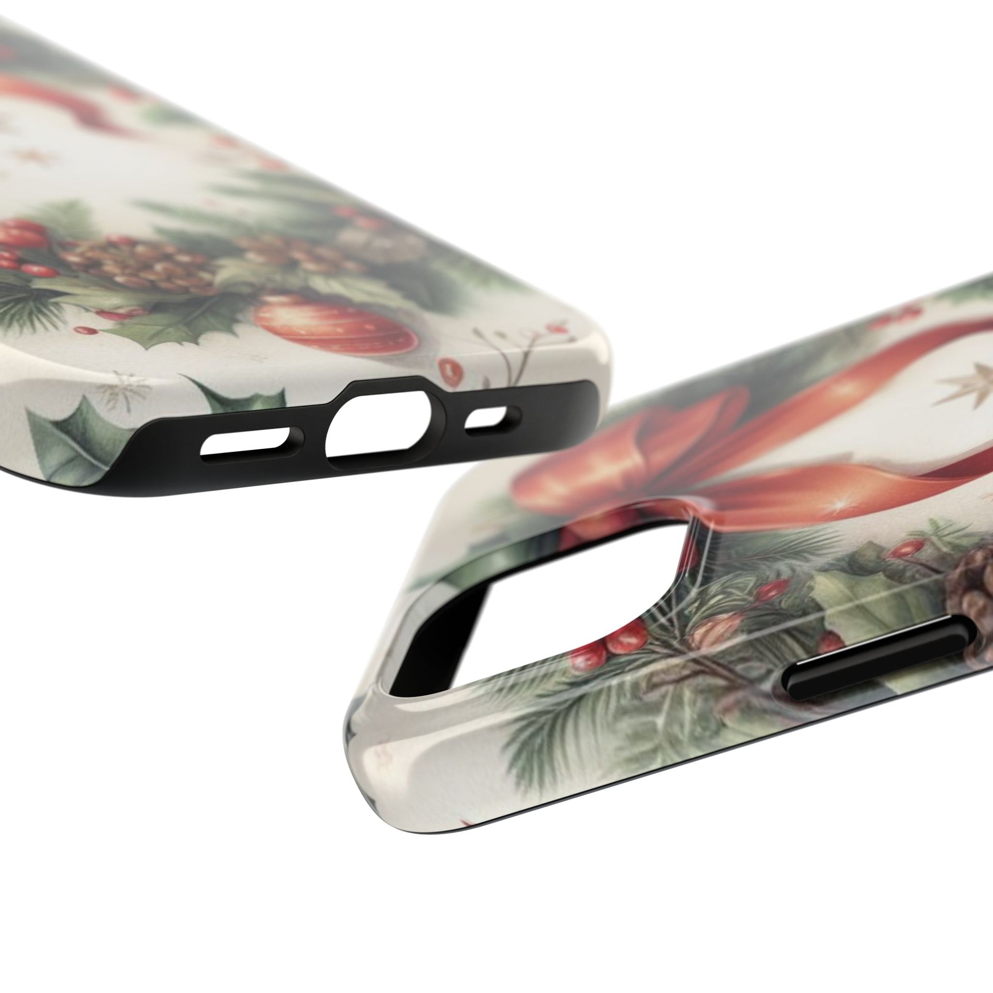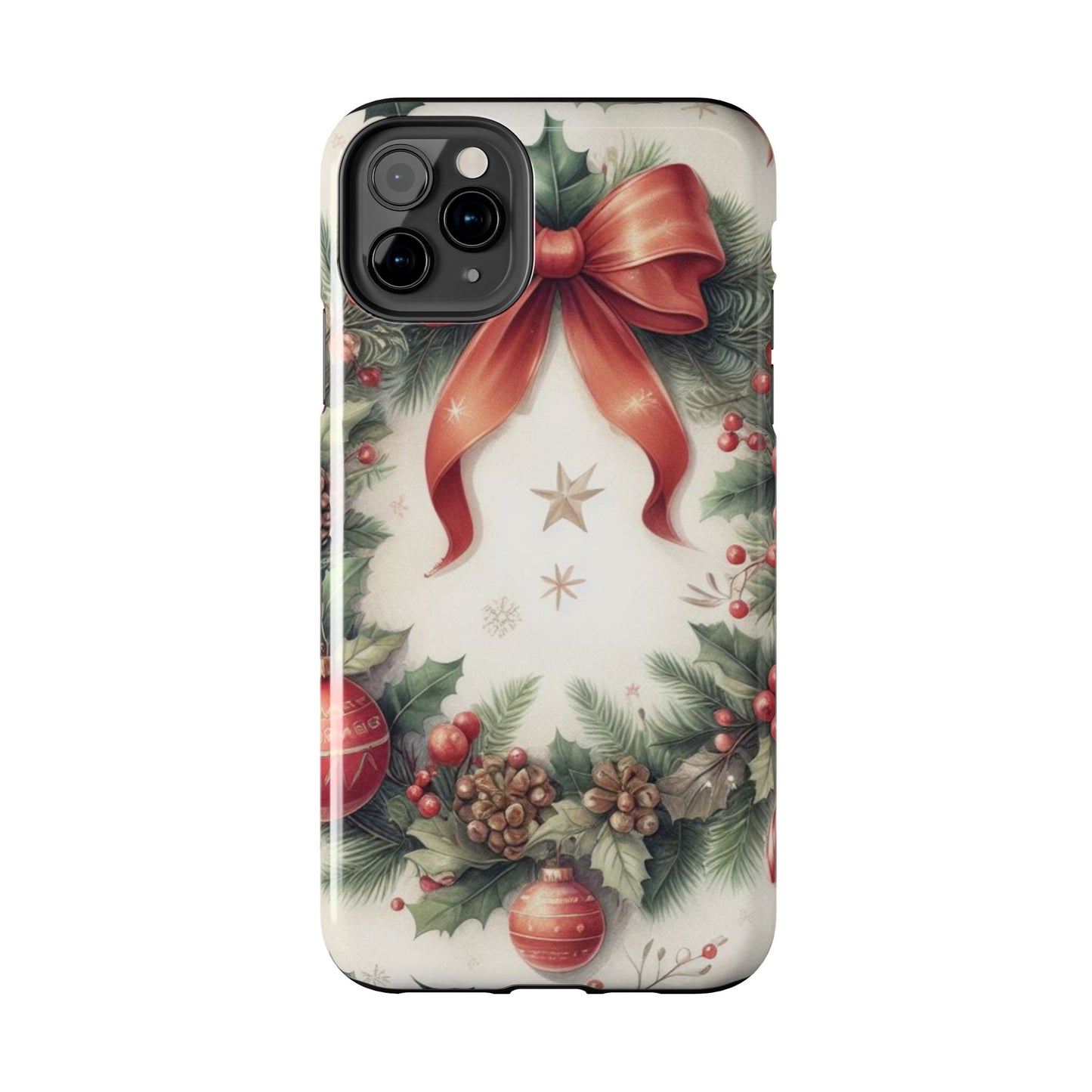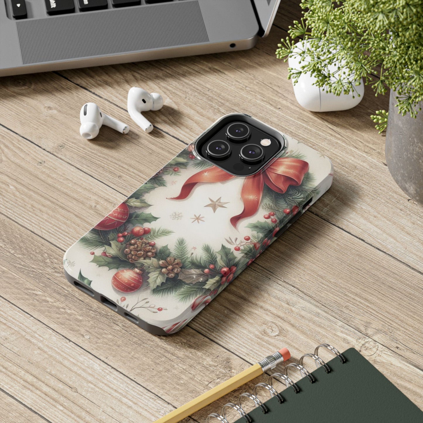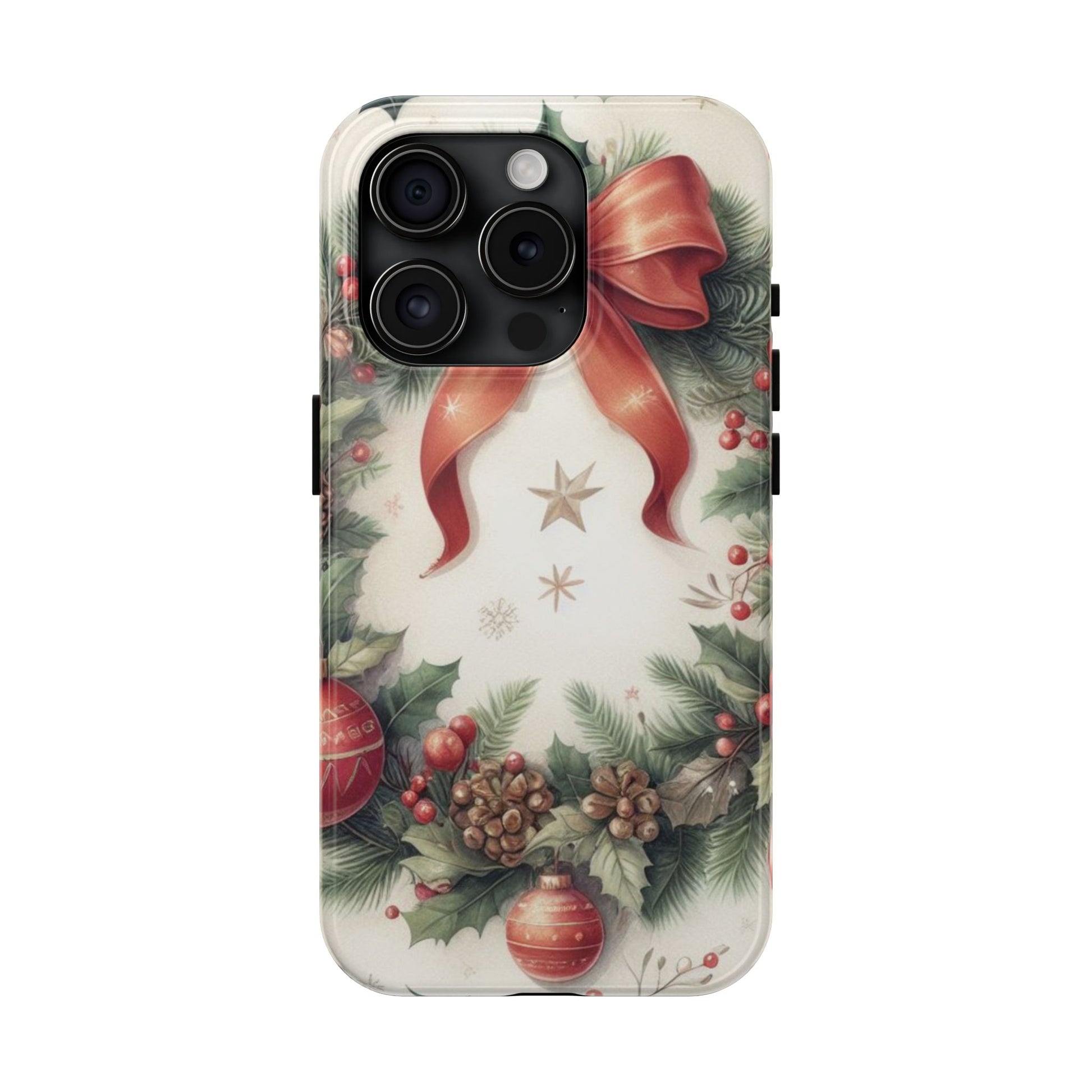 Wrap your phone in timeless holiday elegance with our Classic Christmas Wreath iPhone Case! Featuring a beautifully illustrated wreath adorned with red ribbons, pine cones, ornaments, holly berries, and evergreen branches, this case brings festive charm and a touch of vintage style. Perfect fo...