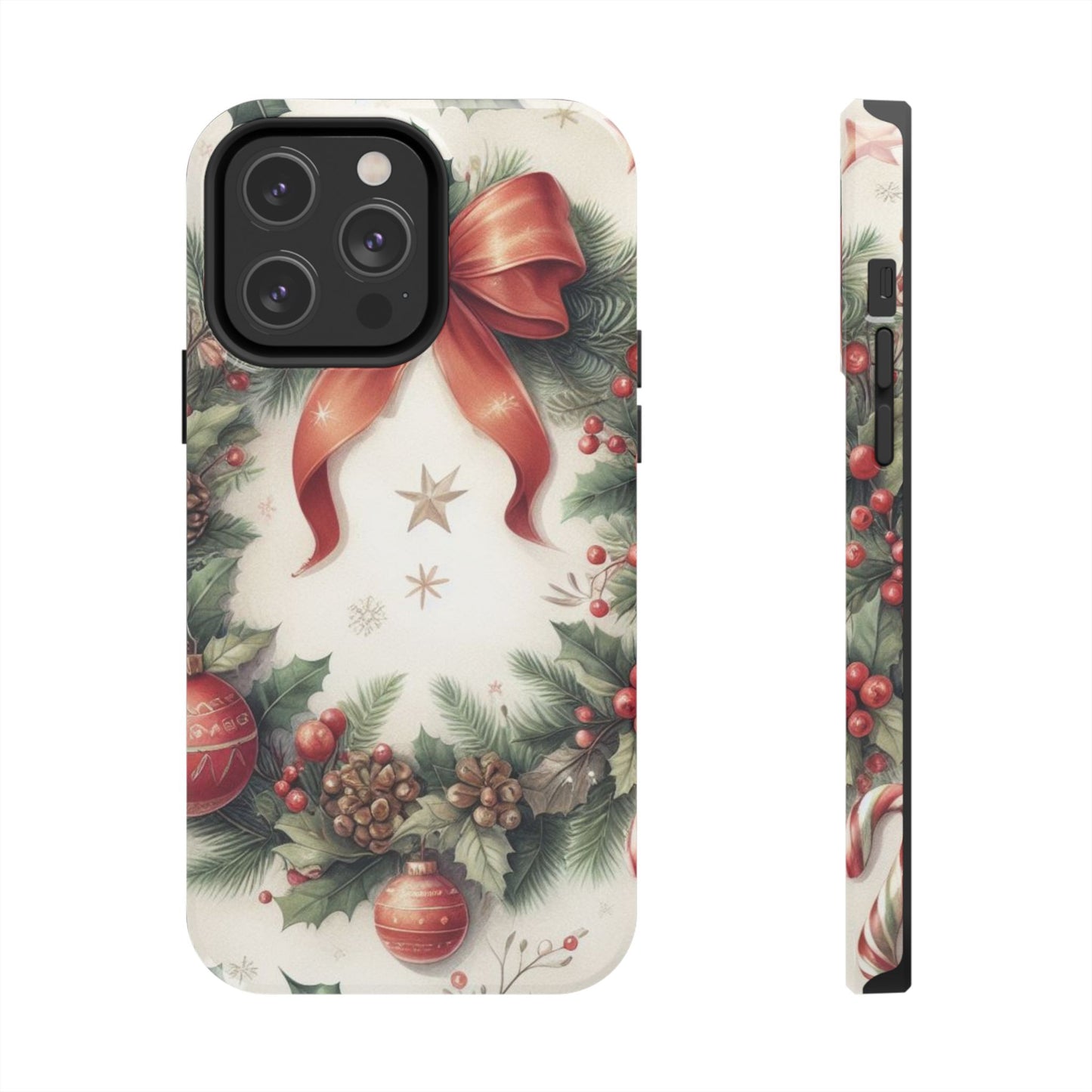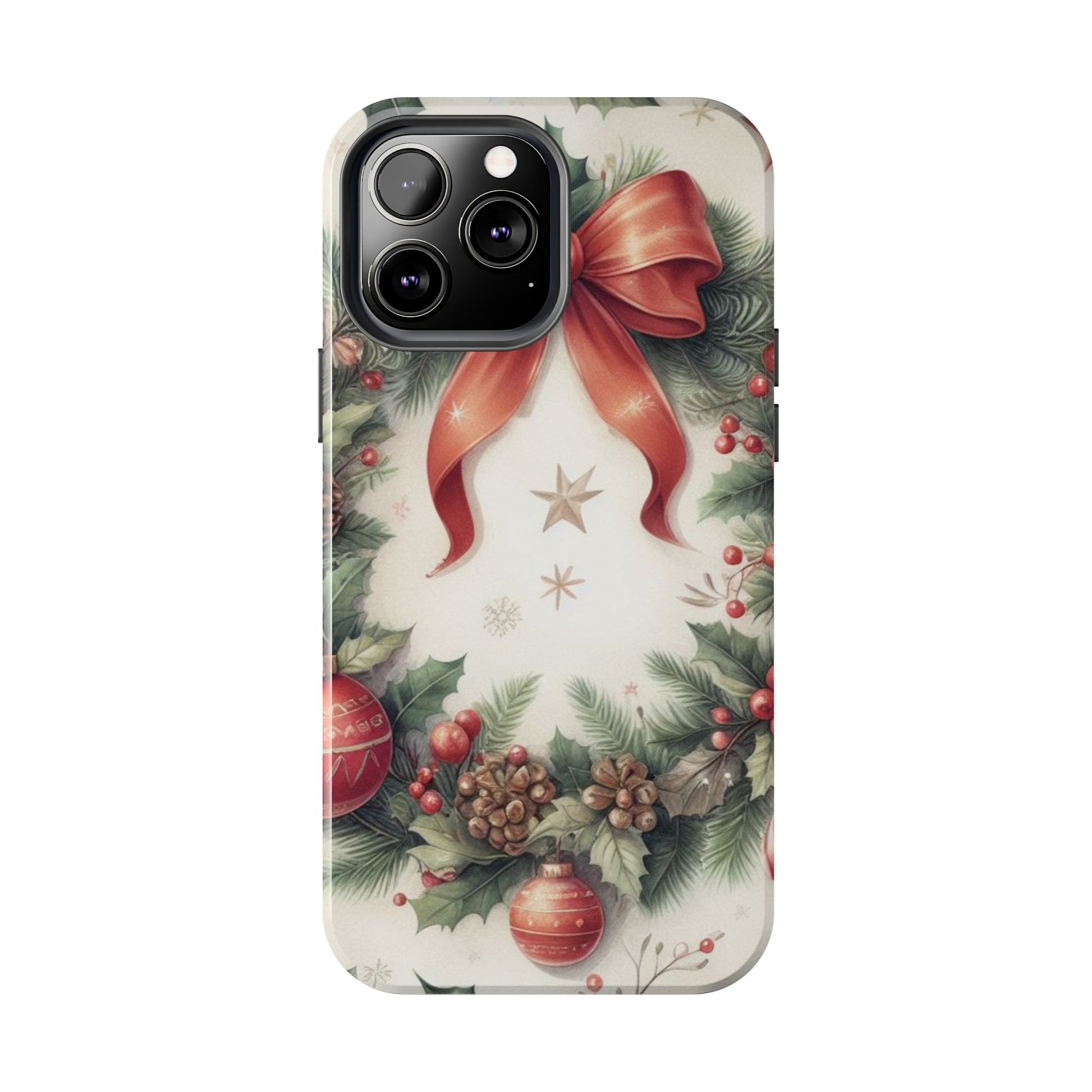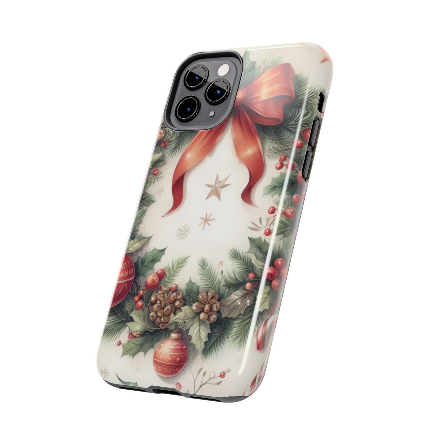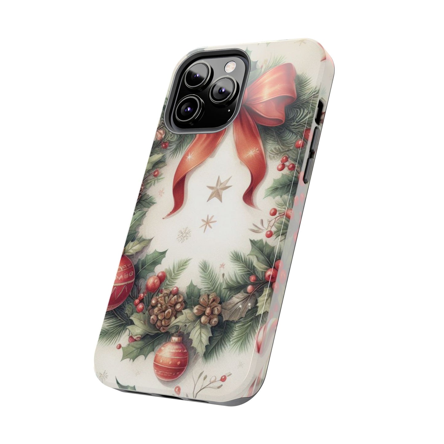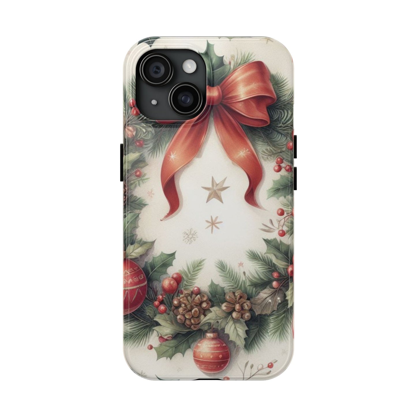 Wrap your phone in timeless holiday elegance with our Classic Christmas Wreath iPhone Case! Featuring a beautifully illustrated wreath adorned with red ribbons, pine cones, ornaments, holly berries, and evergreen branches, this case brings festive charm and a touch of vintage style. Perfect fo...