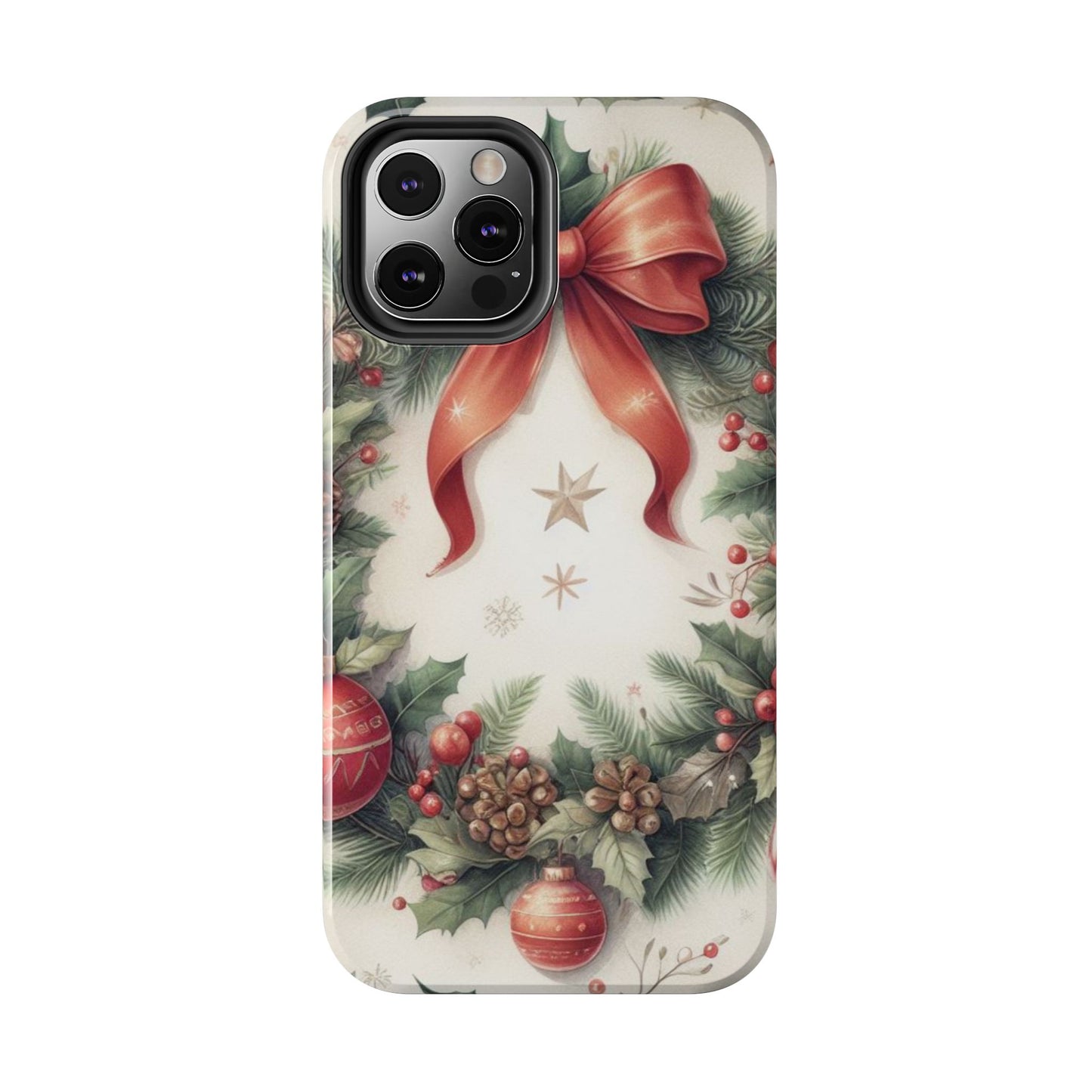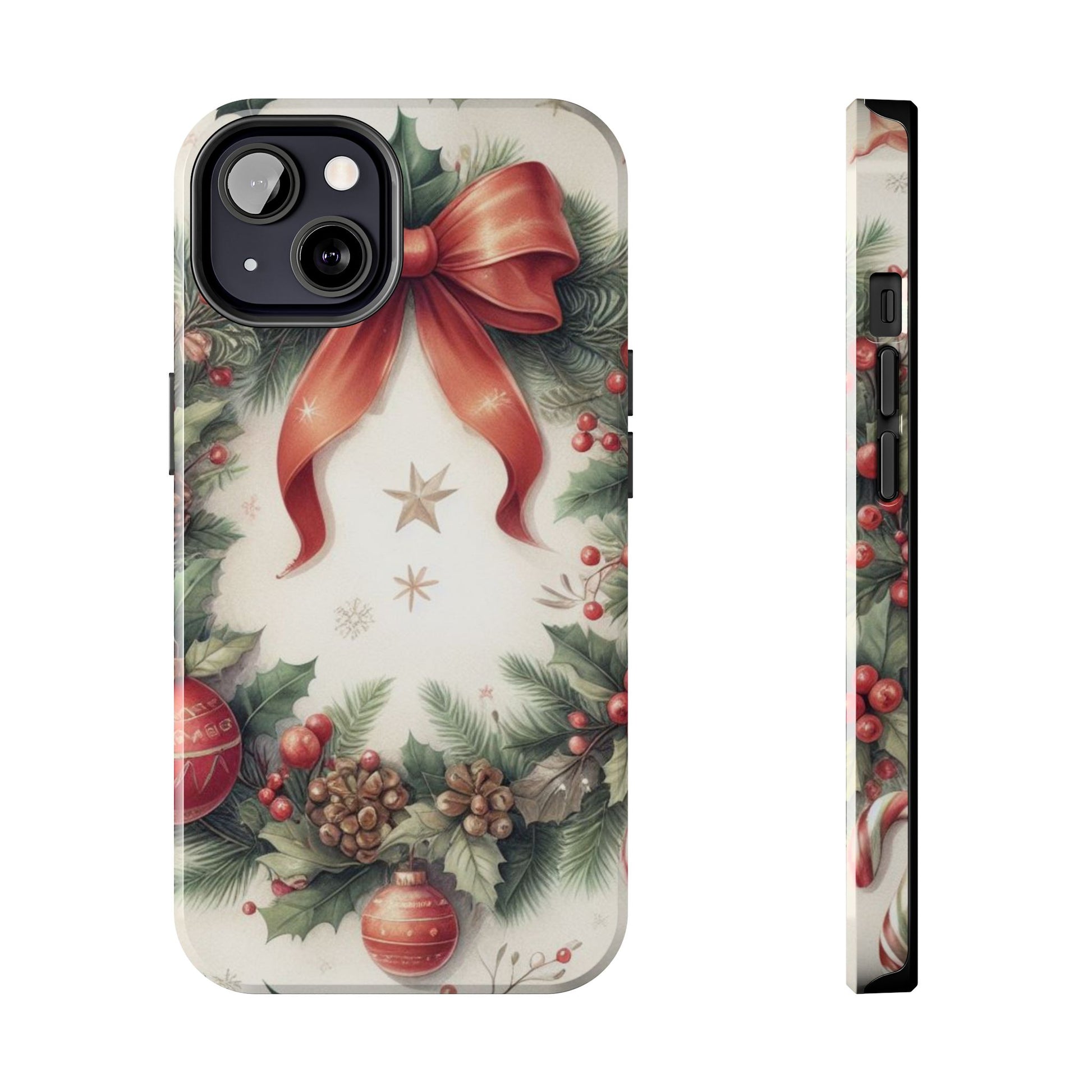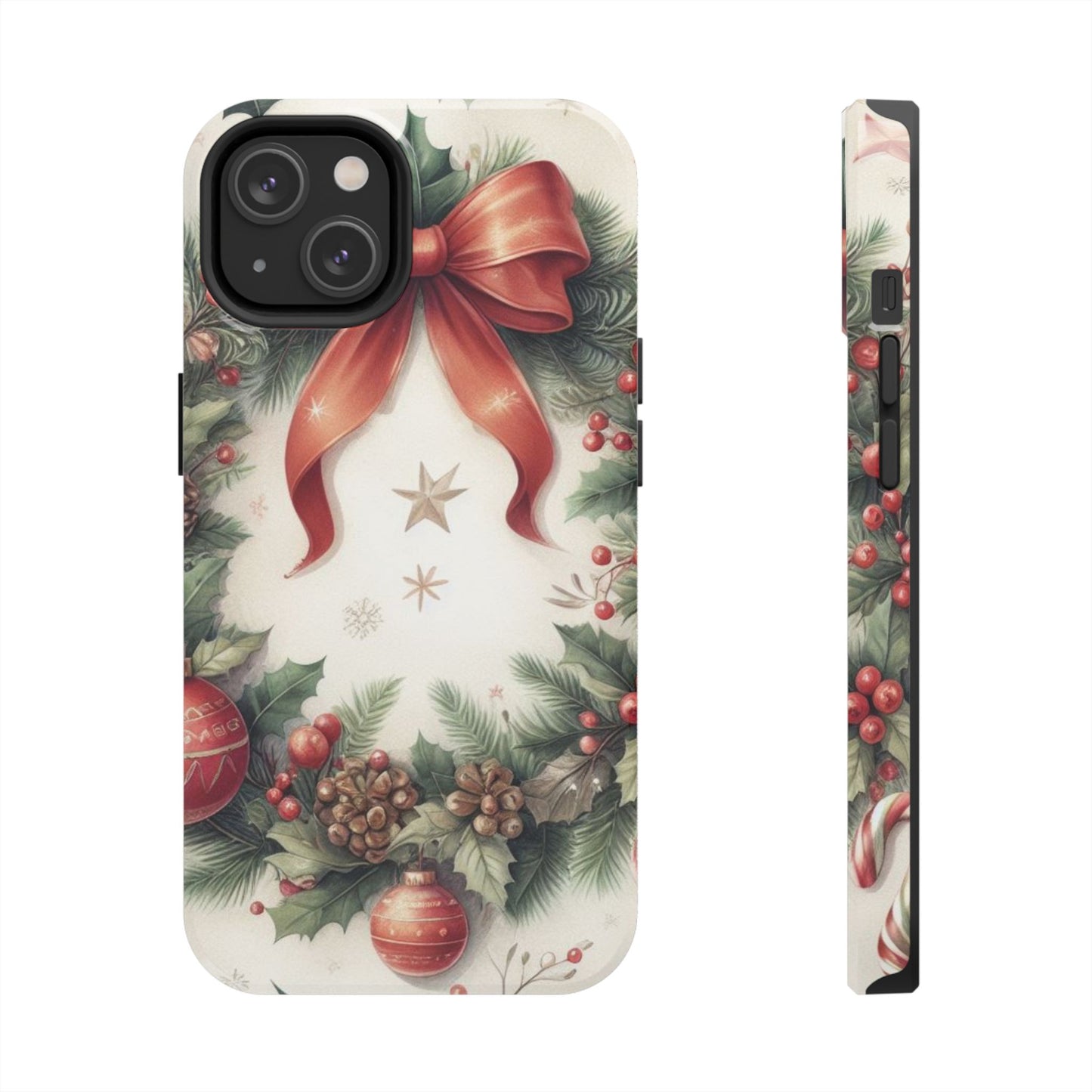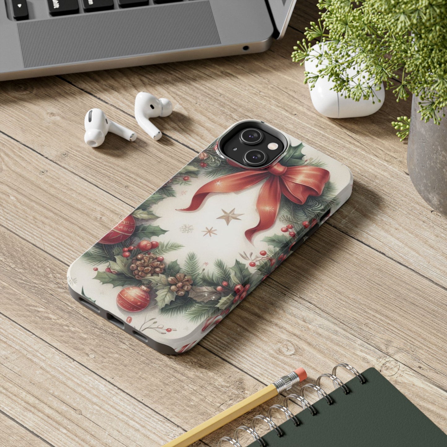 Wrap your phone in timeless holiday elegance with our Classic Christmas Wreath iPhone Case! Featuring a beautifully illustrated wreath adorned with red ribbons, pine cones, ornaments, holly berries, and evergreen branches, this case brings festive charm and a touch of vintage style. Perfect fo...