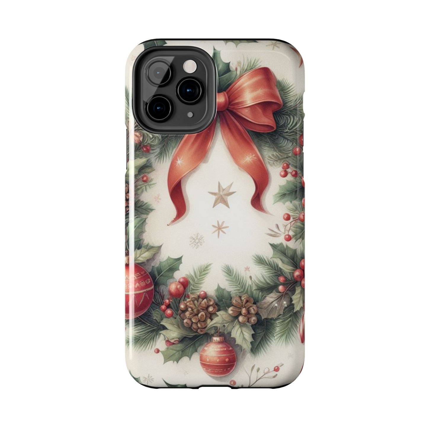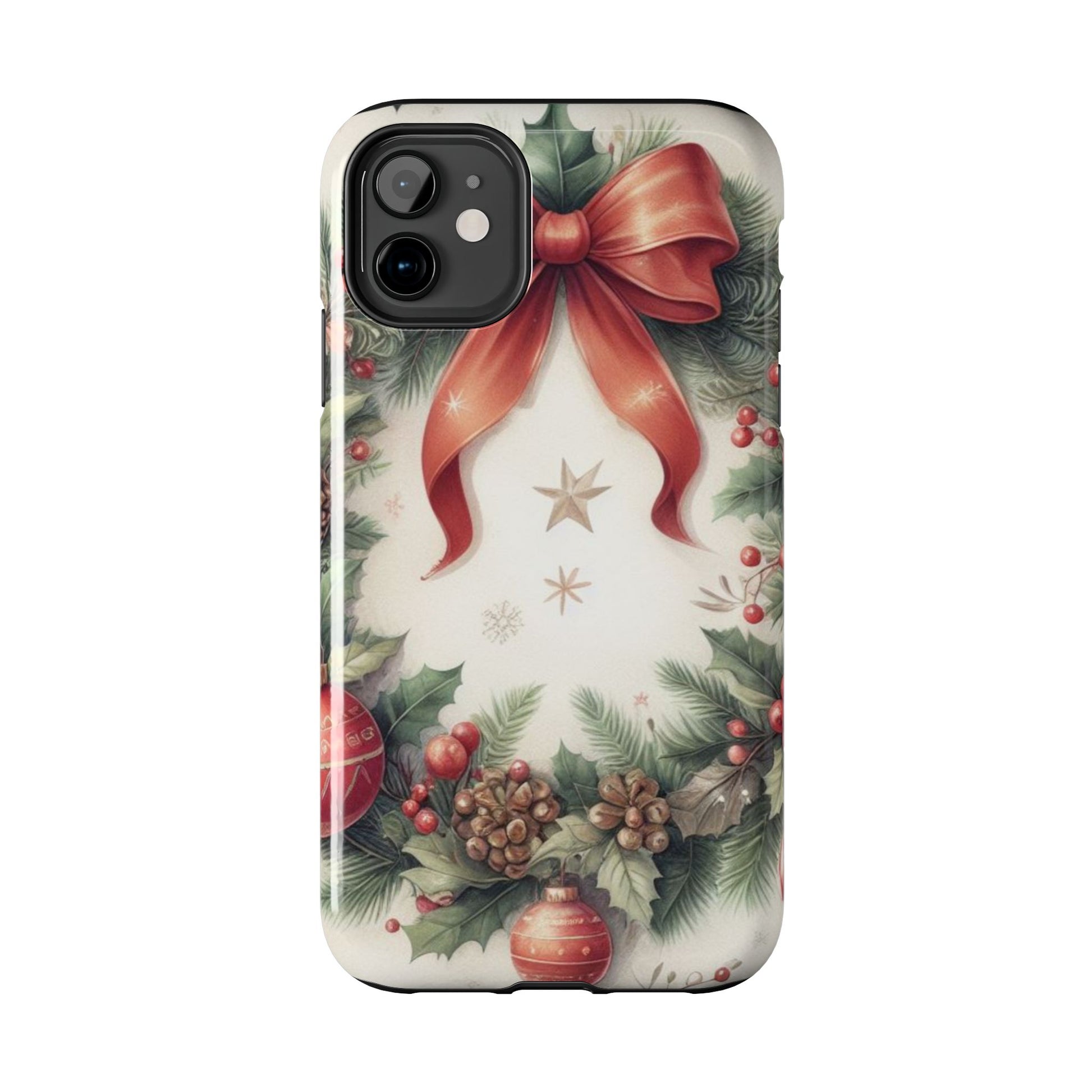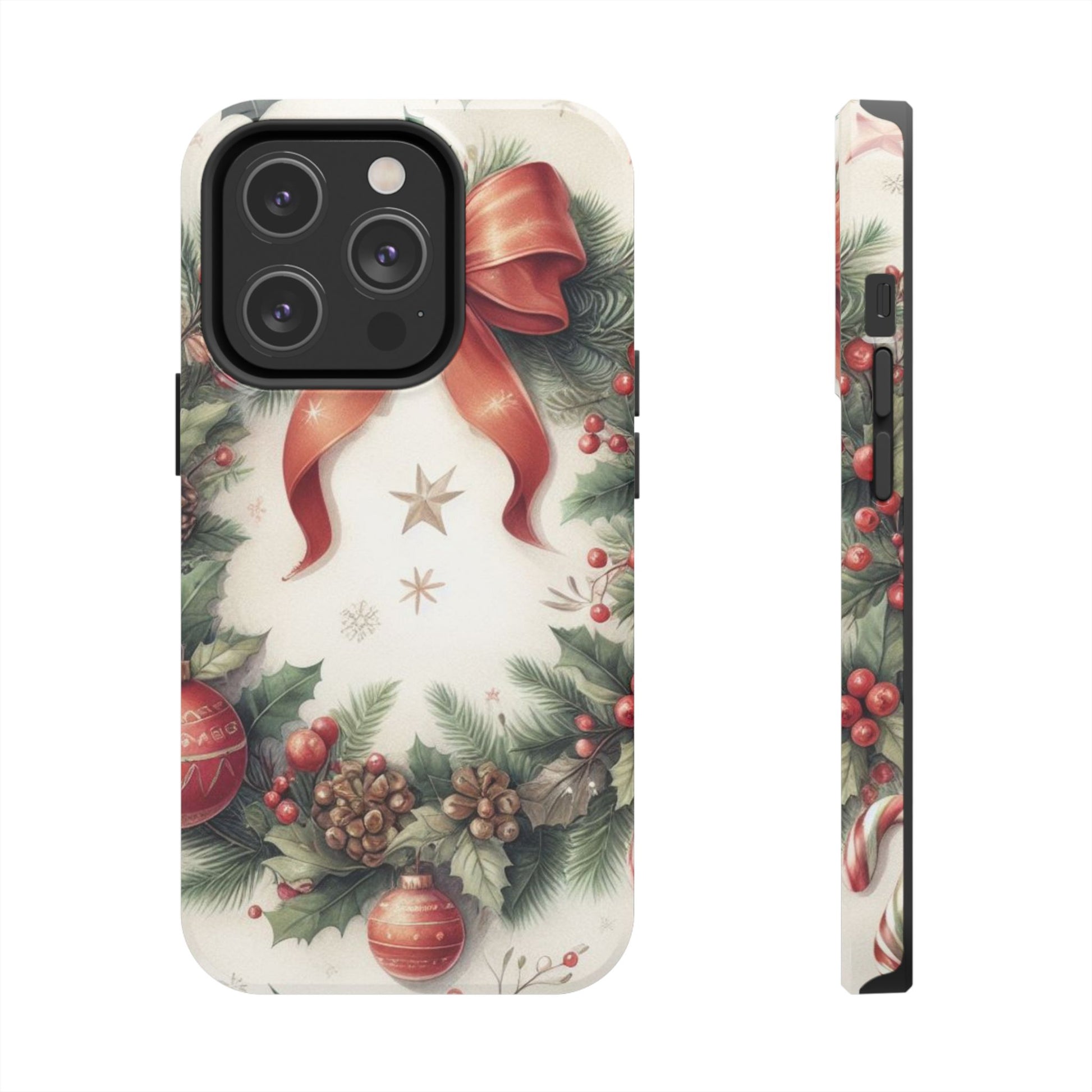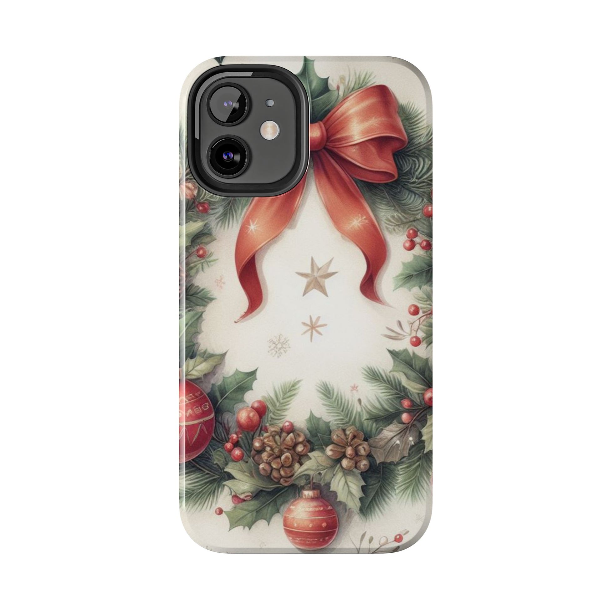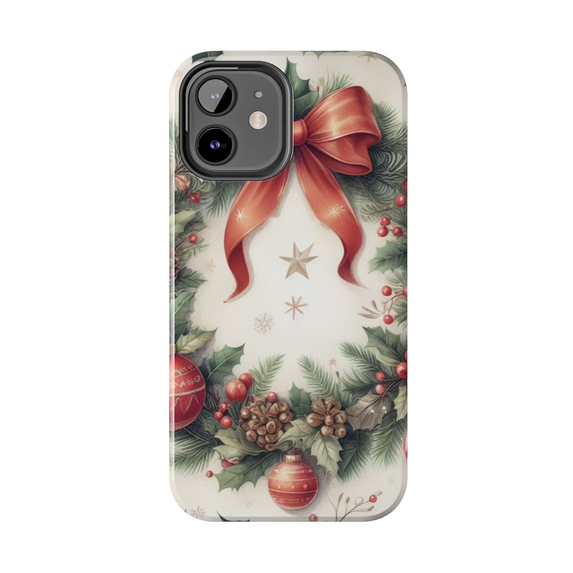 Wrap your phone in timeless holiday elegance with our Classic Christmas Wreath iPhone Case! Featuring a beautifully illustrated wreath adorned with red ribbons, pine cones, ornaments, holly berries, and evergreen branches, this case brings festive charm and a touch of vintage style. Perfect fo...
