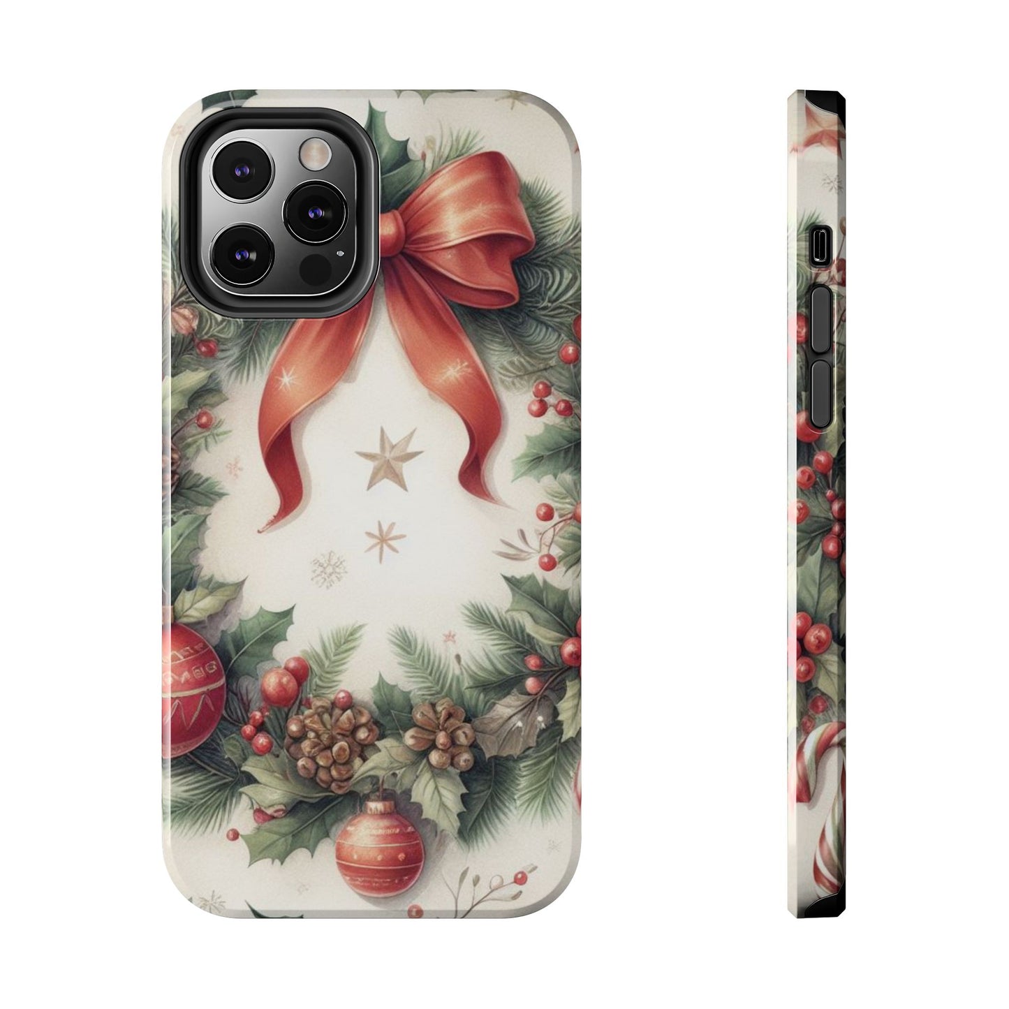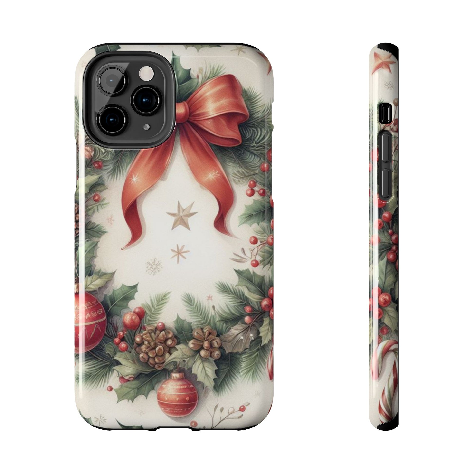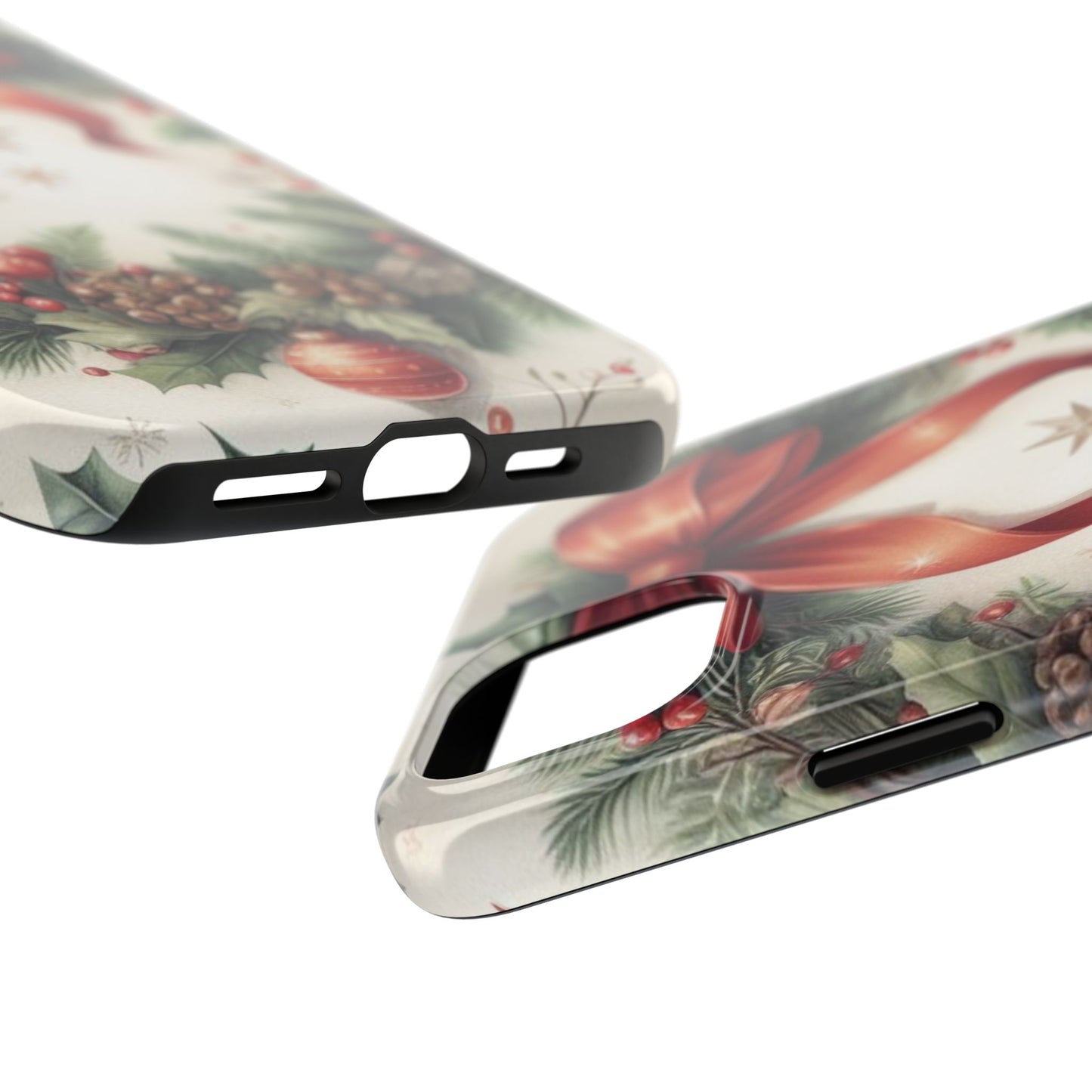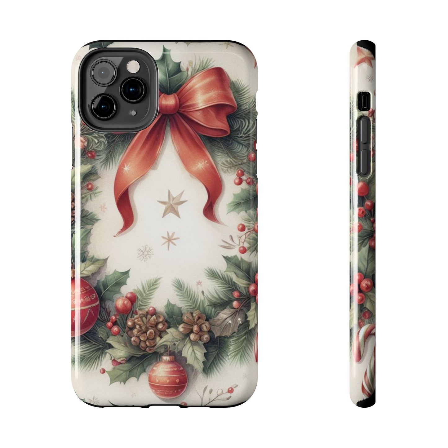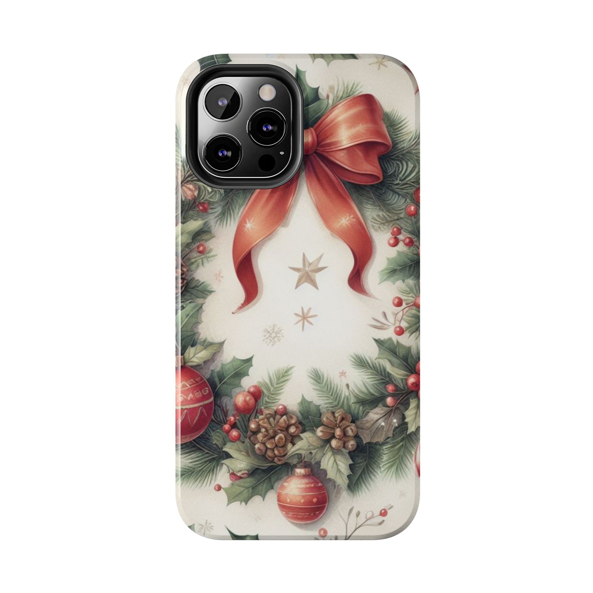Wrap your phone in timeless holiday elegance with our Classic Christmas Wreath iPhone Case! Featuring a beautifully illustrated wreath adorned with red ribbons, pine cones, ornaments, holly berries, and evergreen branches, this case brings festive charm and a touch of vintage style. Perfect fo...