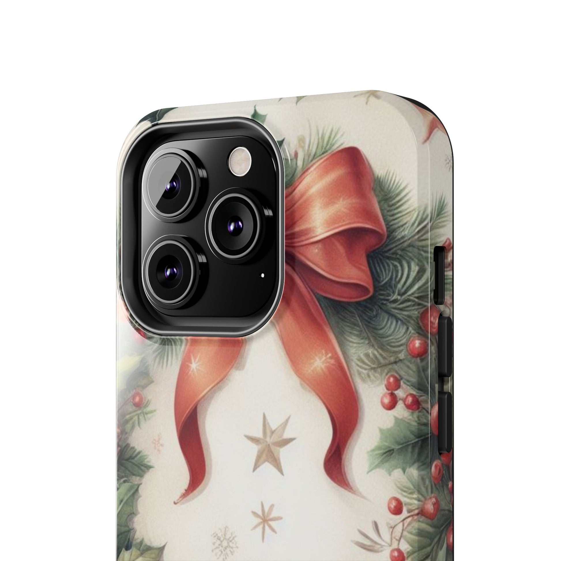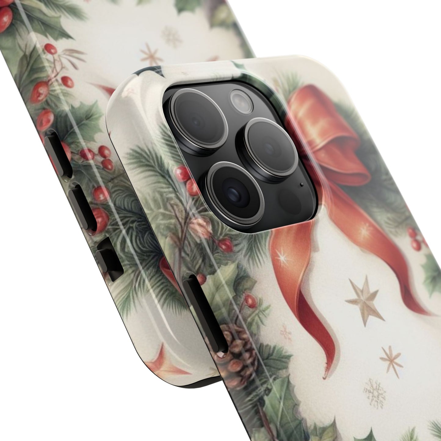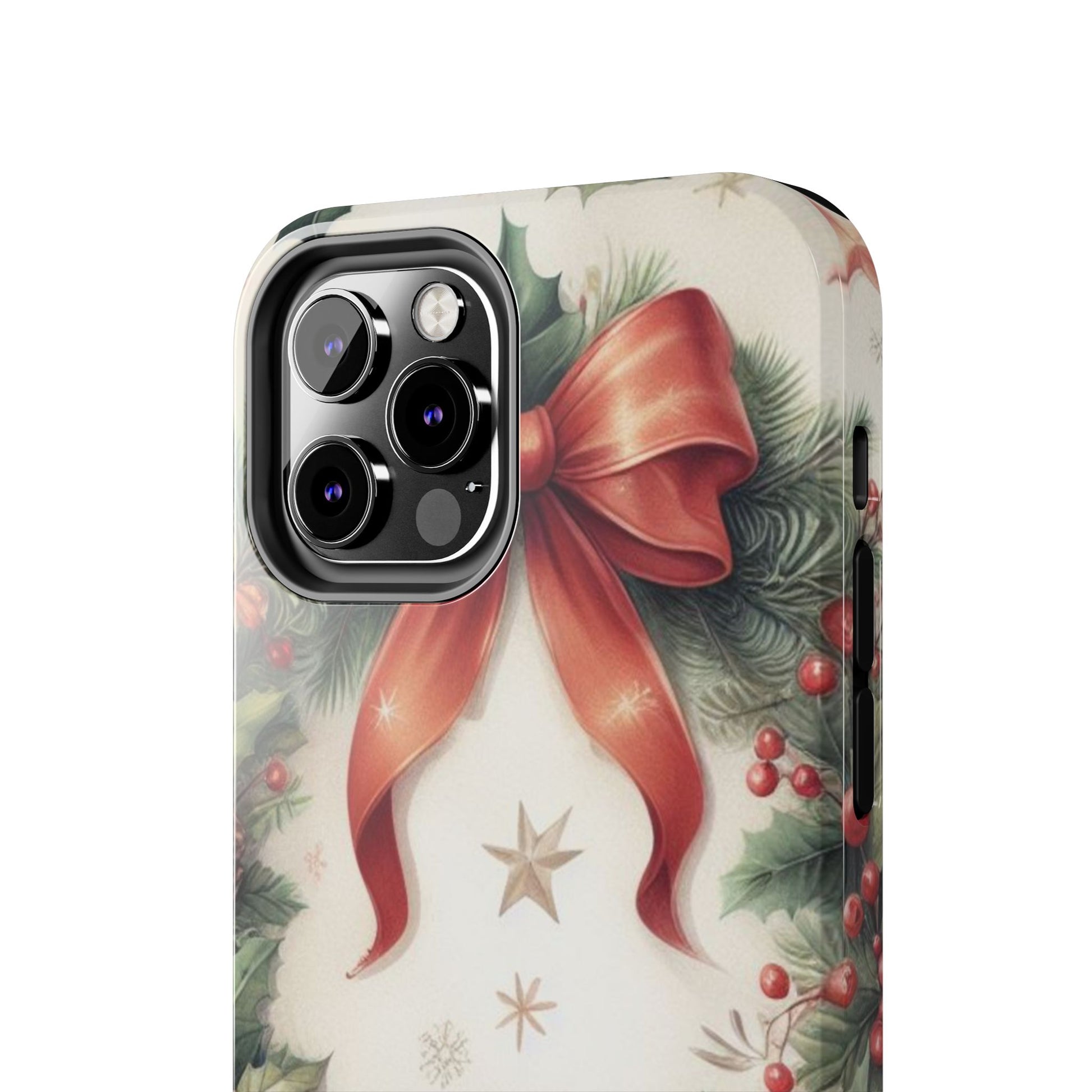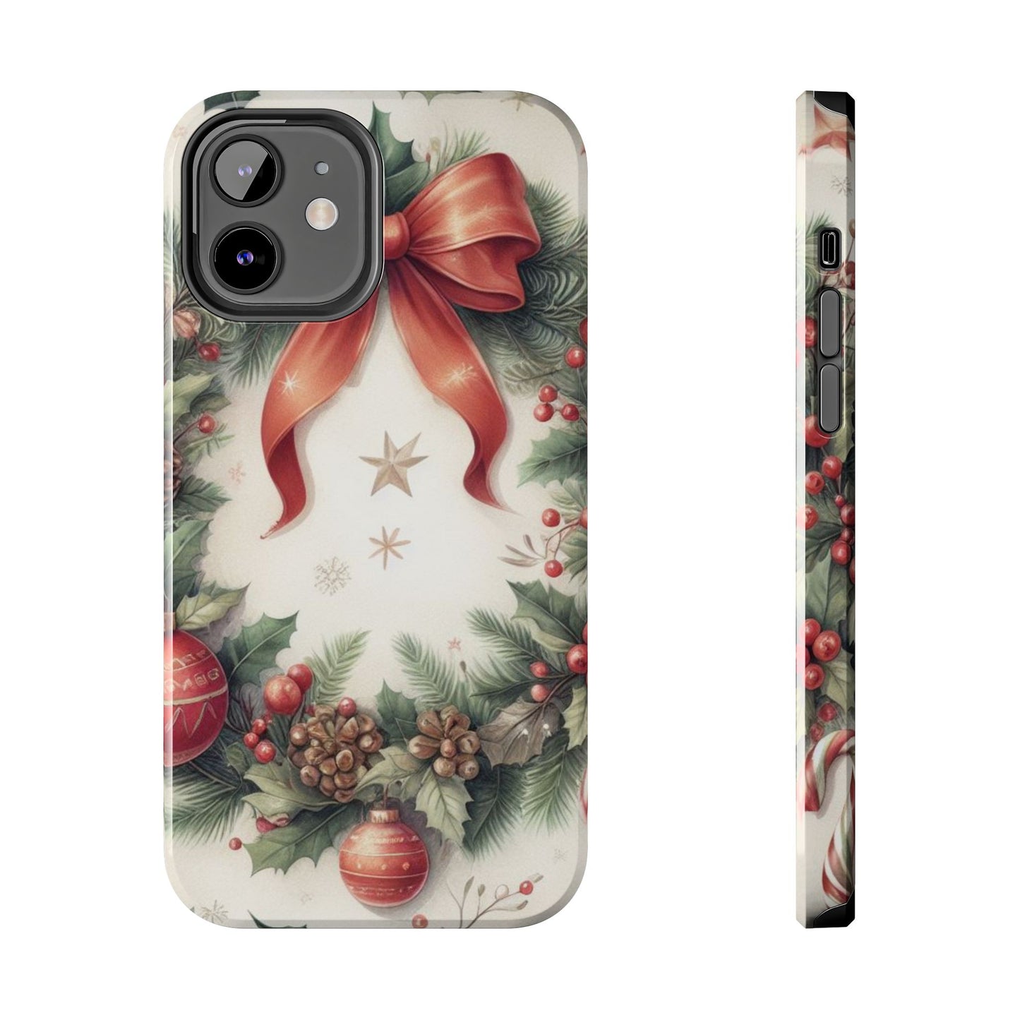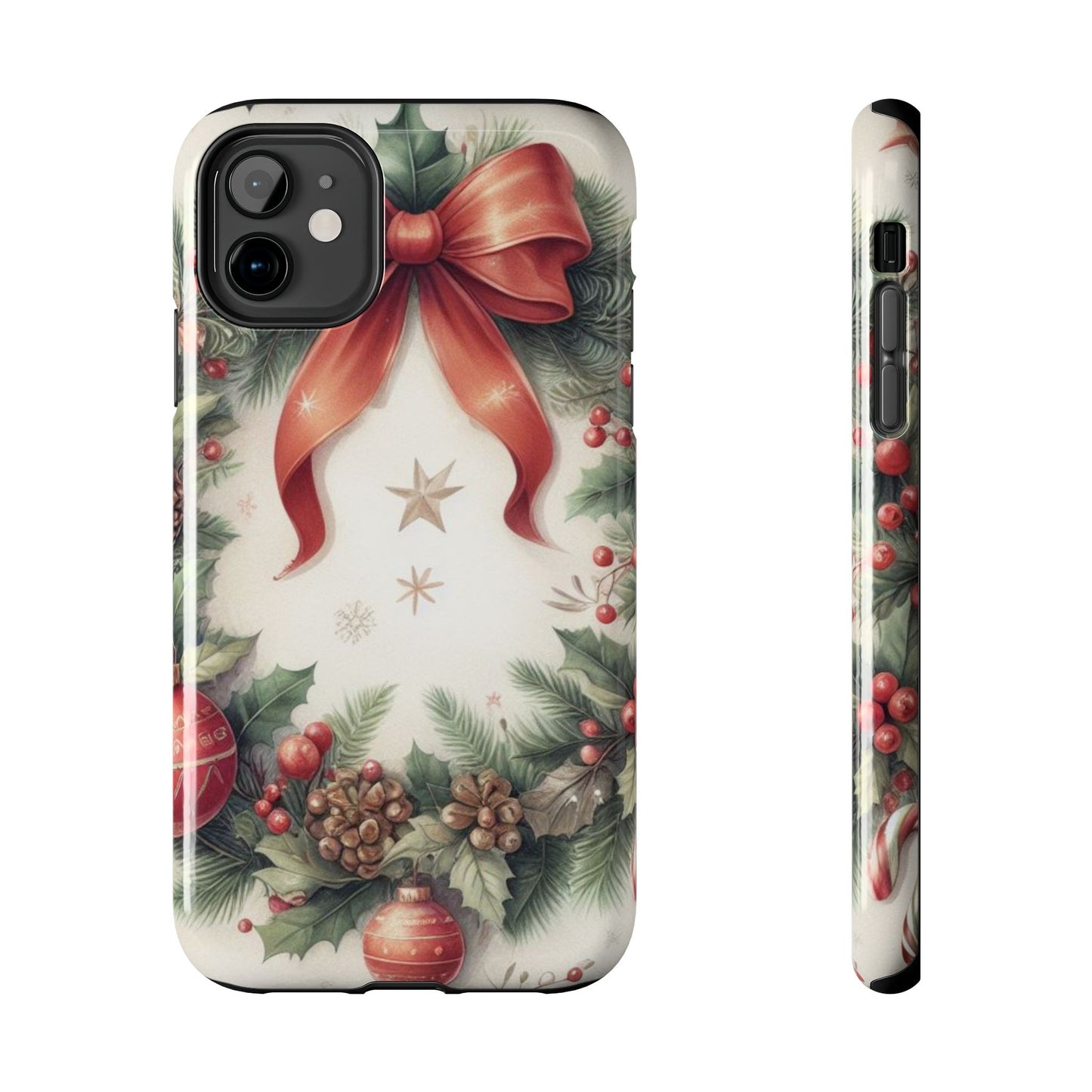 Wrap your phone in timeless holiday elegance with our Classic Christmas Wreath iPhone Case! Featuring a beautifully illustrated wreath adorned with red ribbons, pine cones, ornaments, holly berries, and evergreen branches, this case brings festive charm and a touch of vintage style. Perfect fo...