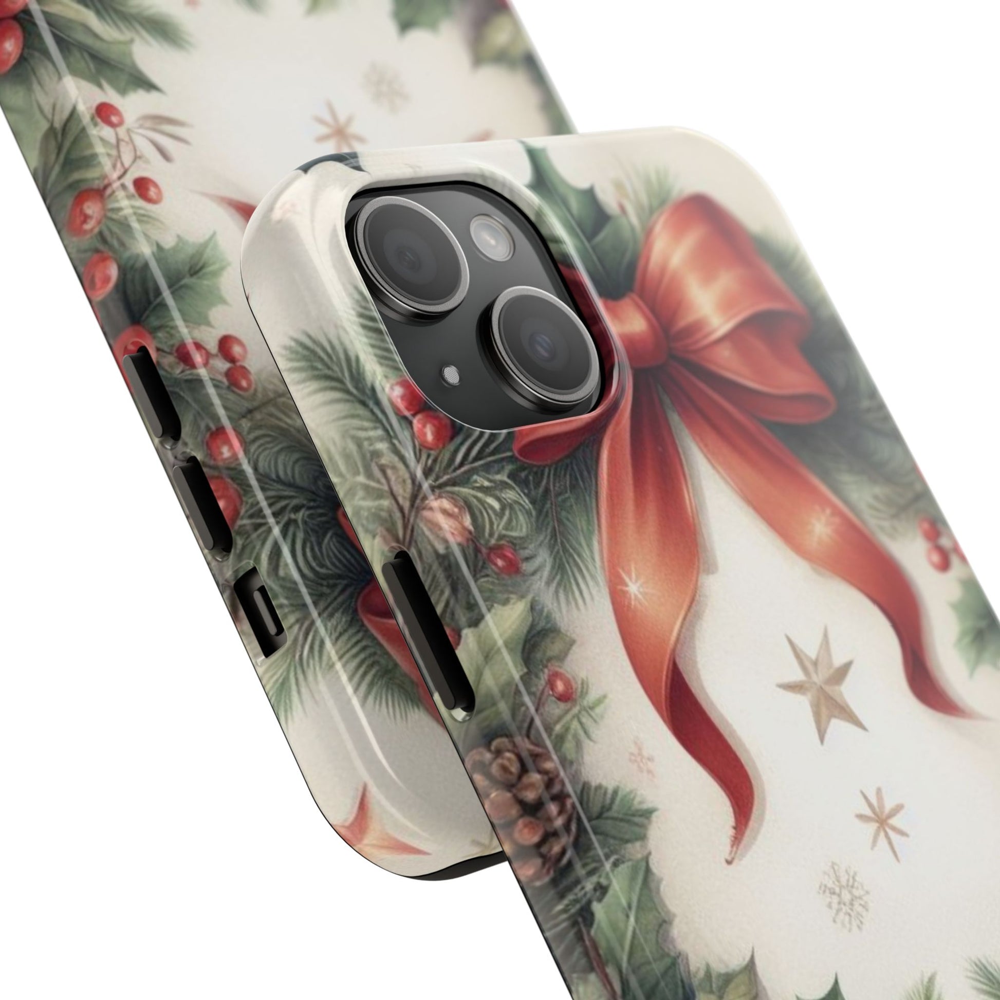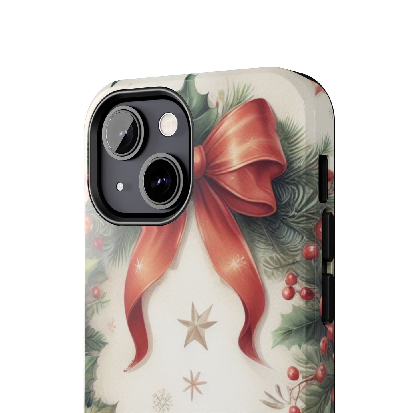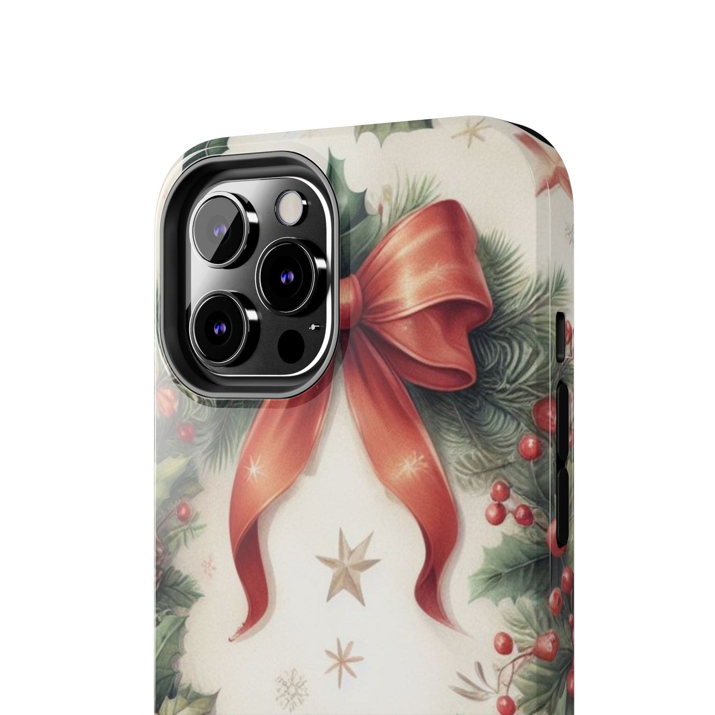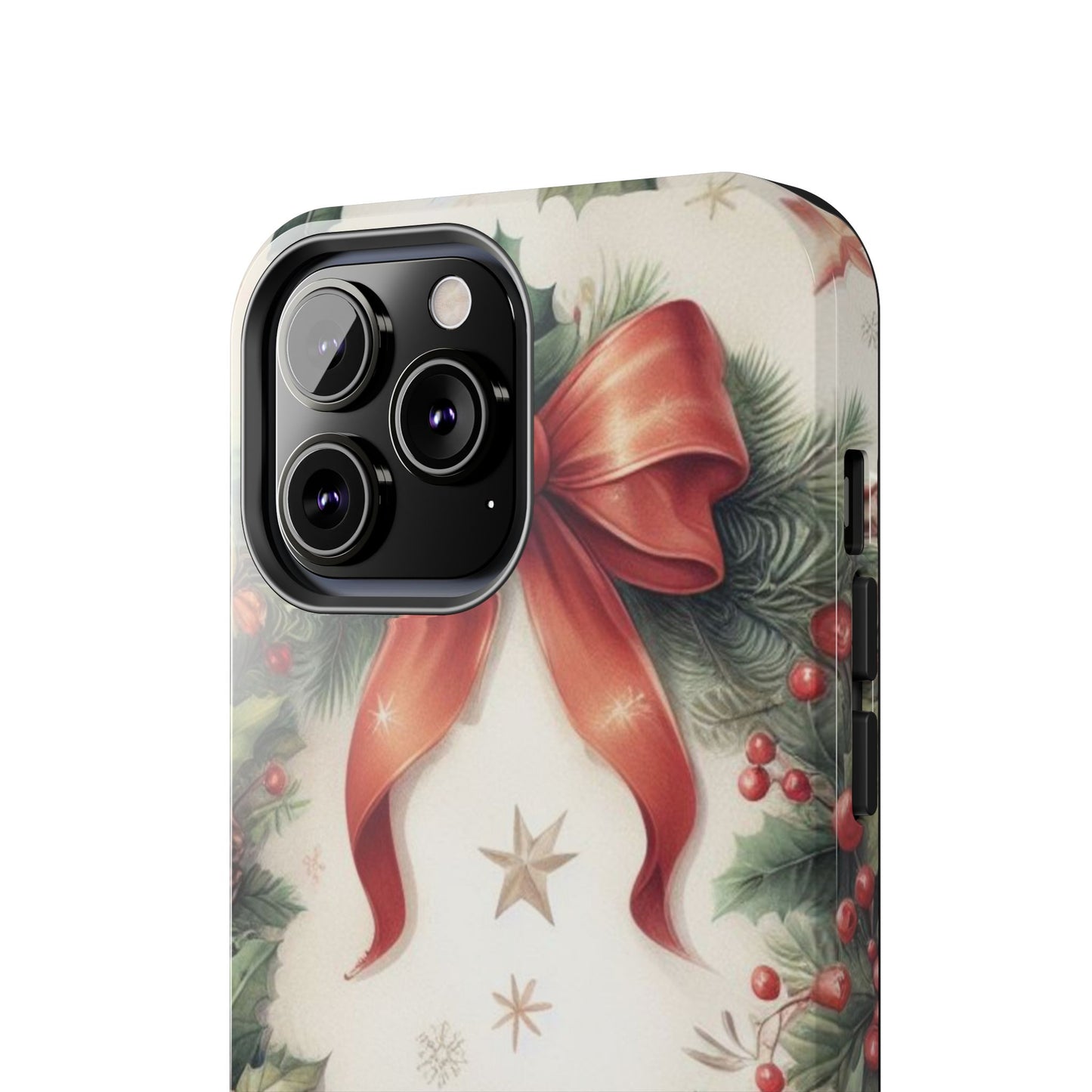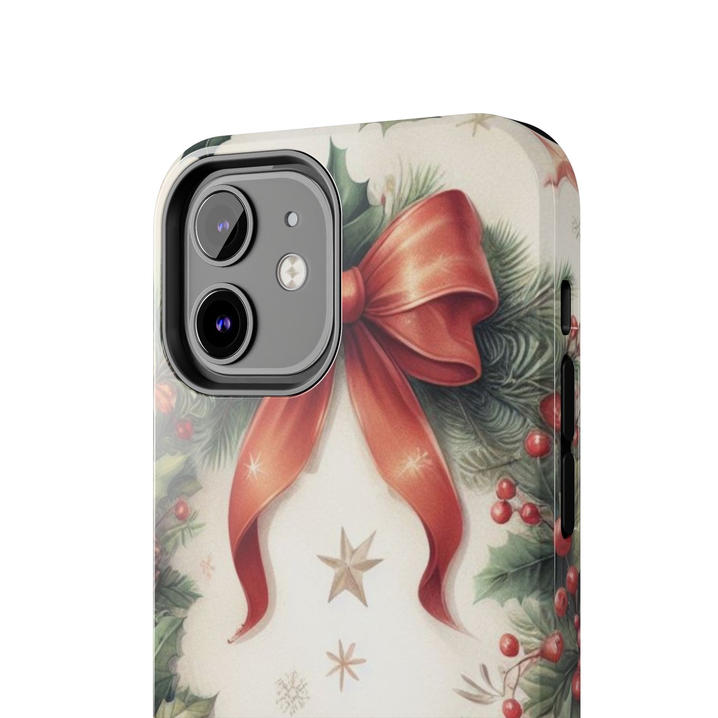 Wrap your phone in timeless holiday elegance with our Classic Christmas Wreath iPhone Case! Featuring a beautifully illustrated wreath adorned with red ribbons, pine cones, ornaments, holly berries, and evergreen branches, this case brings festive charm and a touch of vintage style. Perfect fo...