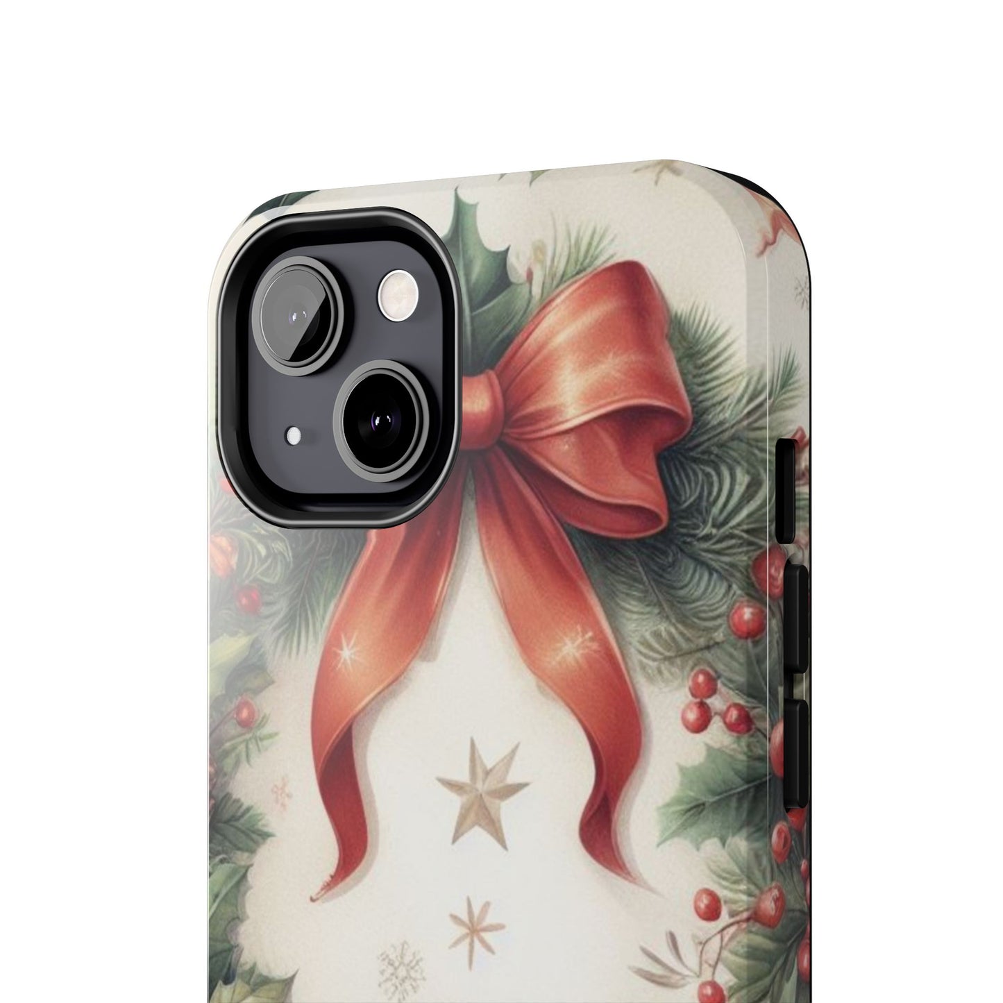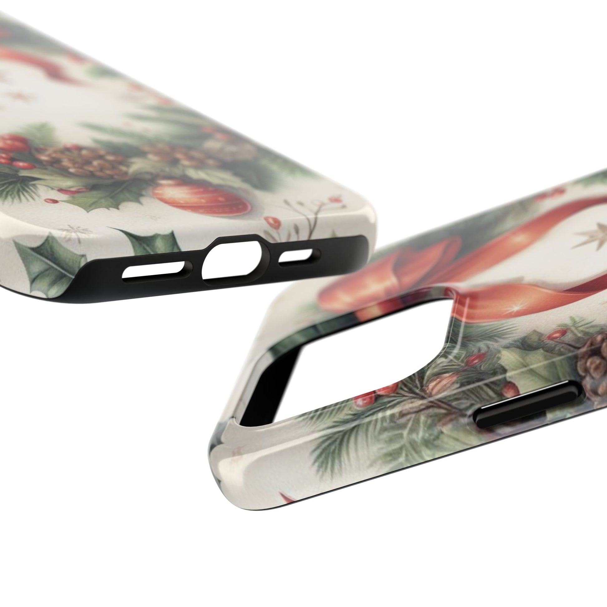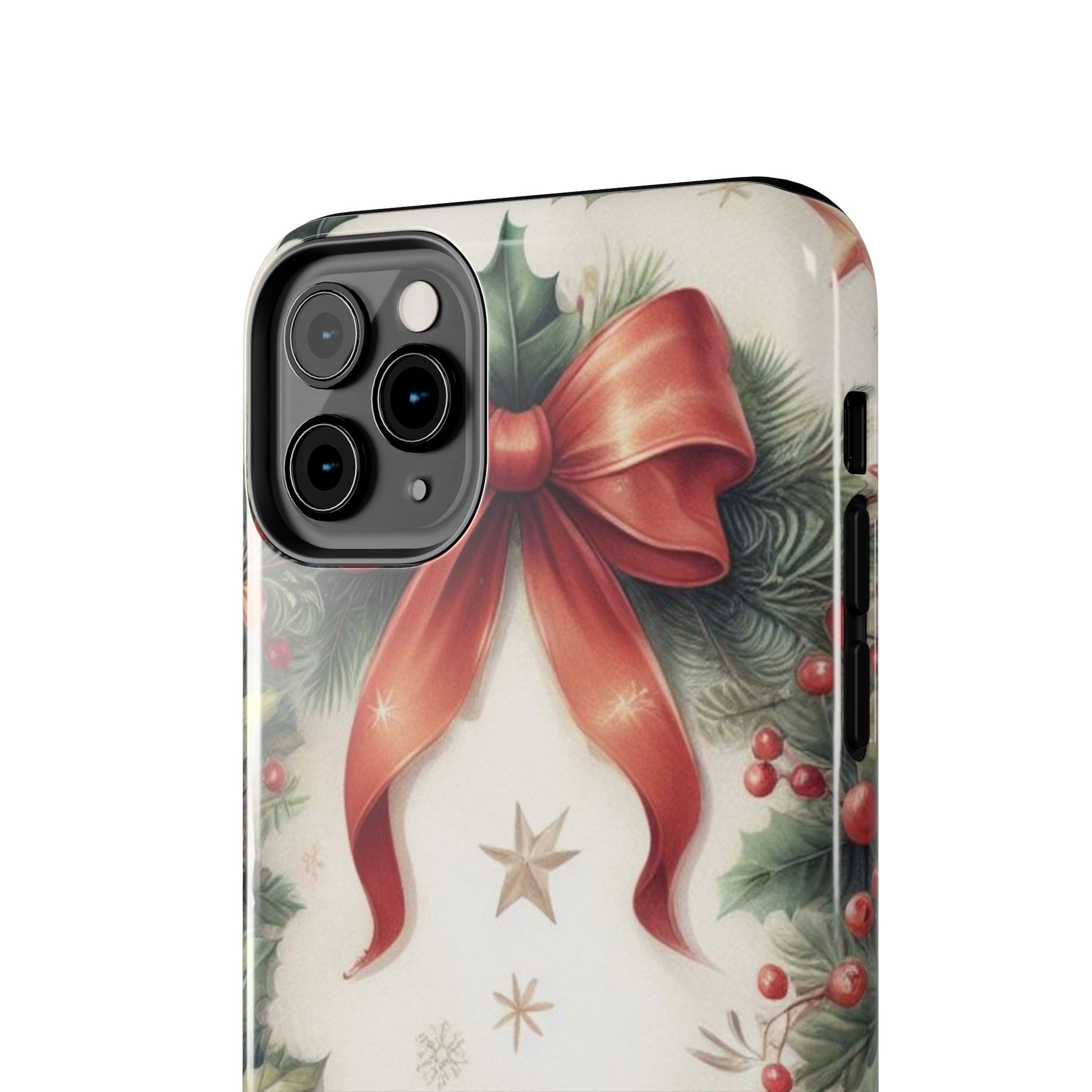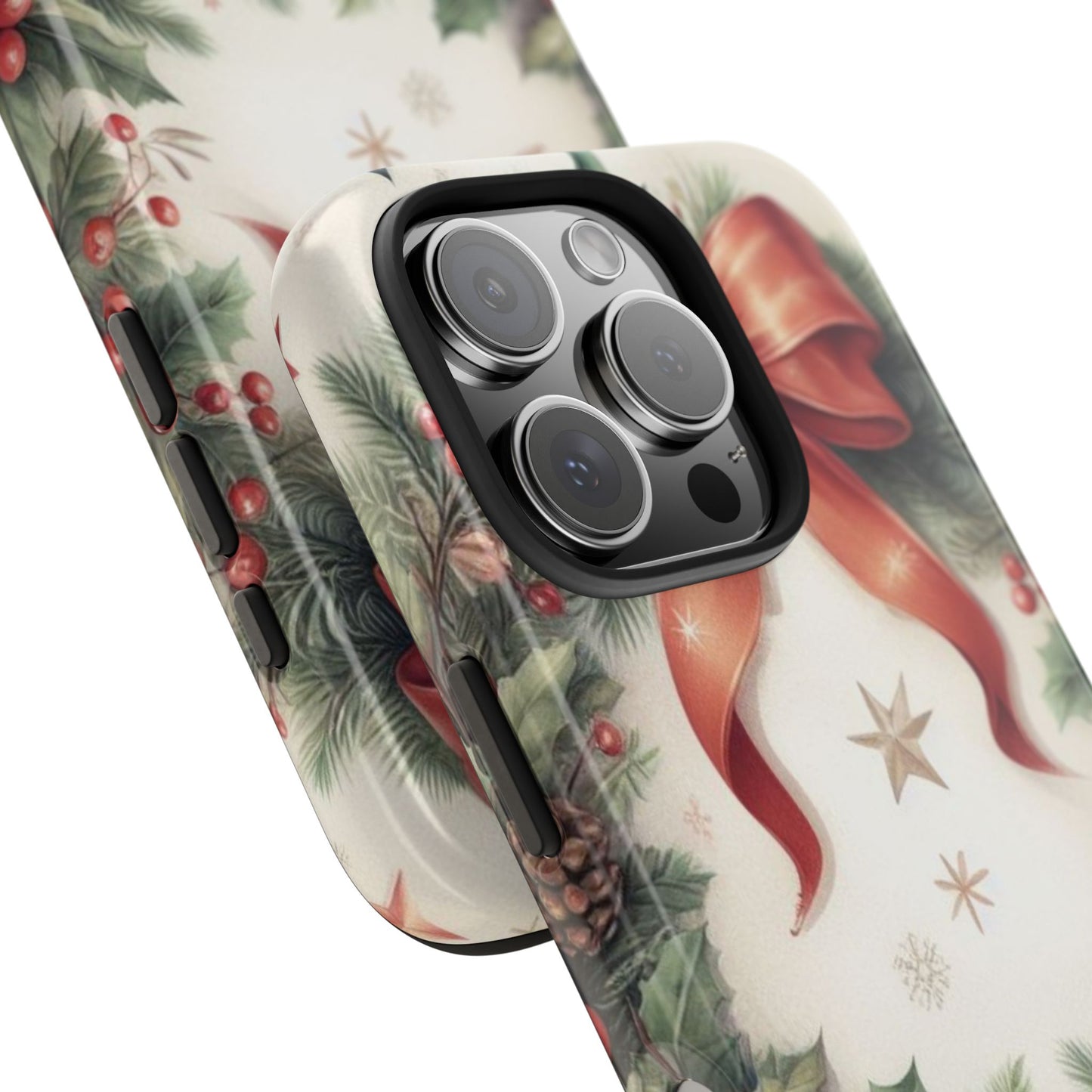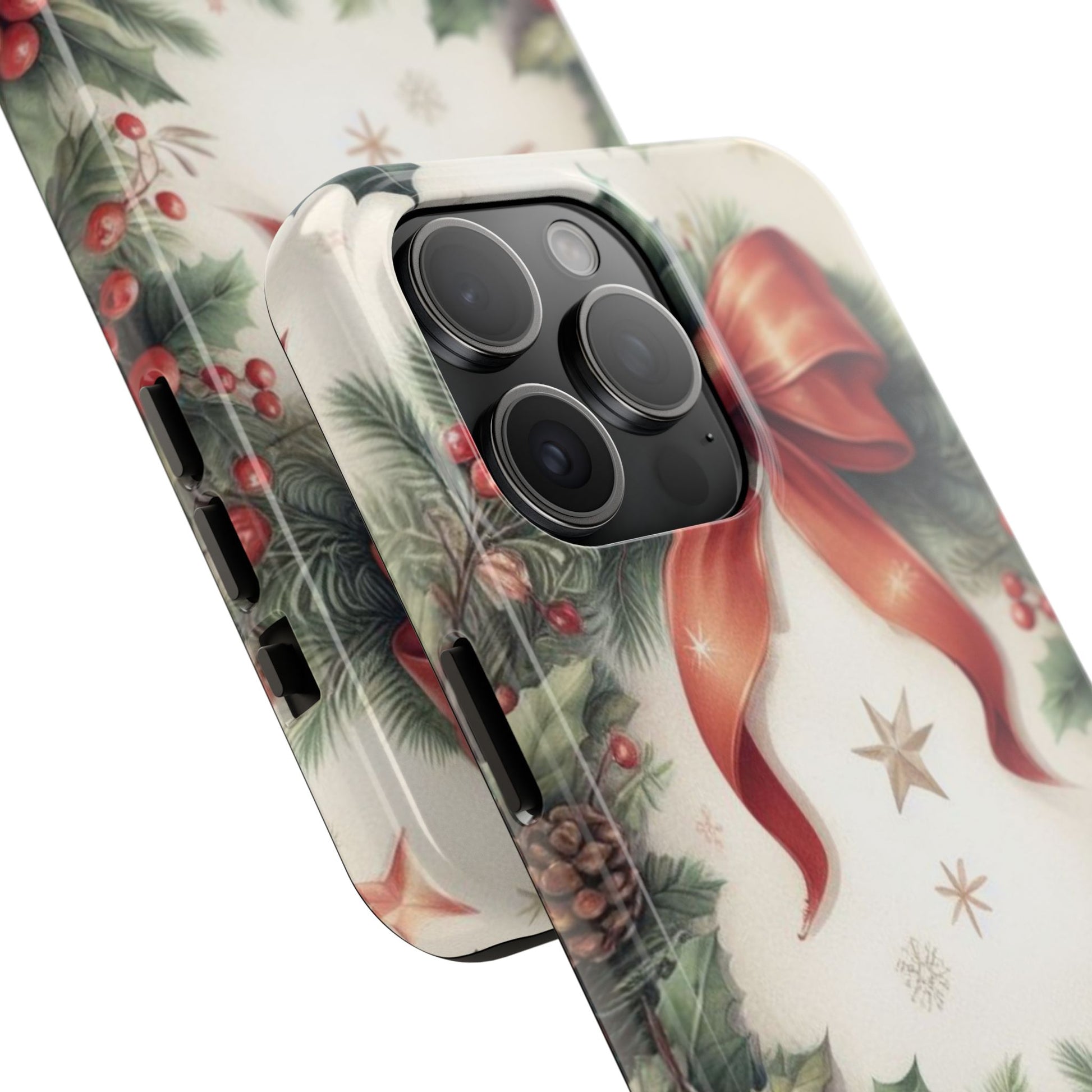 Wrap your phone in timeless holiday elegance with our Classic Christmas Wreath iPhone Case! Featuring a beautifully illustrated wreath adorned with red ribbons, pine cones, ornaments, holly berries, and evergreen branches, this case brings festive charm and a touch of vintage style. Perfect fo...