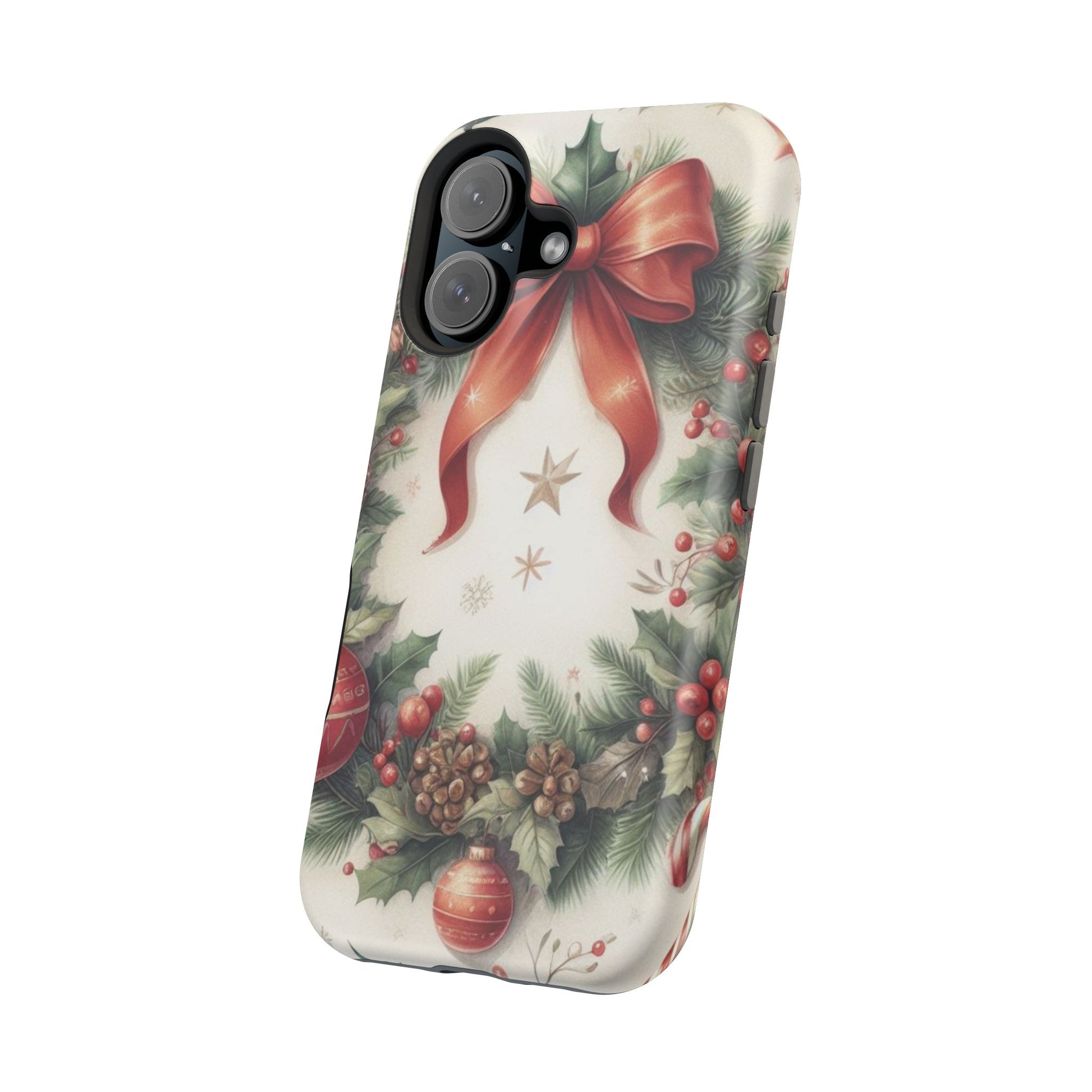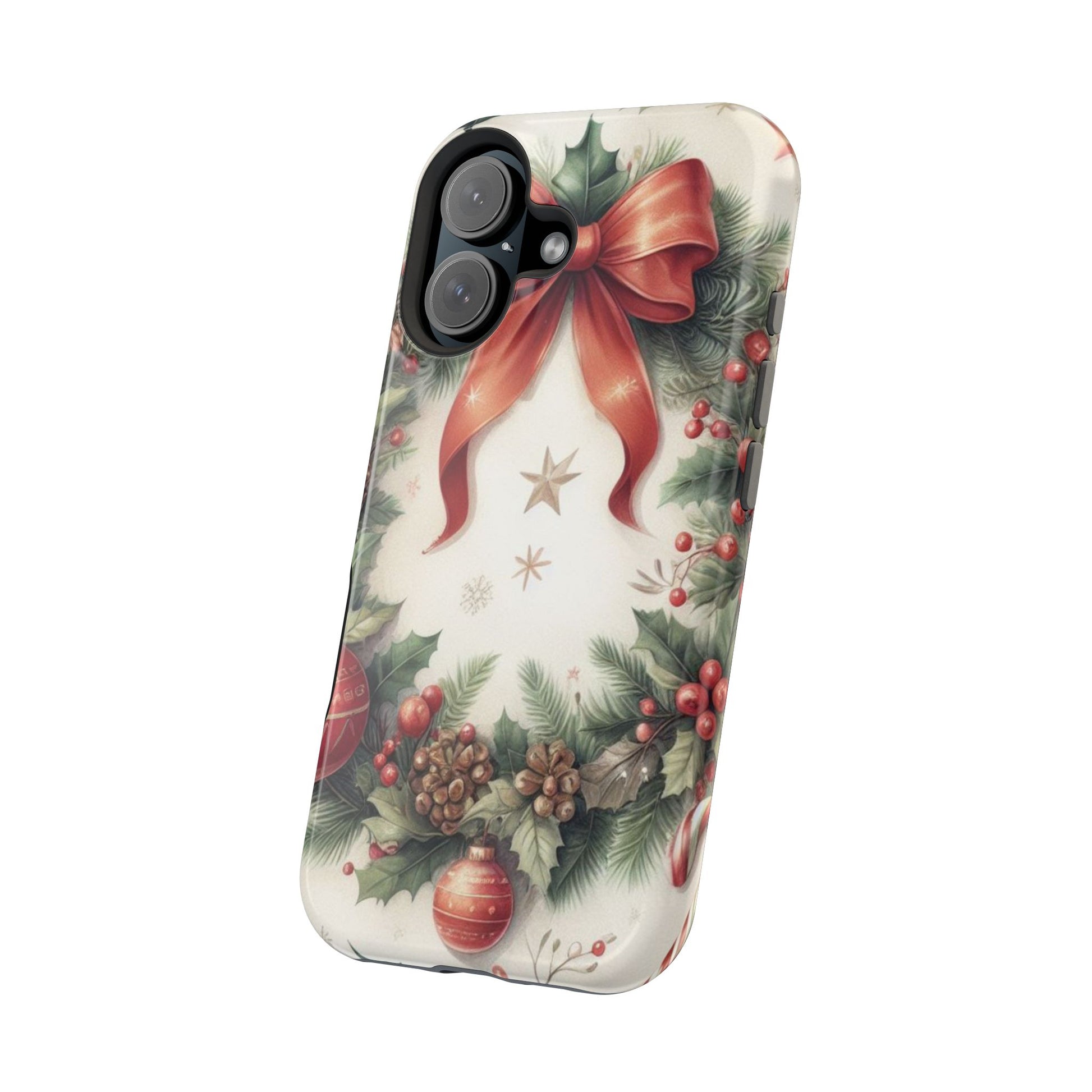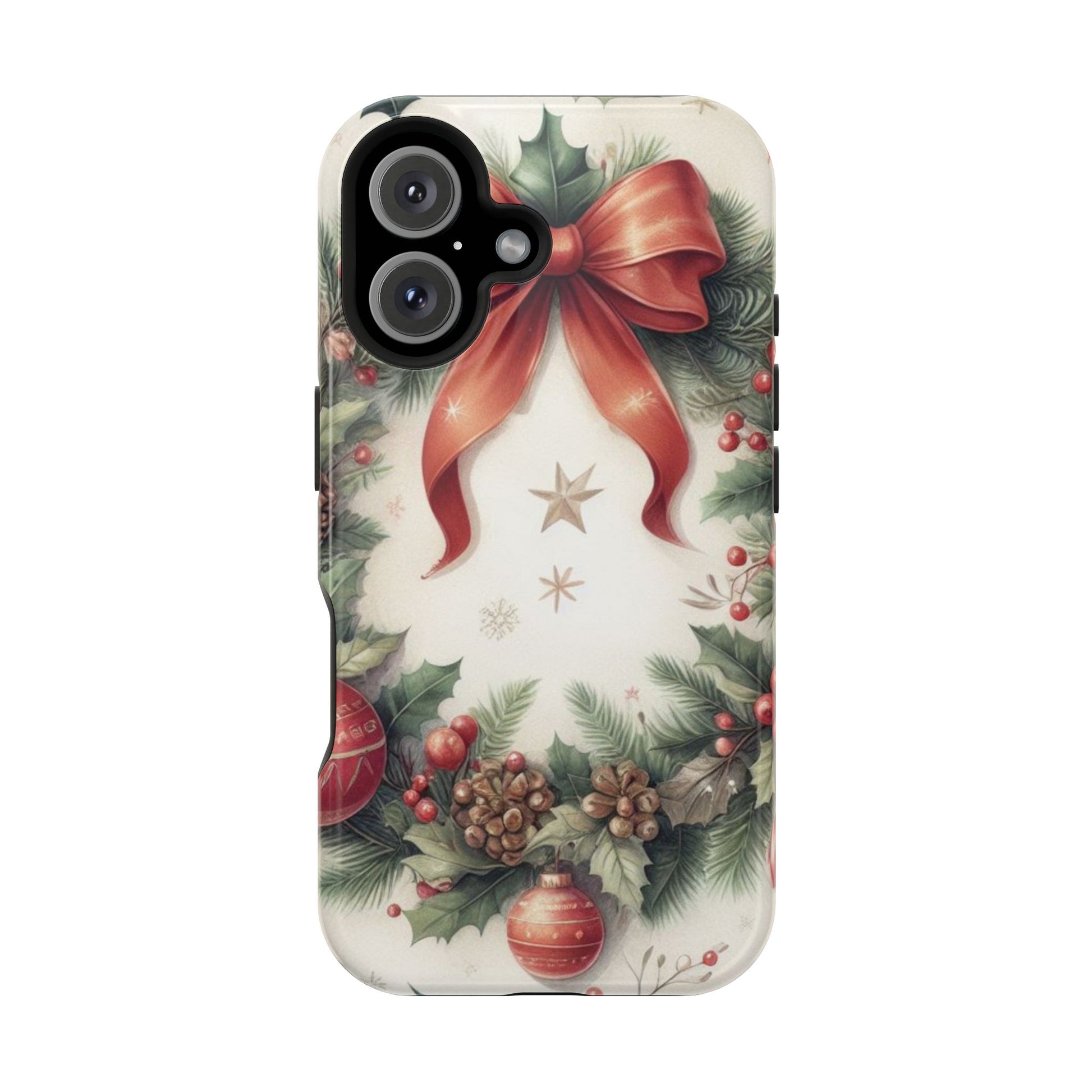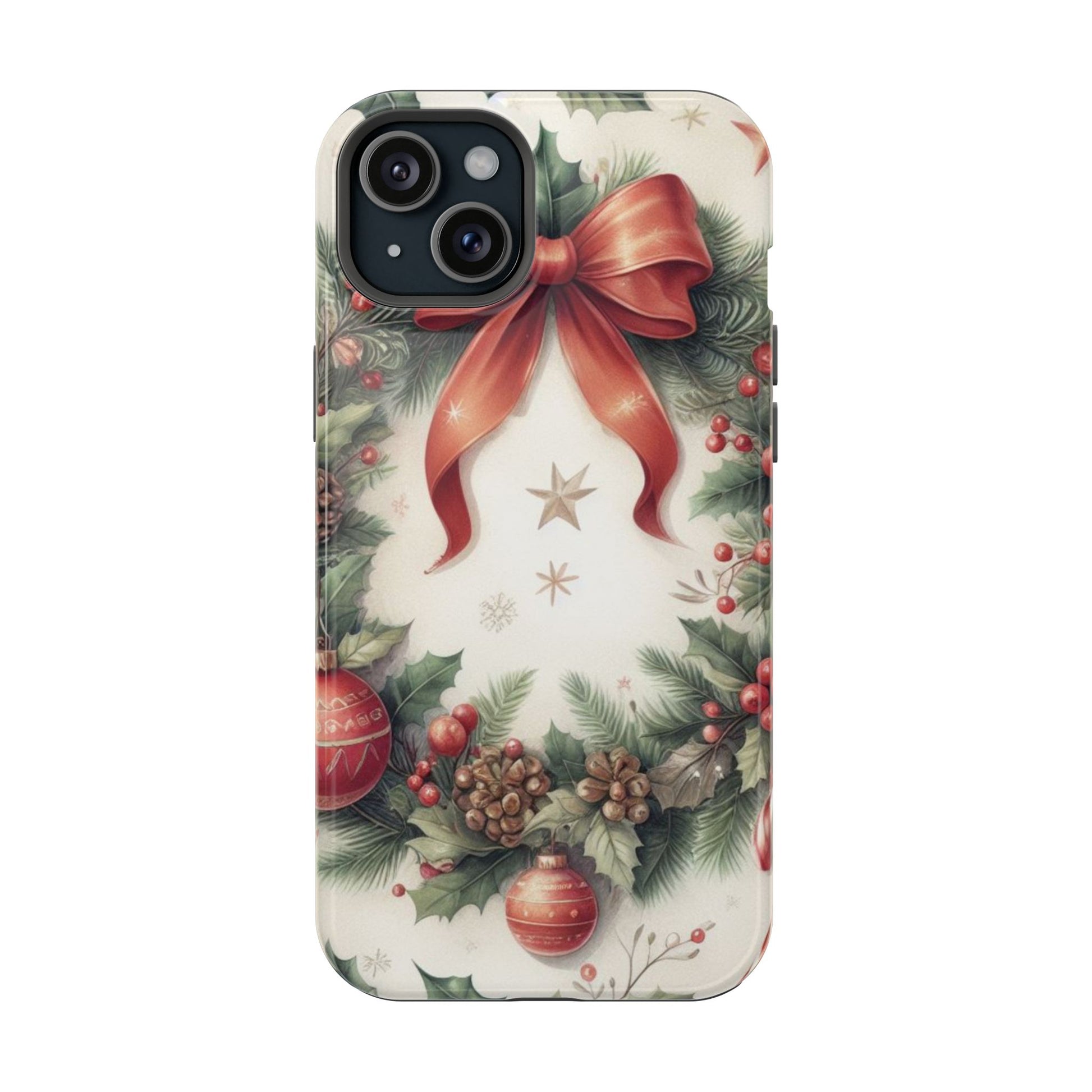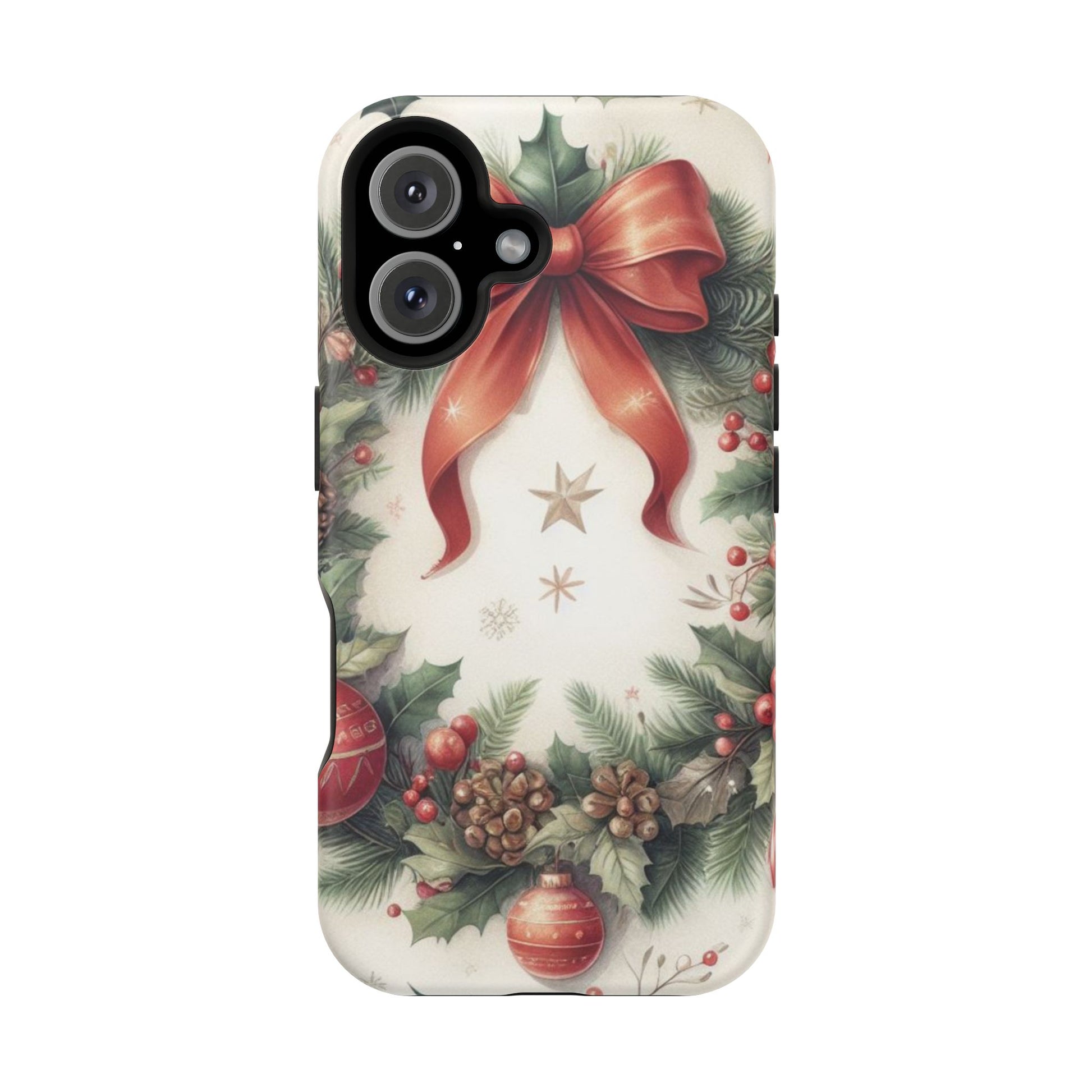 Wrap your phone in timeless holiday elegance with our Classic Christmas Wreath MagSafe  iPhone Case! Featuring a beautifully illustrated wreath adorned with red ribbons, pine cones, ornaments, holly berries, and evergreen branches, this case brings festive charm and a touch of vintage style. Perfect for getting into the holiday spirit, the intricate details and soft, warm colors make it a stunning seasonal accessory. Made from sturdy materials, it protects your phone from everyday bumps and scratches while adding a touch of Christmas cheer. Celebrate the season in style with this beautifully crafted case!