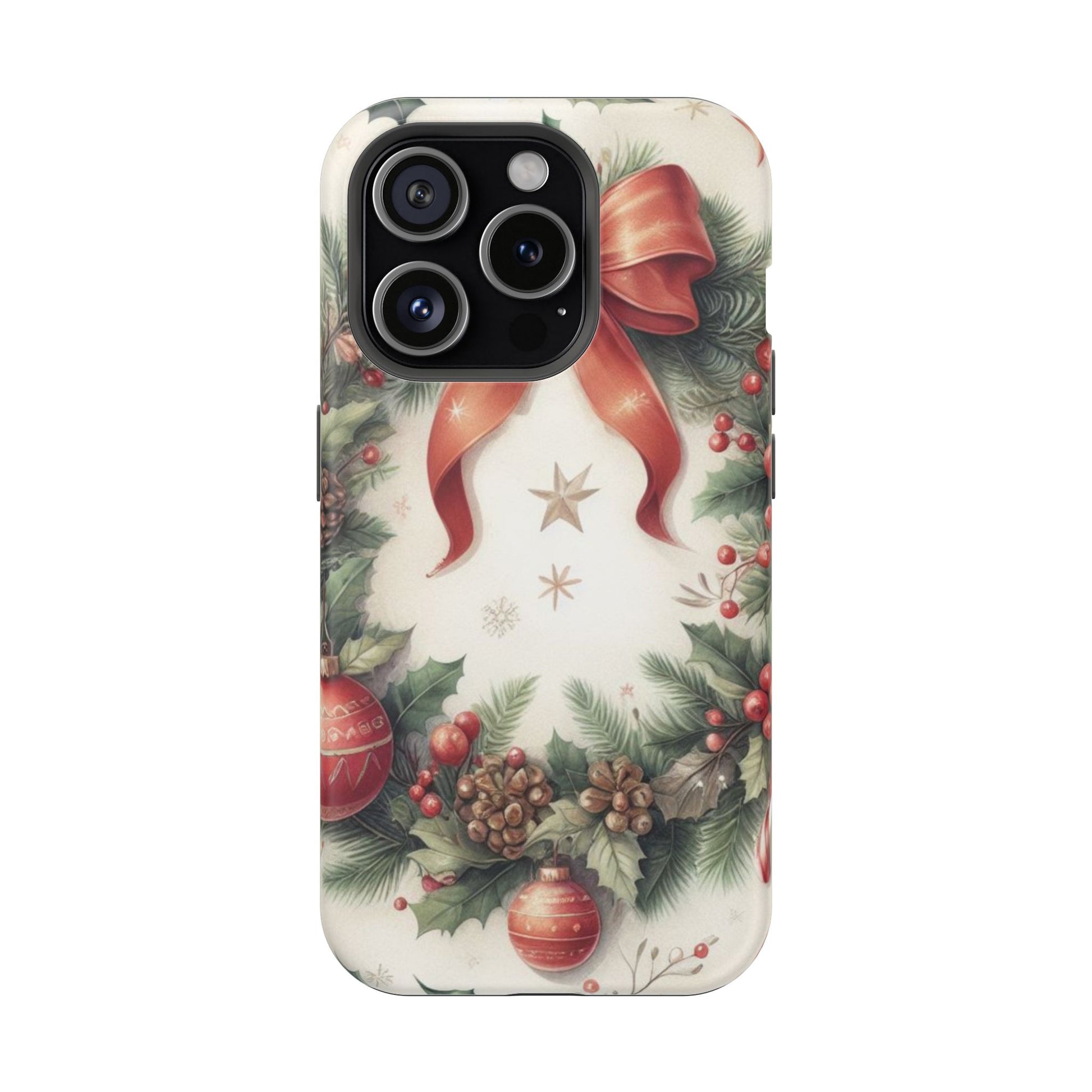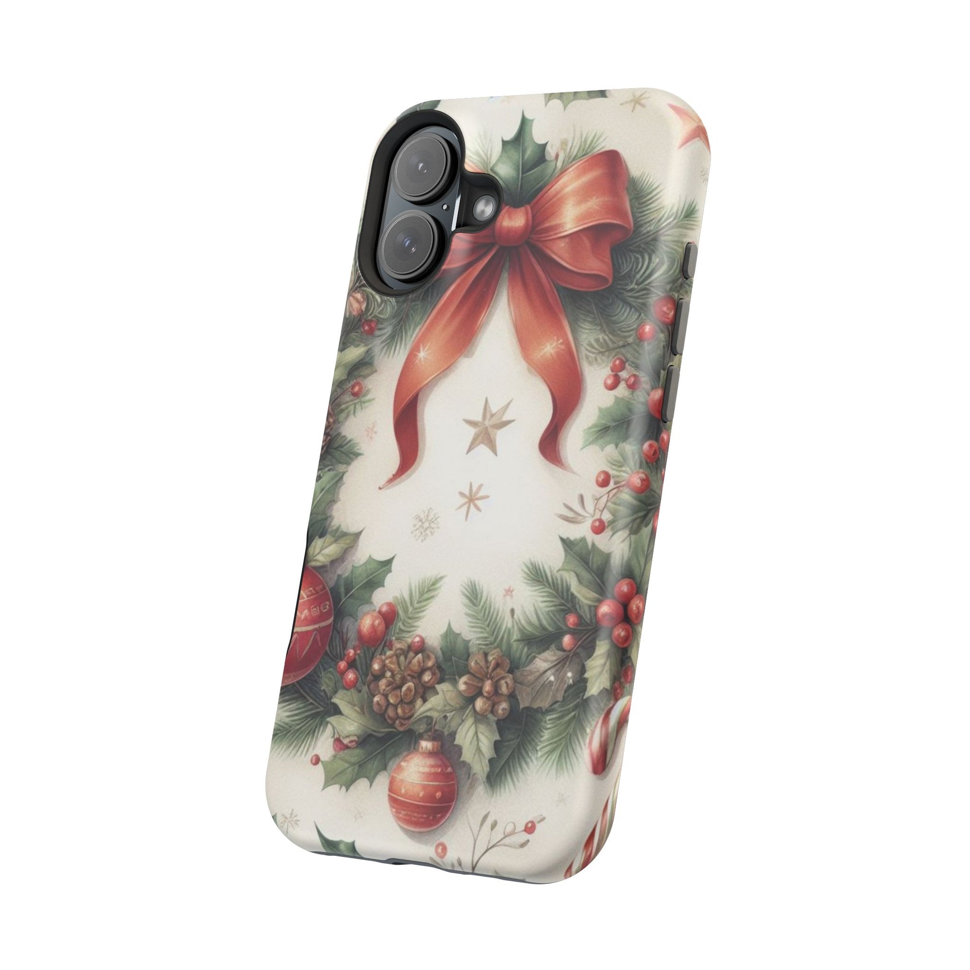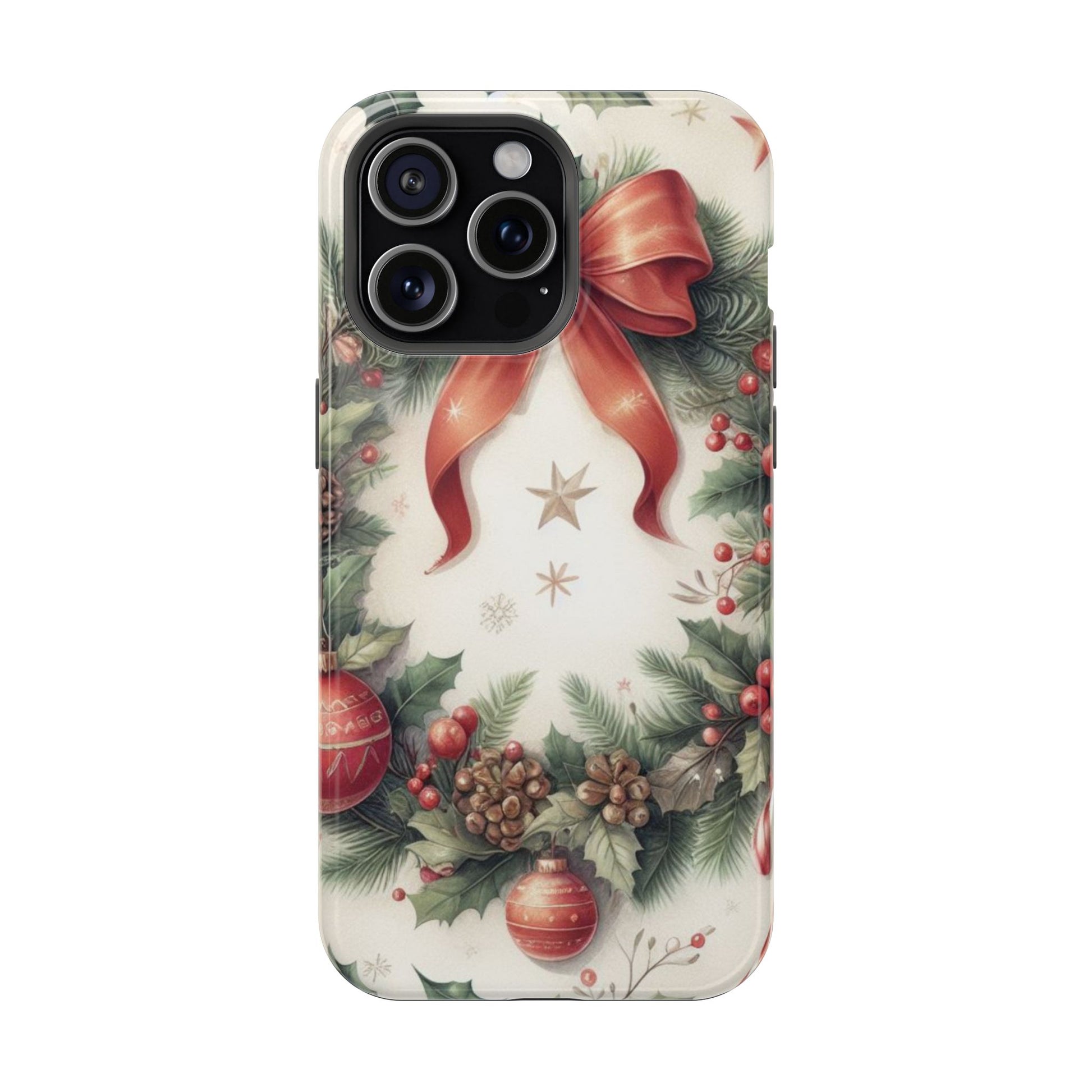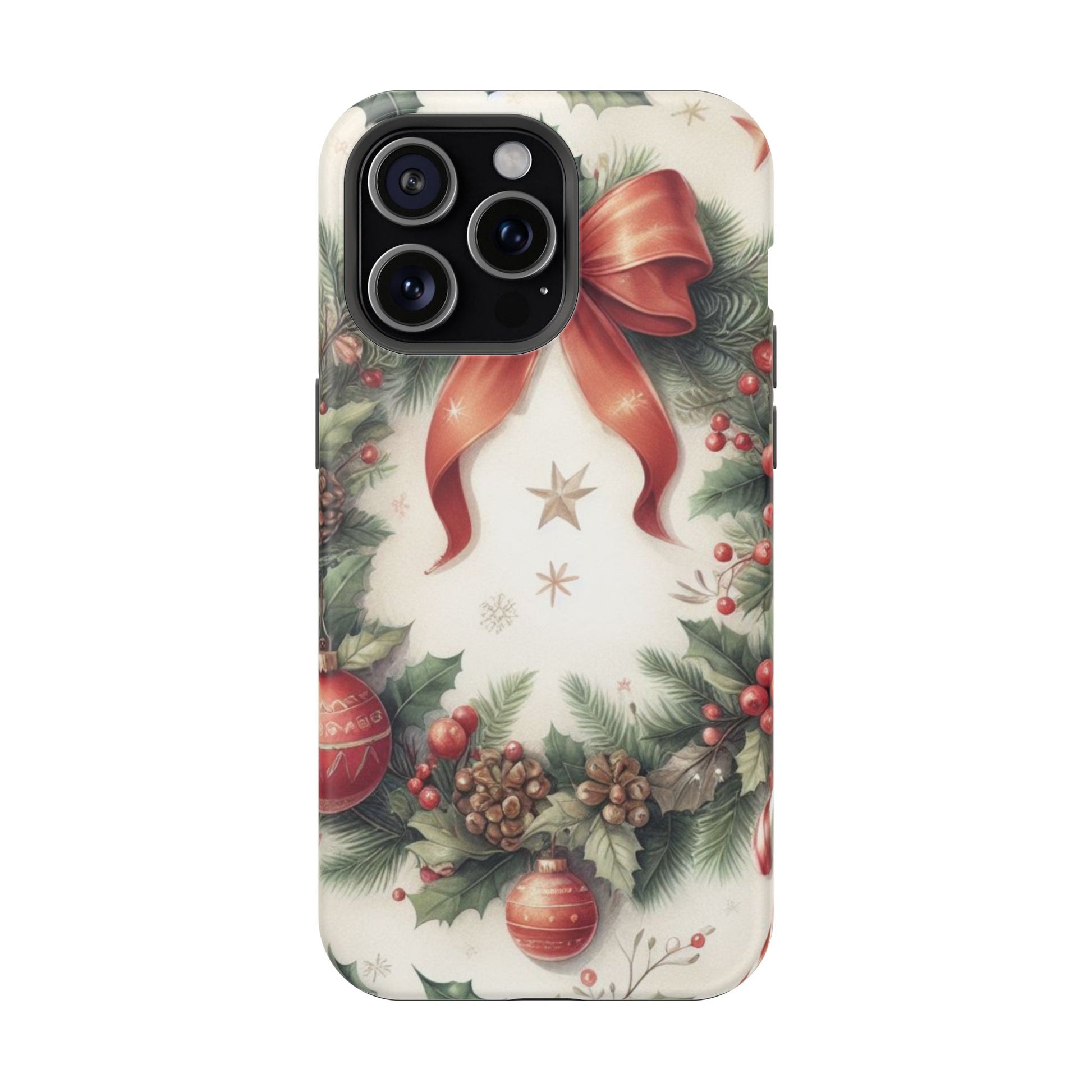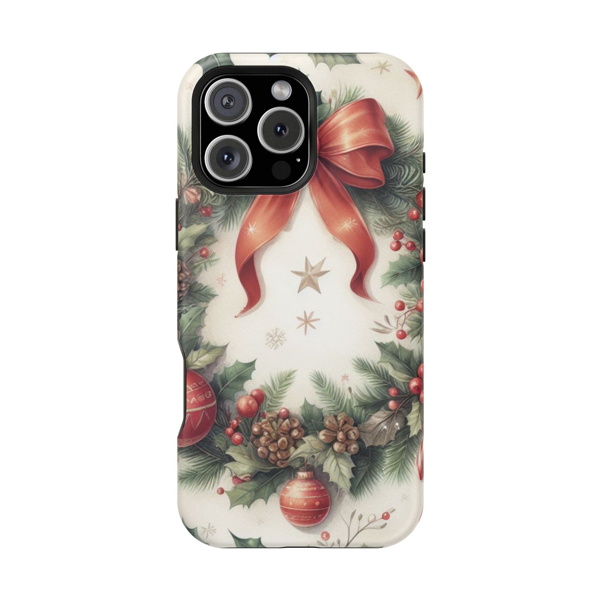 Wrap your phone in timeless holiday elegance with our Classic Christmas Wreath MagSafe  iPhone Case! Featuring a beautifully illustrated wreath adorned with red ribbons, pine cones, ornaments, holly berries, and evergreen branches, this case brings festive charm and a touch of vintage style. Perfect for getting into the holiday spirit, the intricate details and soft, warm colors make it a stunning seasonal accessory. Made from sturdy materials, it protects your phone from everyday bumps and scratches while adding a touch of Christmas cheer. Celebrate the season in style with this beautifully crafted case!