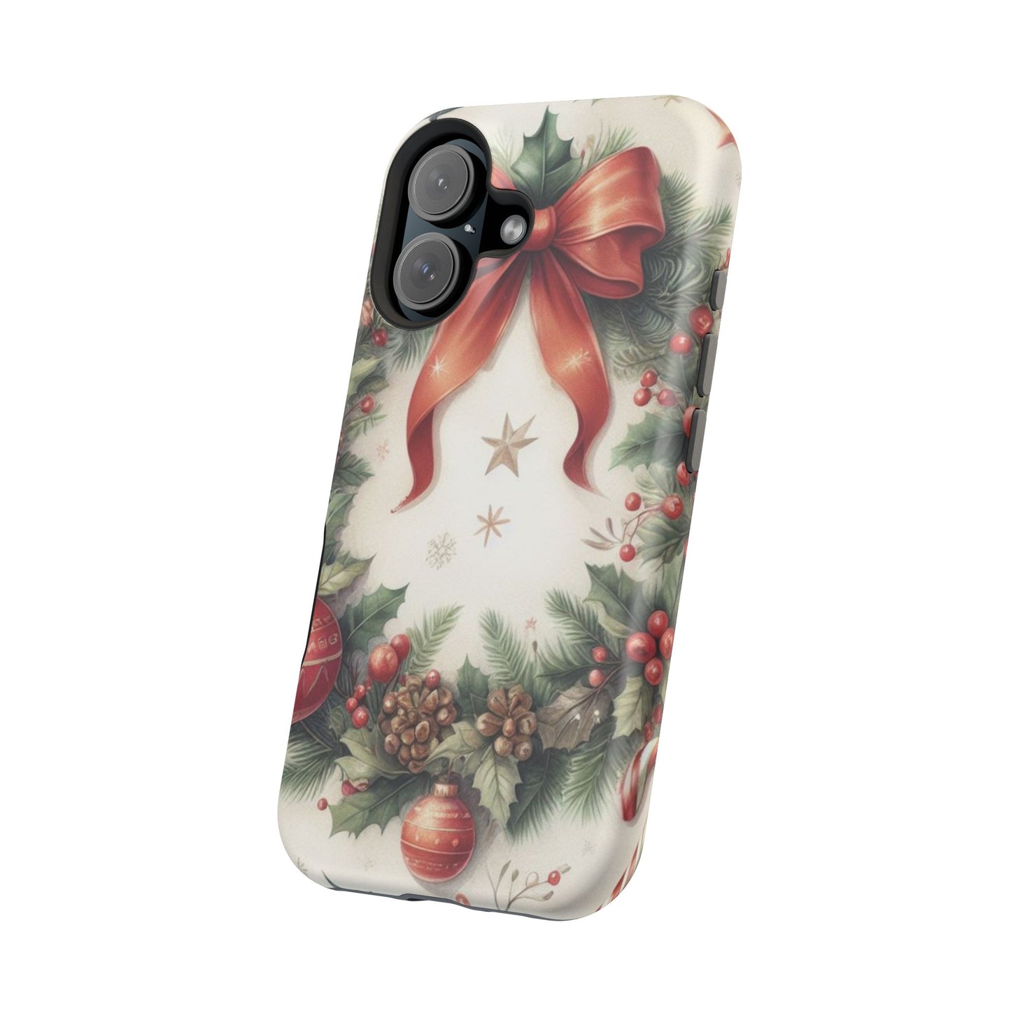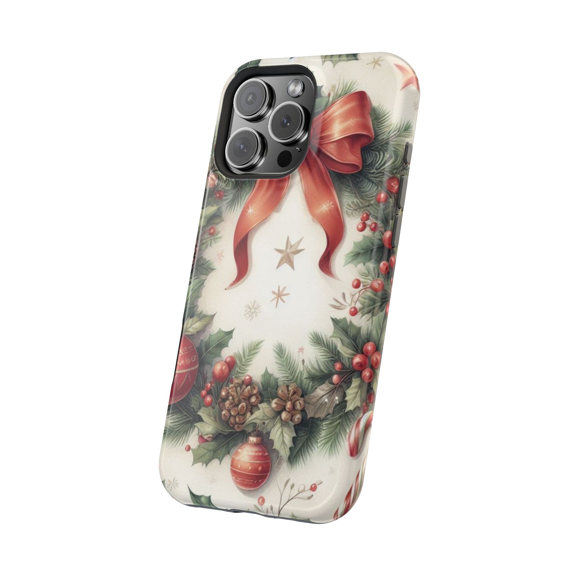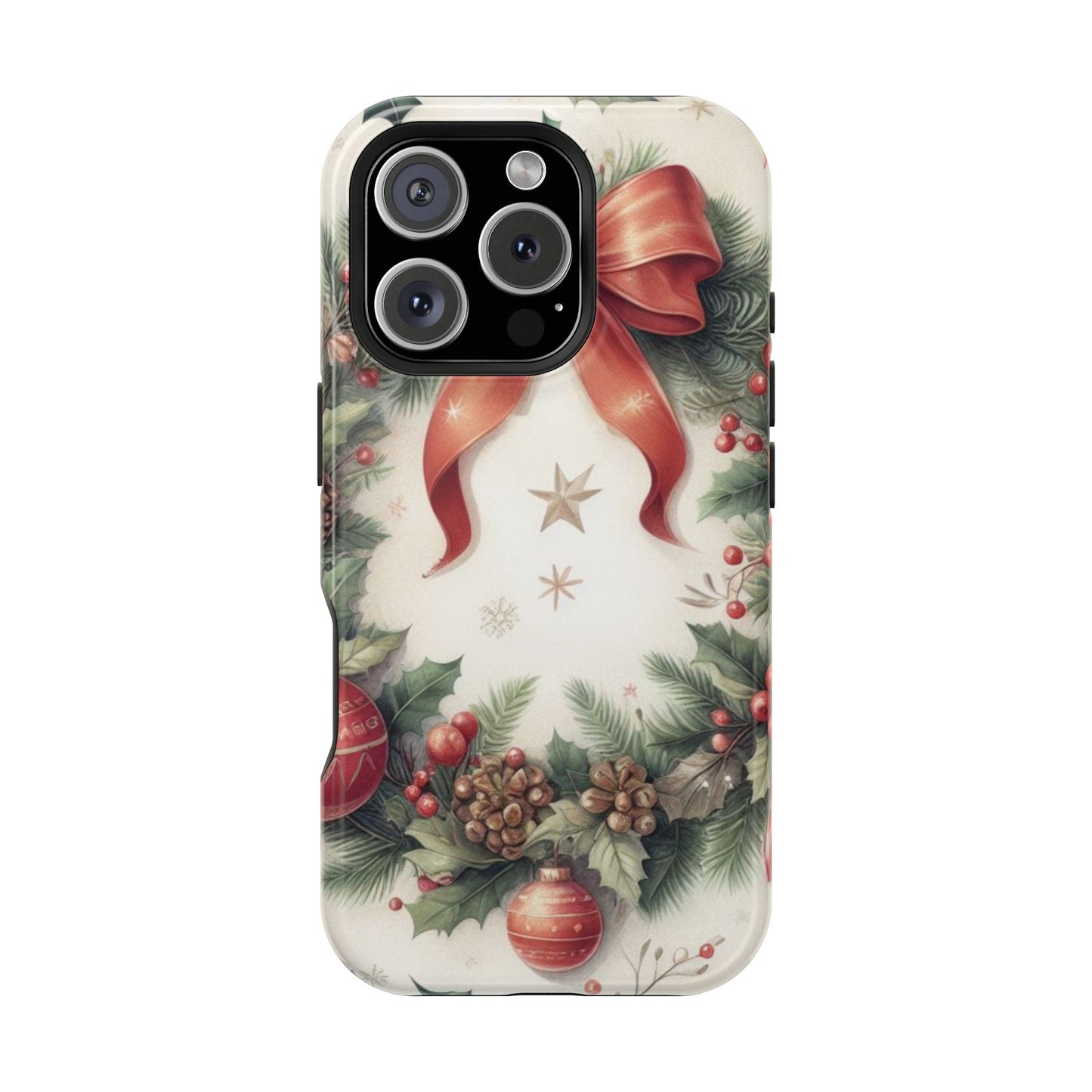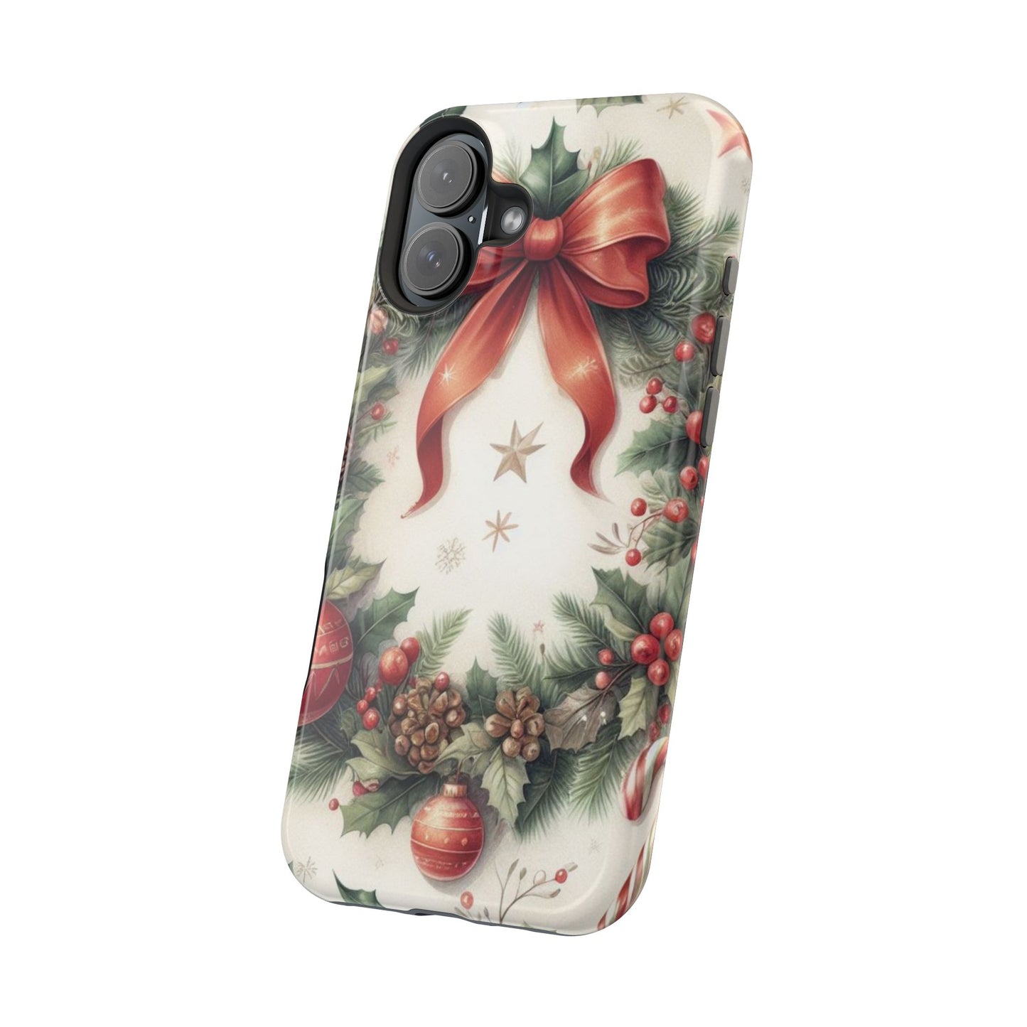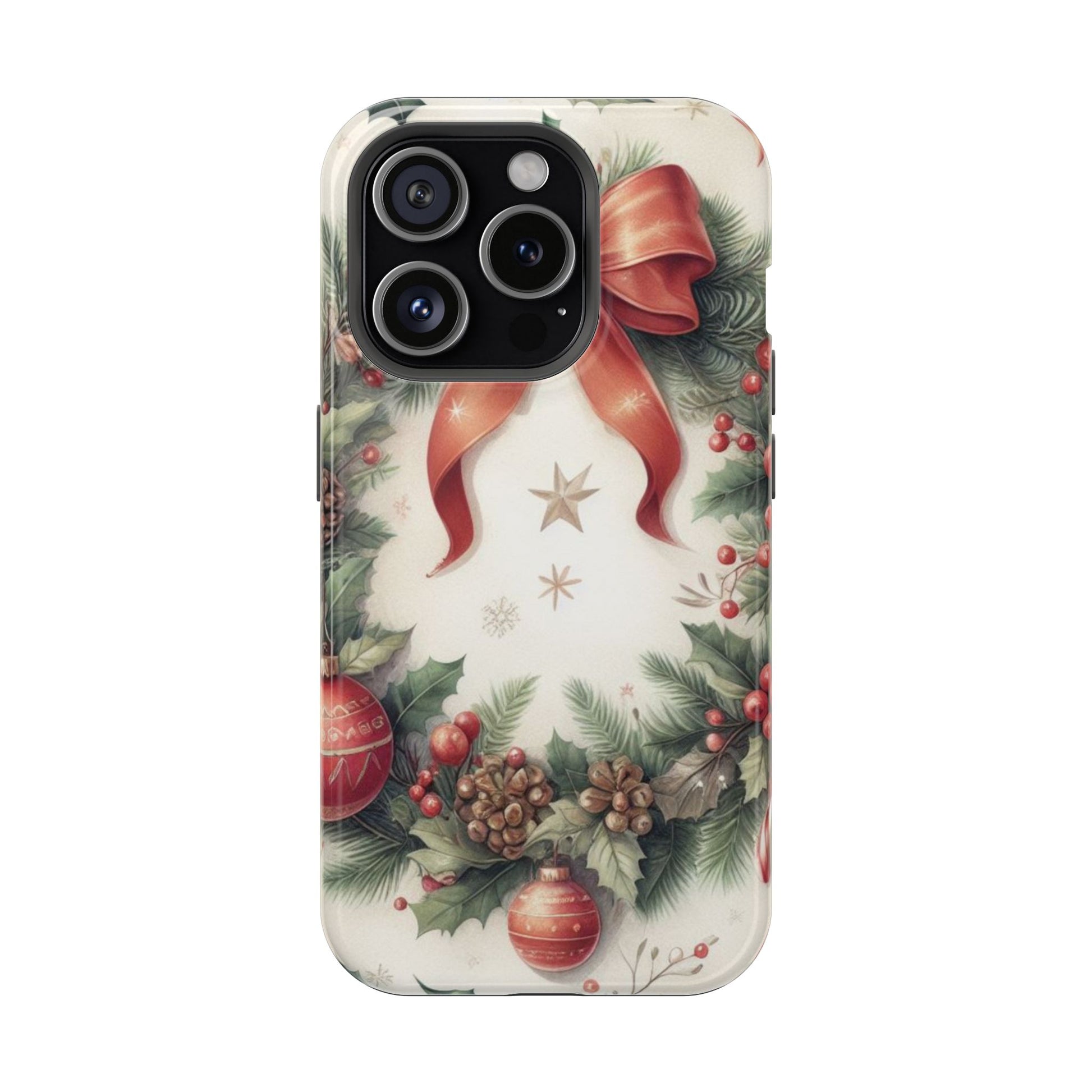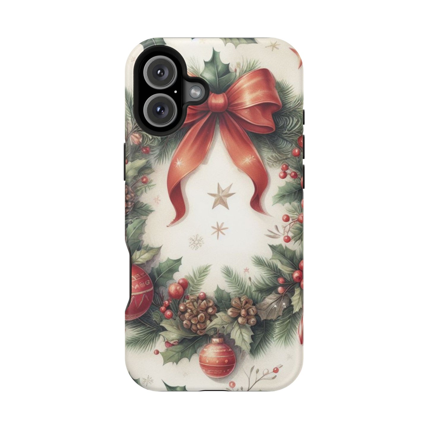 Wrap your phone in timeless holiday elegance with our Classic Christmas Wreath MagSafe  iPhone Case! Featuring a beautifully illustrated wreath adorned with red ribbons, pine cones, ornaments, holly berries, and evergreen branches, this case brings festive charm and a touch of vintage style. Perfect for getting into the holiday spirit, the intricate details and soft, warm colors make it a stunning seasonal accessory. Made from sturdy materials, it protects your phone from everyday bumps and scratches while adding a touch of Christmas cheer. Celebrate the season in style with this beautifully crafted case!