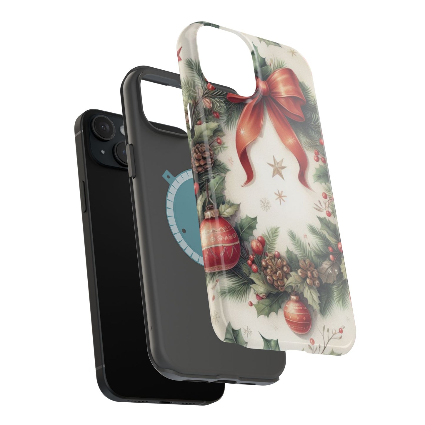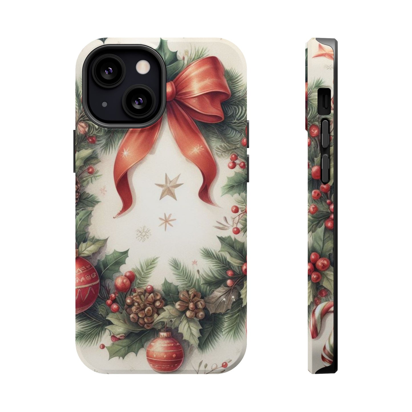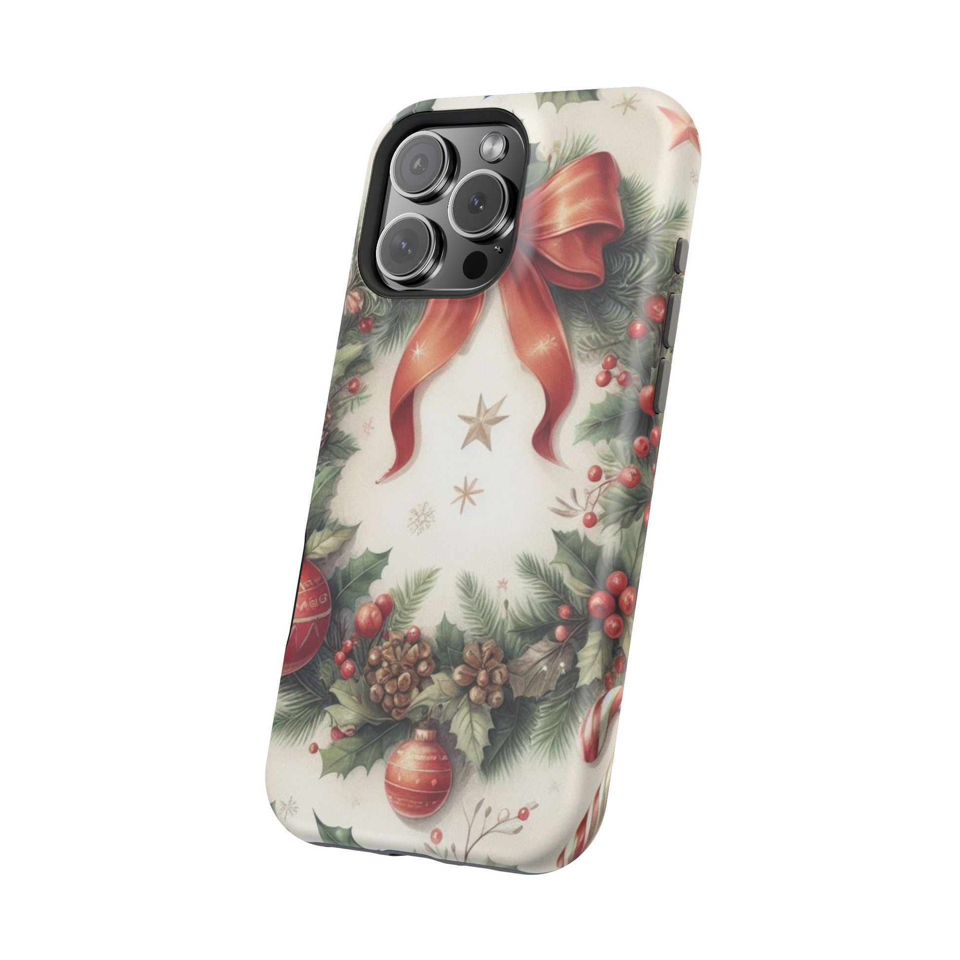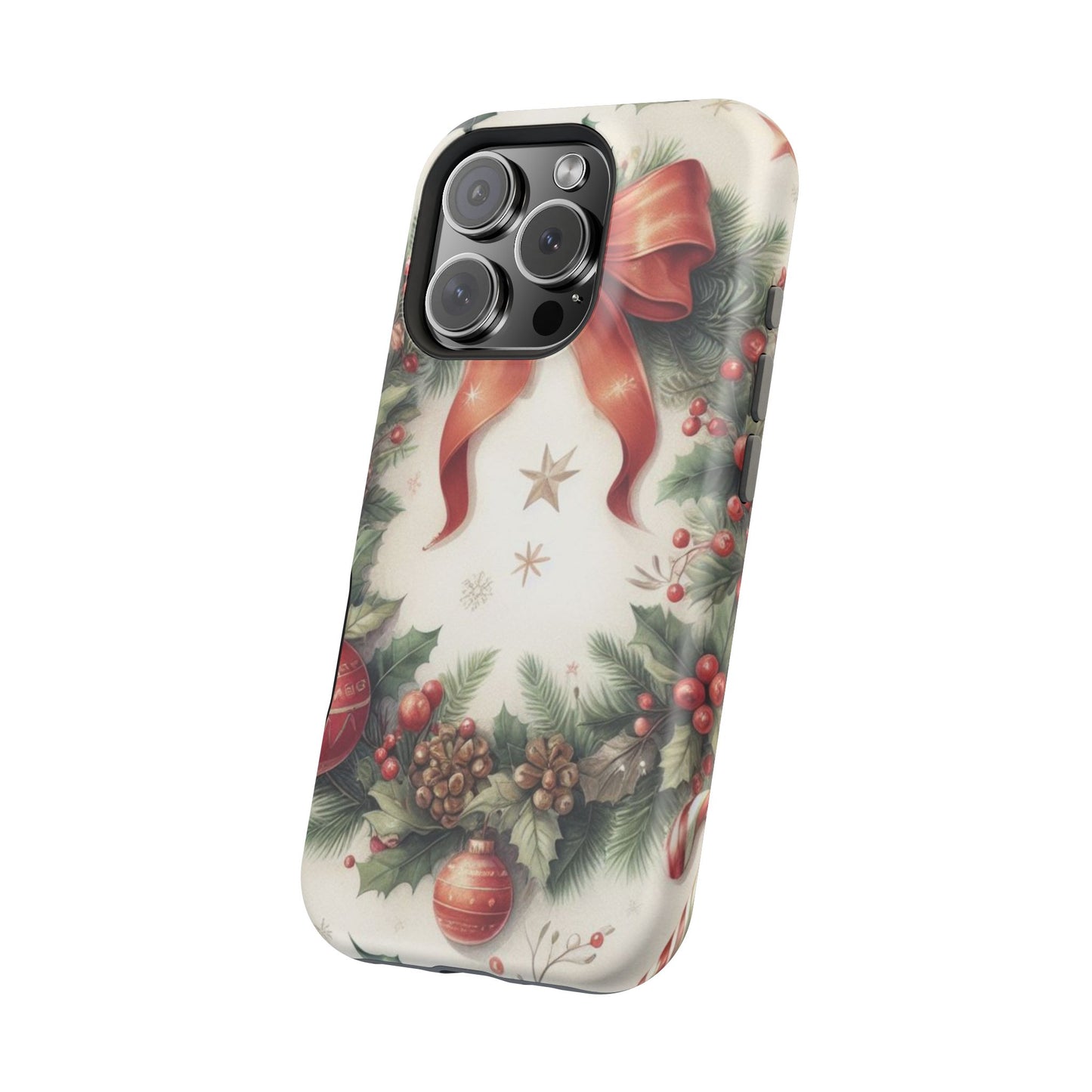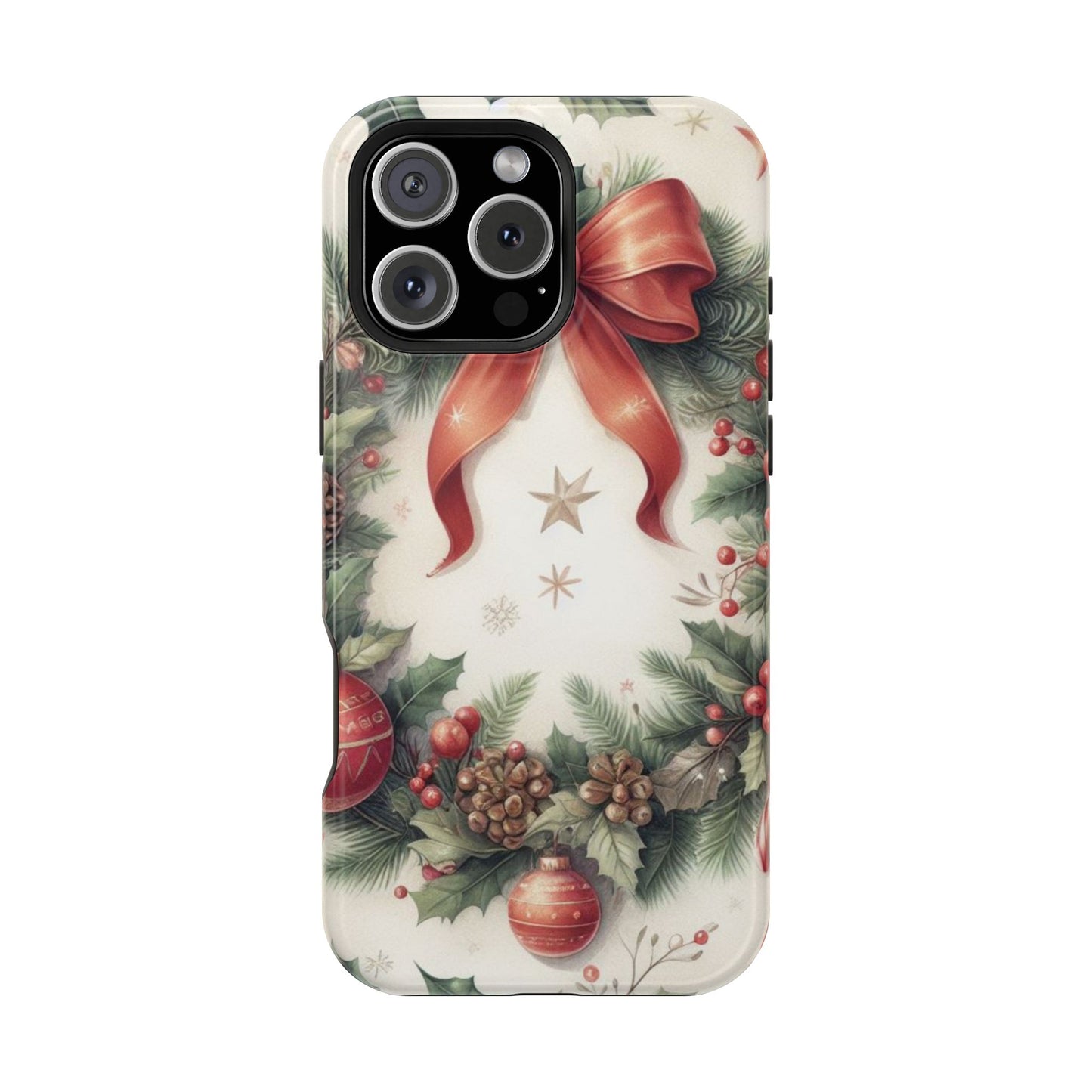 Wrap your phone in timeless holiday elegance with our Classic Christmas Wreath MagSafe  iPhone Case! Featuring a beautifully illustrated wreath adorned with red ribbons, pine cones, ornaments, holly berries, and evergreen branches, this case brings festive charm and a touch of vintage style. Perfect for getting into the holiday spirit, the intricate details and soft, warm colors make it a stunning seasonal accessory. Made from sturdy materials, it protects your phone from everyday bumps and scratches while adding a touch of Christmas cheer. Celebrate the season in style with this beautifully crafted case!