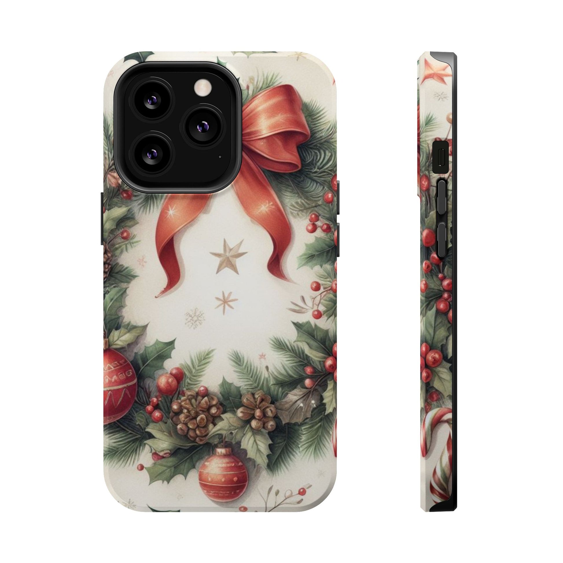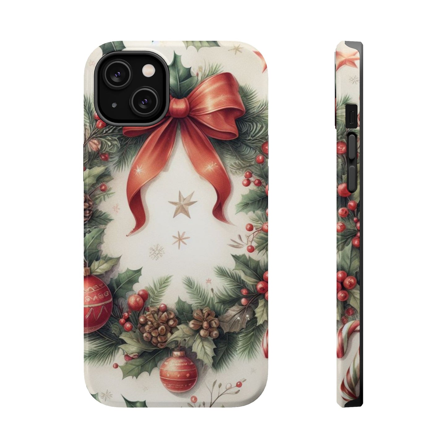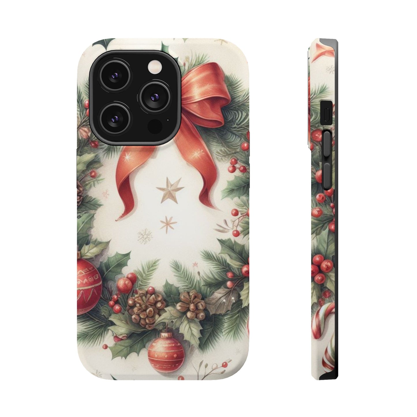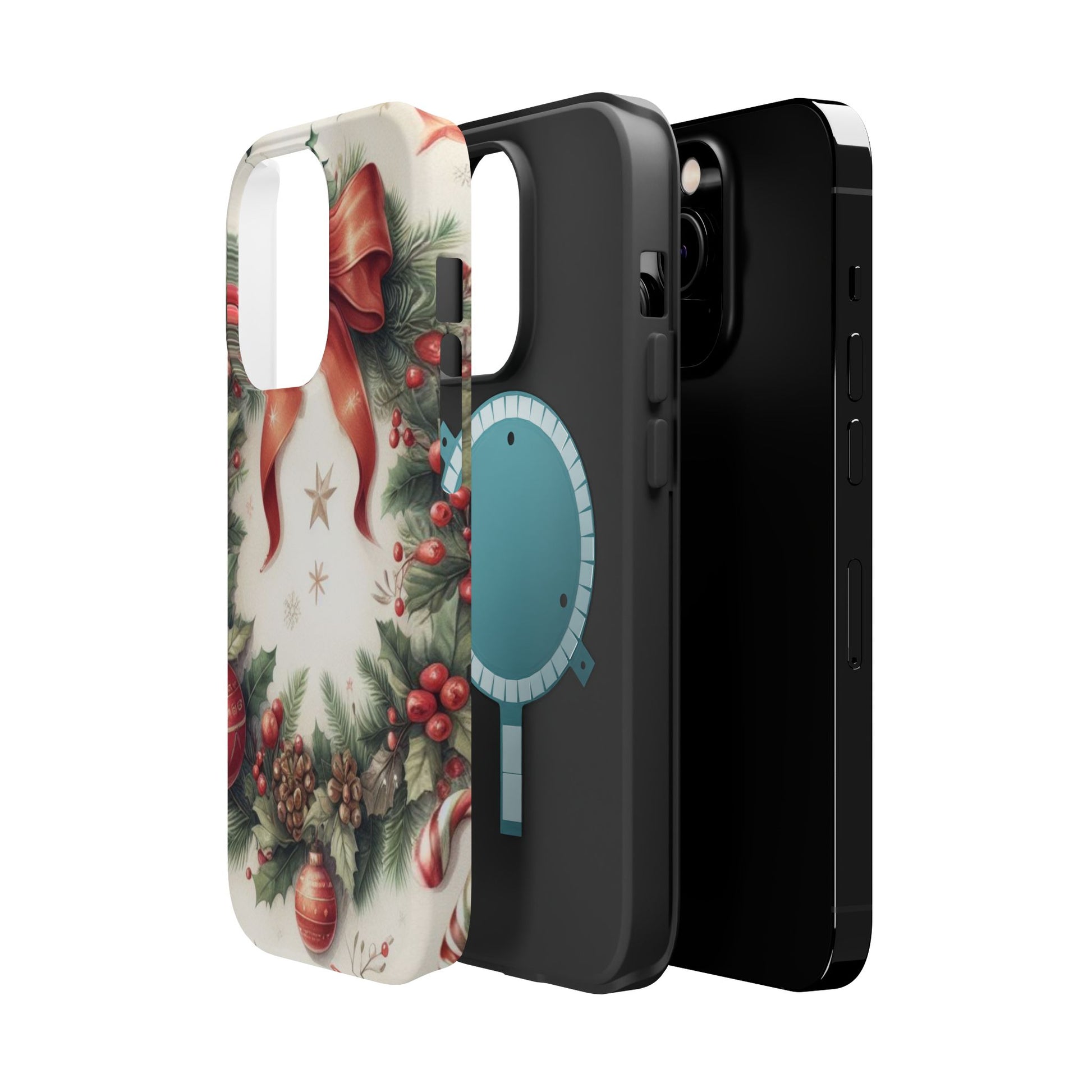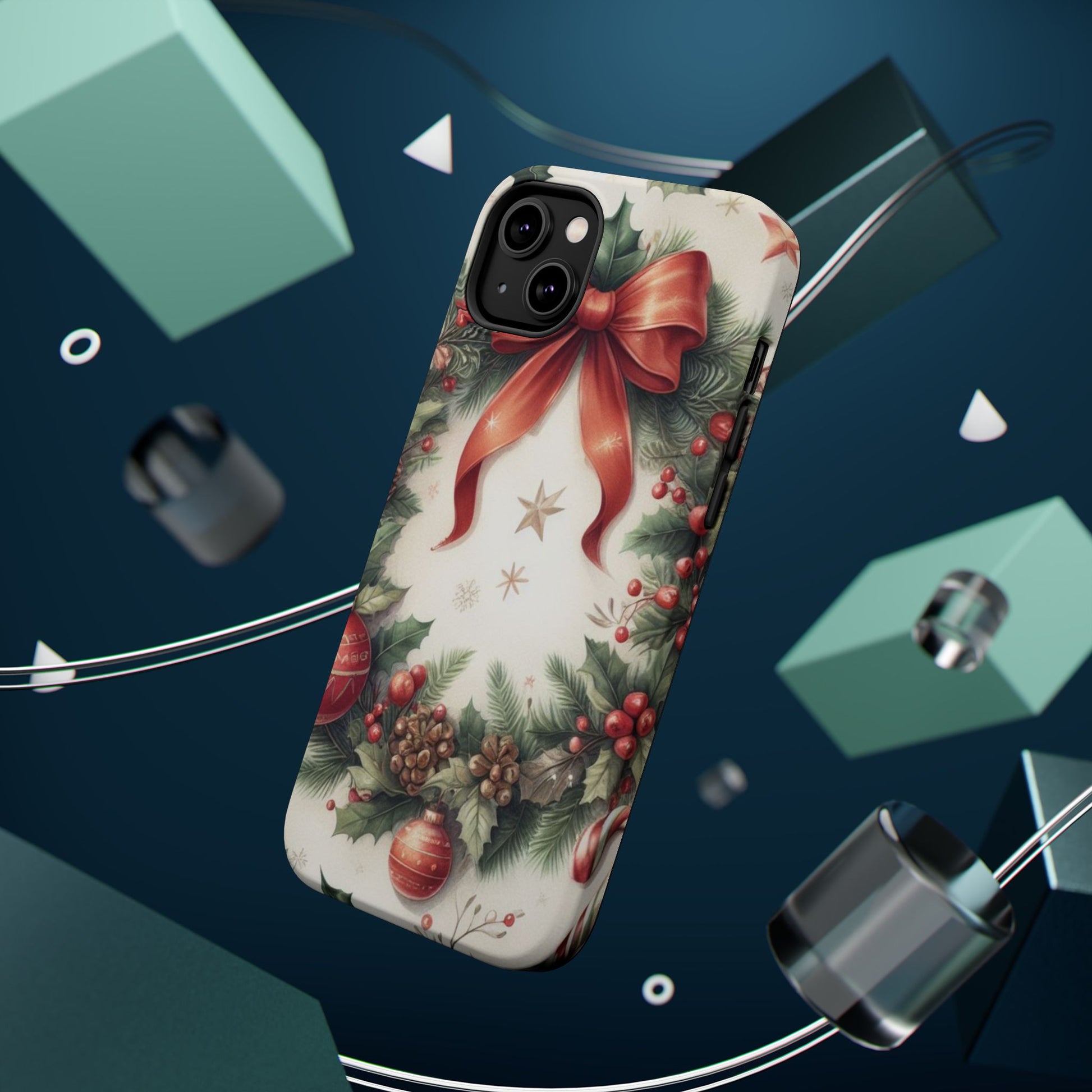 Wrap your phone in timeless holiday elegance with our Classic Christmas Wreath MagSafe  iPhone Case! Featuring a beautifully illustrated wreath adorned with red ribbons, pine cones, ornaments, holly berries, and evergreen branches, this case brings festive charm and a touch of vintage style. Perfect for getting into the holiday spirit, the intricate details and soft, warm colors make it a stunning seasonal accessory. Made from sturdy materials, it protects your phone from everyday bumps and scratches while adding a touch of Christmas cheer. Celebrate the season in style with this beautifully crafted case!