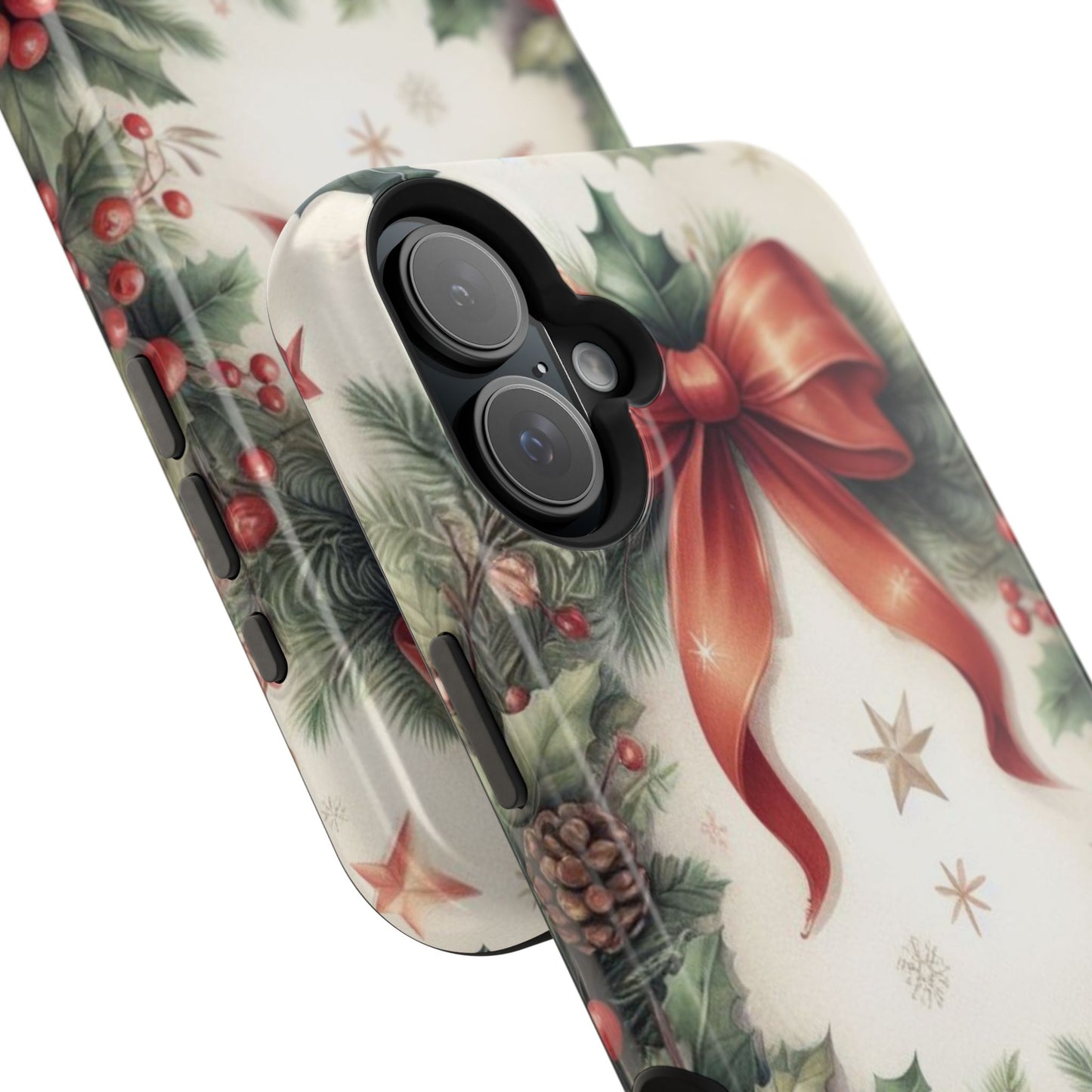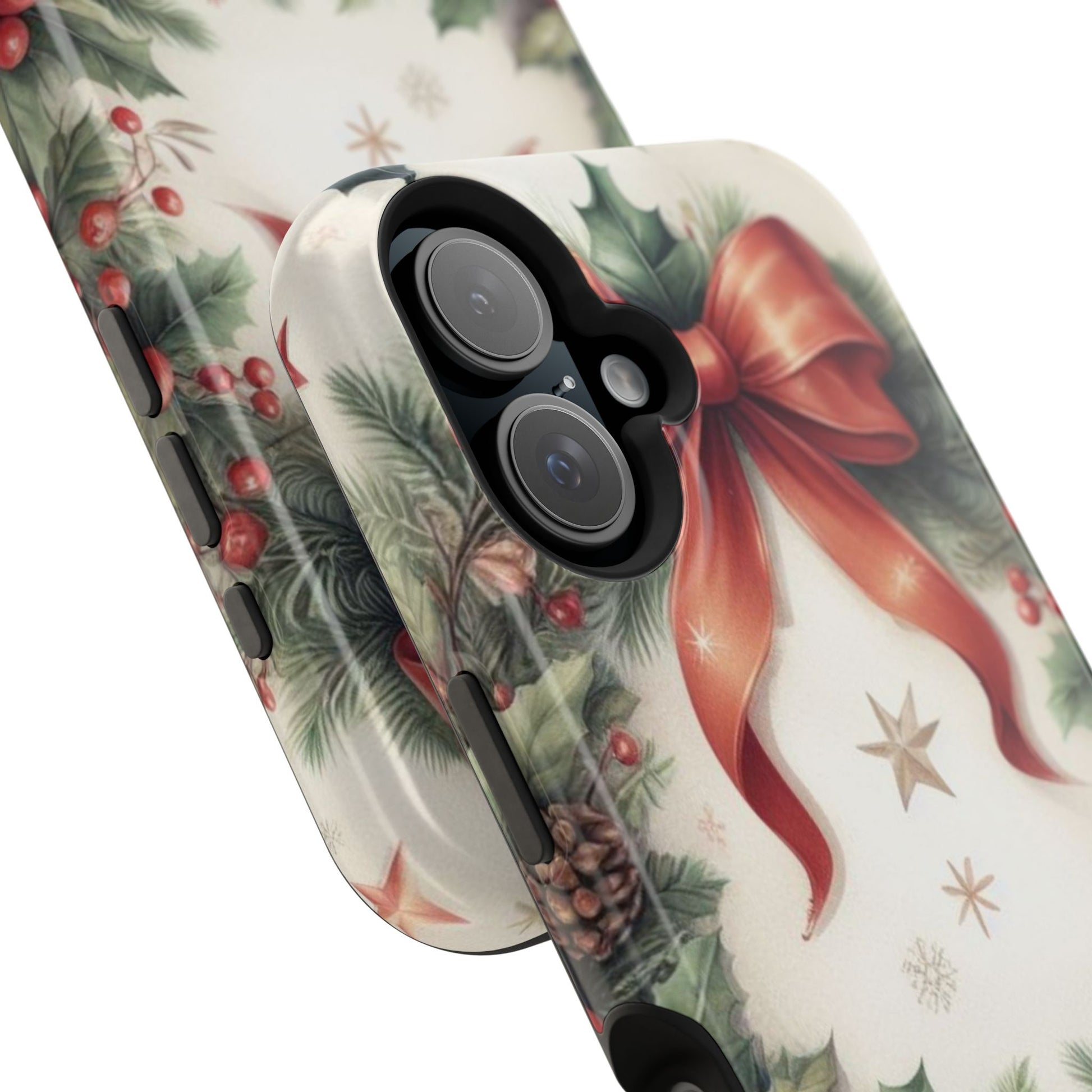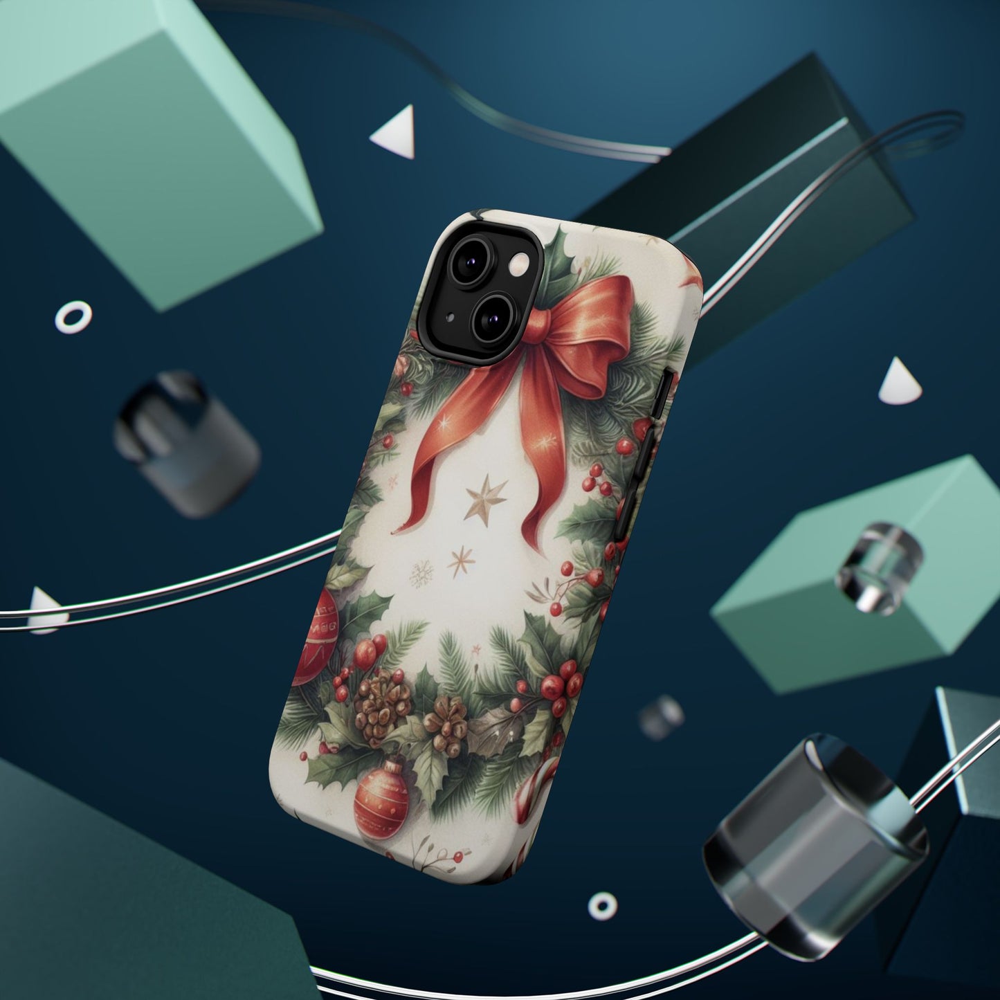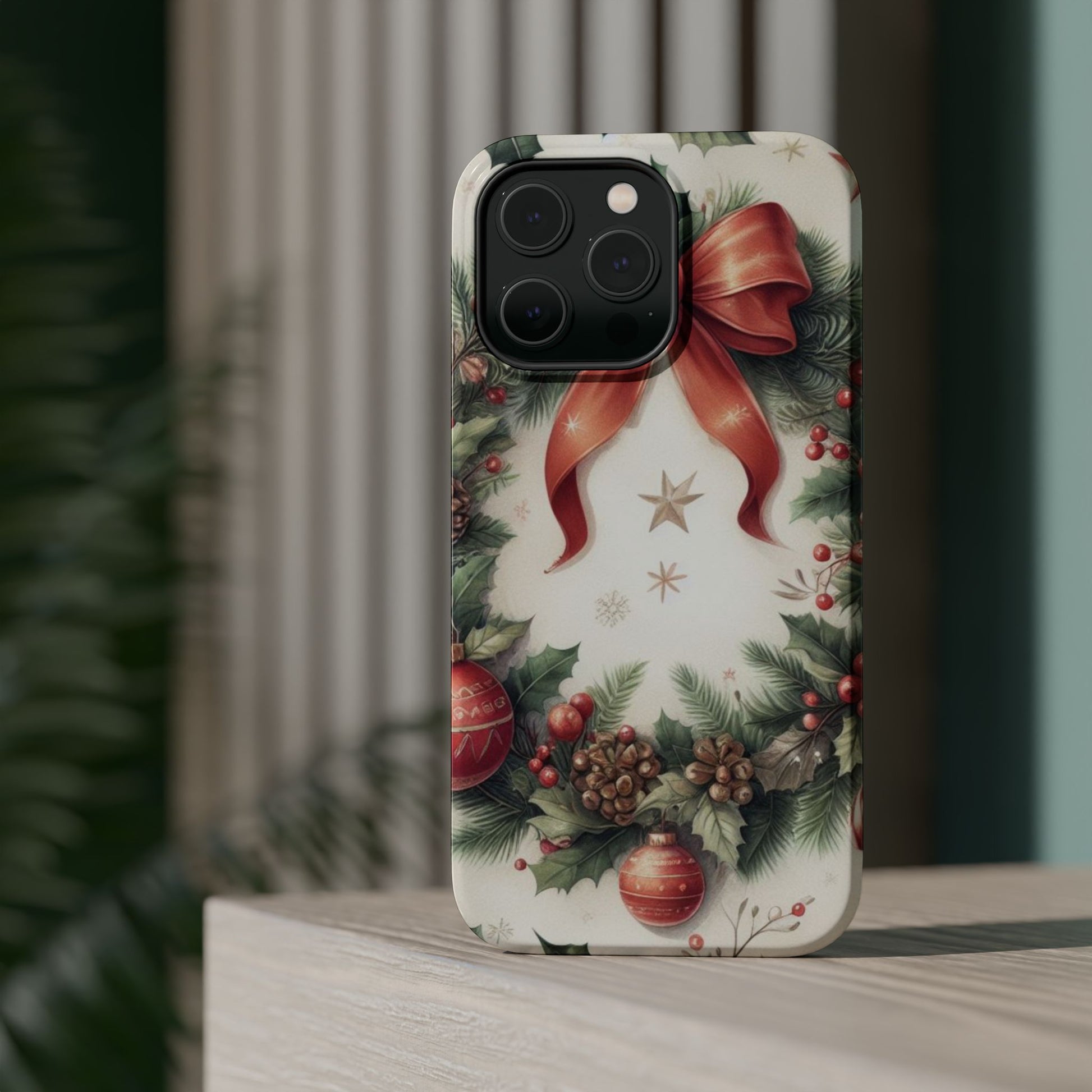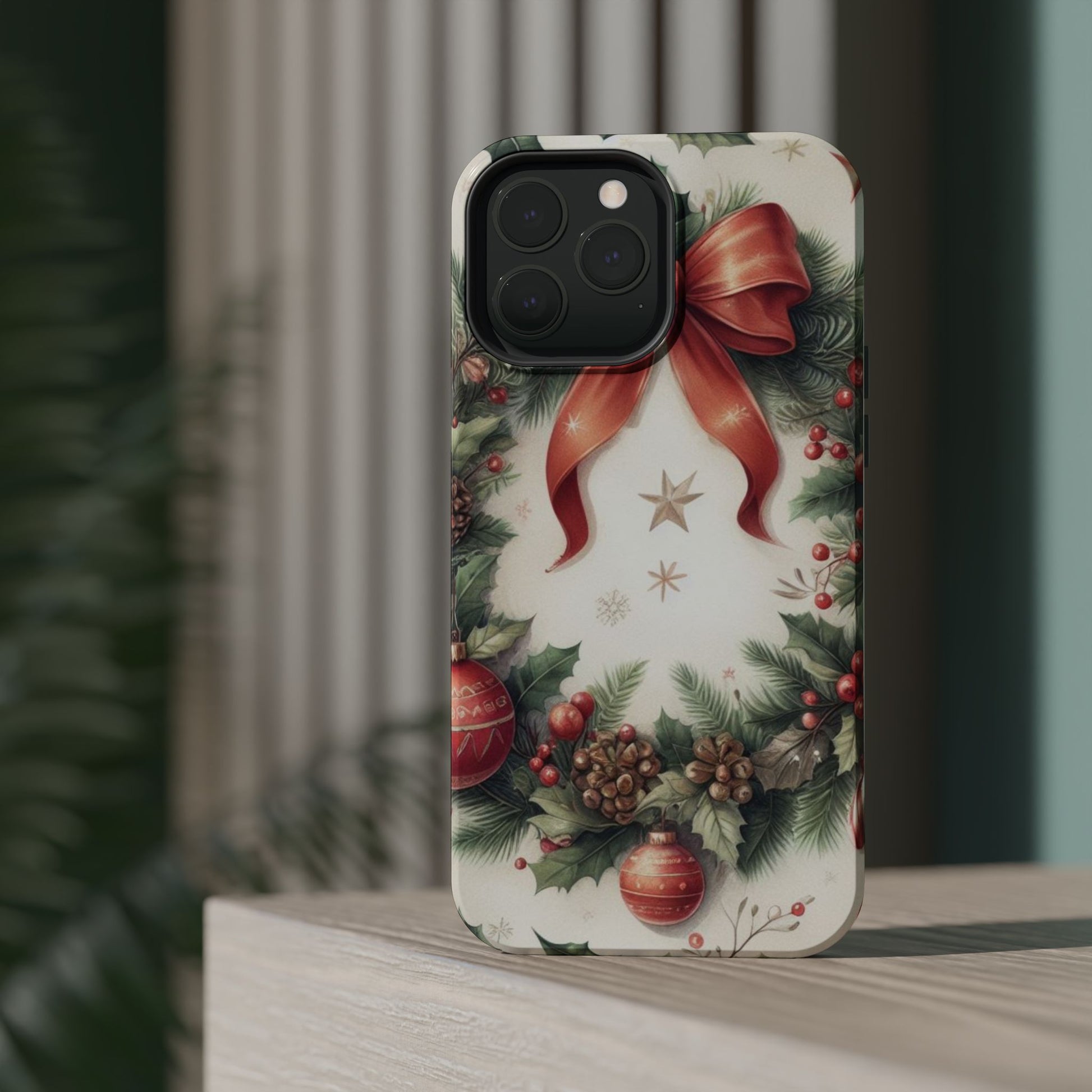 Wrap your phone in timeless holiday elegance with our Classic Christmas Wreath MagSafe  iPhone Case! Featuring a beautifully illustrated wreath adorned with red ribbons, pine cones, ornaments, holly berries, and evergreen branches, this case brings festive charm and a touch of vintage style. Perfect for getting into the holiday spirit, the intricate details and soft, warm colors make it a stunning seasonal accessory. Made from sturdy materials, it protects your phone from everyday bumps and scratches while adding a touch of Christmas cheer. Celebrate the season in style with this beautifully crafted case!