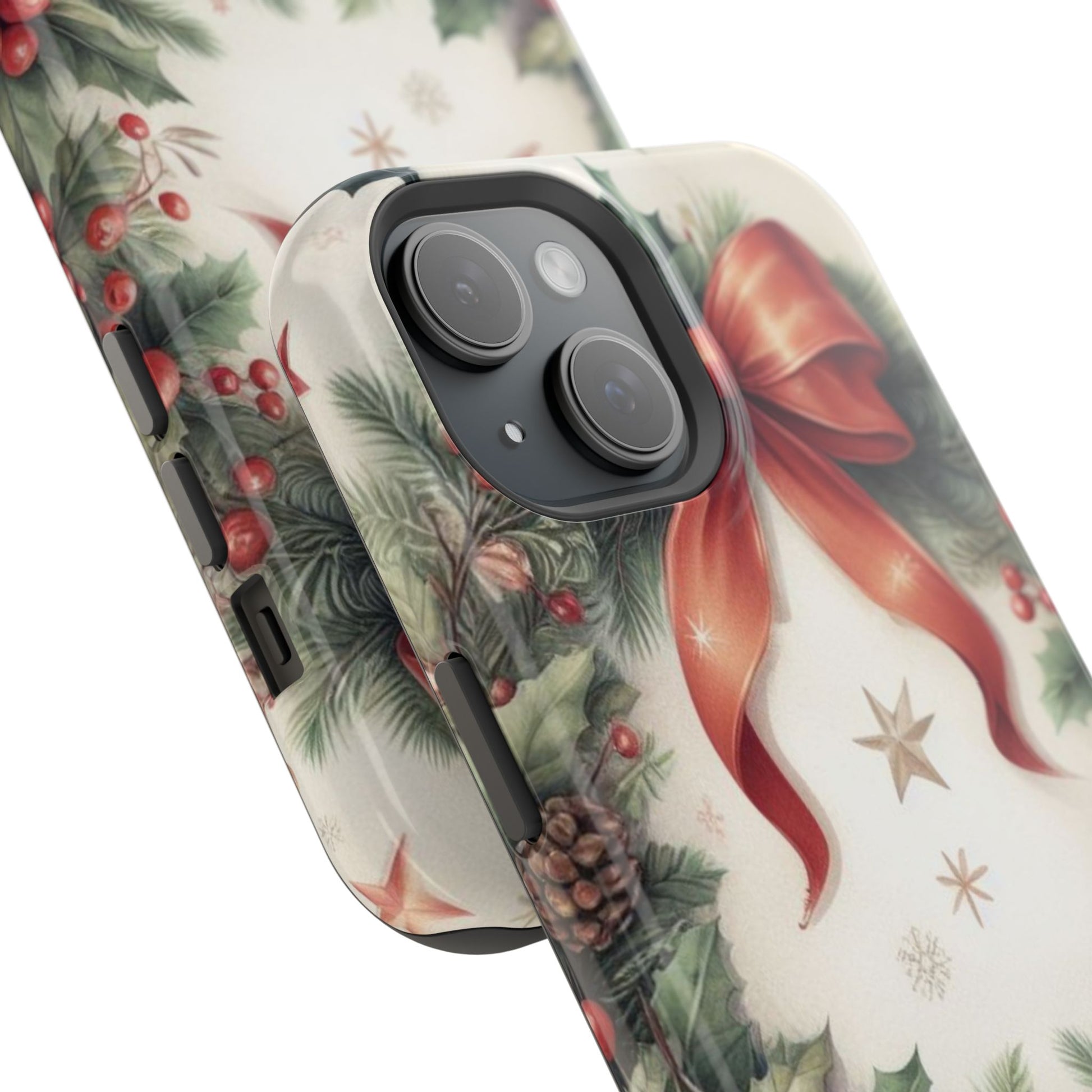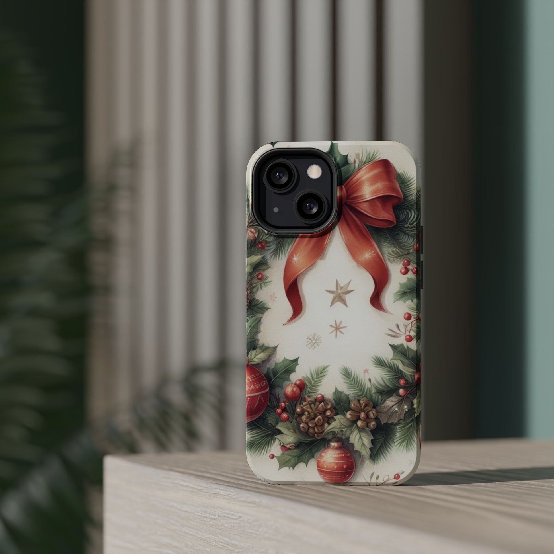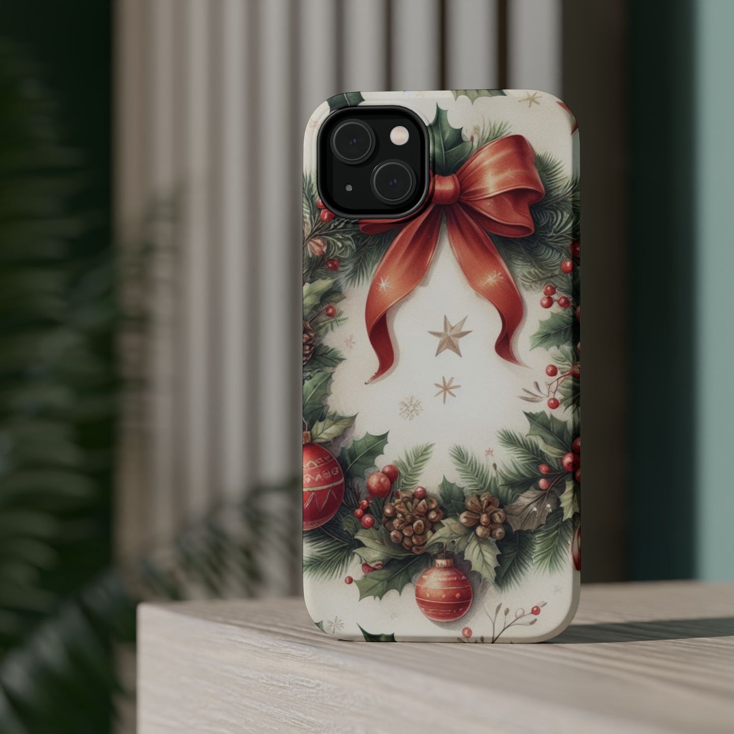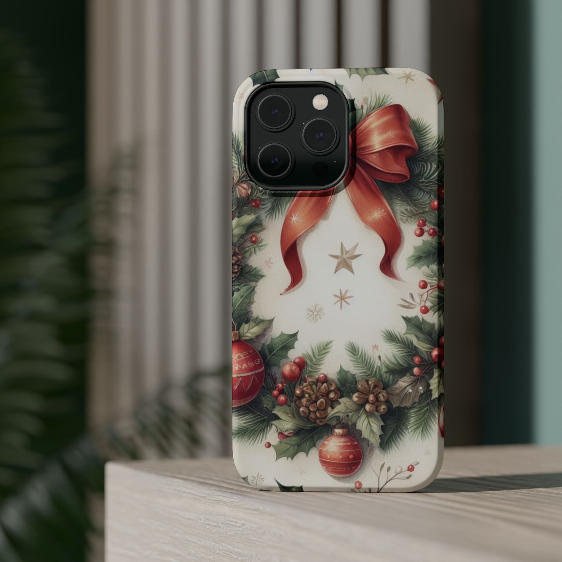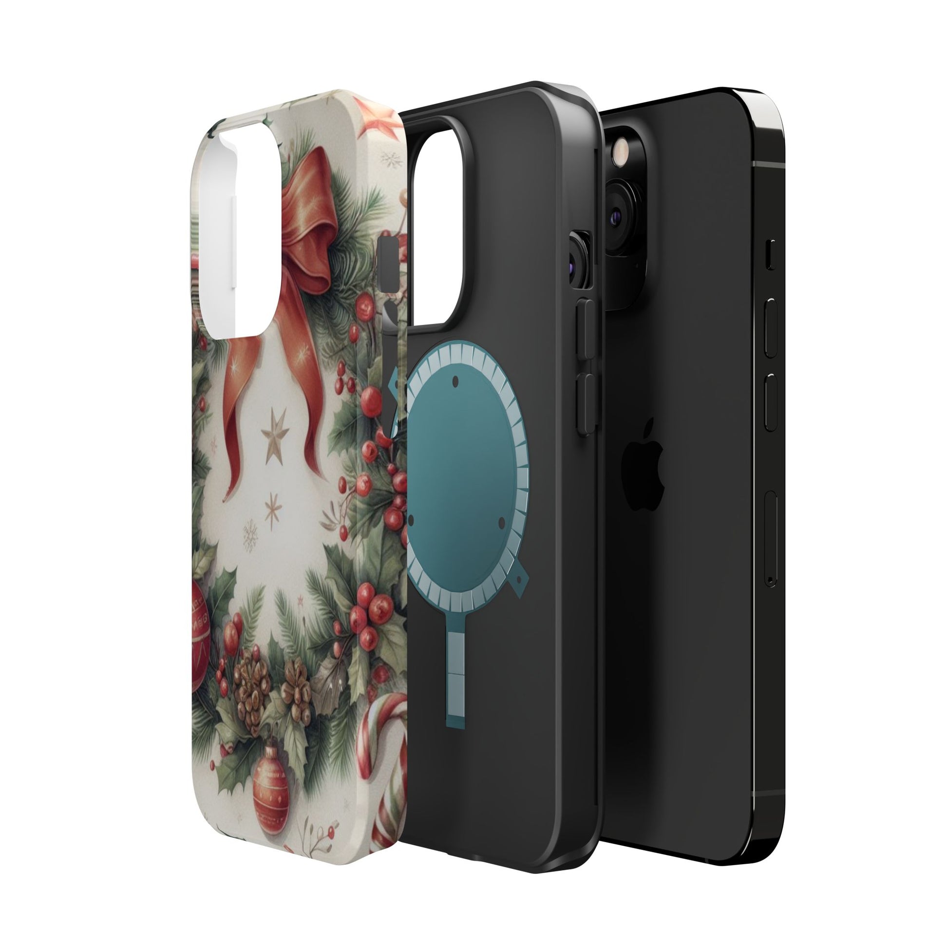 Wrap your phone in timeless holiday elegance with our Classic Christmas Wreath MagSafe  iPhone Case! Featuring a beautifully illustrated wreath adorned with red ribbons, pine cones, ornaments, holly berries, and evergreen branches, this case brings festive charm and a touch of vintage style. Perfect for getting into the holiday spirit, the intricate details and soft, warm colors make it a stunning seasonal accessory. Made from sturdy materials, it protects your phone from everyday bumps and scratches while adding a touch of Christmas cheer. Celebrate the season in style with this beautifully crafted case!