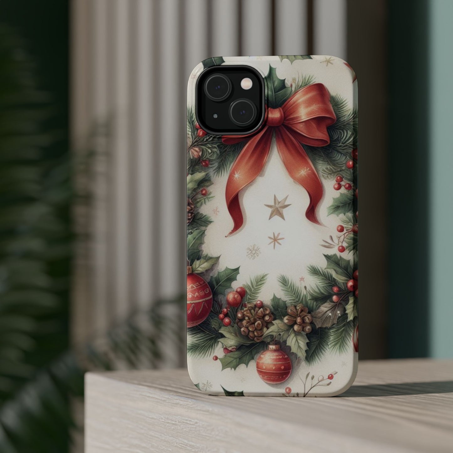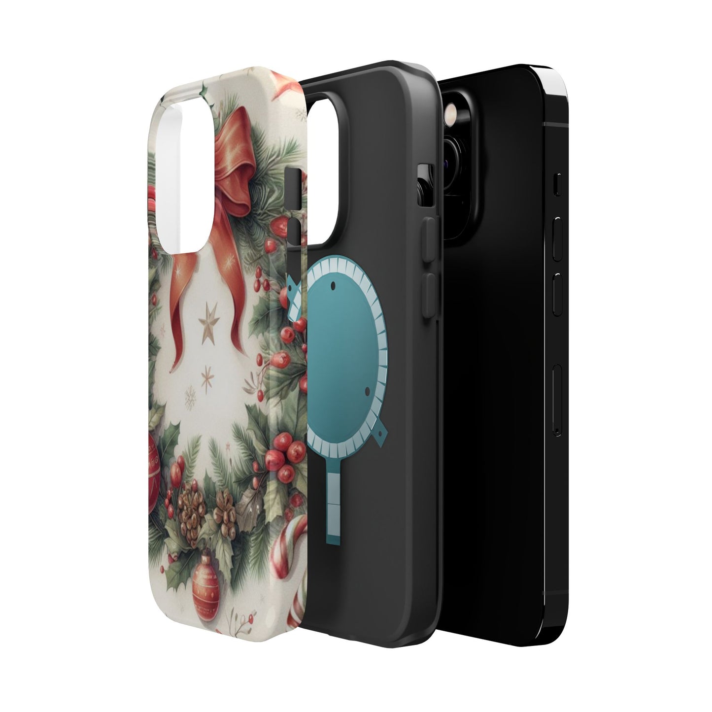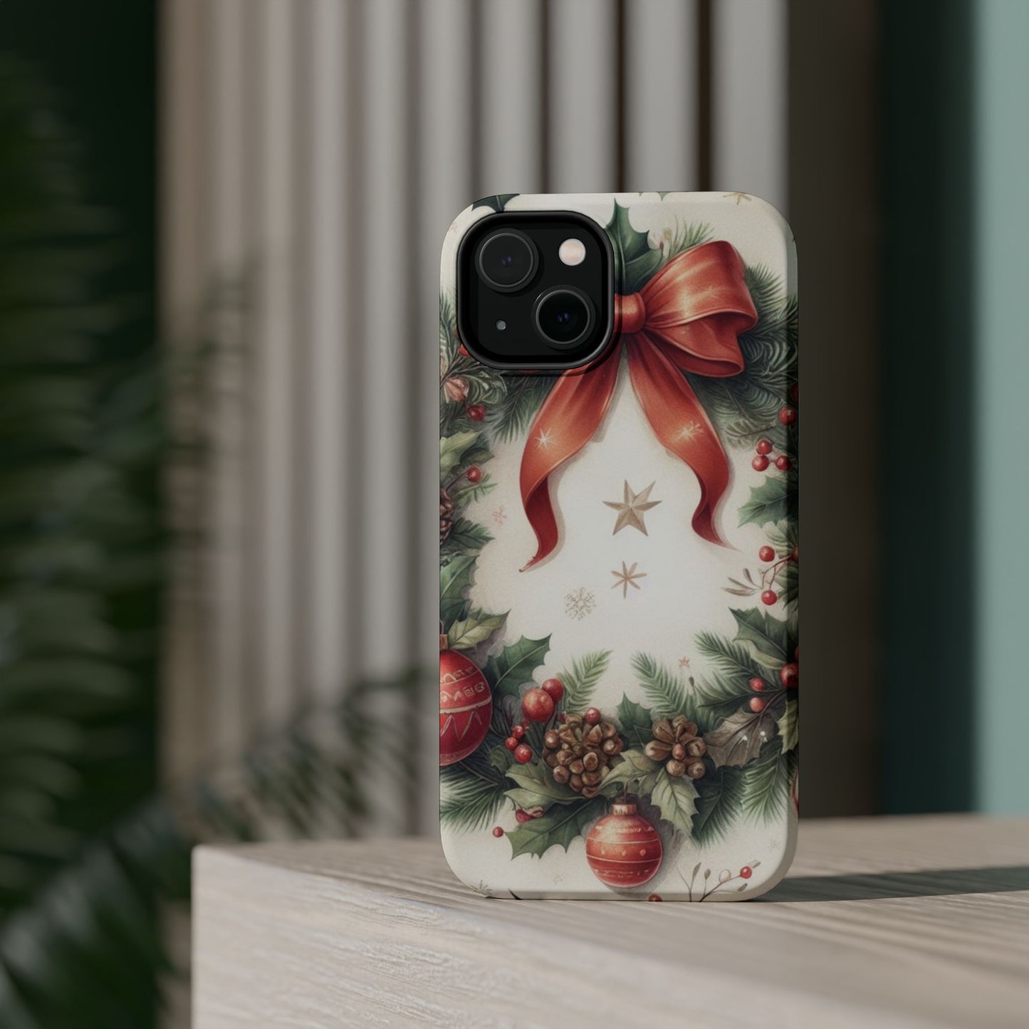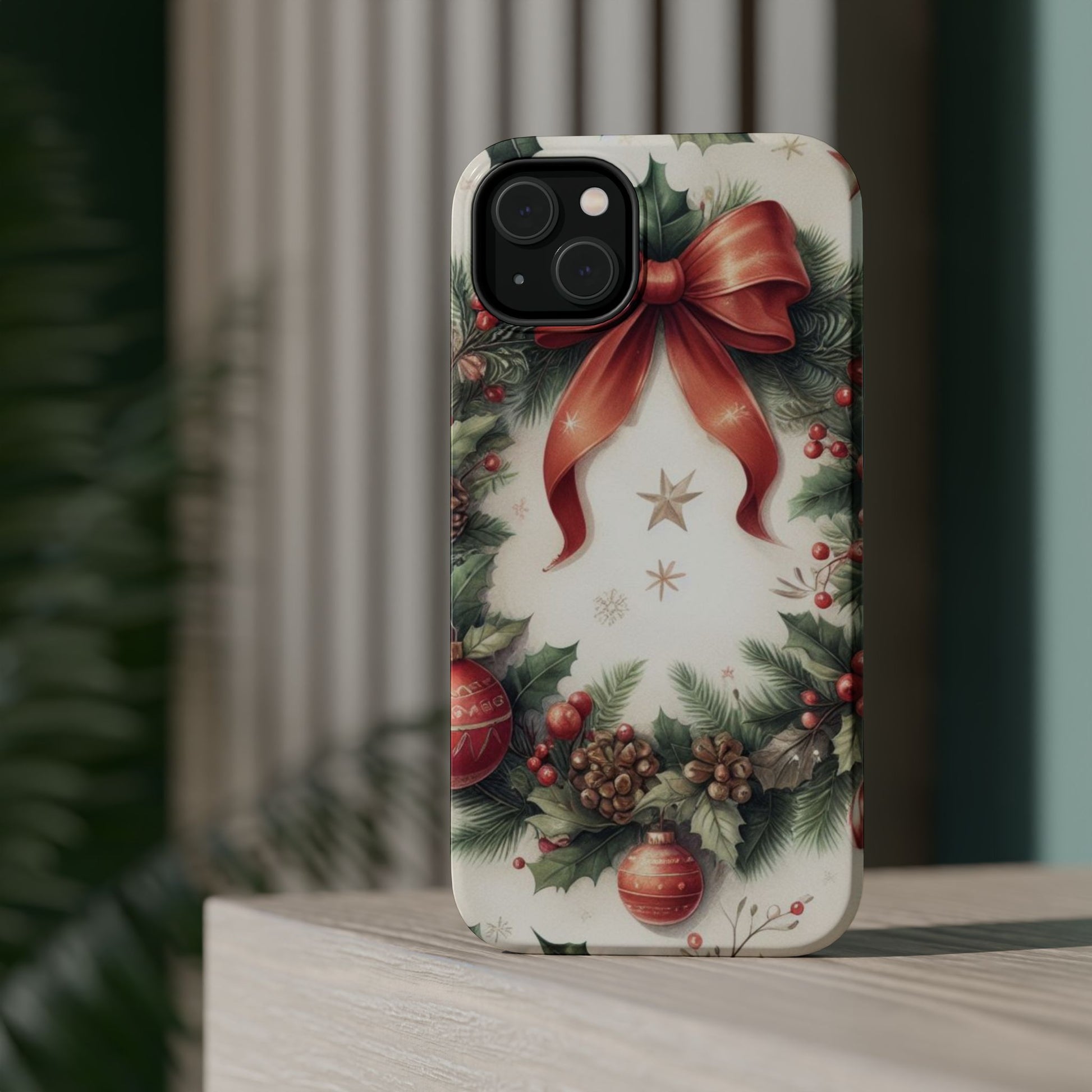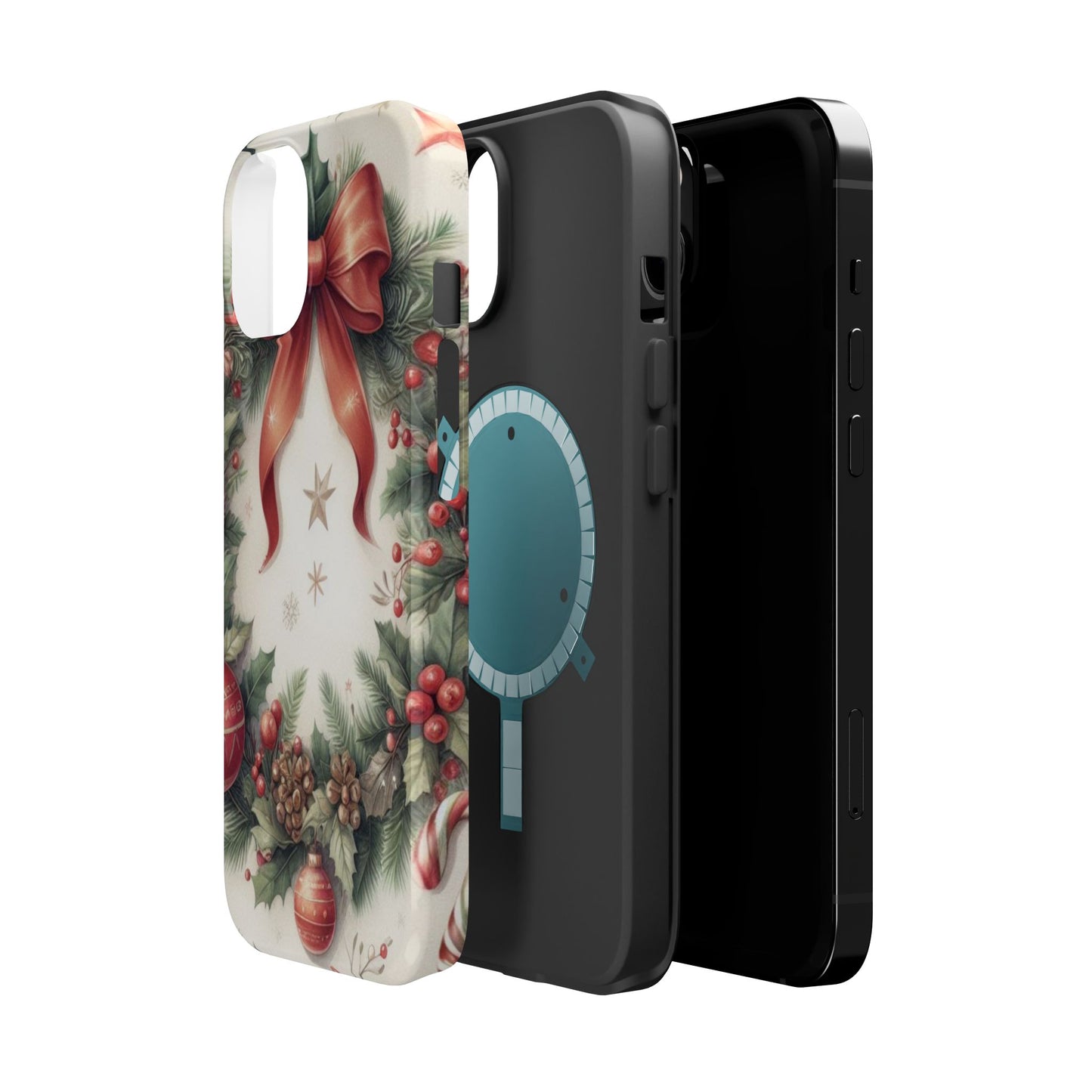 Wrap your phone in timeless holiday elegance with our Classic Christmas Wreath MagSafe  iPhone Case! Featuring a beautifully illustrated wreath adorned with red ribbons, pine cones, ornaments, holly berries, and evergreen branches, this case brings festive charm and a touch of vintage style. Perfect for getting into the holiday spirit, the intricate details and soft, warm colors make it a stunning seasonal accessory. Made from sturdy materials, it protects your phone from everyday bumps and scratches while adding a touch of Christmas cheer. Celebrate the season in style with this beautifully crafted case!