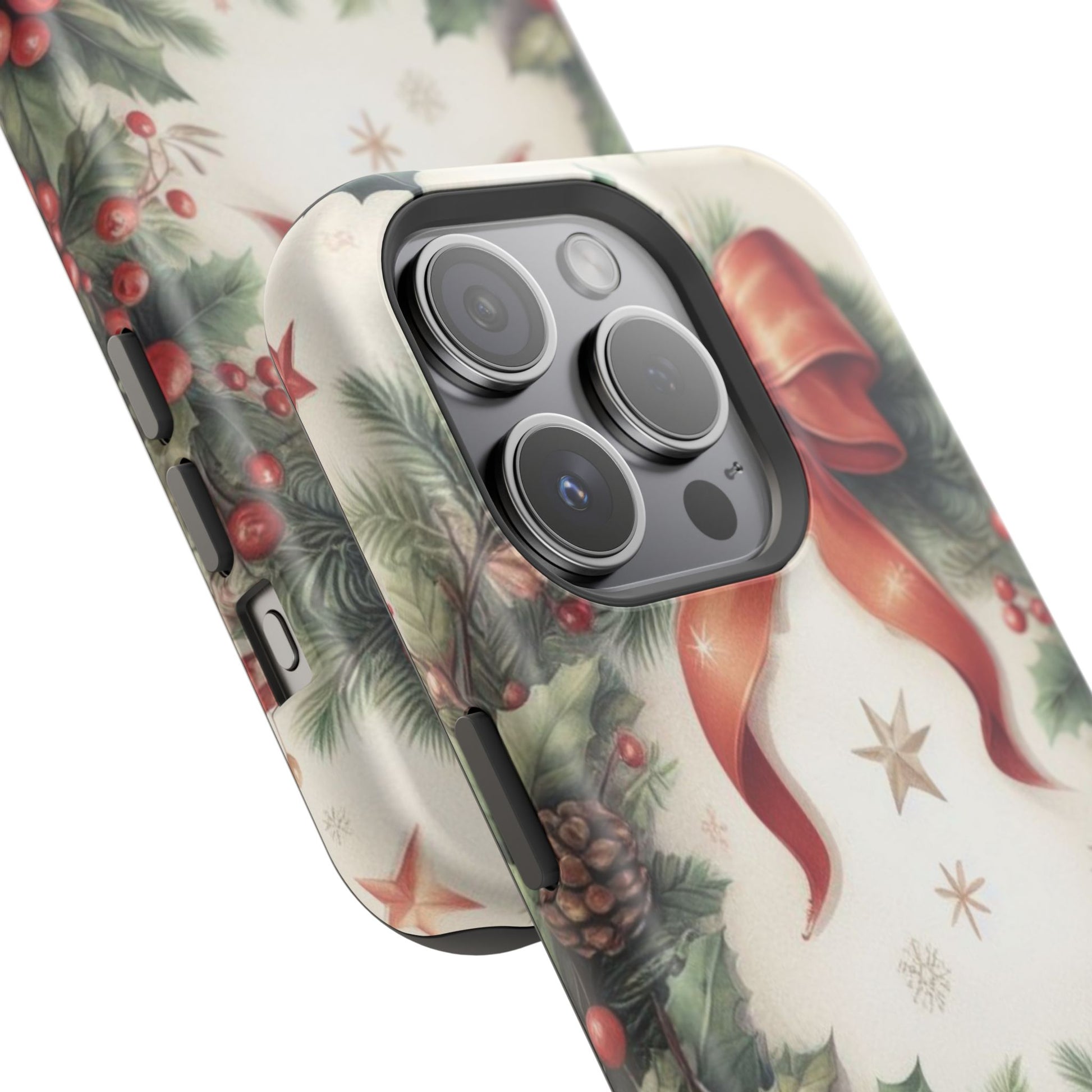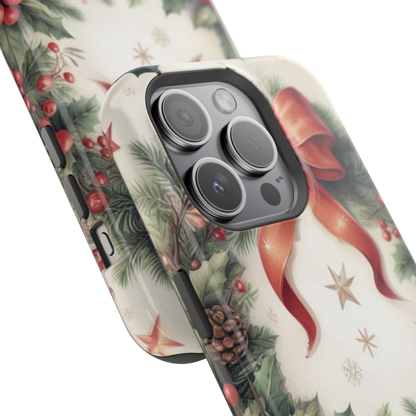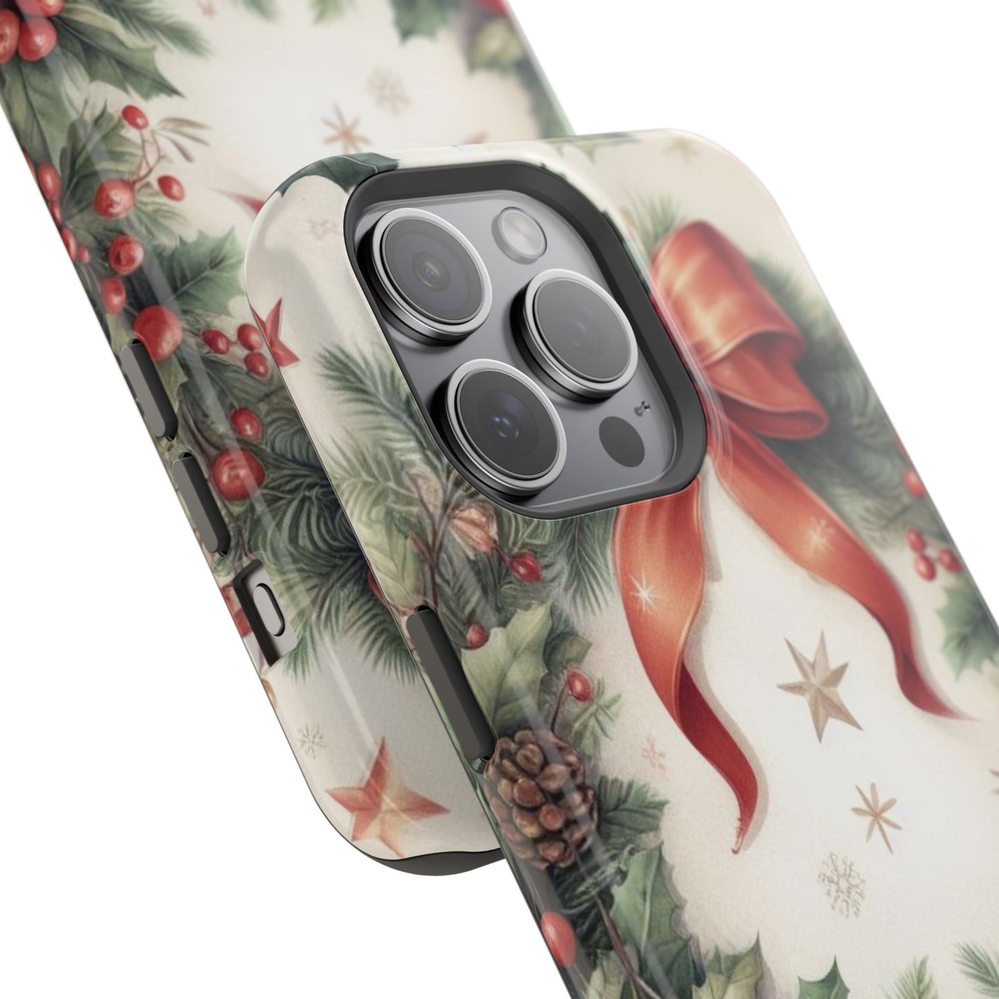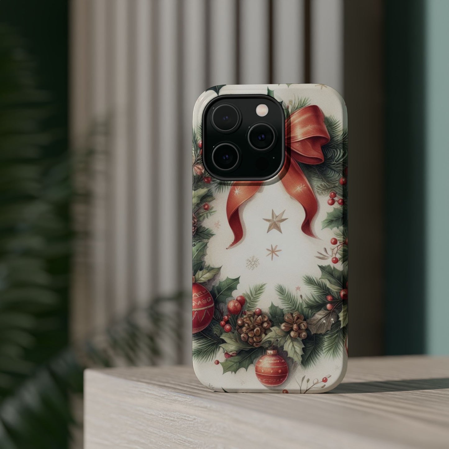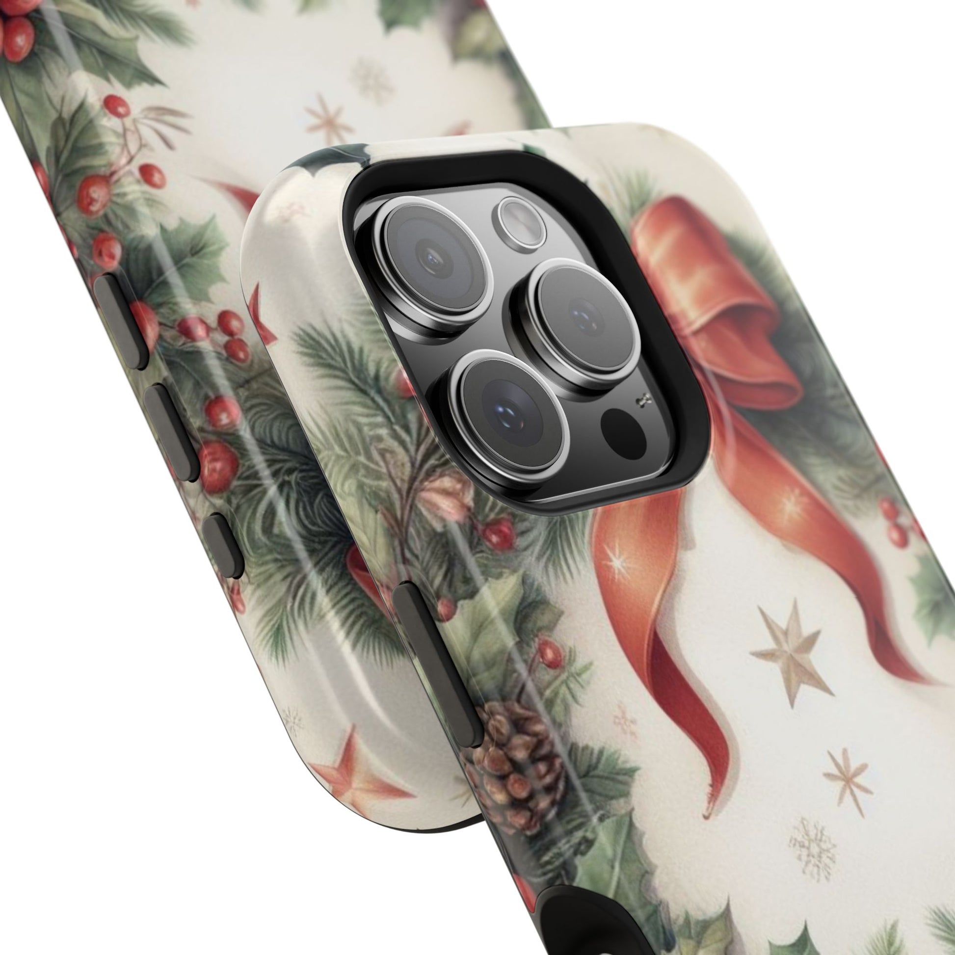 Wrap your phone in timeless holiday elegance with our Classic Christmas Wreath MagSafe  iPhone Case! Featuring a beautifully illustrated wreath adorned with red ribbons, pine cones, ornaments, holly berries, and evergreen branches, this case brings festive charm and a touch of vintage style. Perfect for getting into the holiday spirit, the intricate details and soft, warm colors make it a stunning seasonal accessory. Made from sturdy materials, it protects your phone from everyday bumps and scratches while adding a touch of Christmas cheer. Celebrate the season in style with this beautifully crafted case!