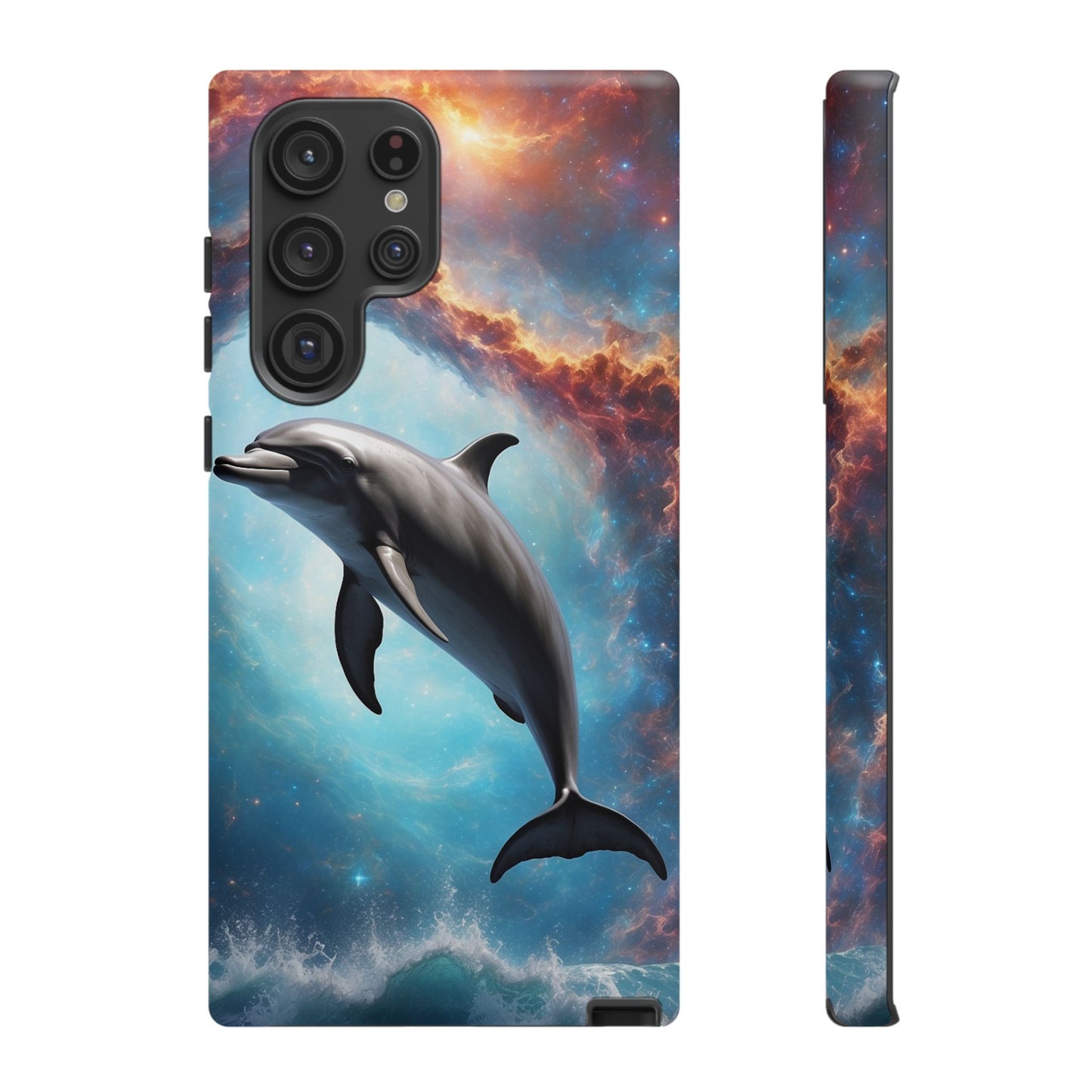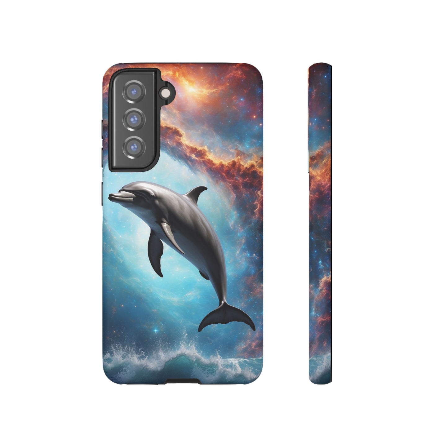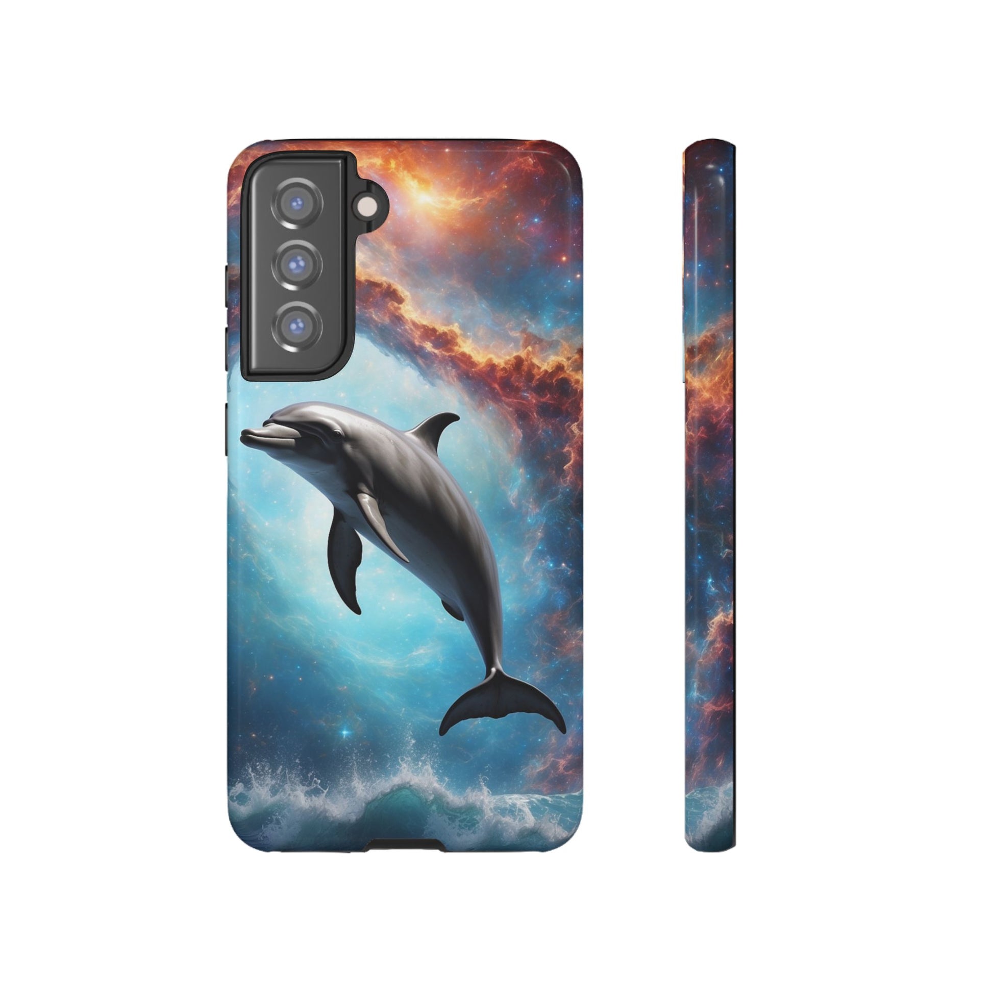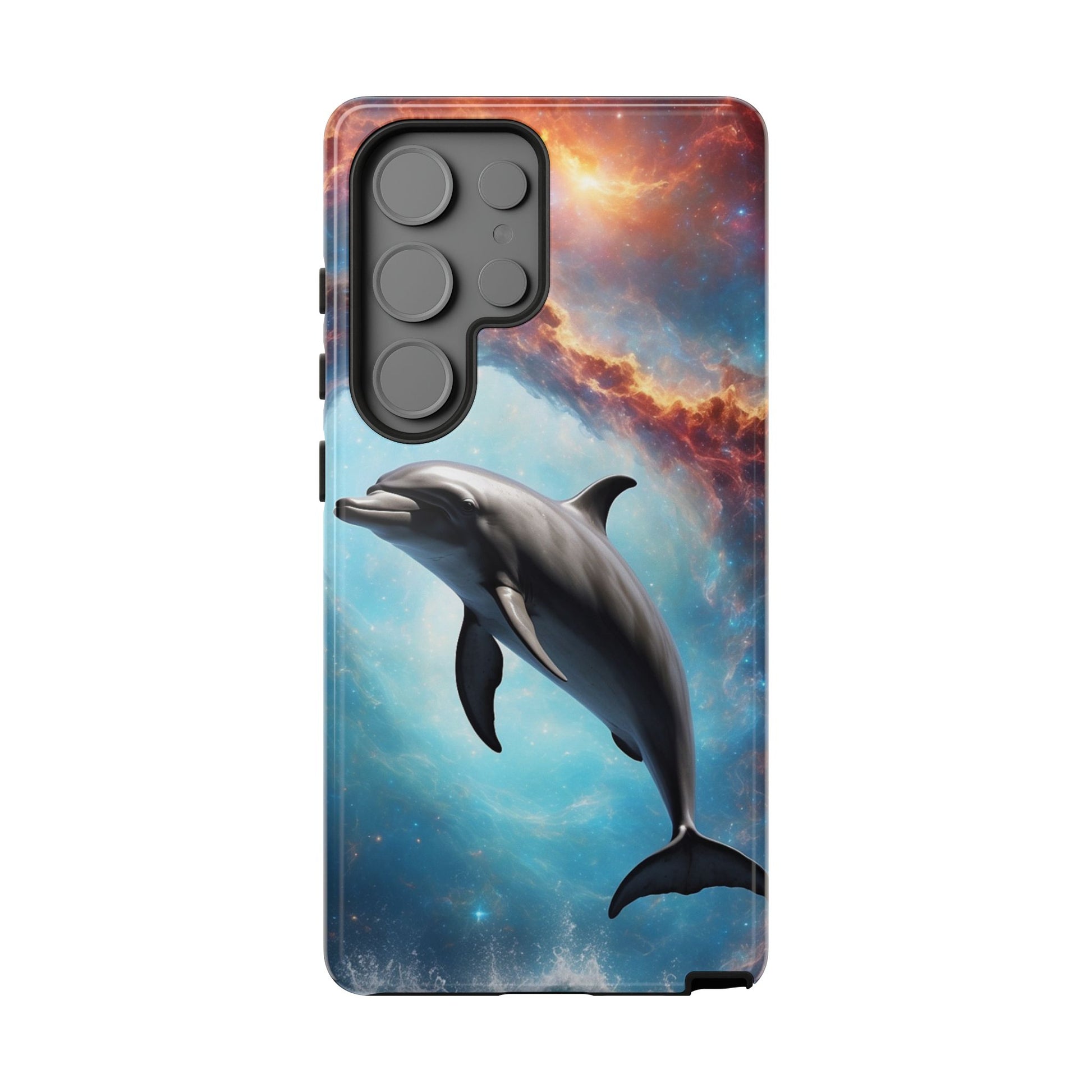 Take your Samsung Galaxy to new heights with the Cosmic Dolphin Space Vibes Case! Featuring a breathtaking design of a dolphin soaring through a galaxy of brilliant purples, fiery oranges, and cosmic blues, this case combines artistic flair with ultimate device protection. Crafted for durabili...