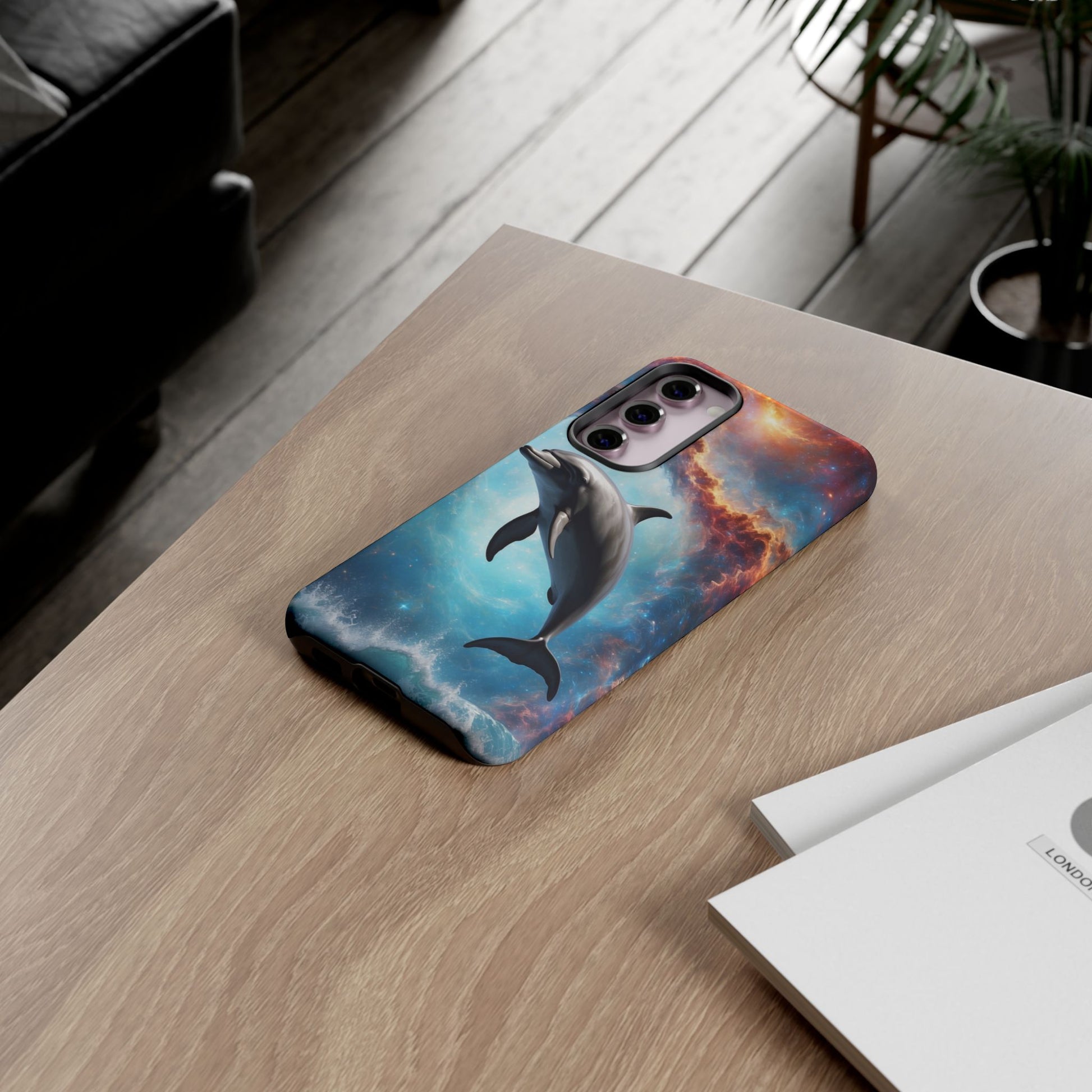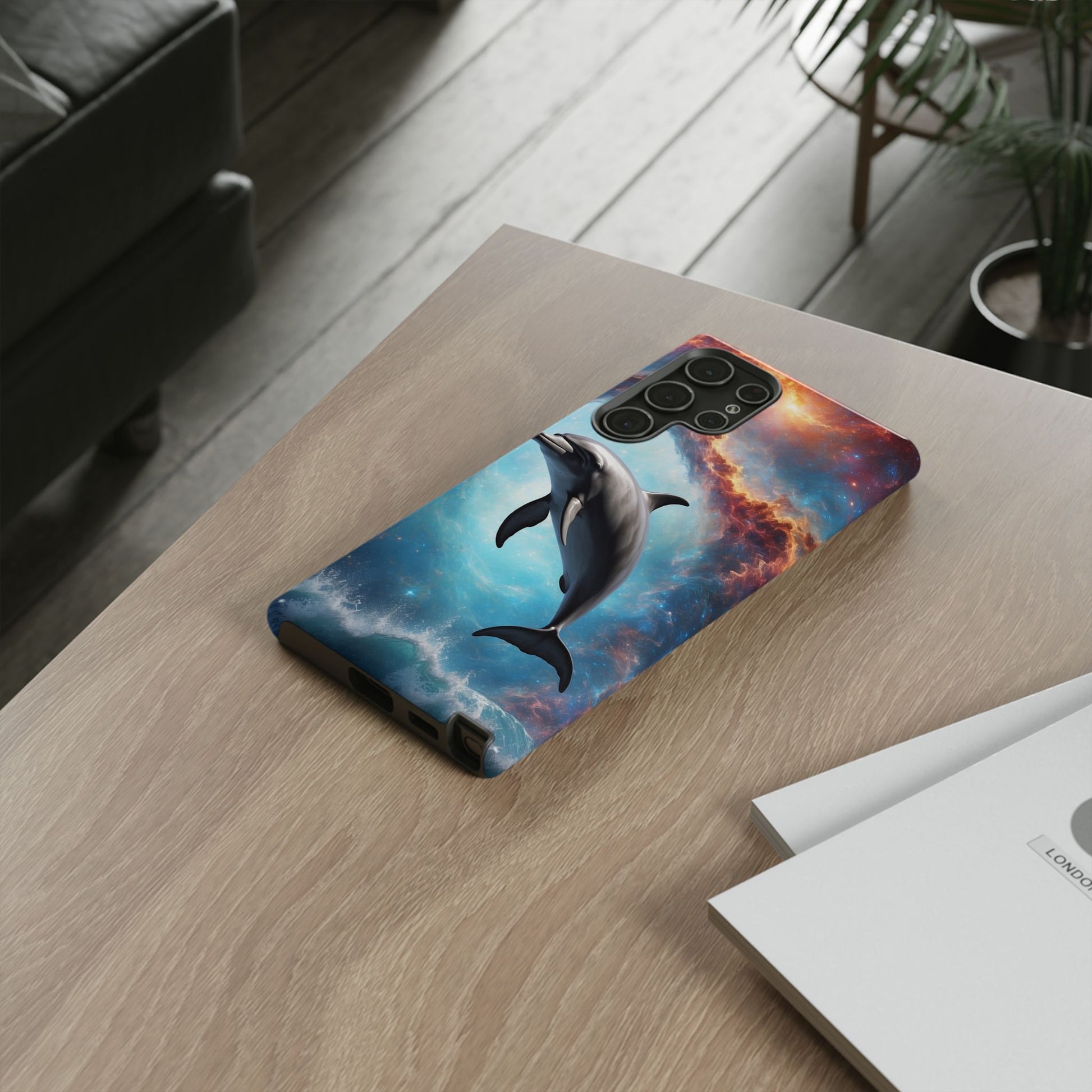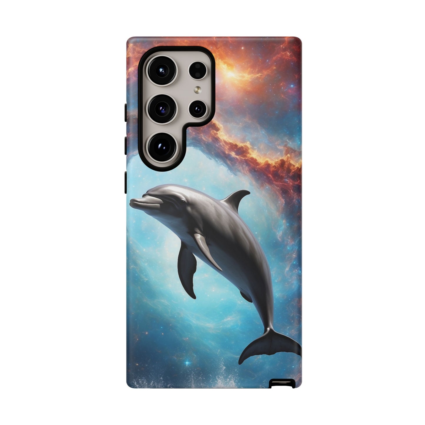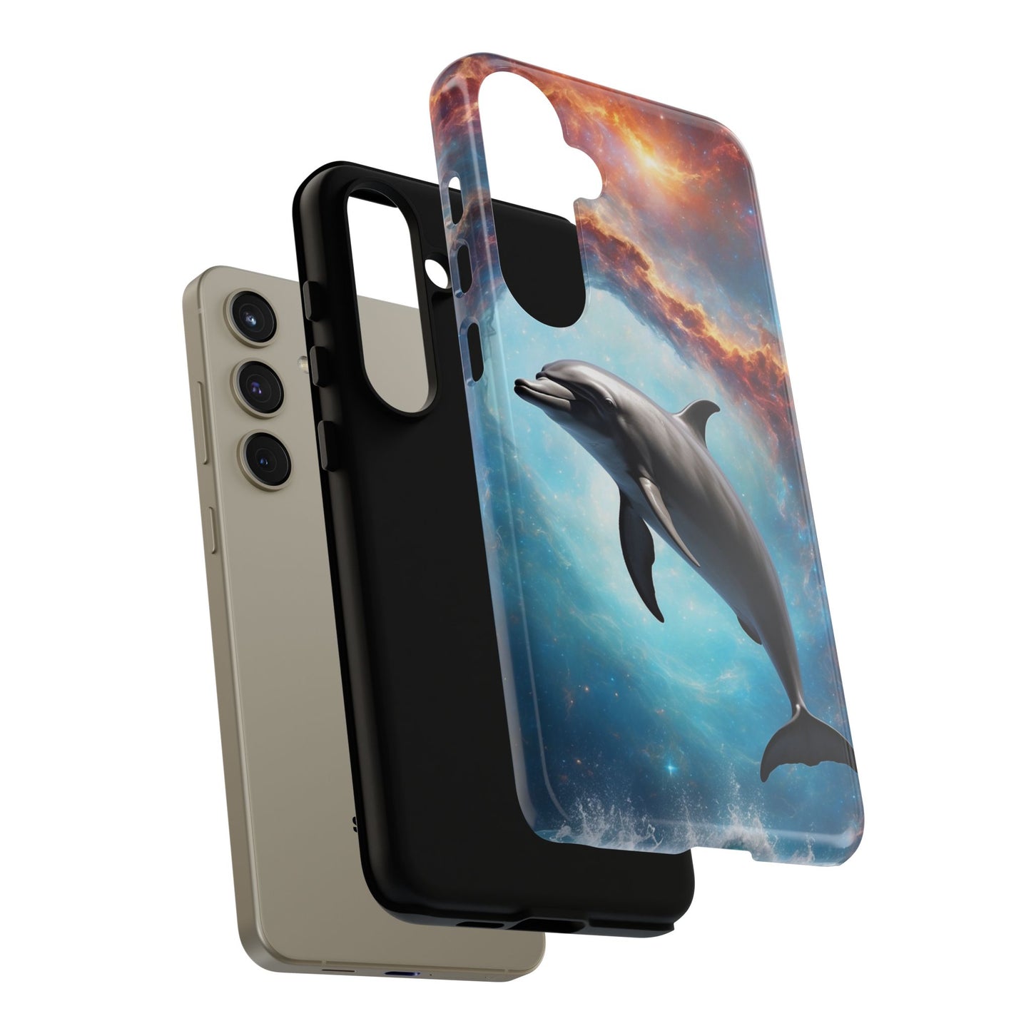 Take your Samsung Galaxy to new heights with the Cosmic Dolphin Space Vibes Case! Featuring a breathtaking design of a dolphin soaring through a galaxy of brilliant purples, fiery oranges, and cosmic blues, this case combines artistic flair with ultimate device protection. Crafted for durability and style, it guards your phone against everyday drops and scratches while adding a unique, celestial touch to your device.