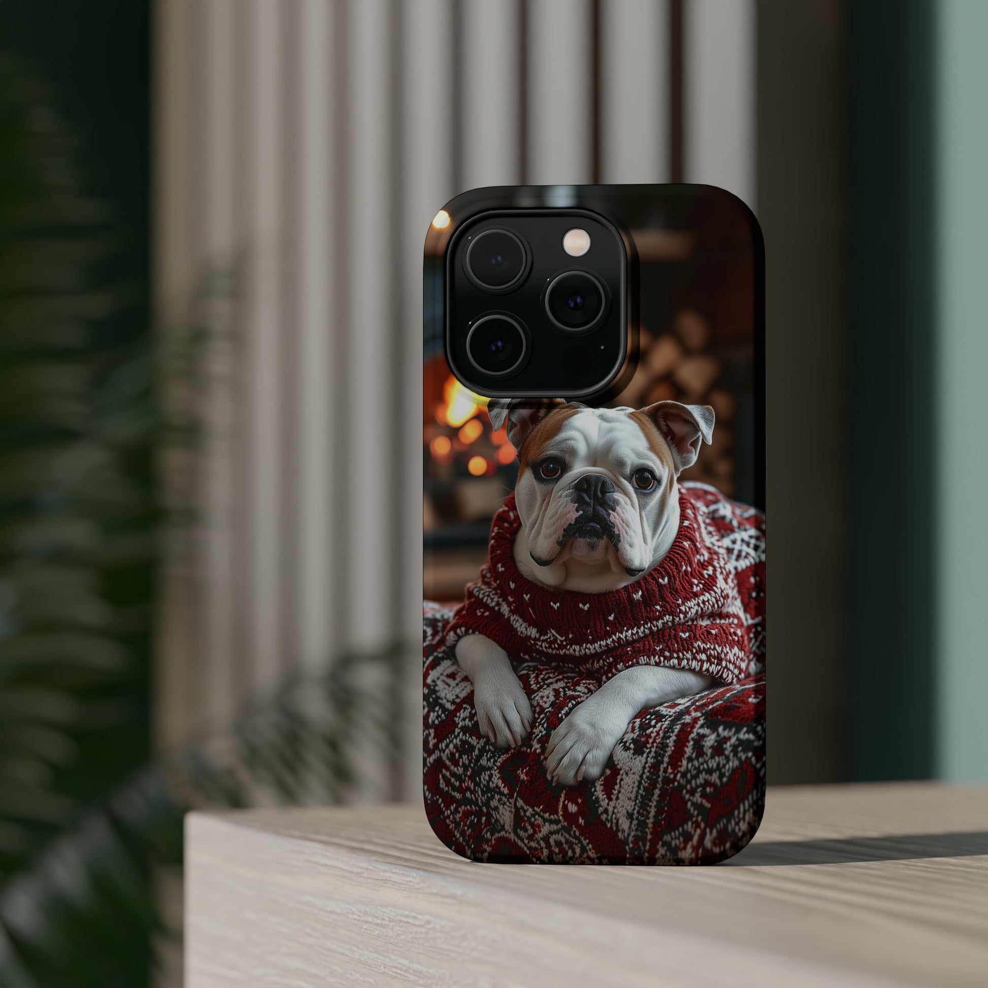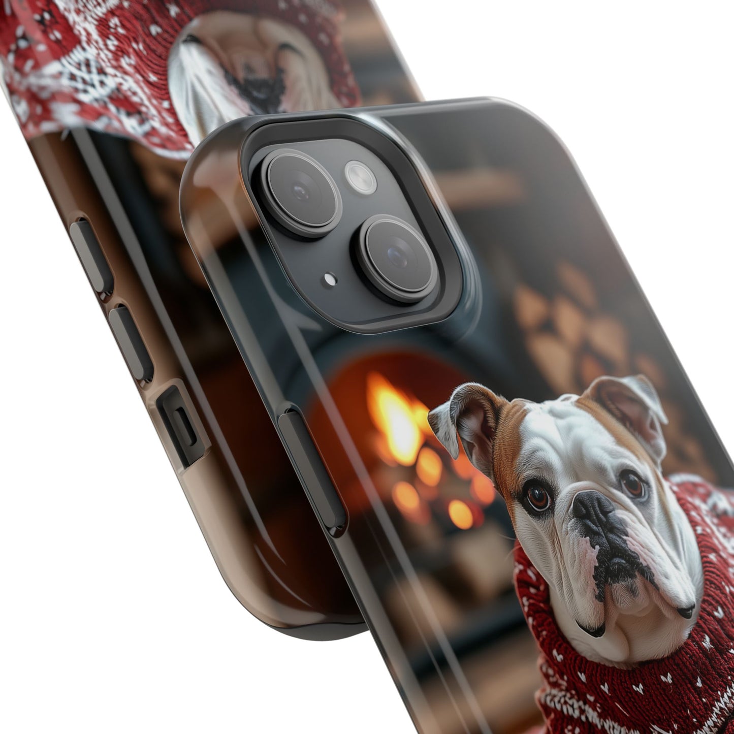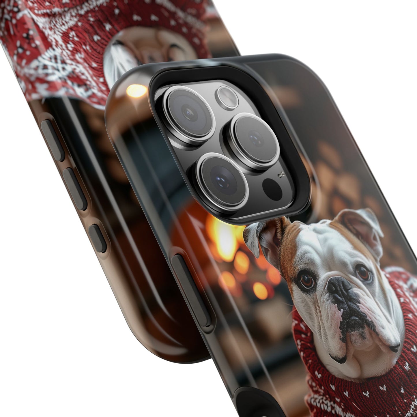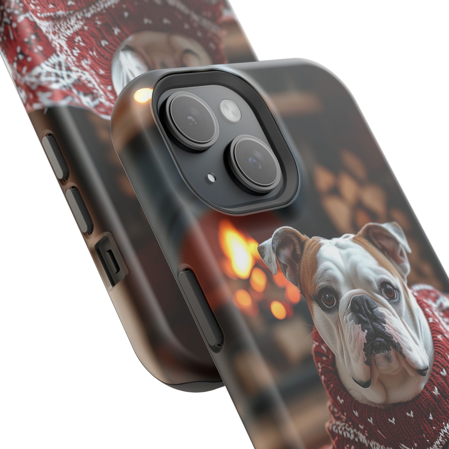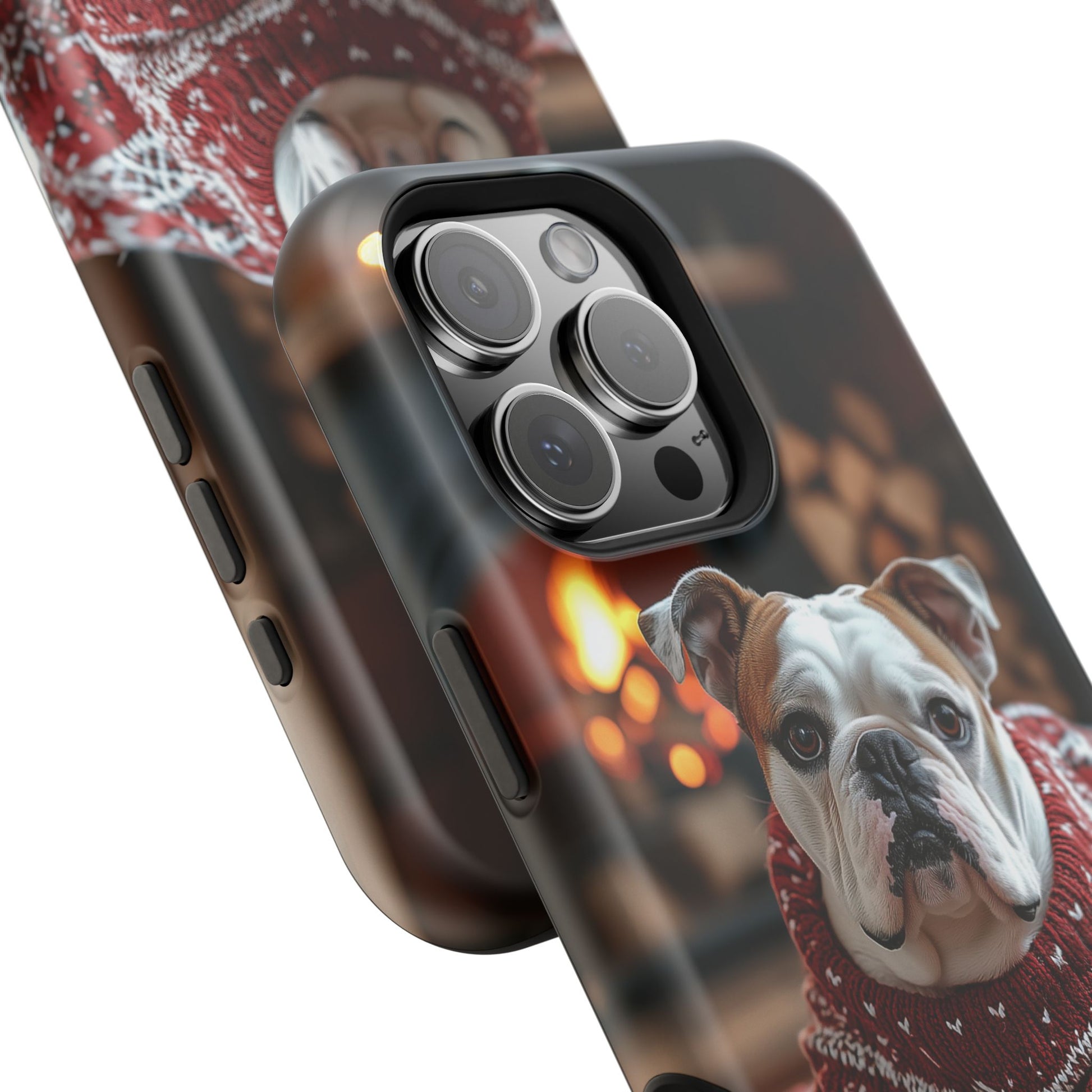 Cozy Bulldog in Sweater MagSafe iPhone Case – Festive Fireplace Protective Cover