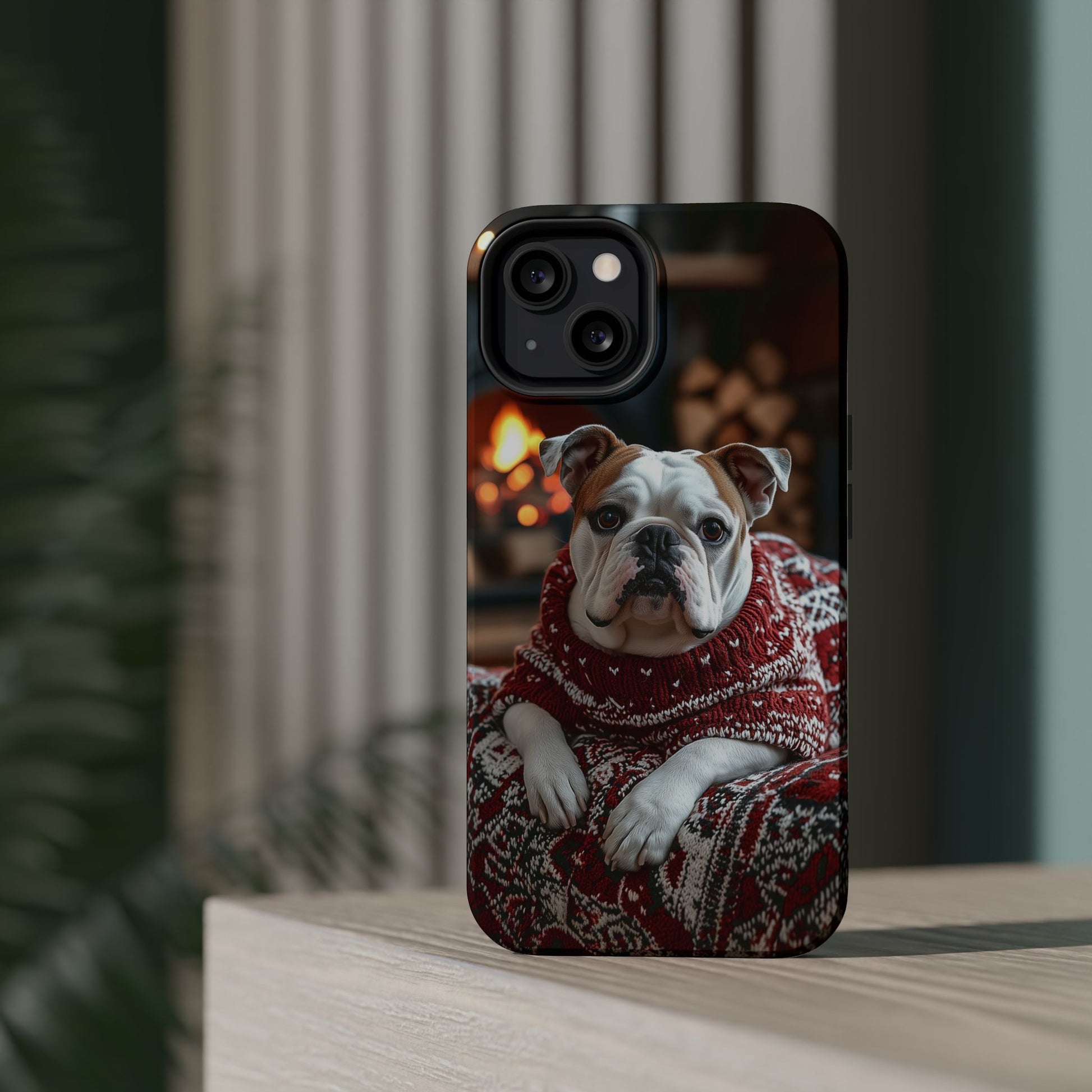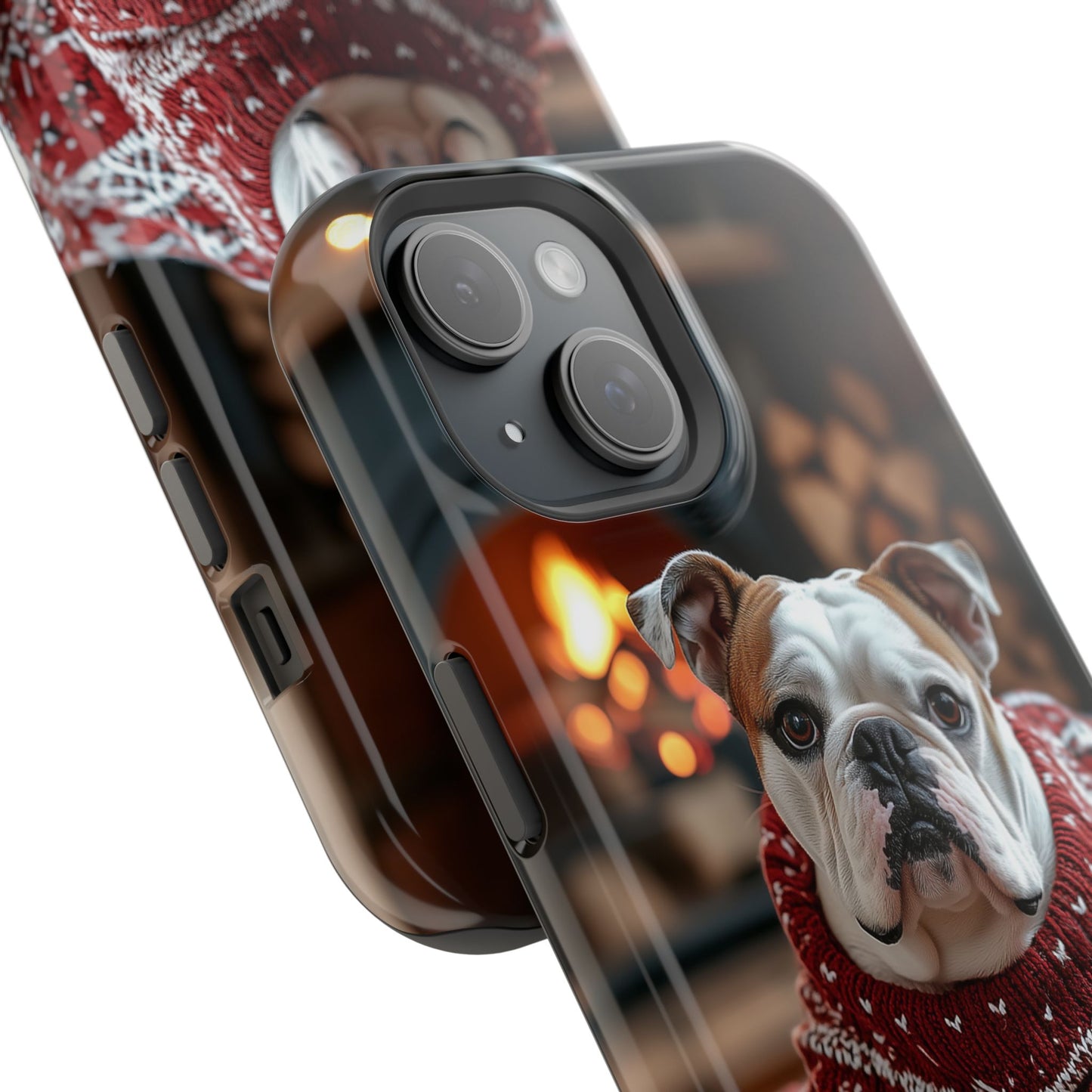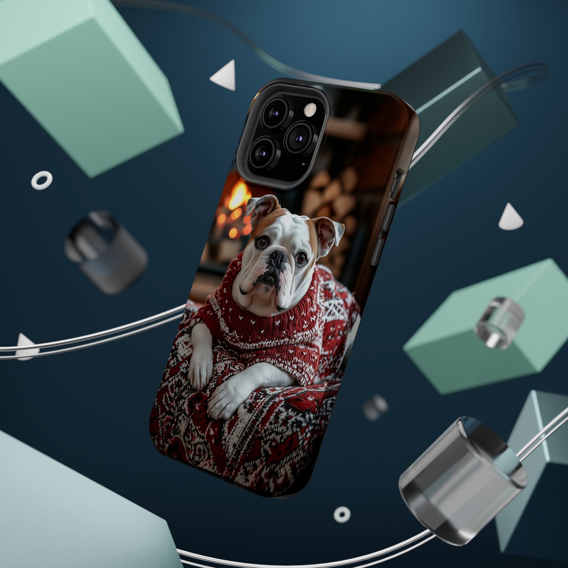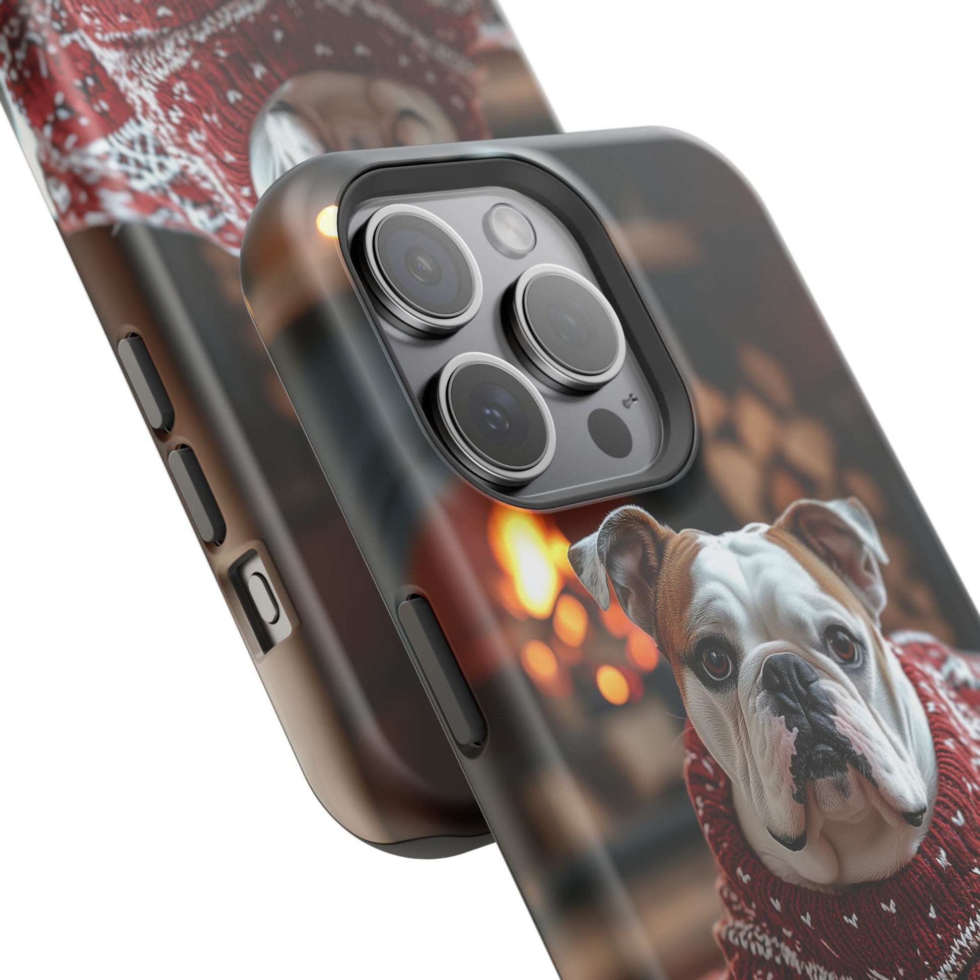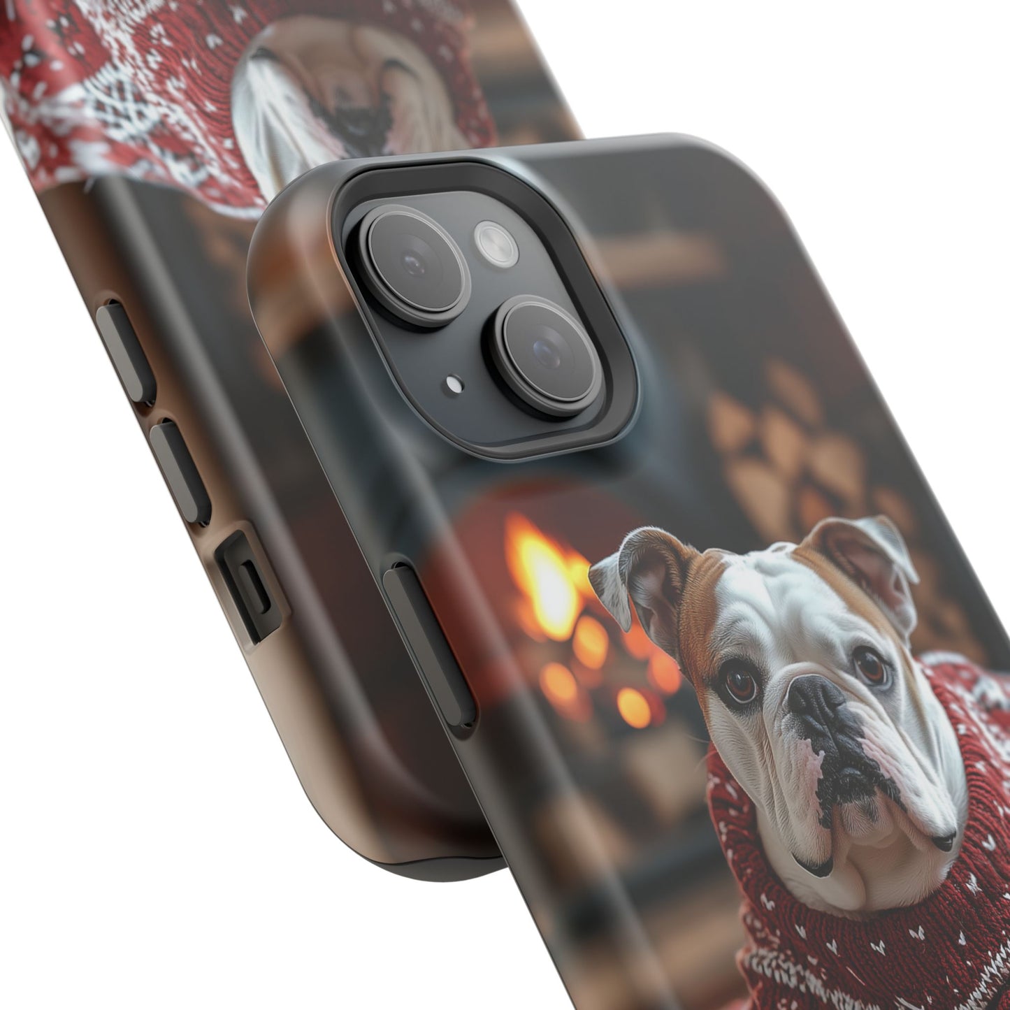 Cozy Bulldog in Sweater MagSafe iPhone Case – Festive Fireplace Protective Cover