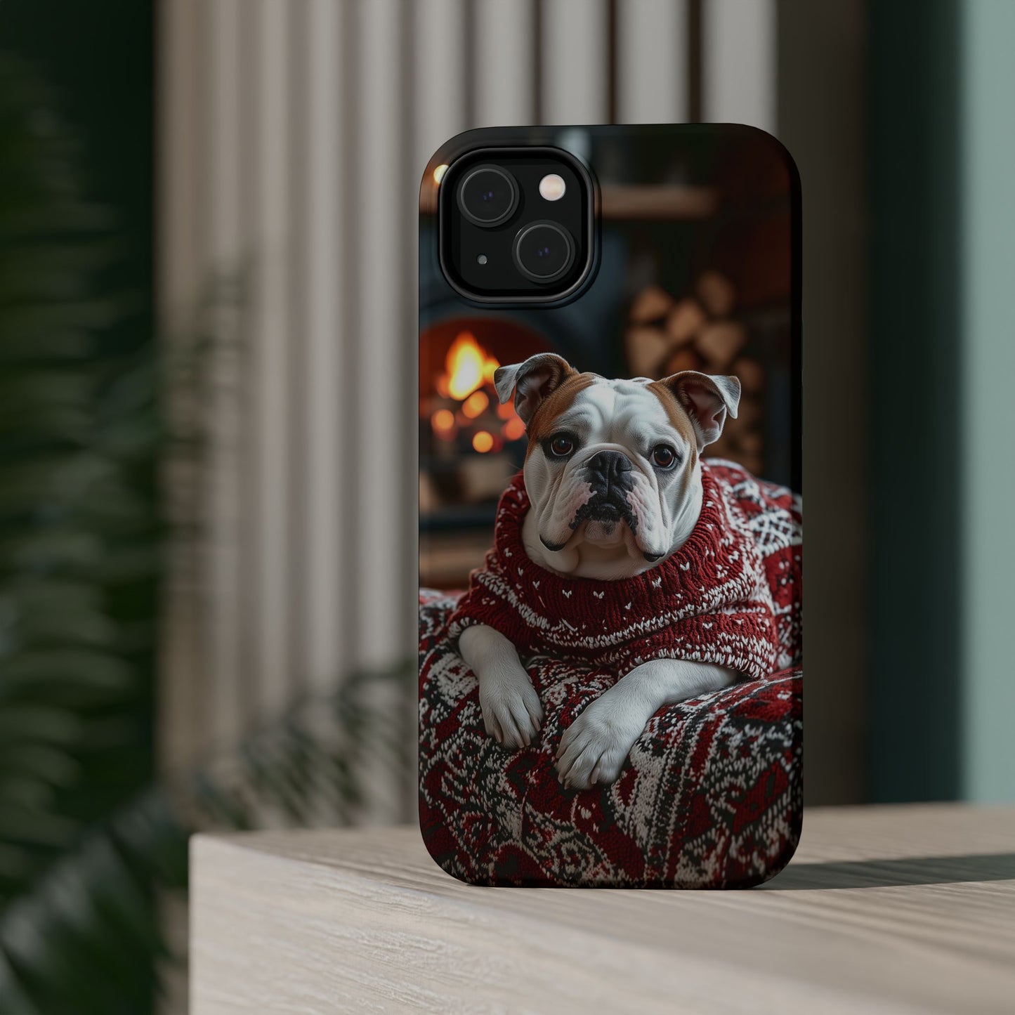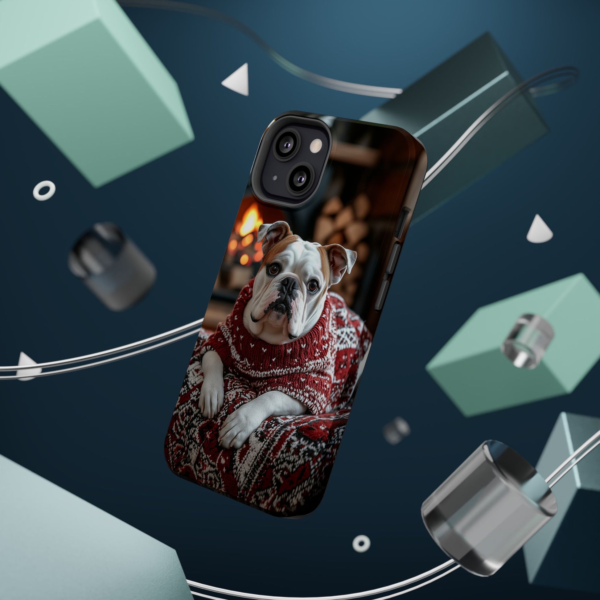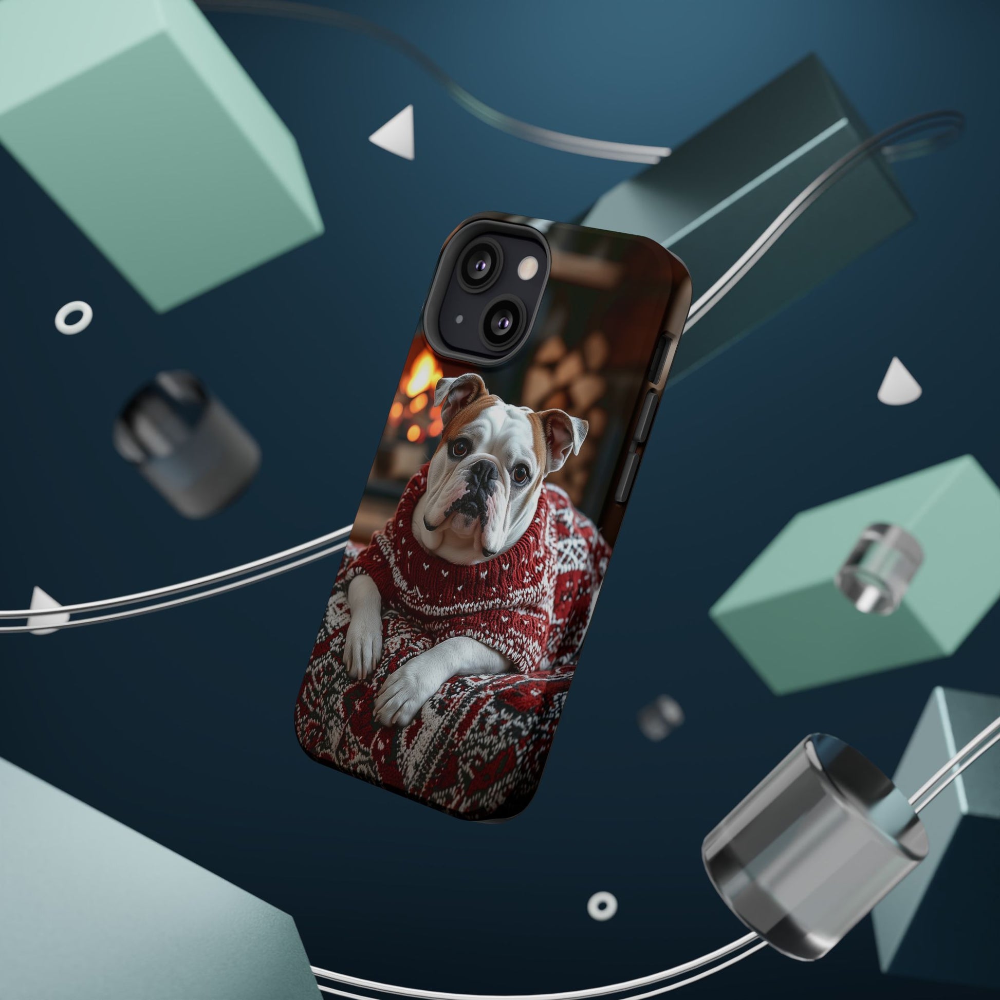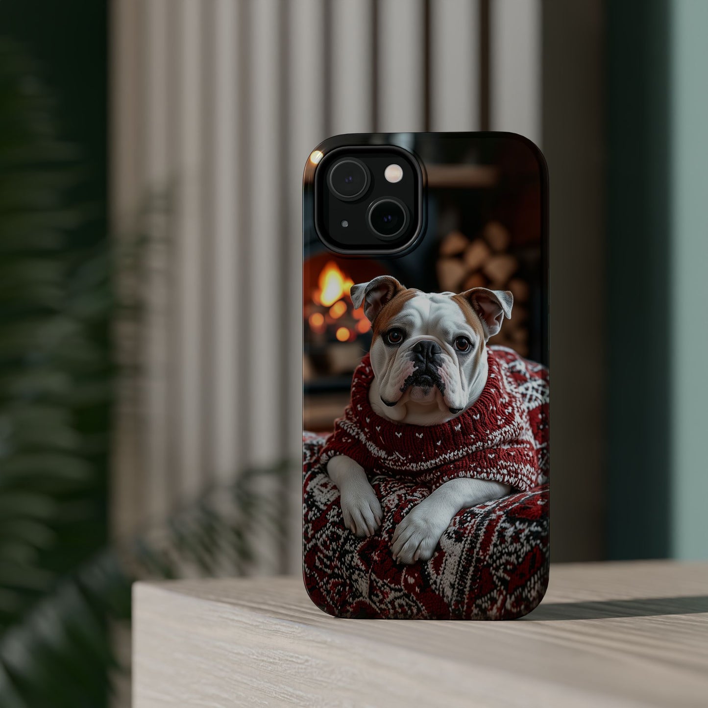 Cozy Bulldog in Sweater MagSafe iPhone Case – Festive Fireplace Protective Cover
