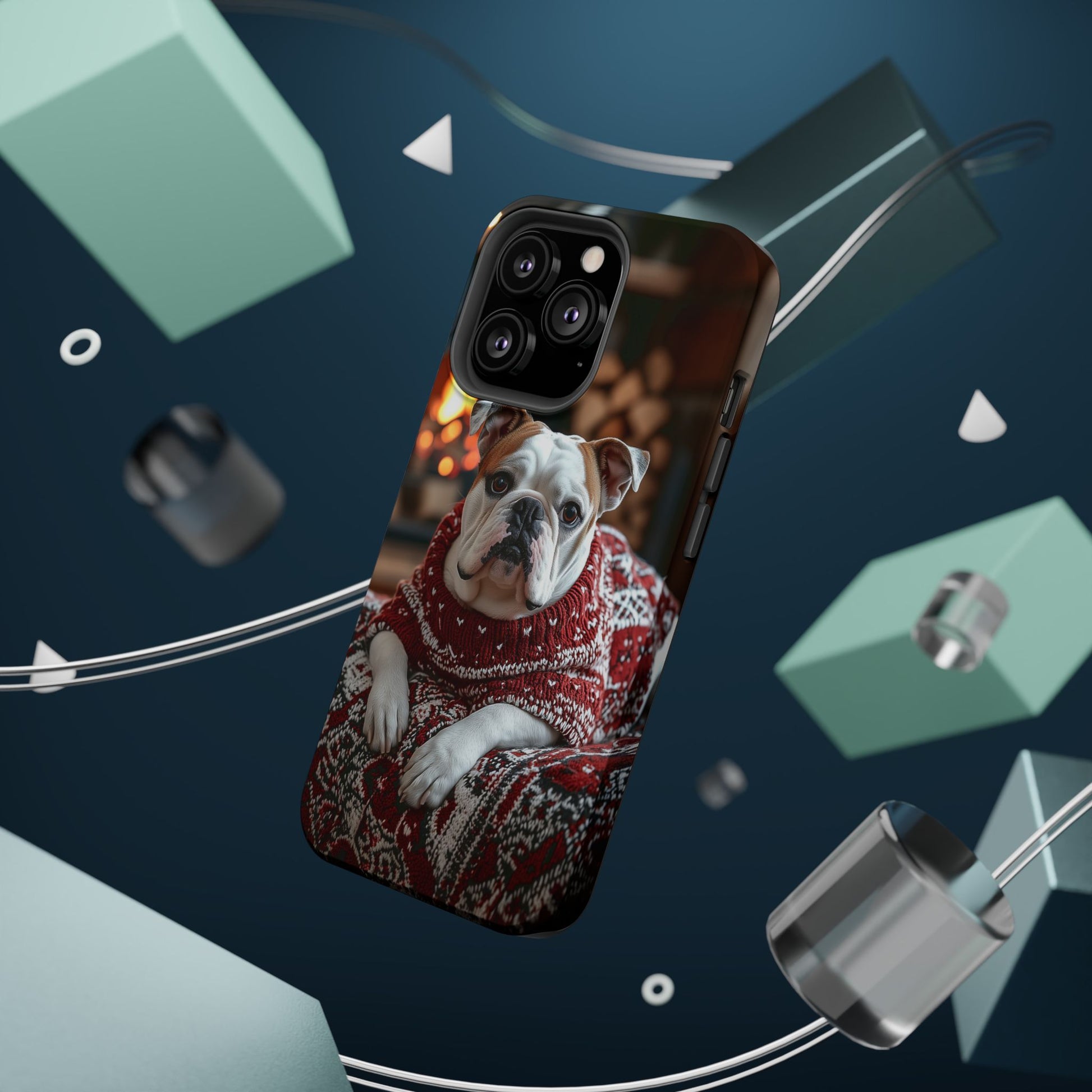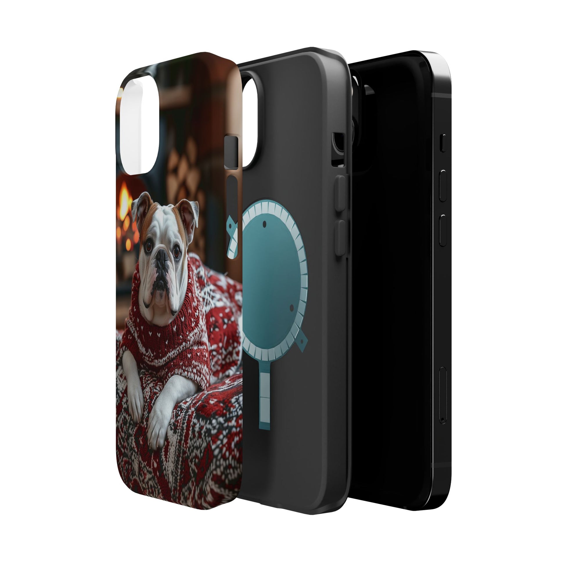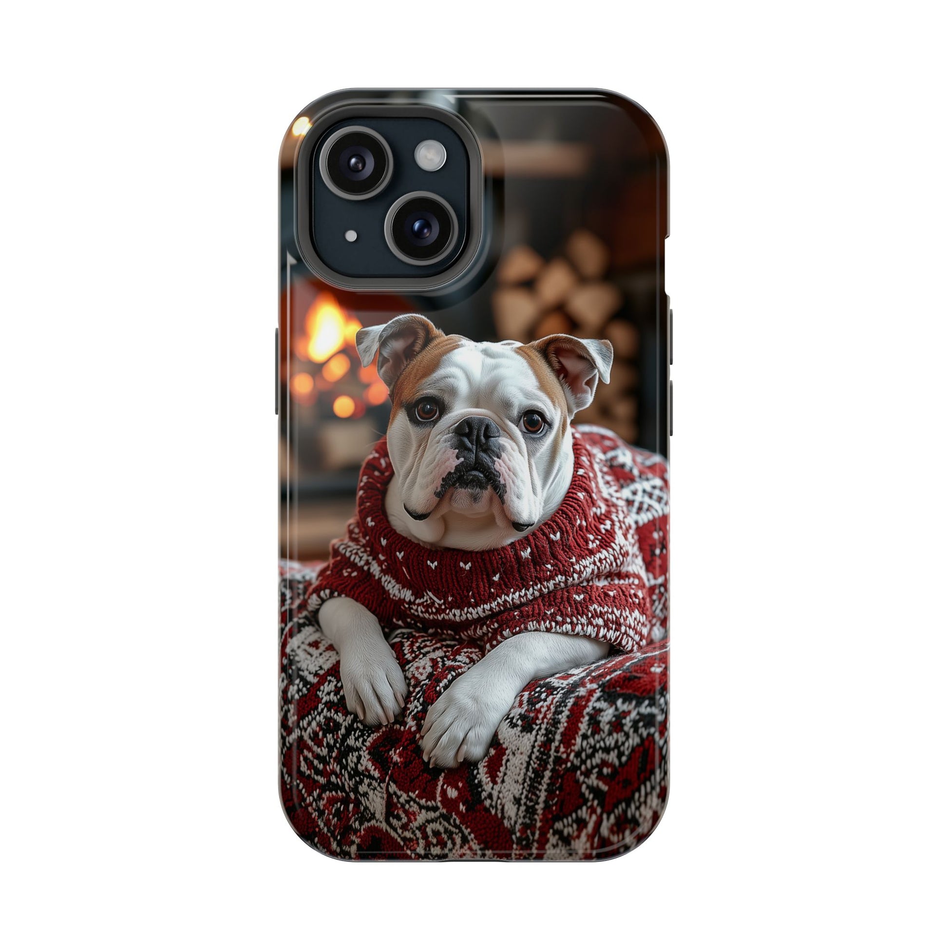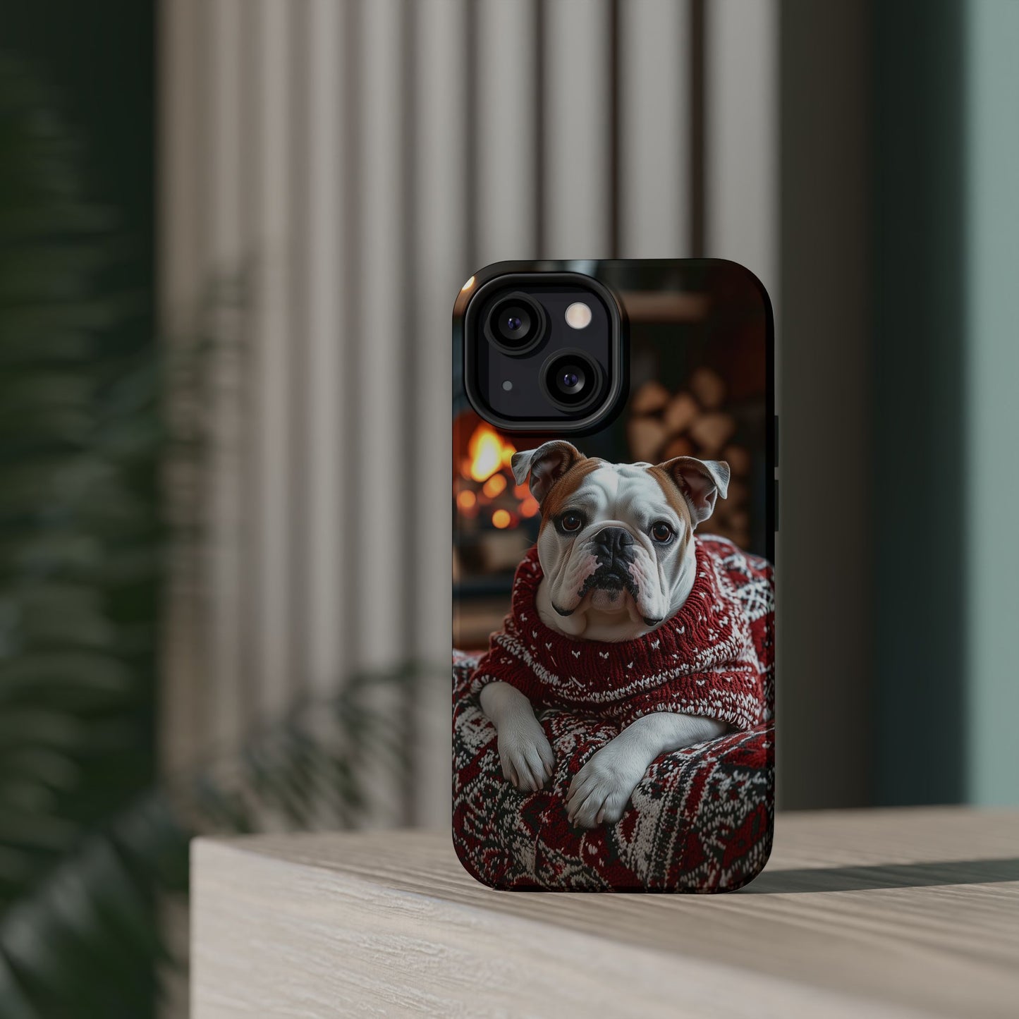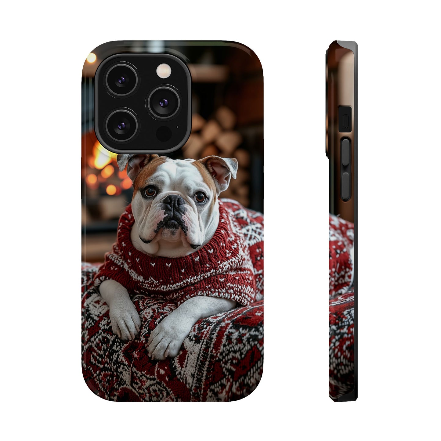 Cozy Bulldog in Sweater MagSafe iPhone Case – Festive Fireplace Protective Cover