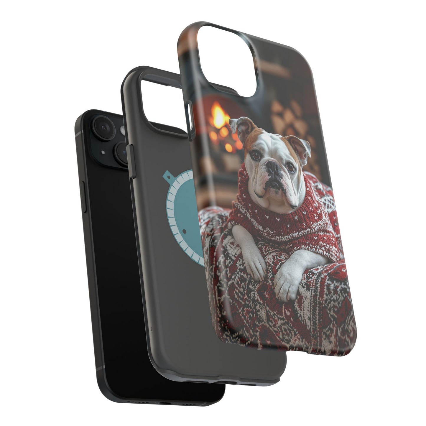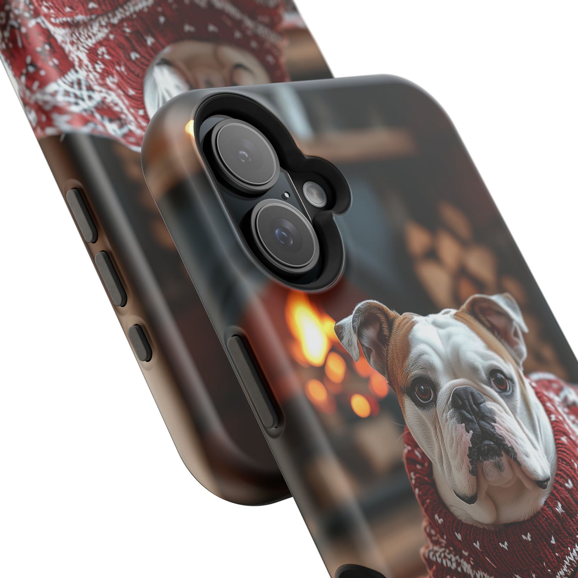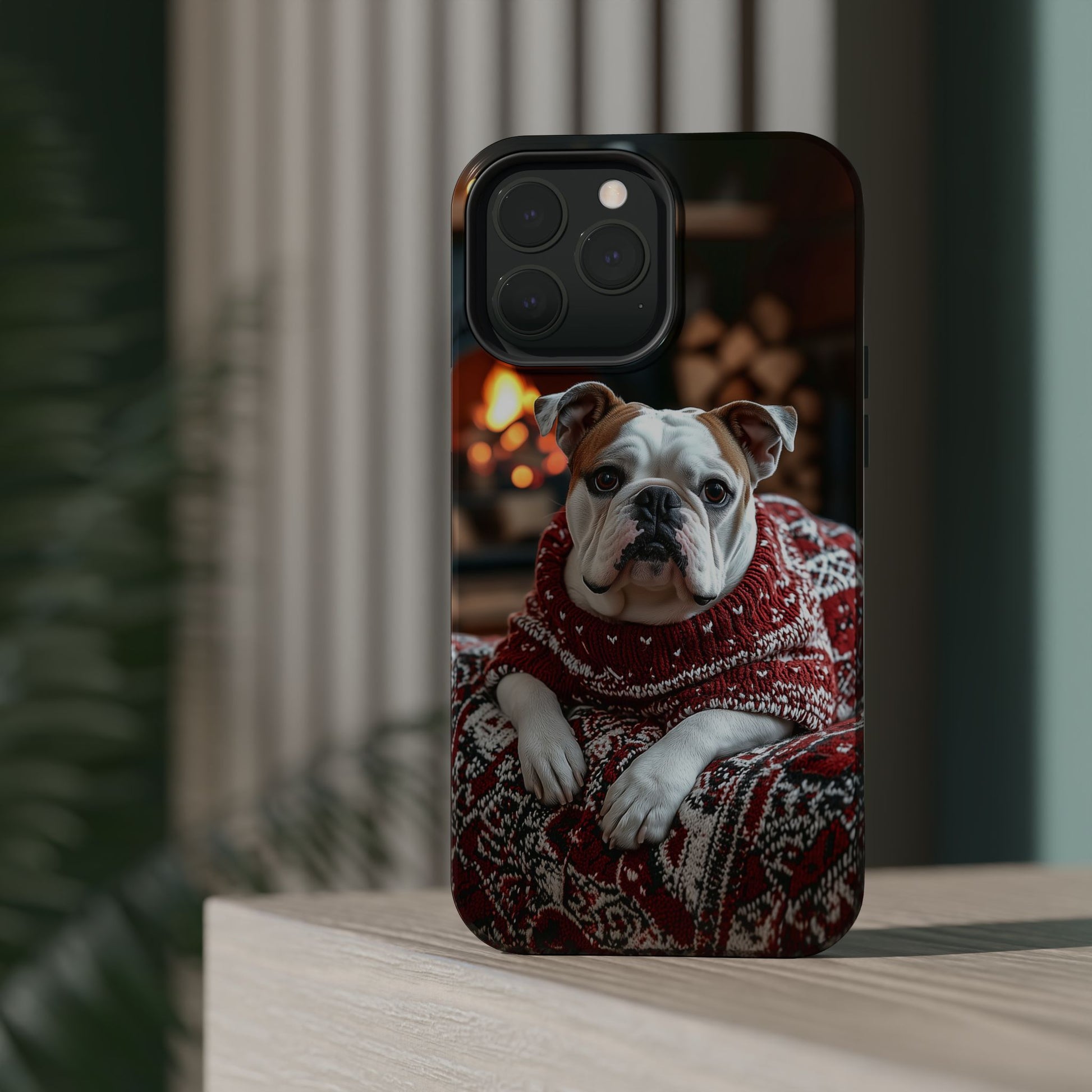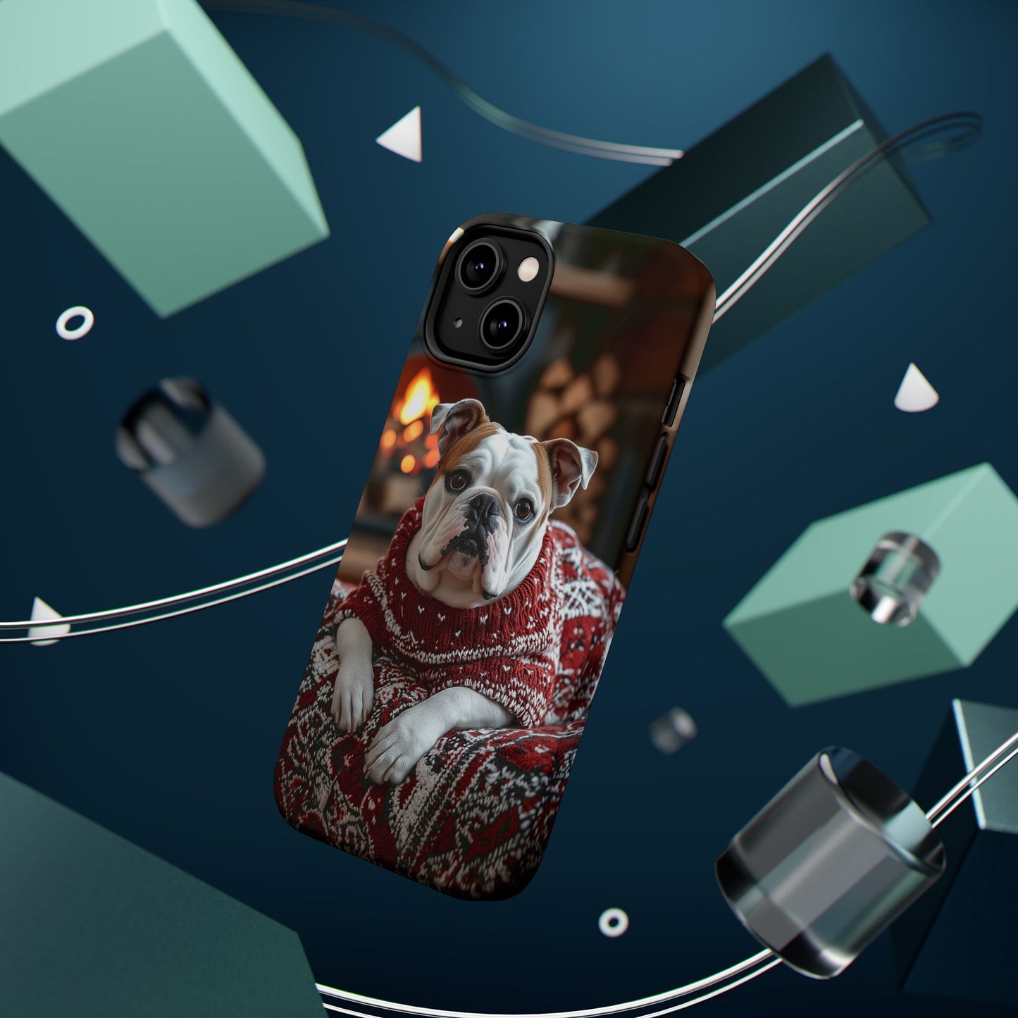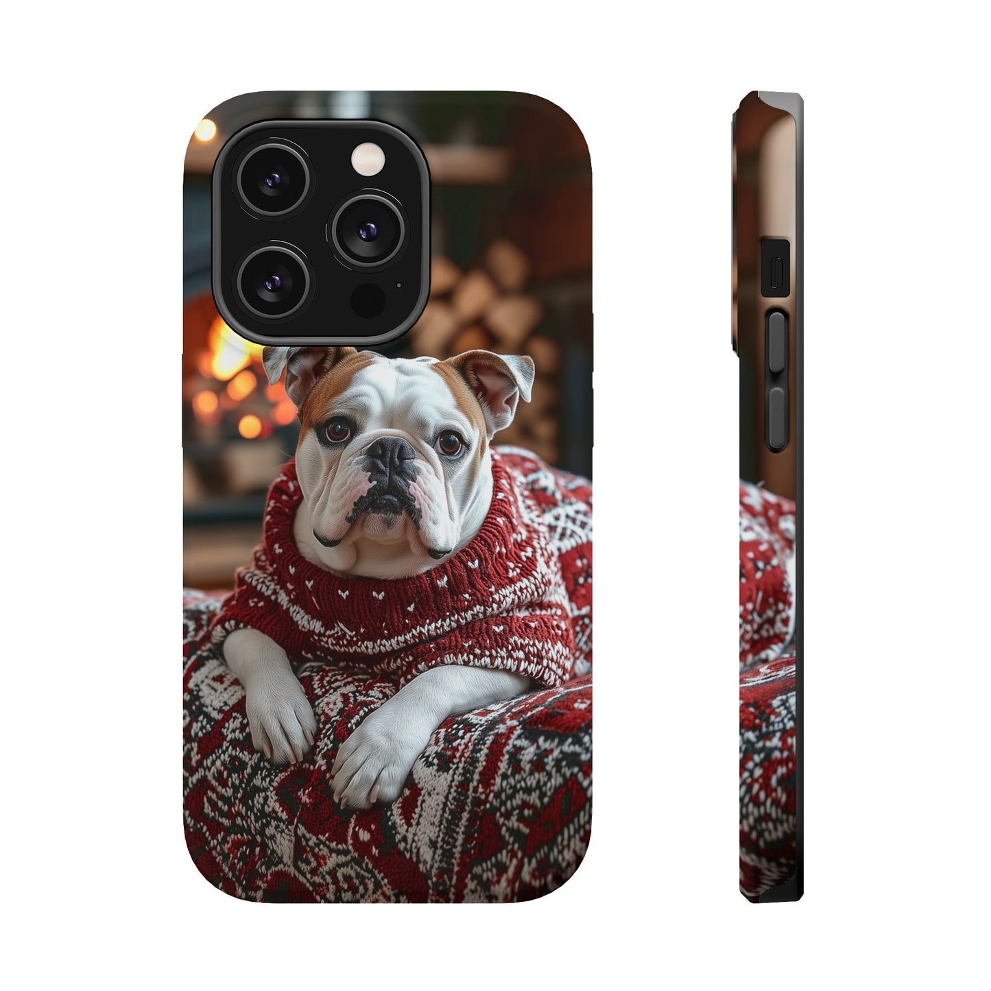 Cozy Bulldog in Sweater MagSafe iPhone Case – Festive Fireplace Protective Cover