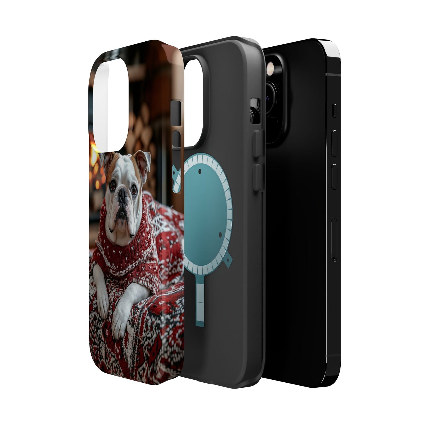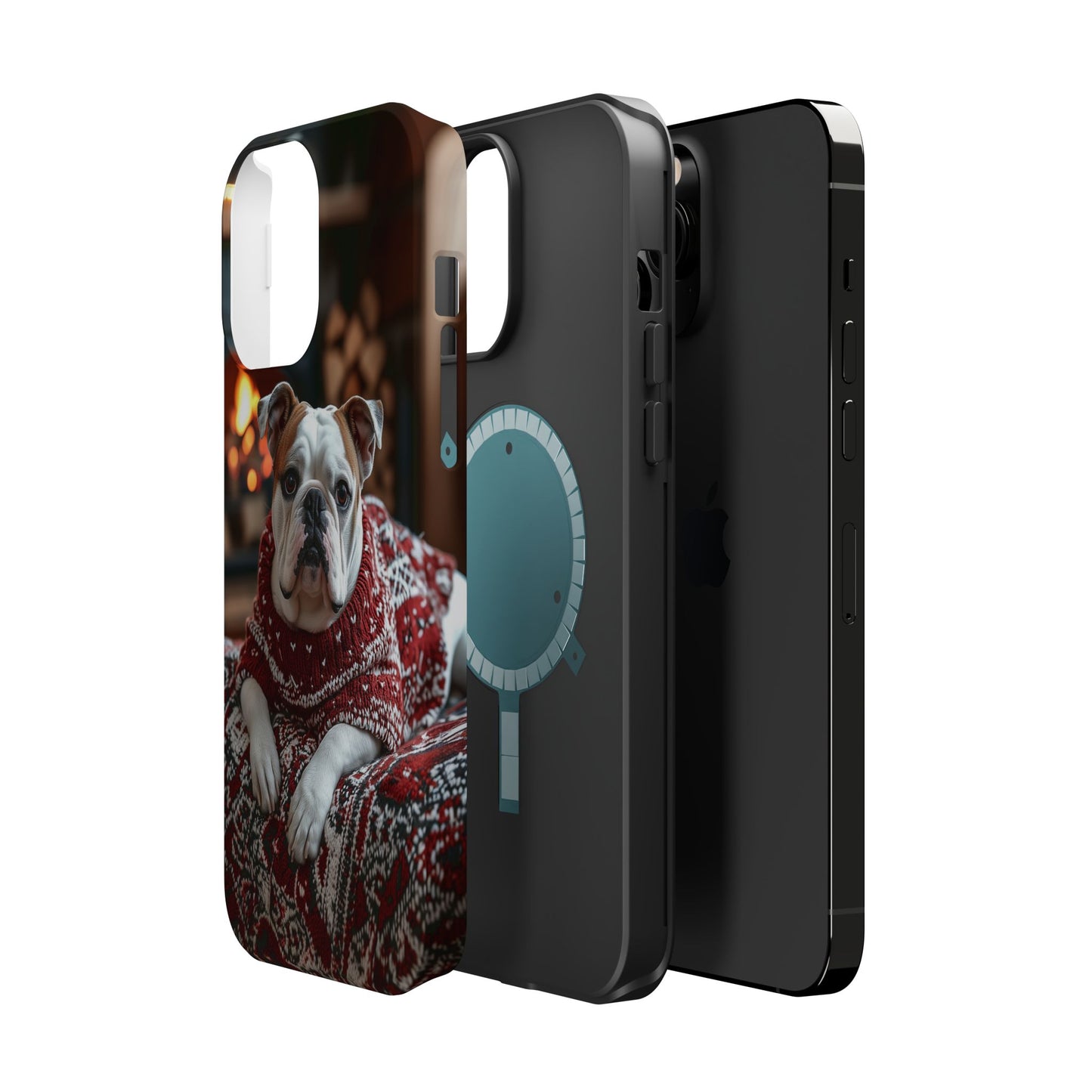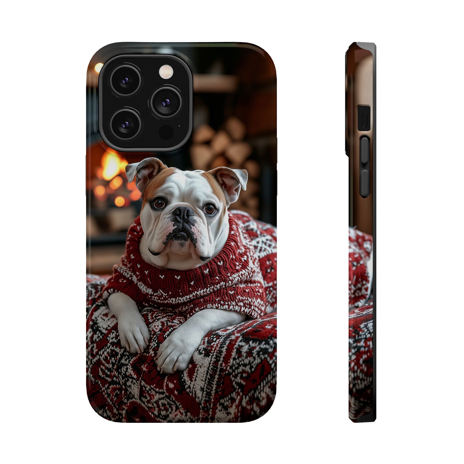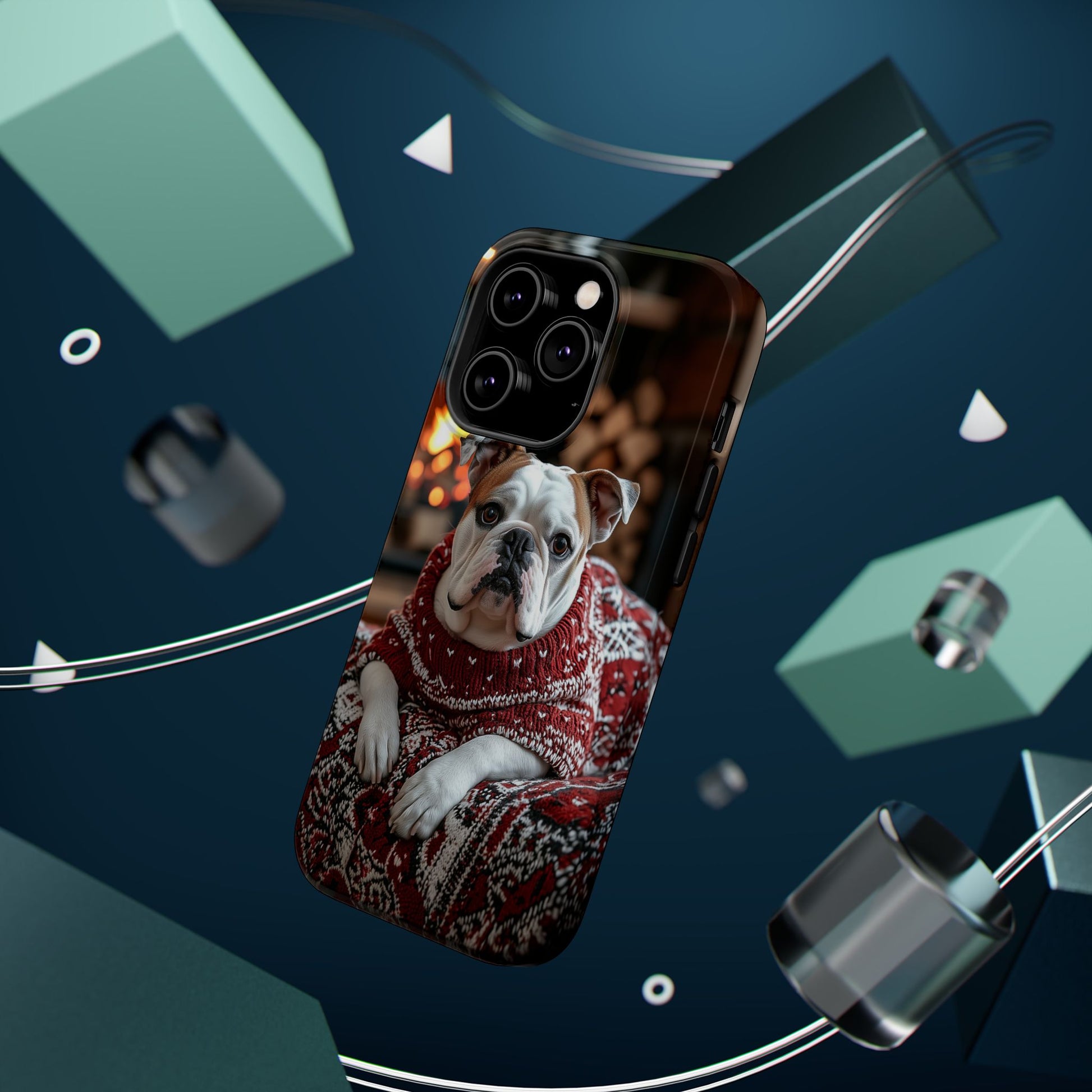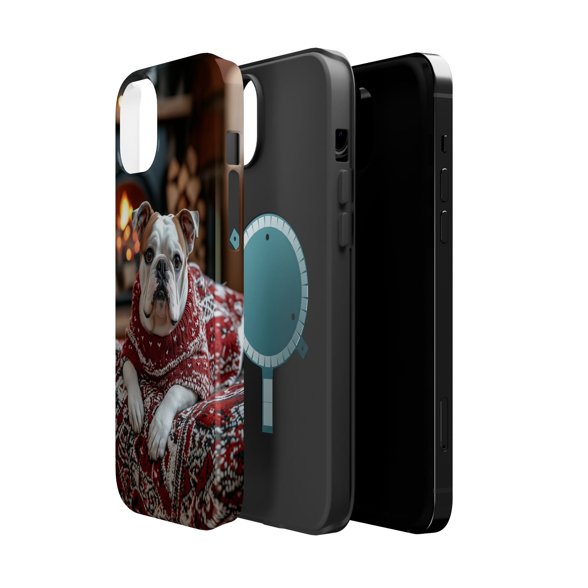 Cozy Bulldog in Sweater MagSafe iPhone Case – Festive Fireplace Protective Cover