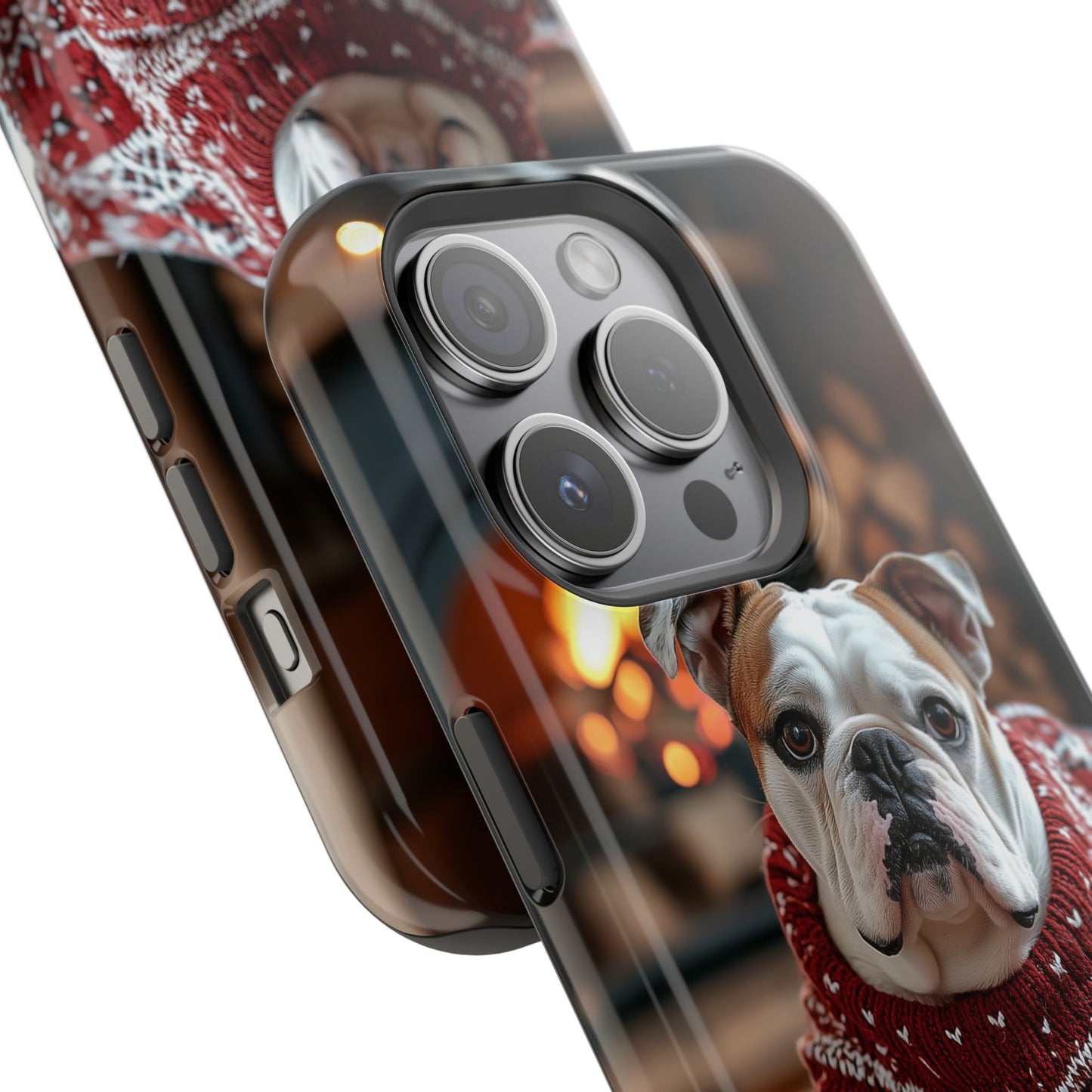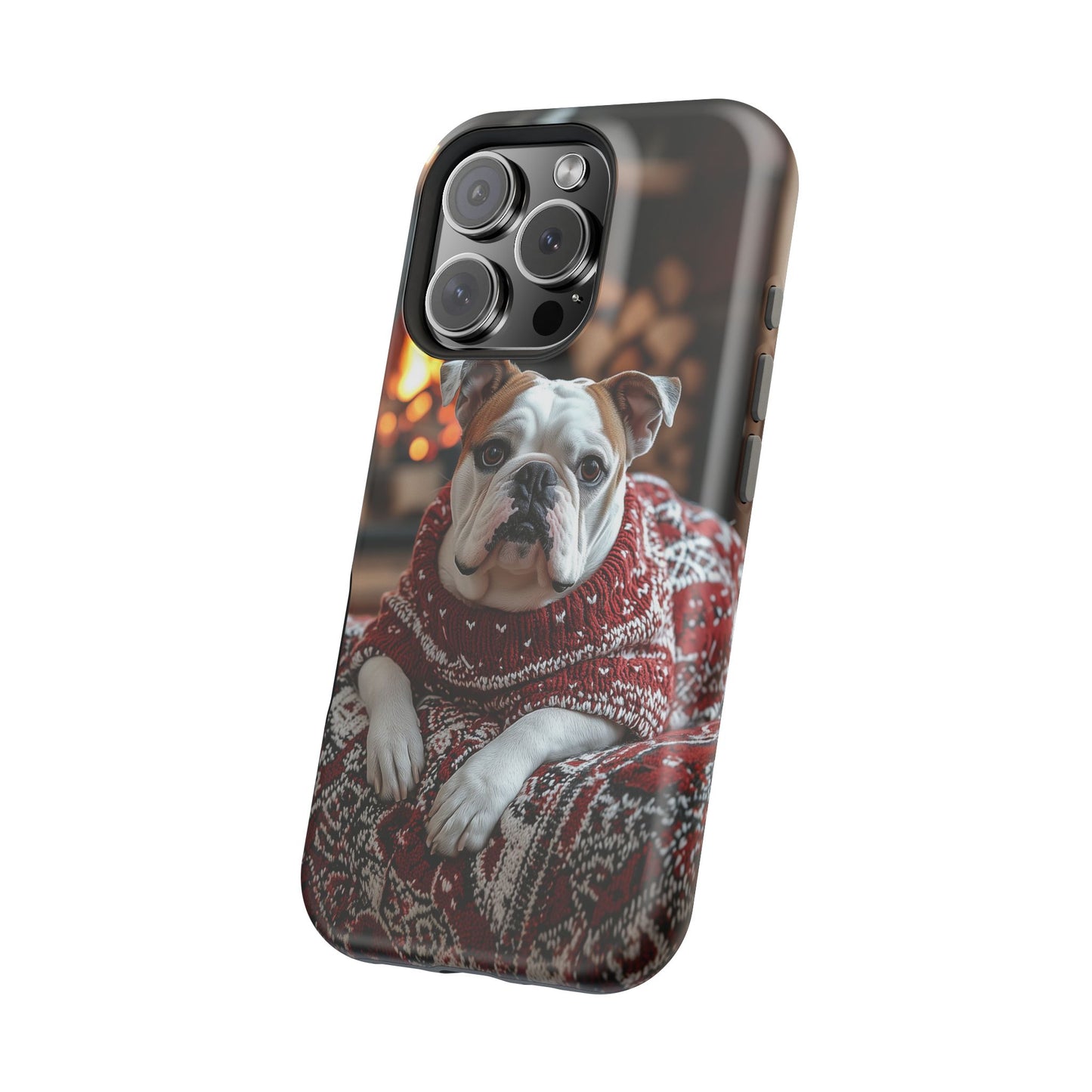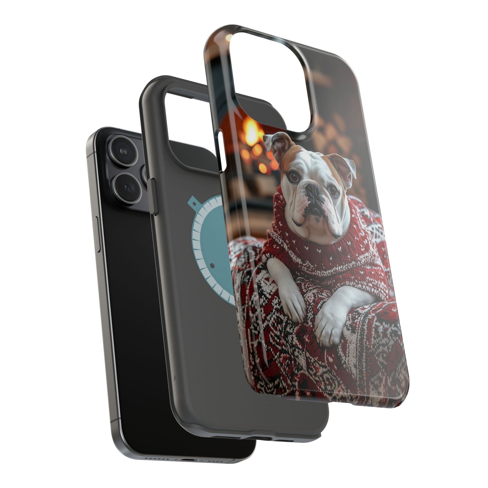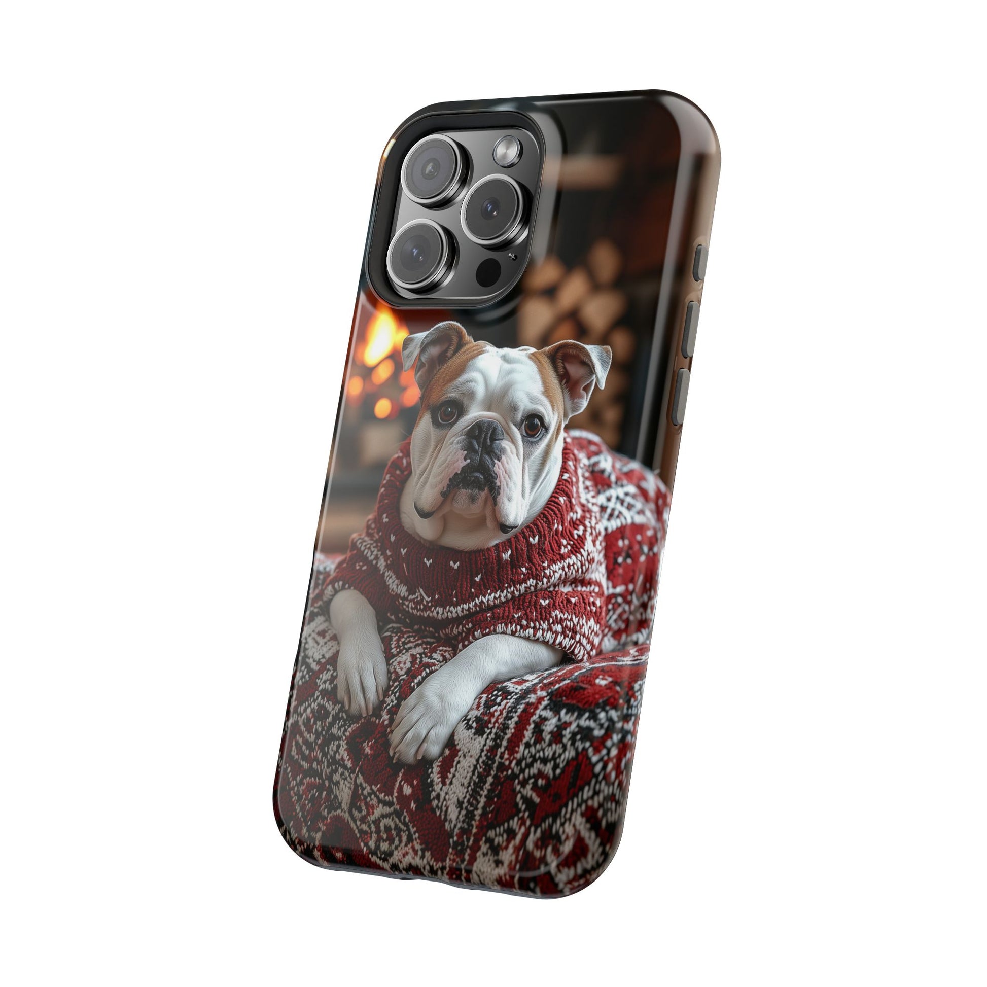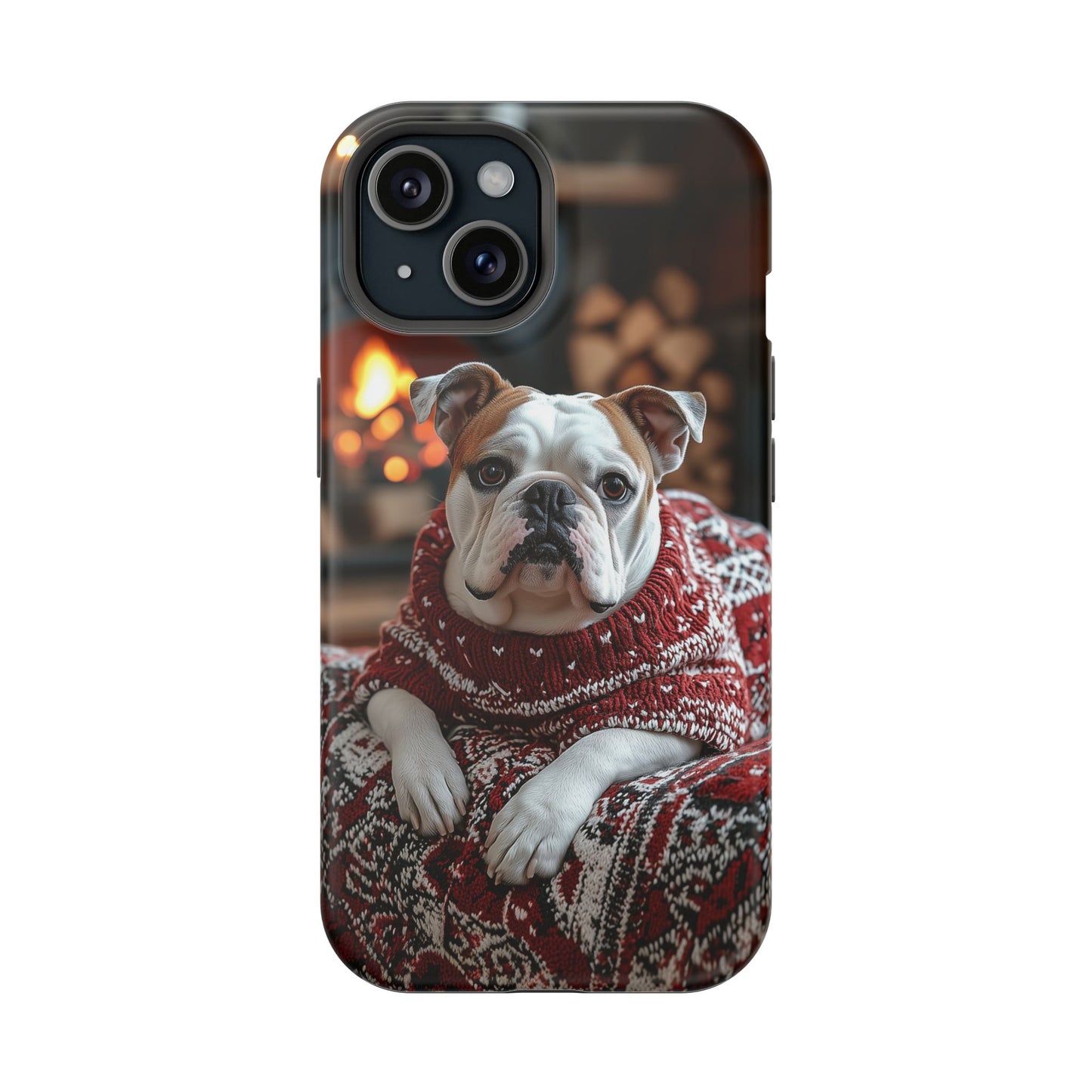 Cozy Bulldog in Sweater MagSafe iPhone Case – Festive Fireplace Protective Cover