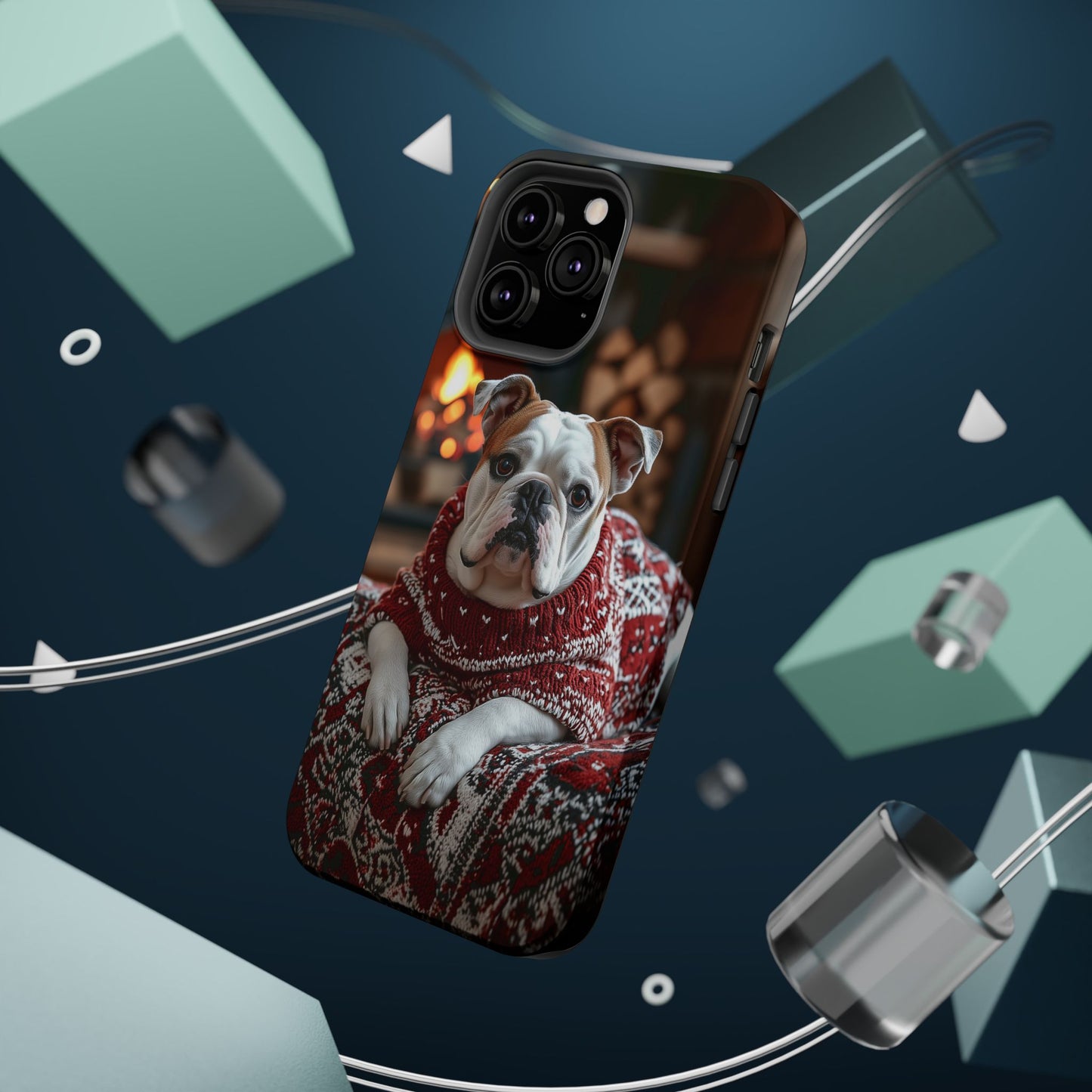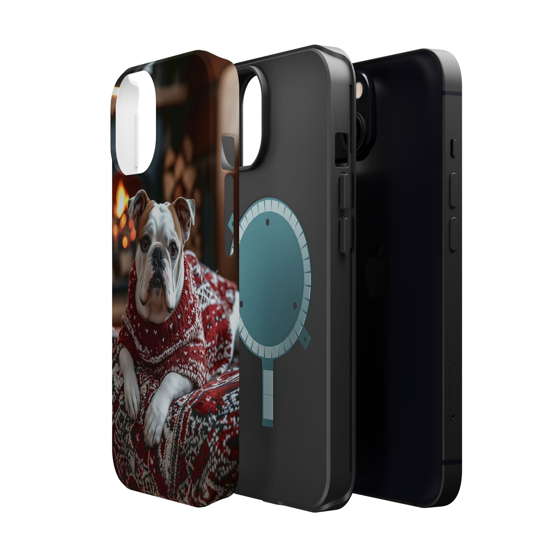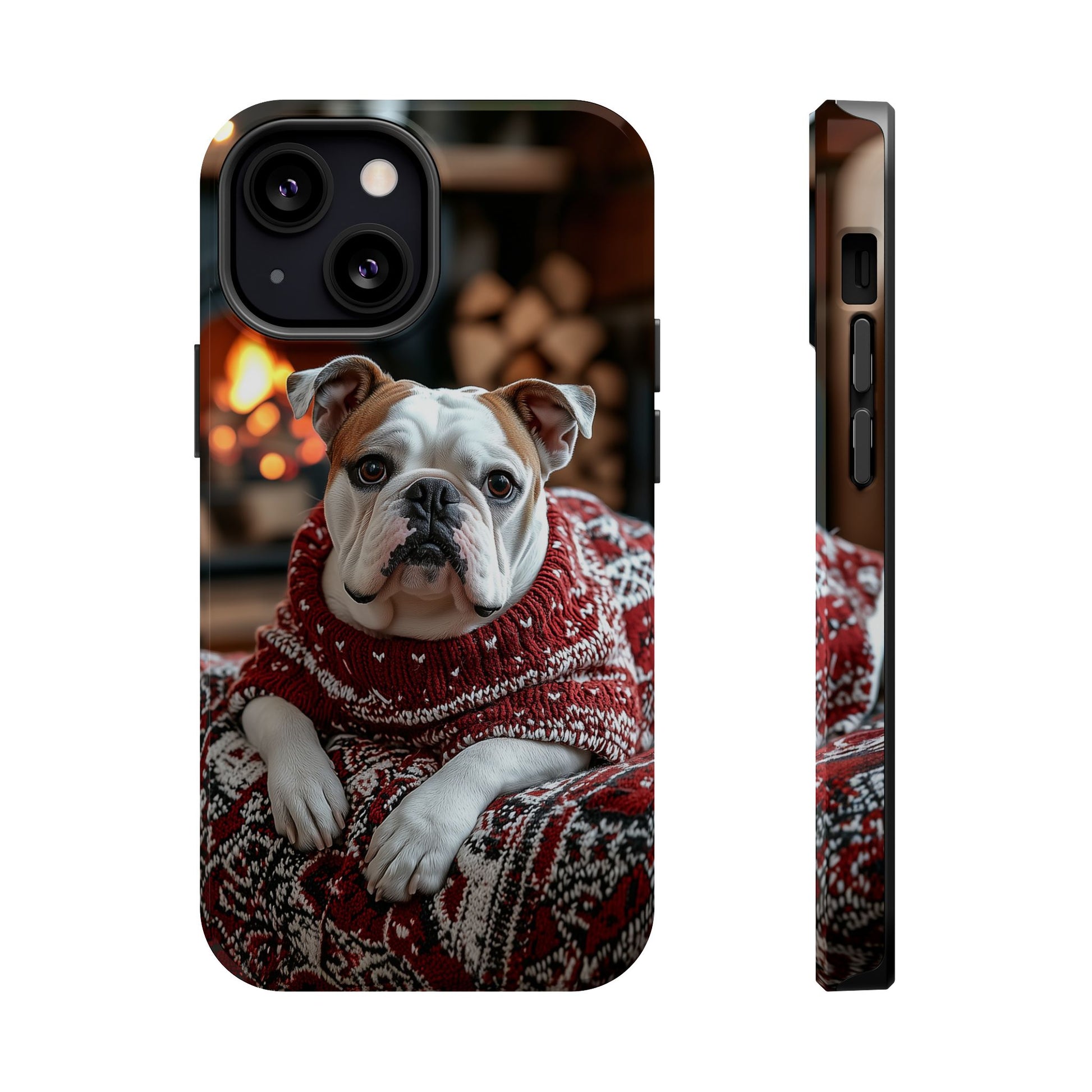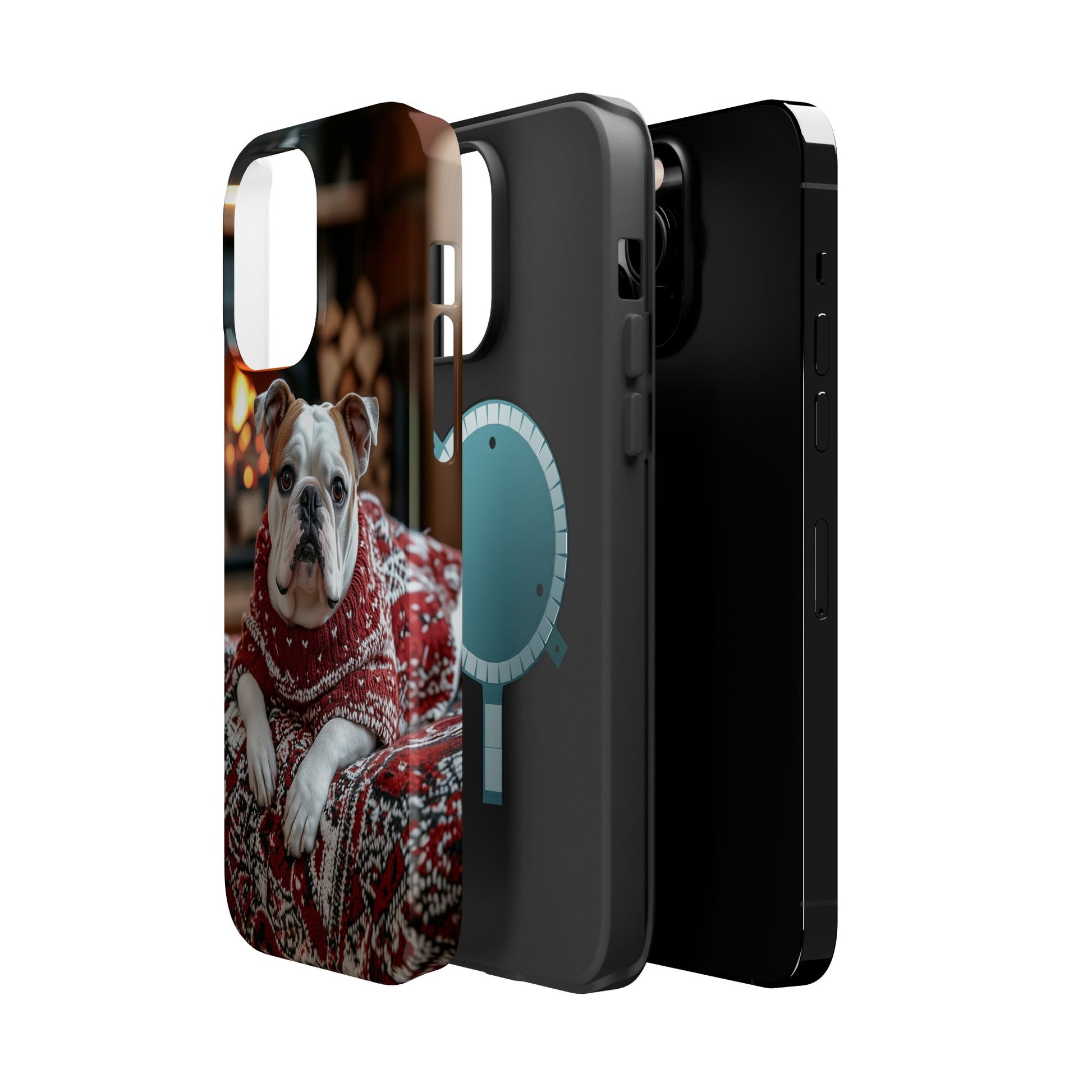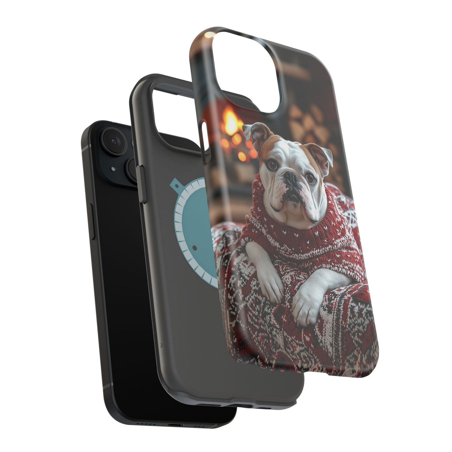 Cozy Bulldog in Sweater MagSafe iPhone Case – Festive Fireplace Protective Cover