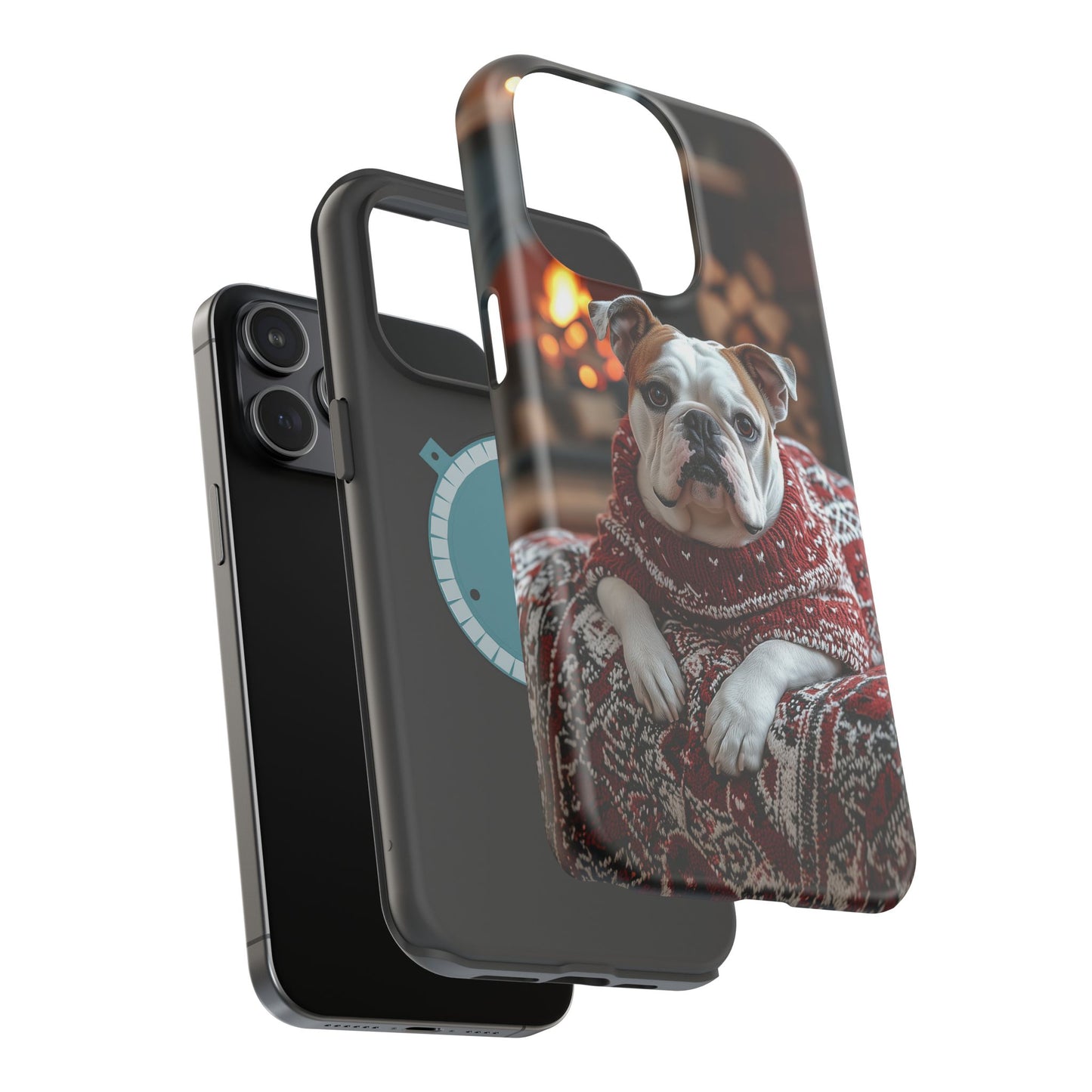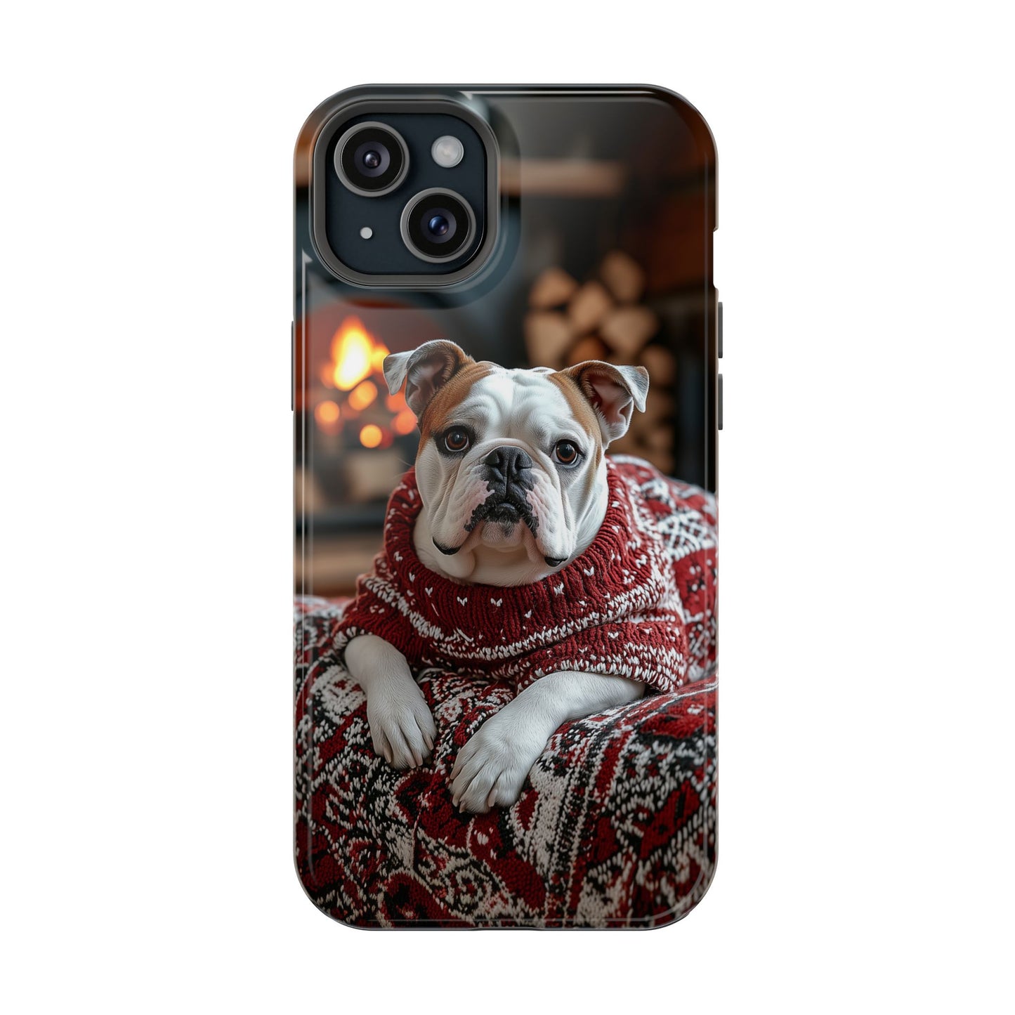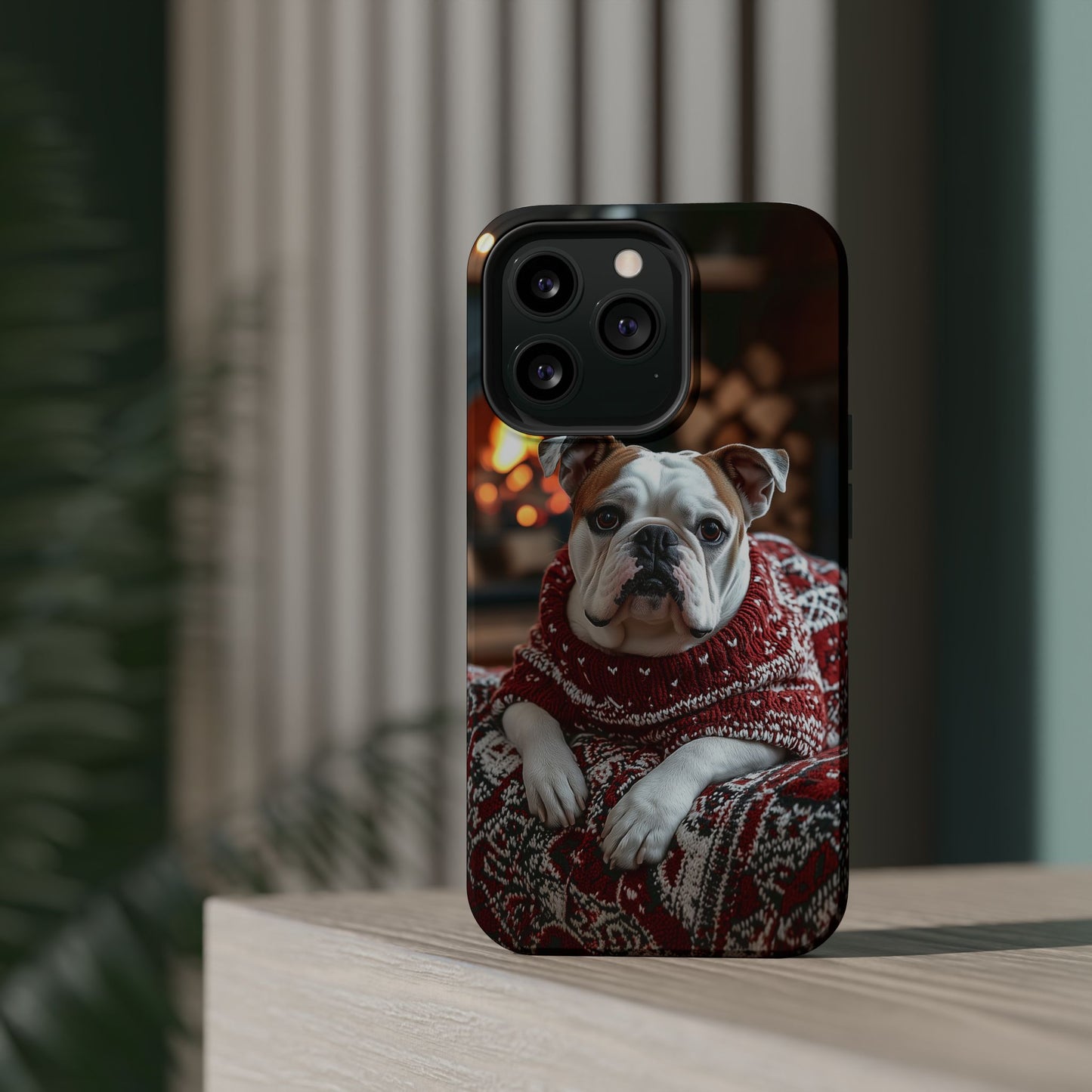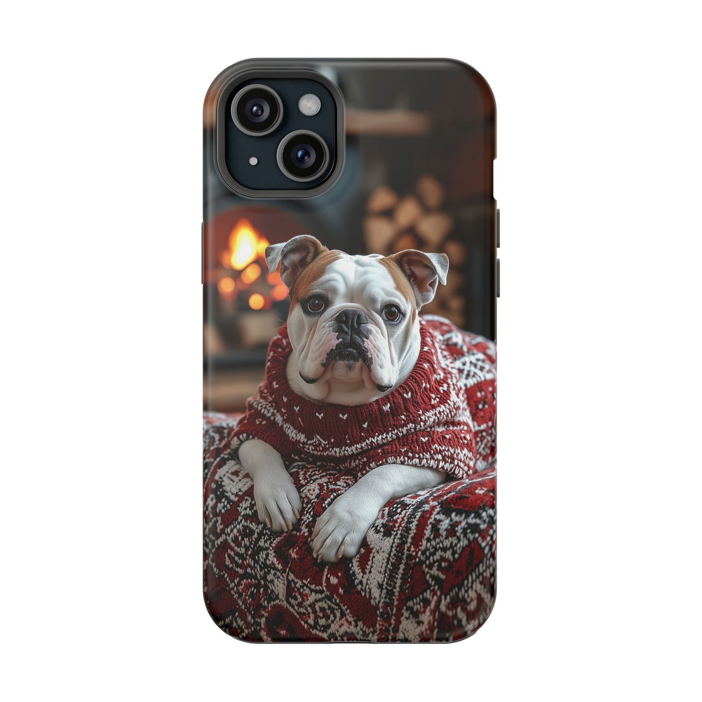 Cozy Bulldog in Sweater MagSafe iPhone Case – Festive Fireplace Protective Cover