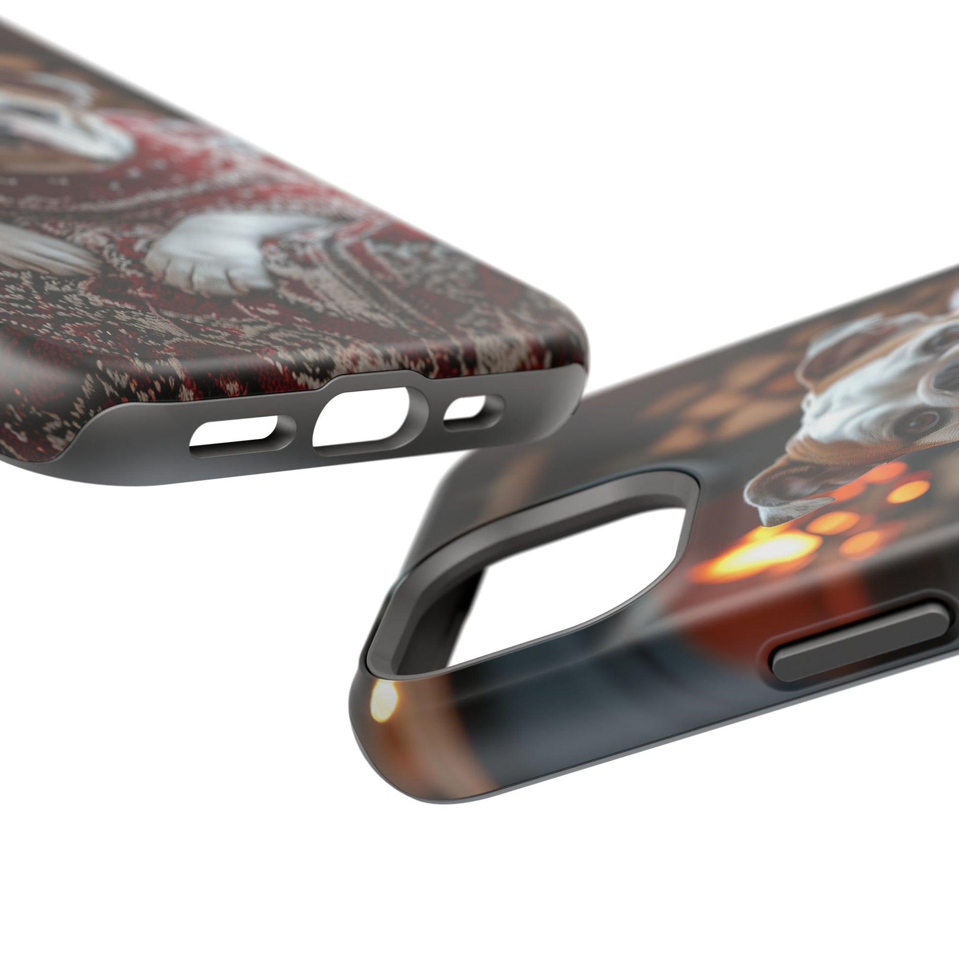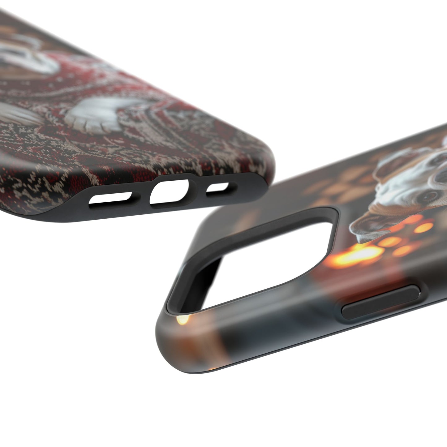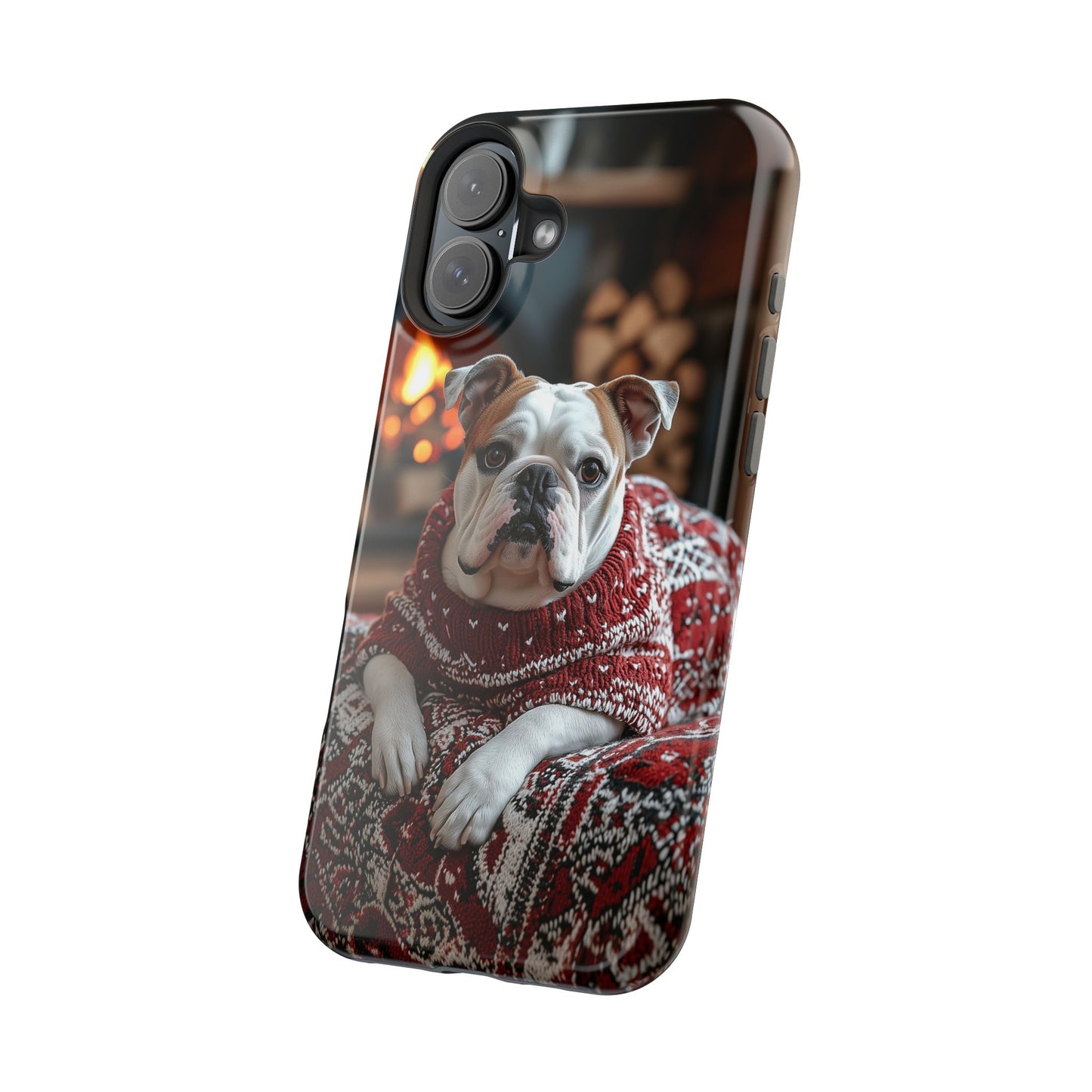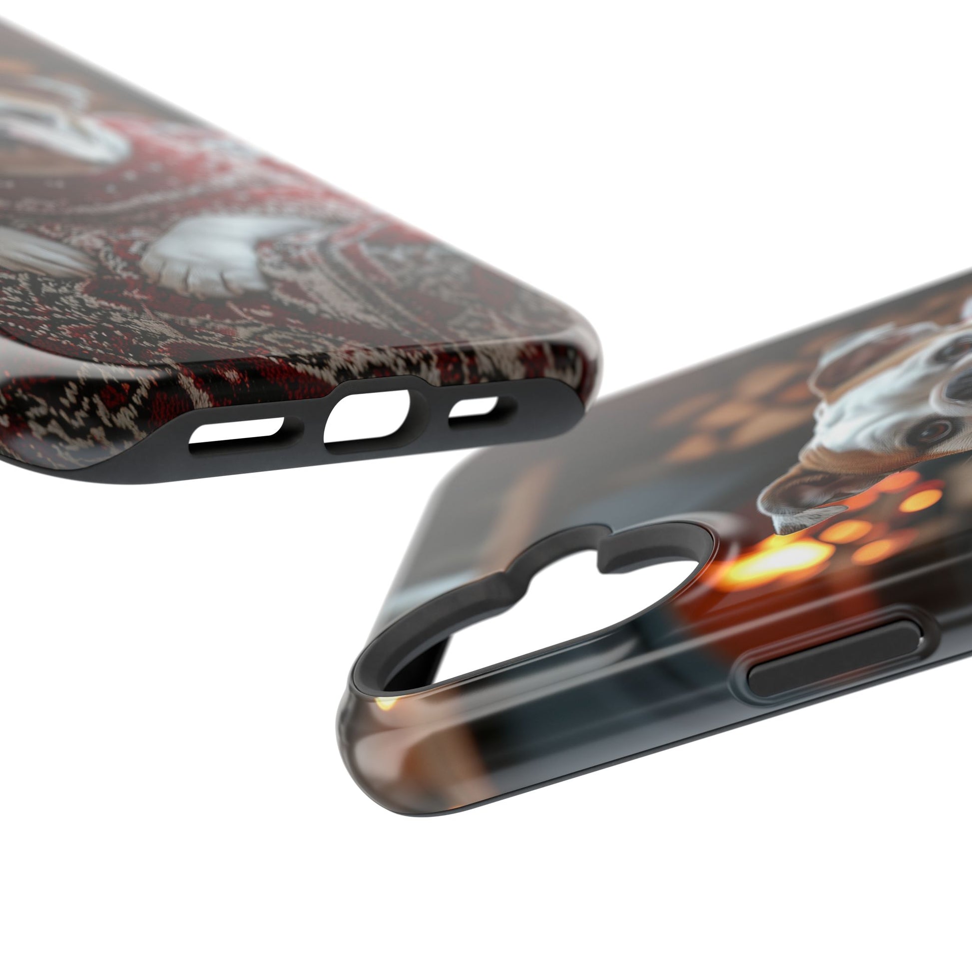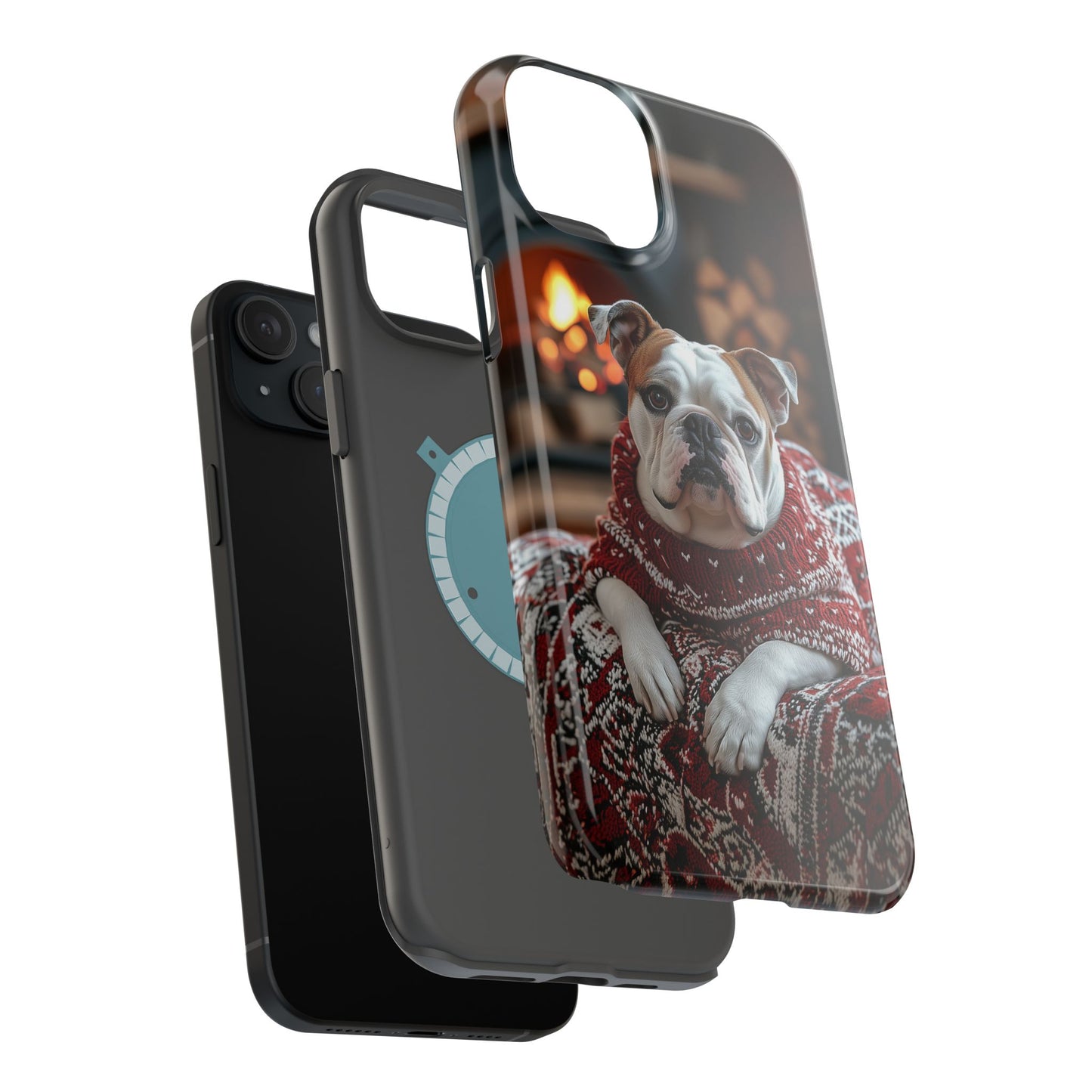 Cozy Bulldog in Sweater MagSafe iPhone Case – Festive Fireplace Protective Cover