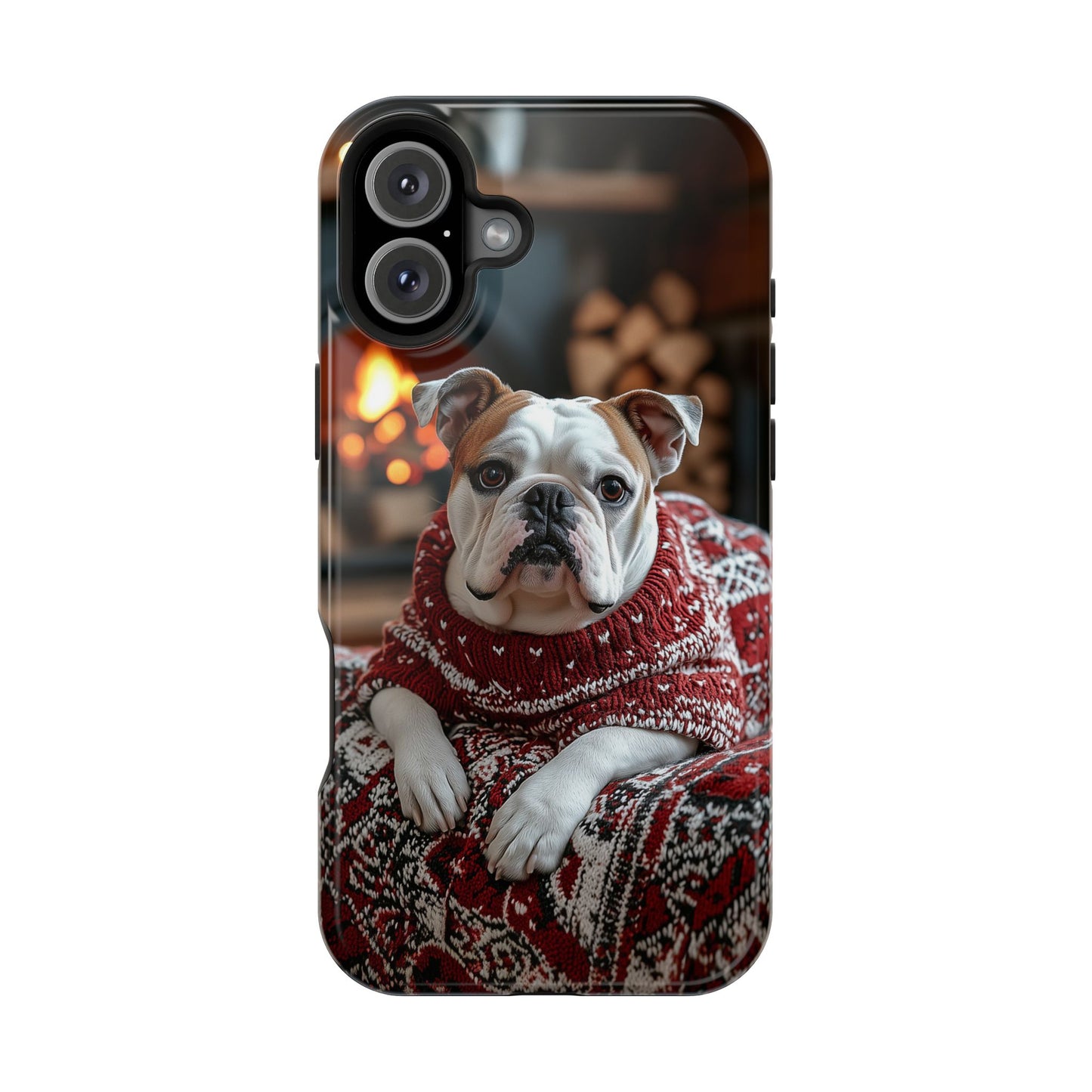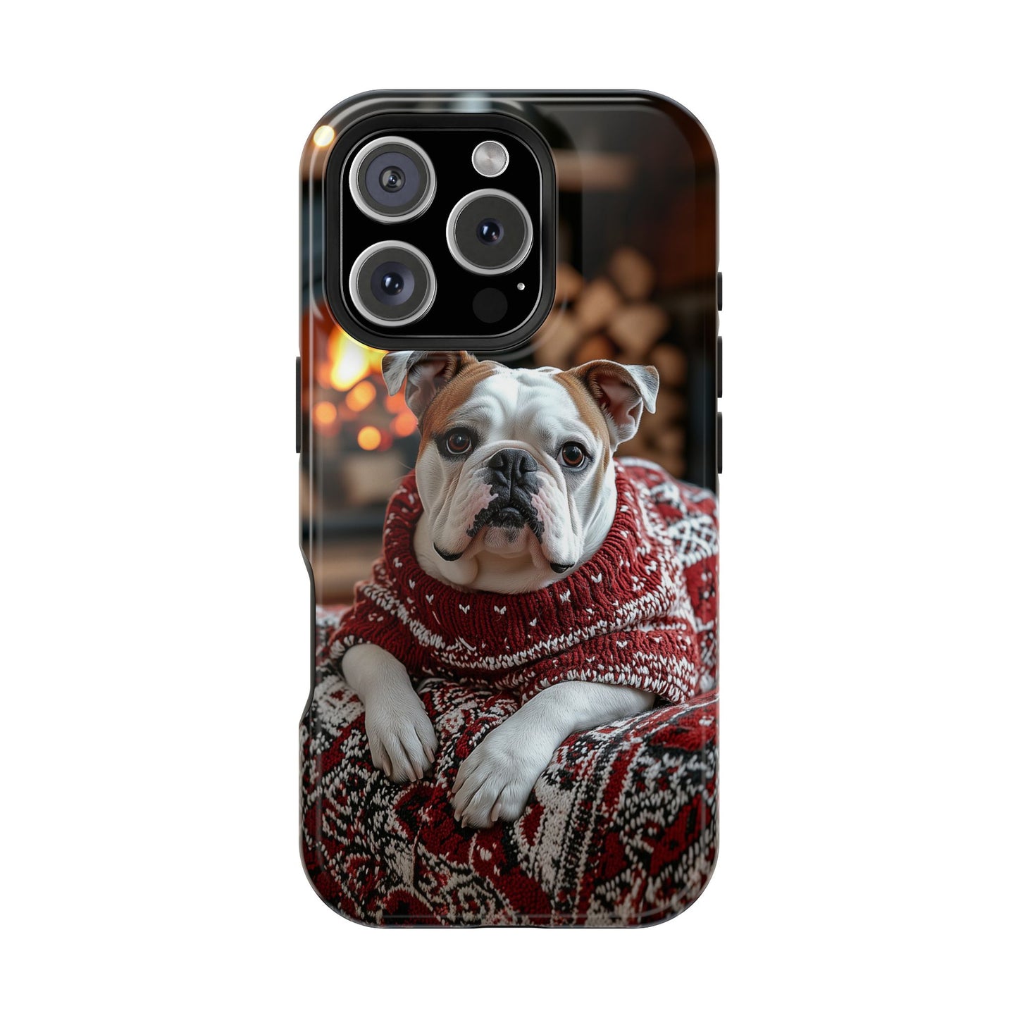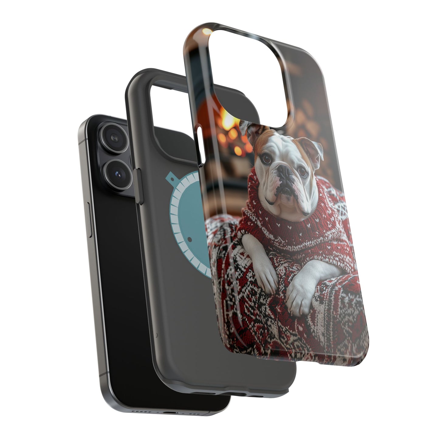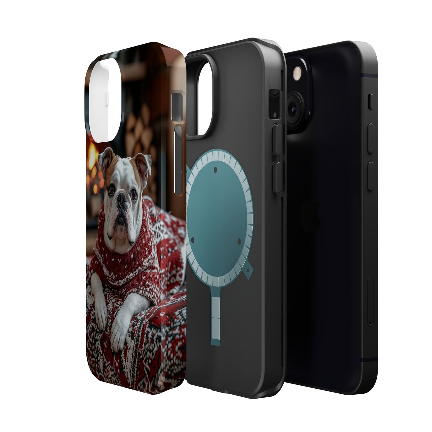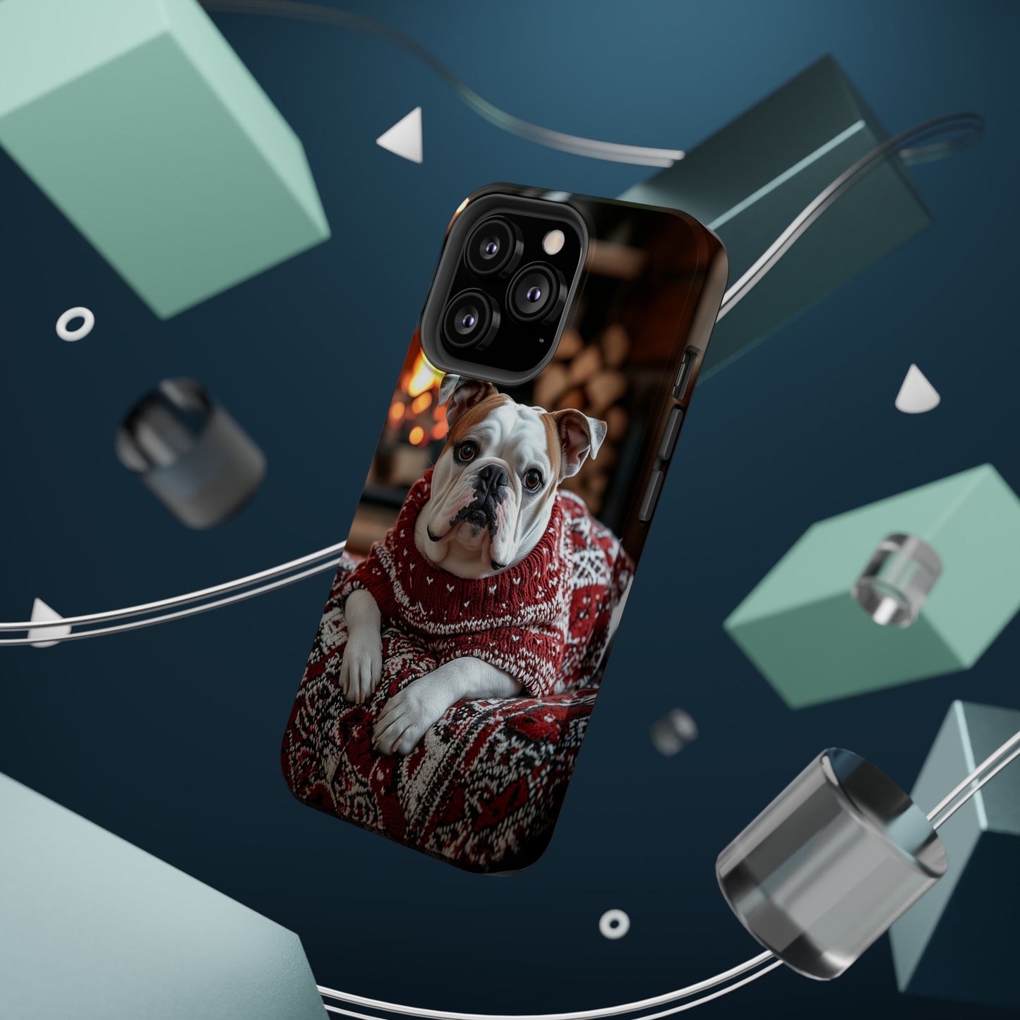 Cozy Bulldog in Sweater MagSafe iPhone Case – Festive Fireplace Protective Cover