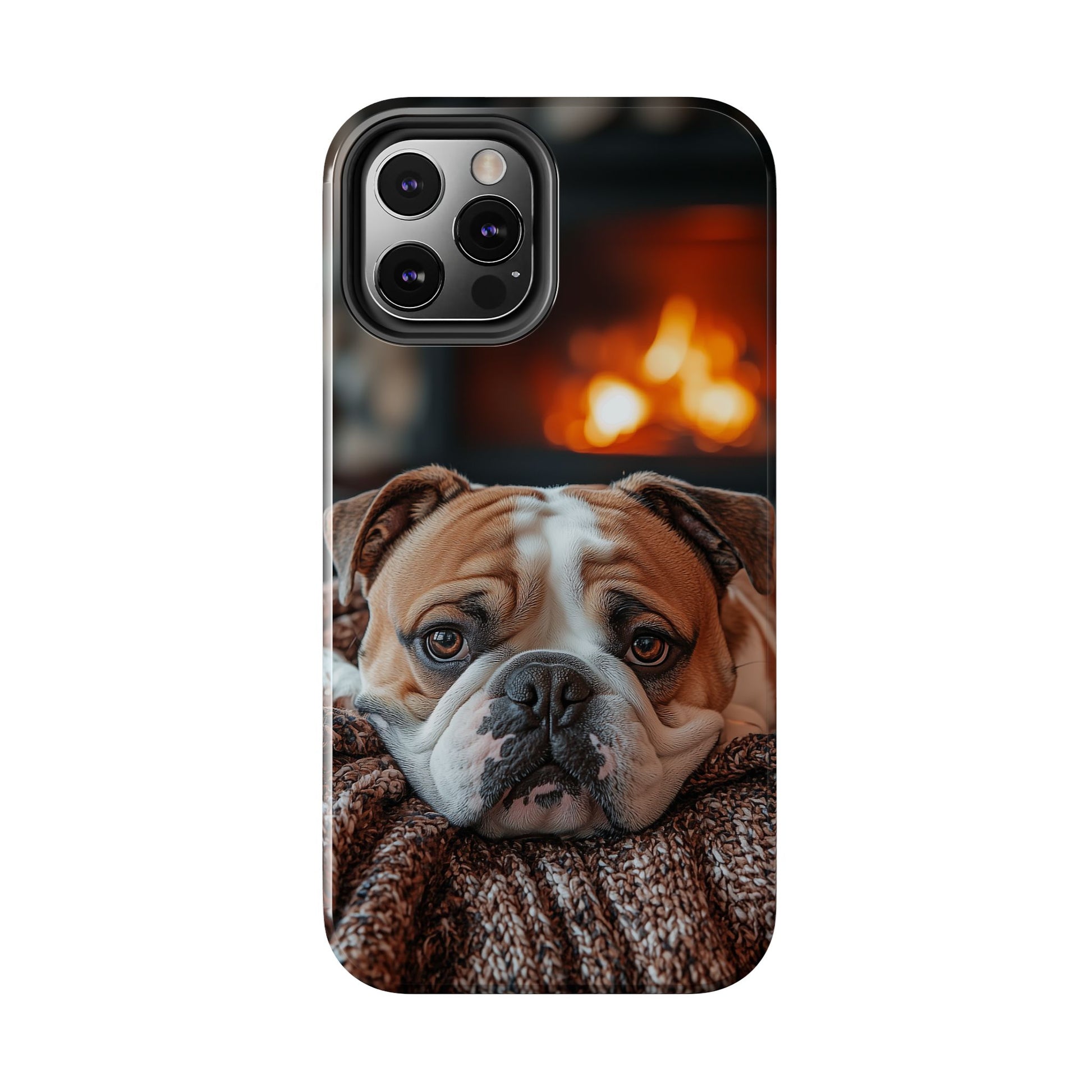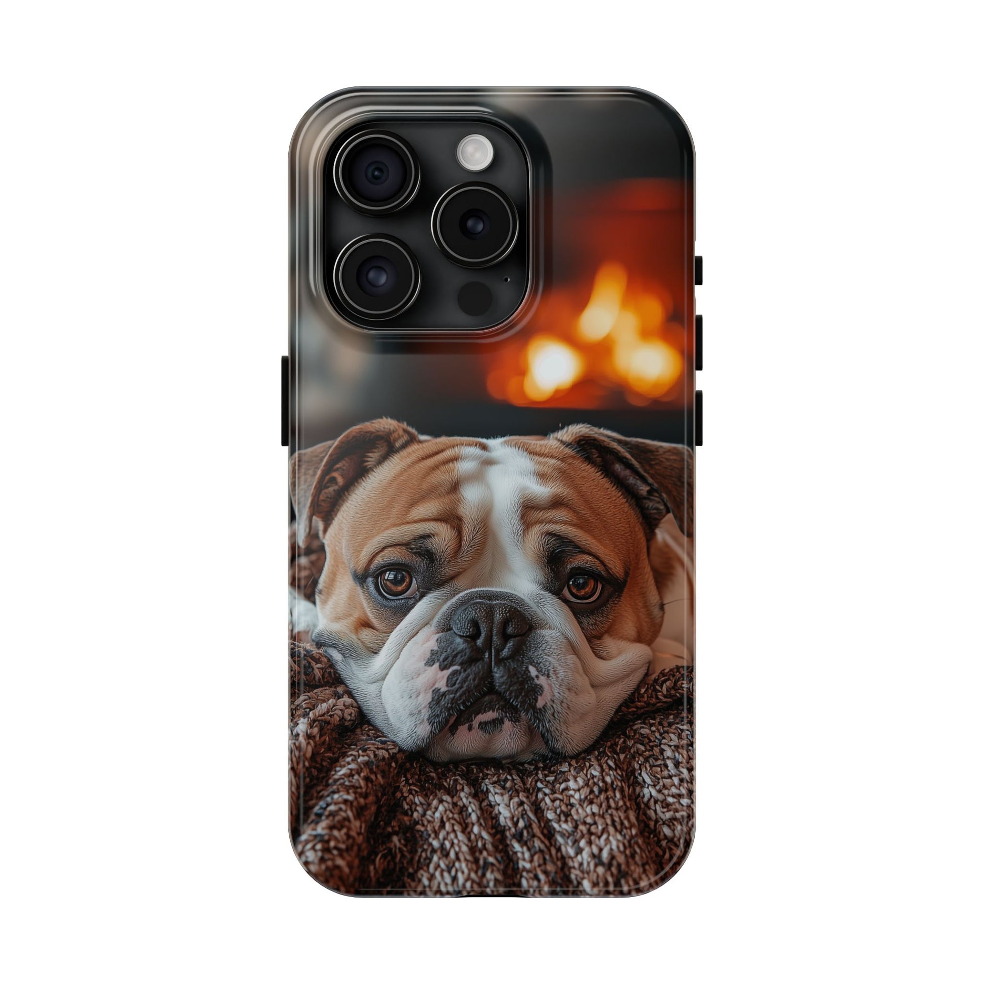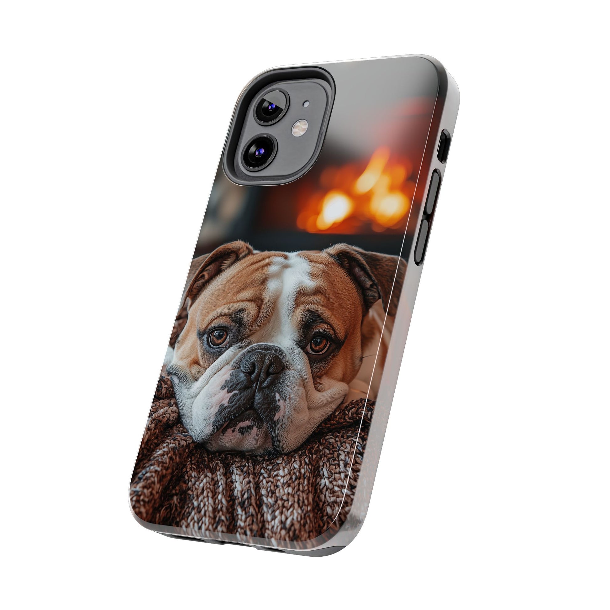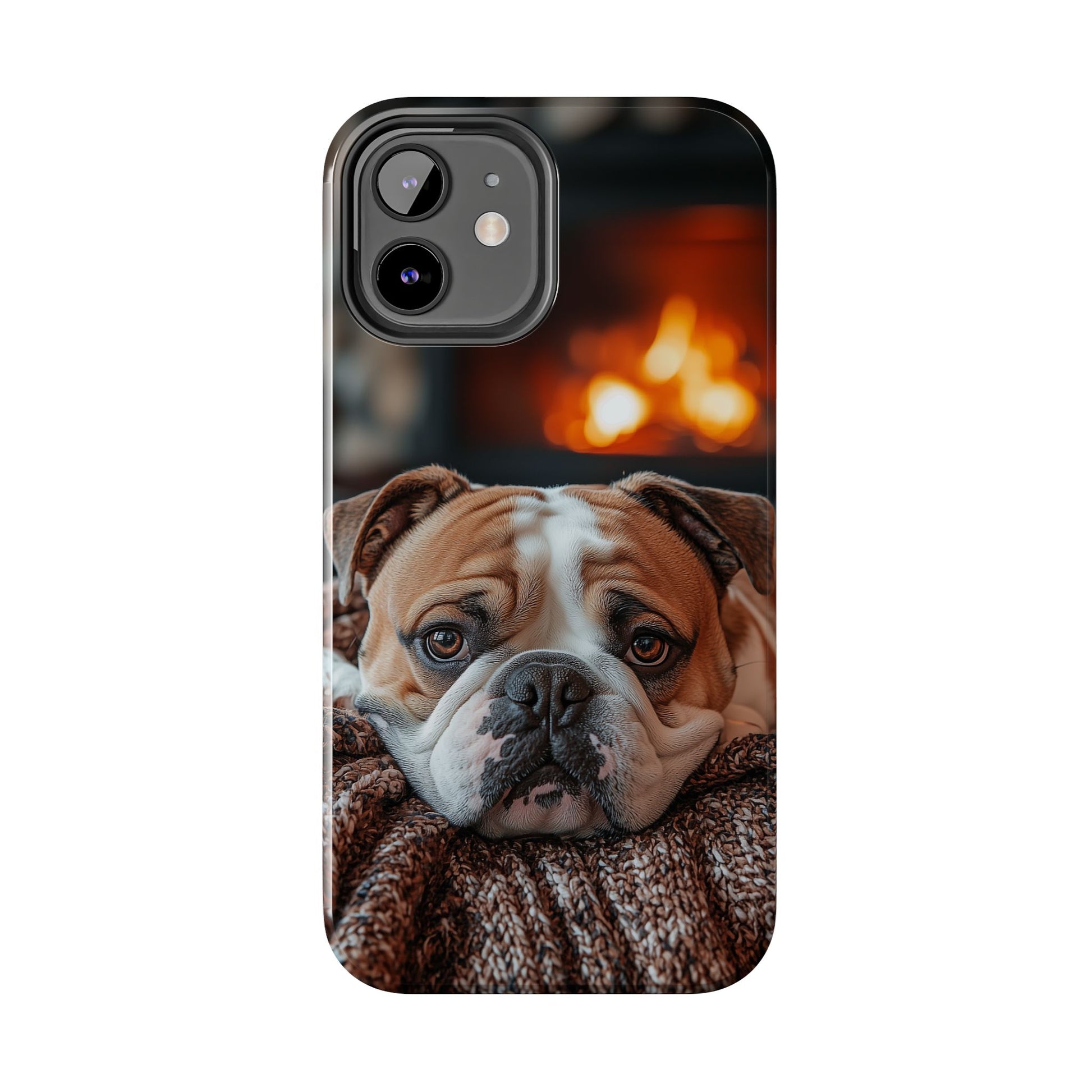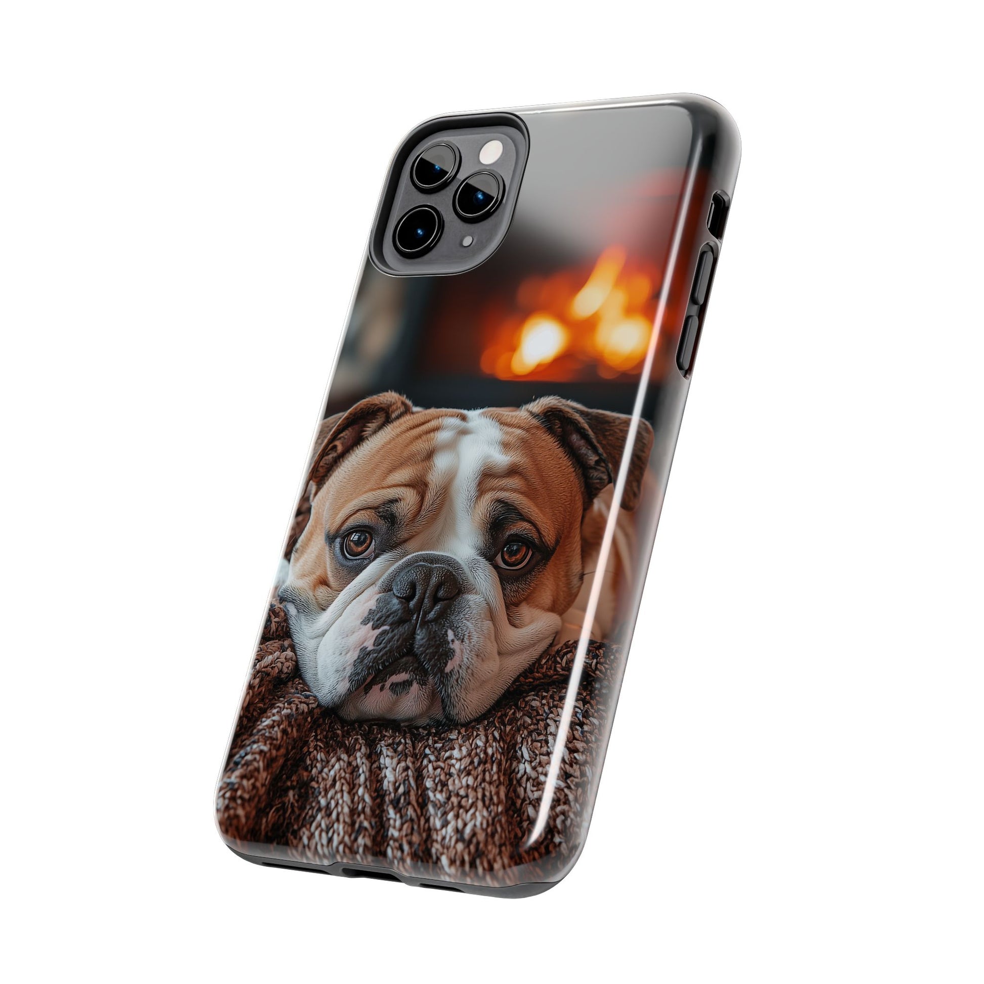 Cozy Bulldog iPhone Case – Fireside-Inspired Protective Cover Description: